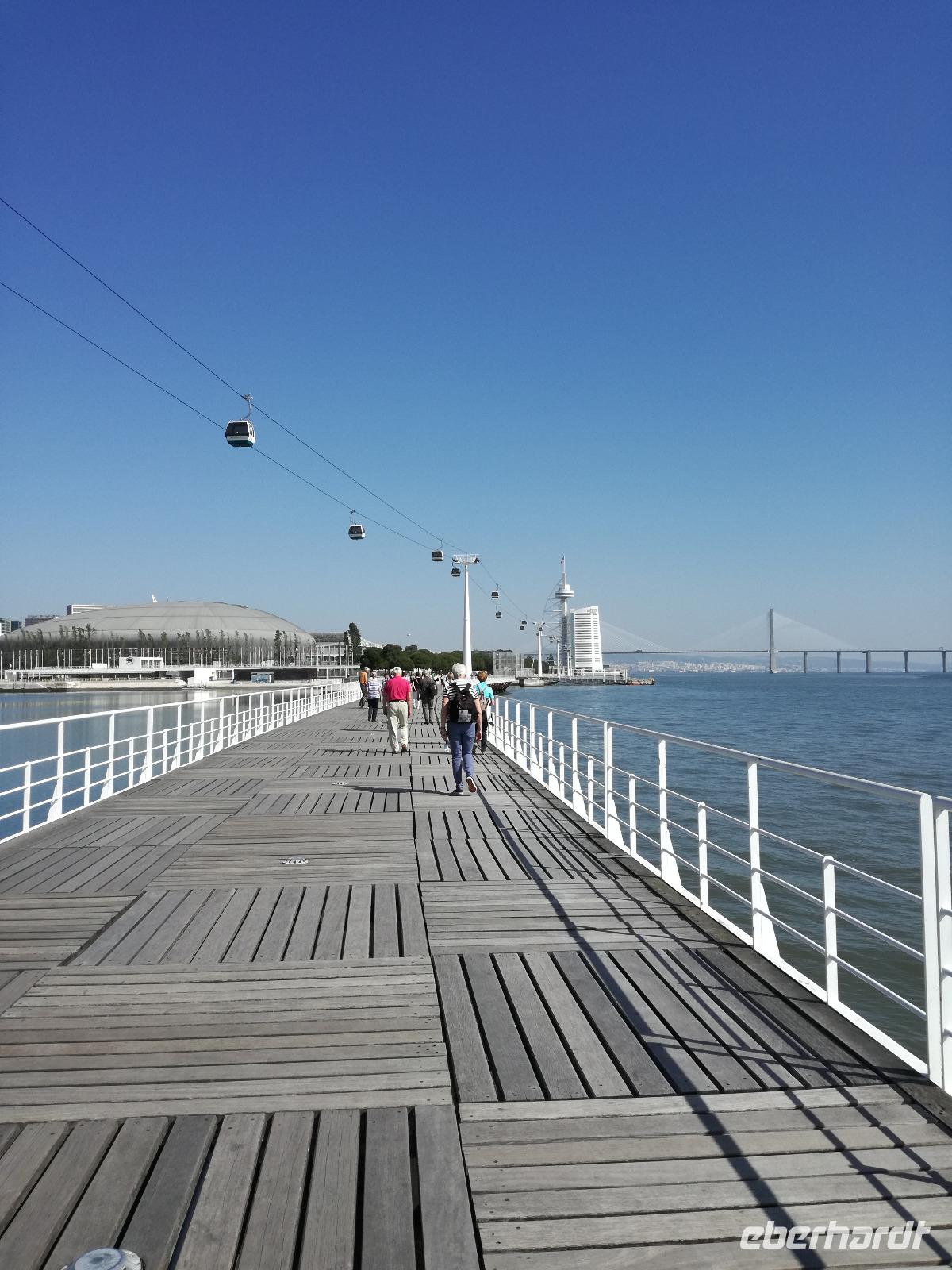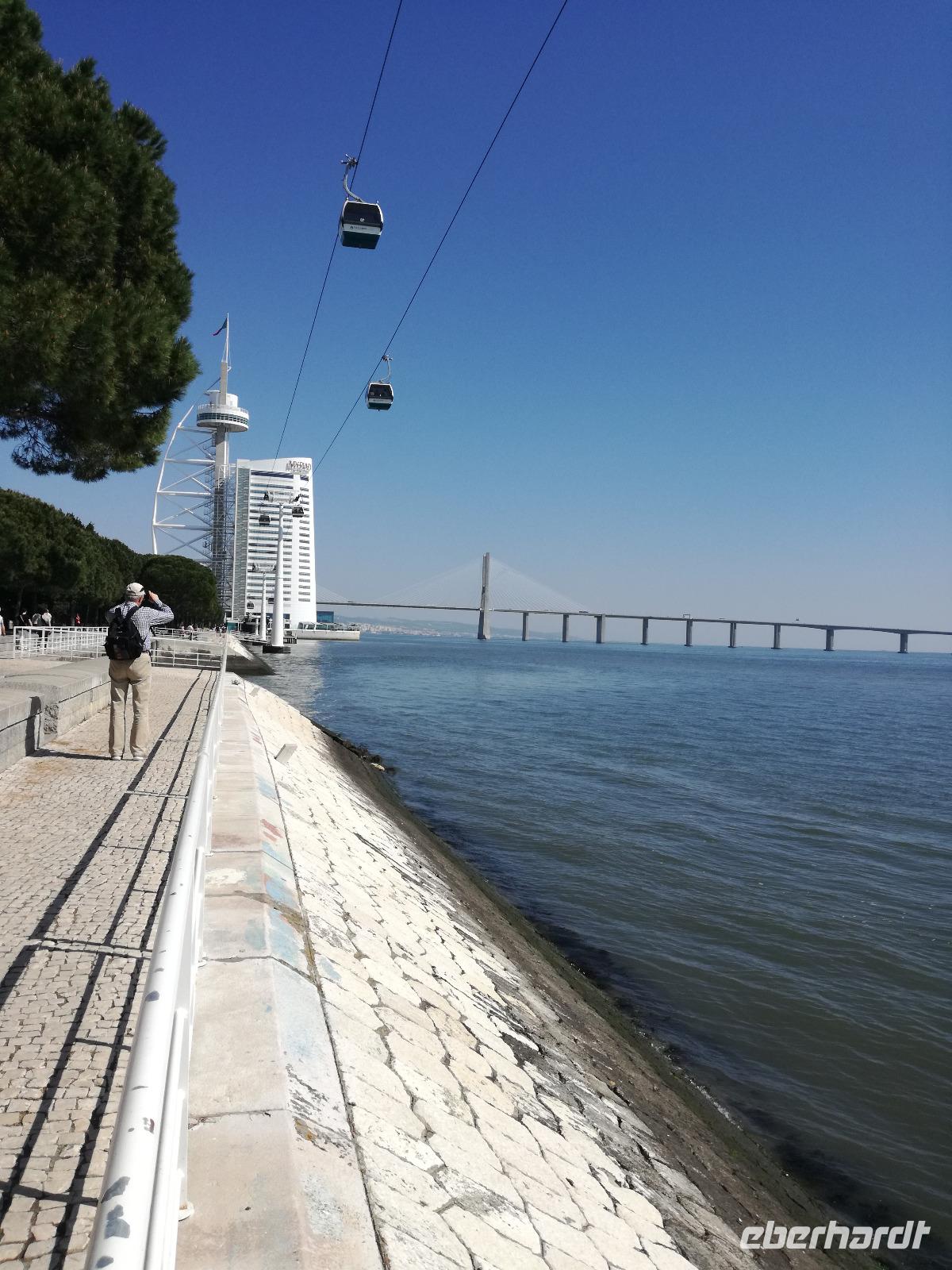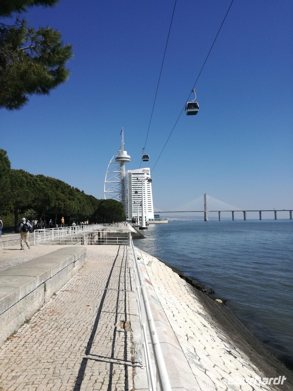 Das Expo-Gelände erinnert an die Austellung vom Jahre 1998, die unter dem Motto „Schutz der Weltmeere" stattfand. Mit dem öffentlichen Nahverkehr ist dieses gut zu erreichen. Um auf das weitläufige Gelände zu gelangen. Der „Park der Nationen" ist damals wie heute Ziel vieler Besucher in Lissabon, auch für uns. Wir durchquerten ein großes Einkaufszentrum bevor wir auf dem Gelände der damaligen Expo-Austellung ankamen. Catrin erzählte uns dabei einige interessante Dinge über die Weltausstellung. Für die Expo wurde das gesamte Gelände neu gestaltet, dieses war früher eines der weniger beliebten Viertel, aber heute kann sich nur noch die wohlhabende Schicht hier eine Wohnung leisten. Wir spazierten vom Ozenarium, ein rießiges Indoor Aquarium, welches wohl zu einem der größten der Welt gehört, zum Einstieg für die Seilbahn. Mit der Fahrt der Seilbahn bekamen wir nochmal einen ganz anderen Blick auf das Gelände. Am Ende dieser Seilfahrt heißt es Abschied nahmen von unserer wunderbareren Catrin, die uns ihr Lissabon gezeigt hat. Einige Gäste besuchten noch das Ozenarium, andere fuhren mit mir zurück in die Stadt.