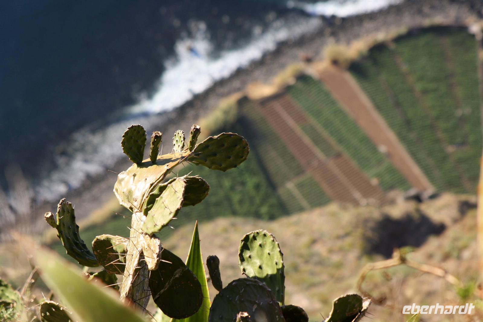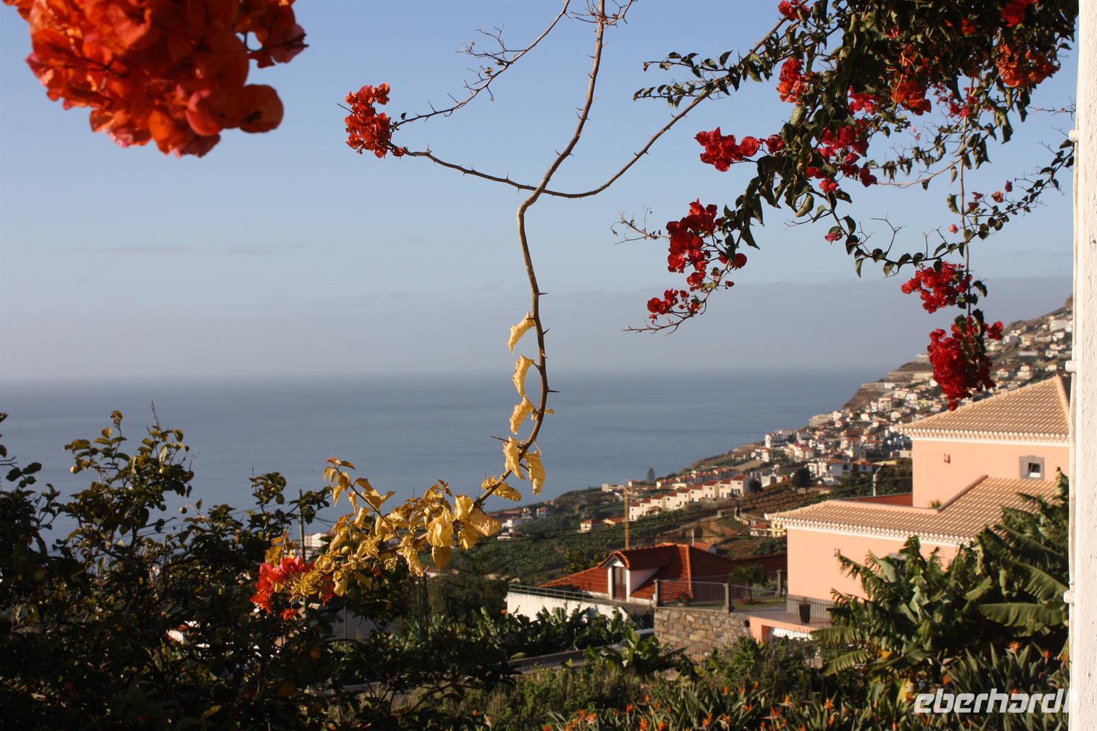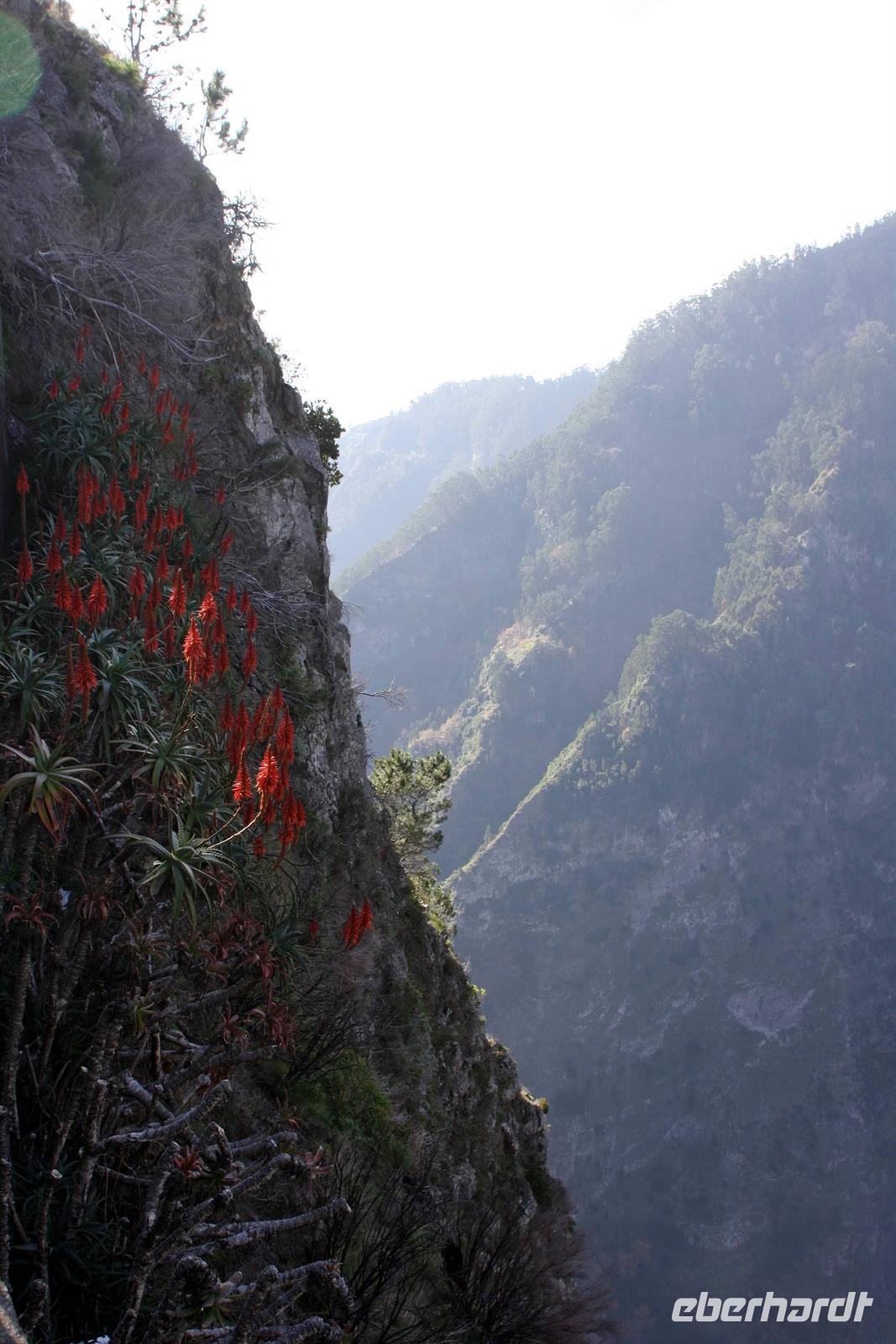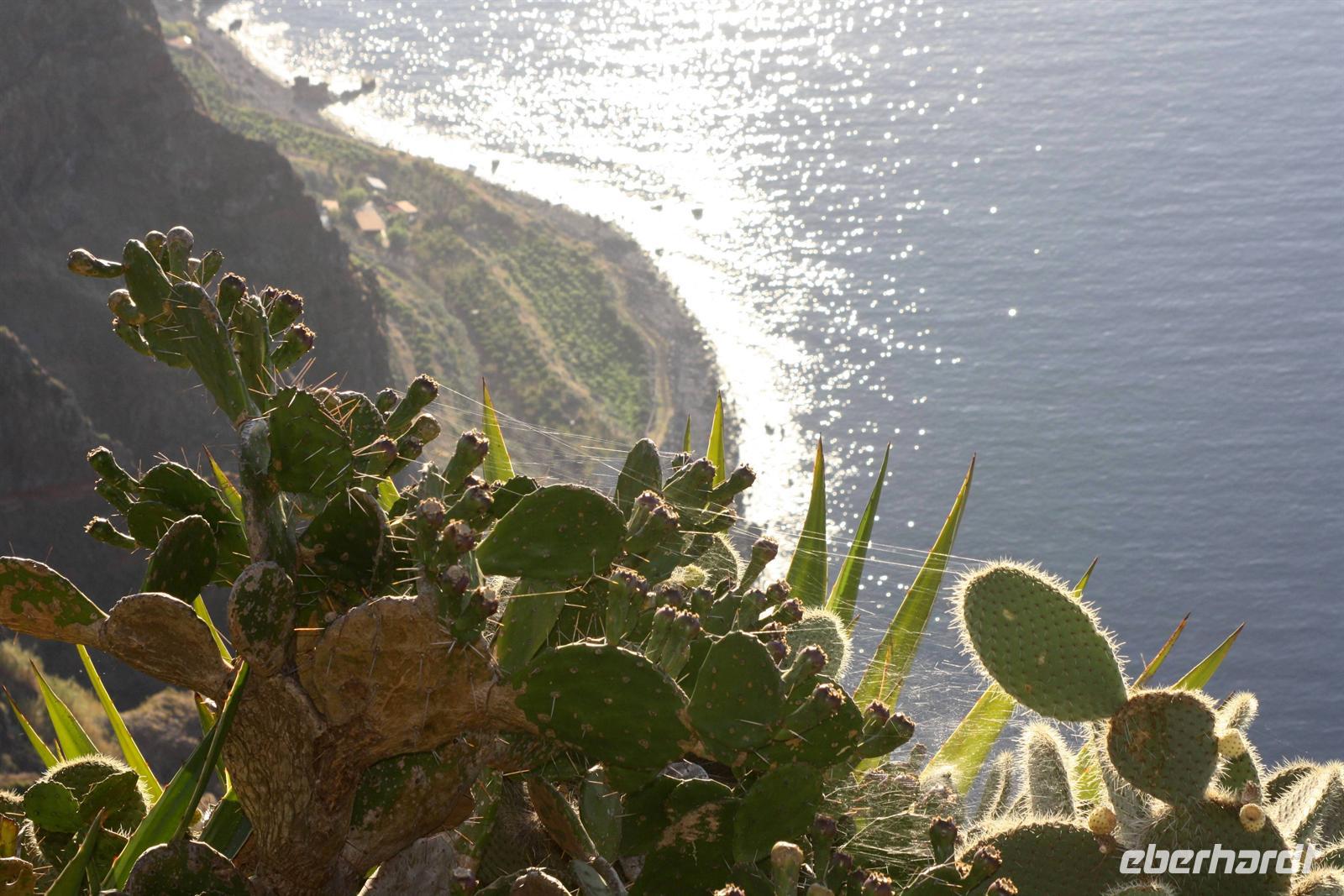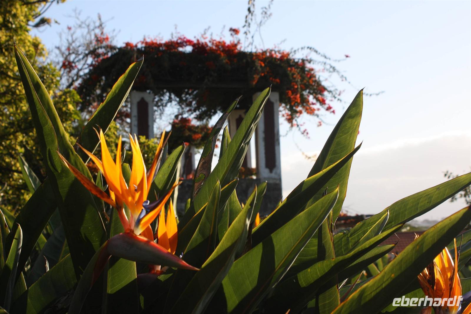 Der erste Tag des Jahres wird entspannt angegangen. Zum Mittag spazieren wir zum Restaurant „Atlantis", wo wir auf der Terrasse speisen. Wer möchte, begleitet mich zu einer wunderschönen Wanderung entlang der Levada von Maroços. Der Weg verläuft eben, immer entlang des künstlichen Wassergrabens. Die Levadas sind ein für Madeira charakteristische System zur Wasserversorgung und sozusagen die Lebensadern der der Insel. Viele Blumen und Pflanzen zieren den Wegesrand und wir finden sogar frische Cherimoyas. Die gelb-orange blühenden Girlandenblumen, die aus dem Himalaya stammen, wachsen hier wie Unkraut. Wir laufen im „Entenmarsch" vorbei an kleinen Dörfern, Feldern und Terrassen und bestaunen die abwechslungsreiche Flora. Immer wieder haben wir auch den weiten Blick auf das Meer und auf die Bucht von Machico. Ein herrlicher Neujahrs-Spaziergang!