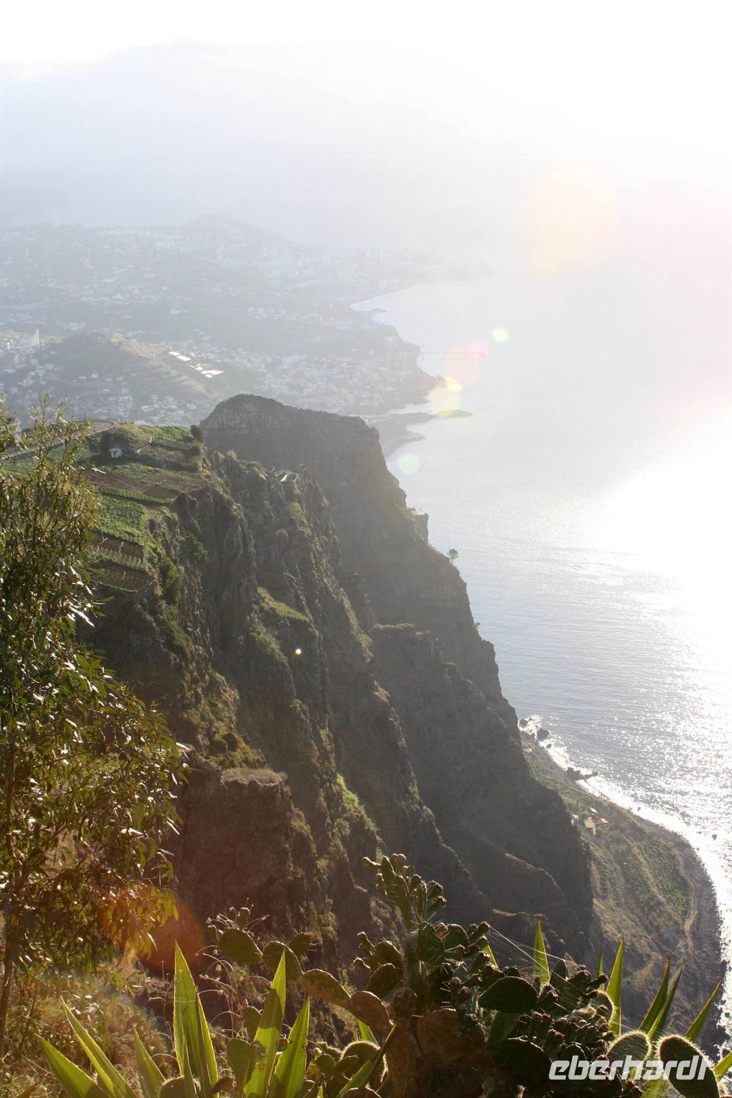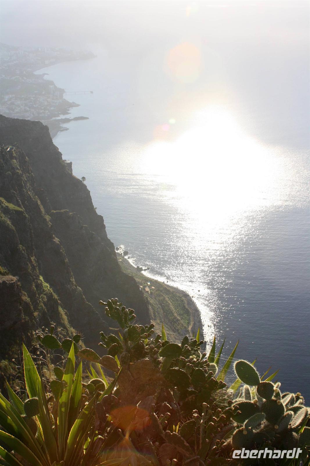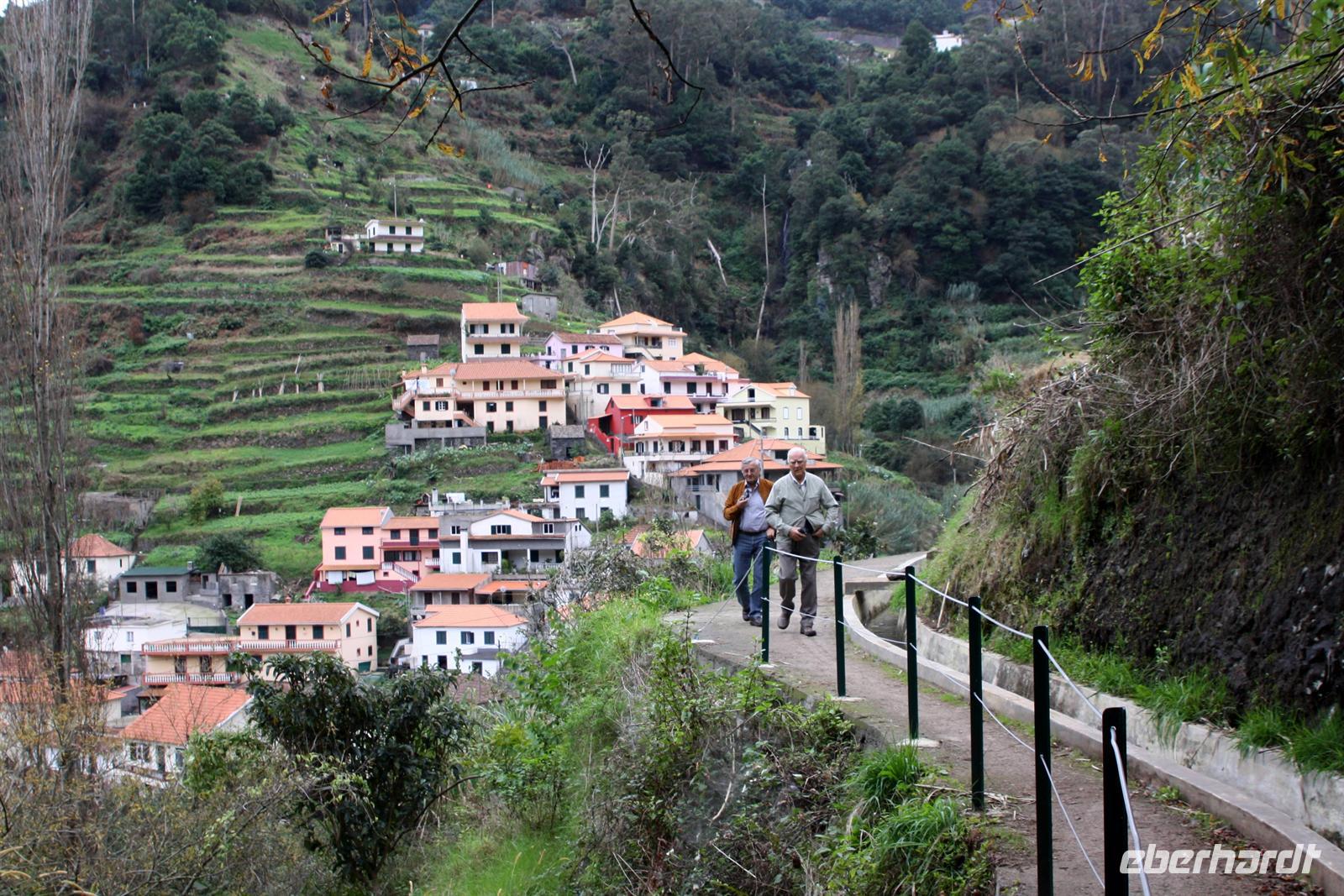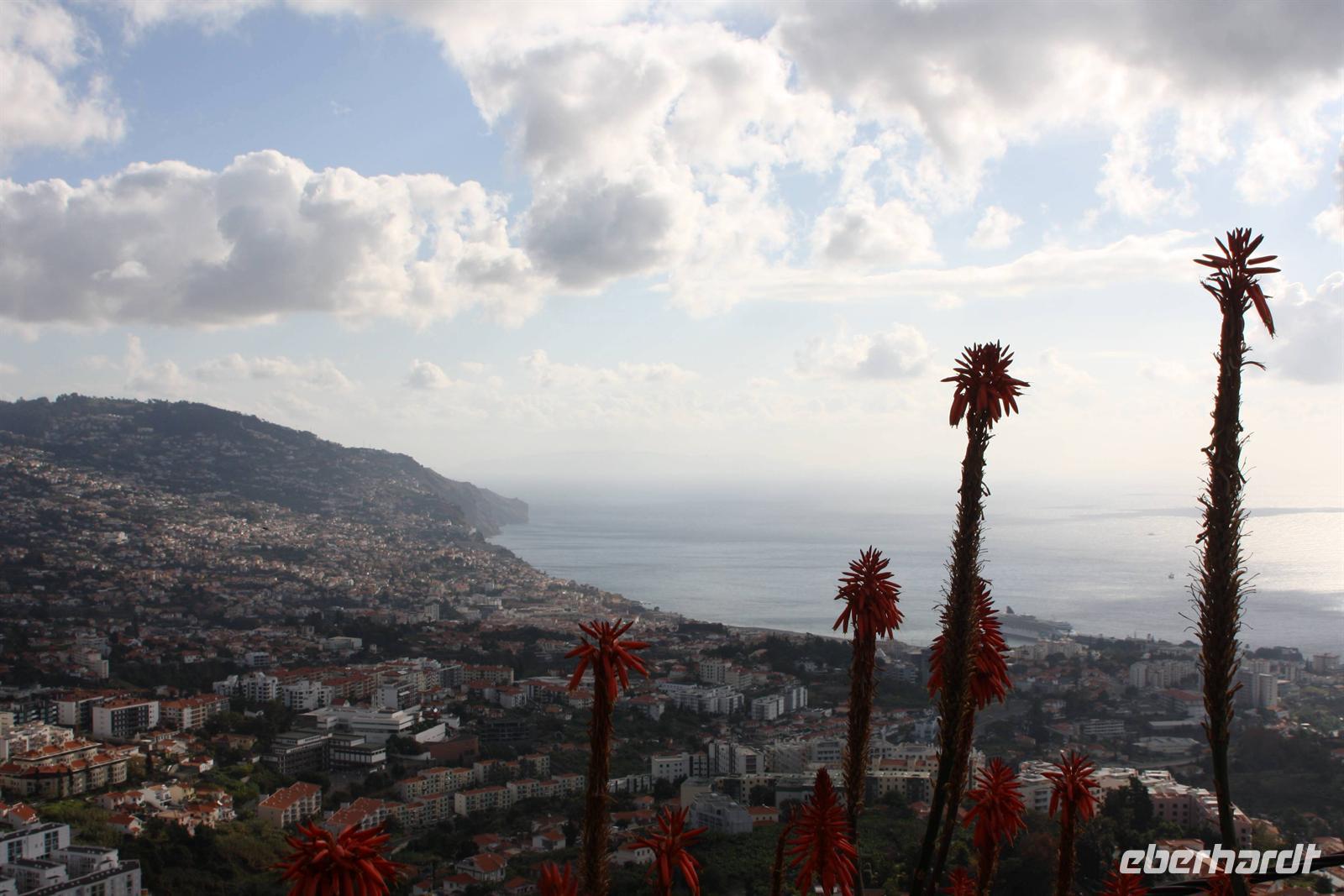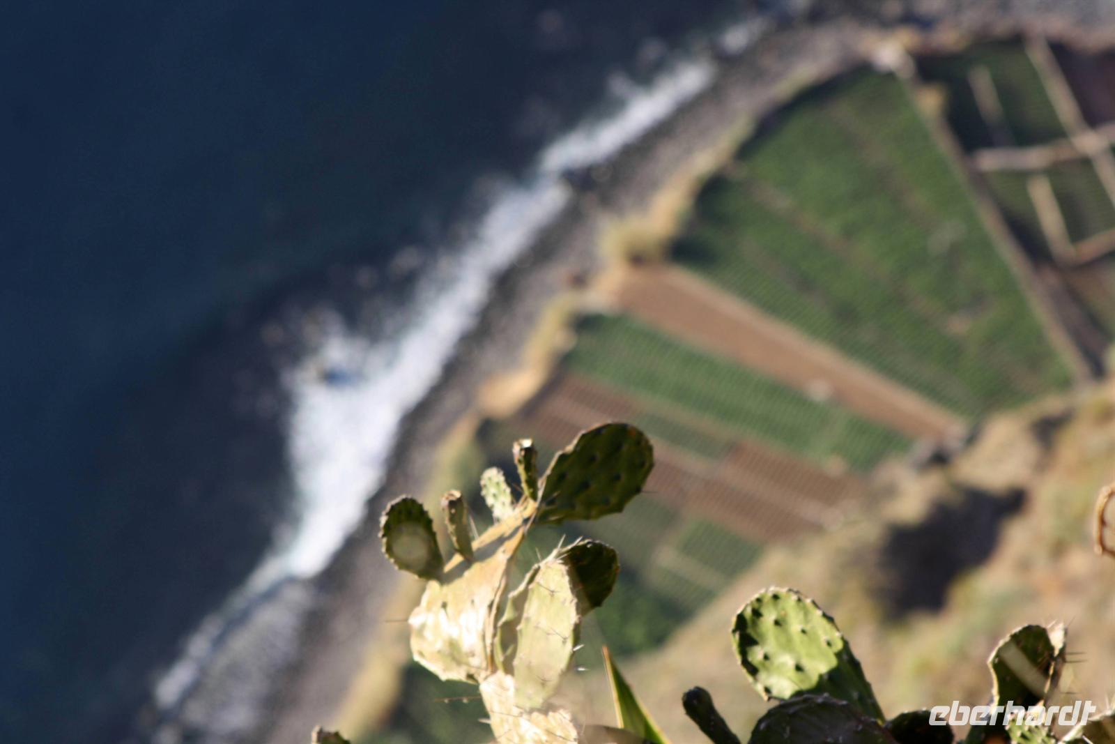 Der erste Tag des Jahres wird entspannt angegangen. Zum Mittag spazieren wir zum Restaurant „Atlantis", wo wir auf der Terrasse speisen. Wer möchte, begleitet mich zu einer wunderschönen Wanderung entlang der Levada von Maroços. Der Weg verläuft eben, immer entlang des künstlichen Wassergrabens. Die Levadas sind ein für Madeira charakteristische System zur Wasserversorgung und sozusagen die Lebensadern der der Insel. Viele Blumen und Pflanzen zieren den Wegesrand und wir finden sogar frische Cherimoyas. Die gelb-orange blühenden Girlandenblumen, die aus dem Himalaya stammen, wachsen hier wie Unkraut. Wir laufen im „Entenmarsch" vorbei an kleinen Dörfern, Feldern und Terrassen und bestaunen die abwechslungsreiche Flora. Immer wieder haben wir auch den weiten Blick auf das Meer und auf die Bucht von Machico. Ein herrlicher Neujahrs-Spaziergang!