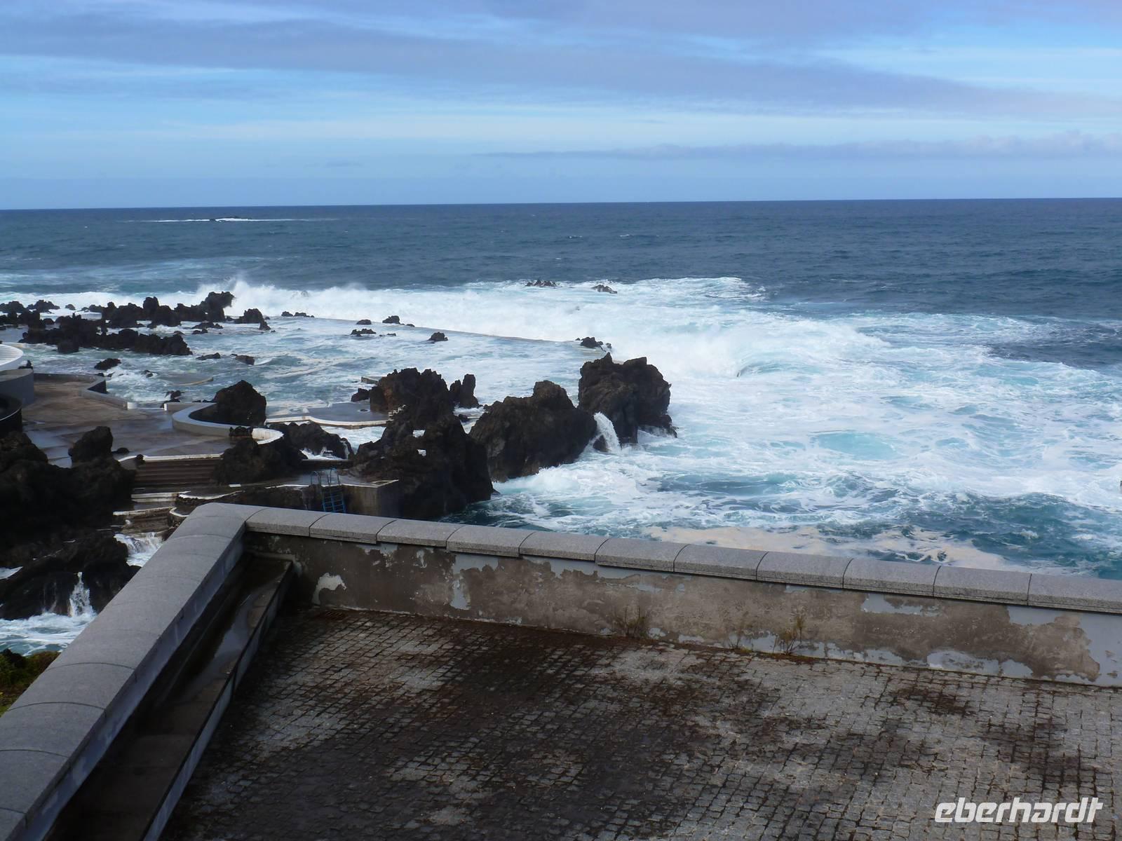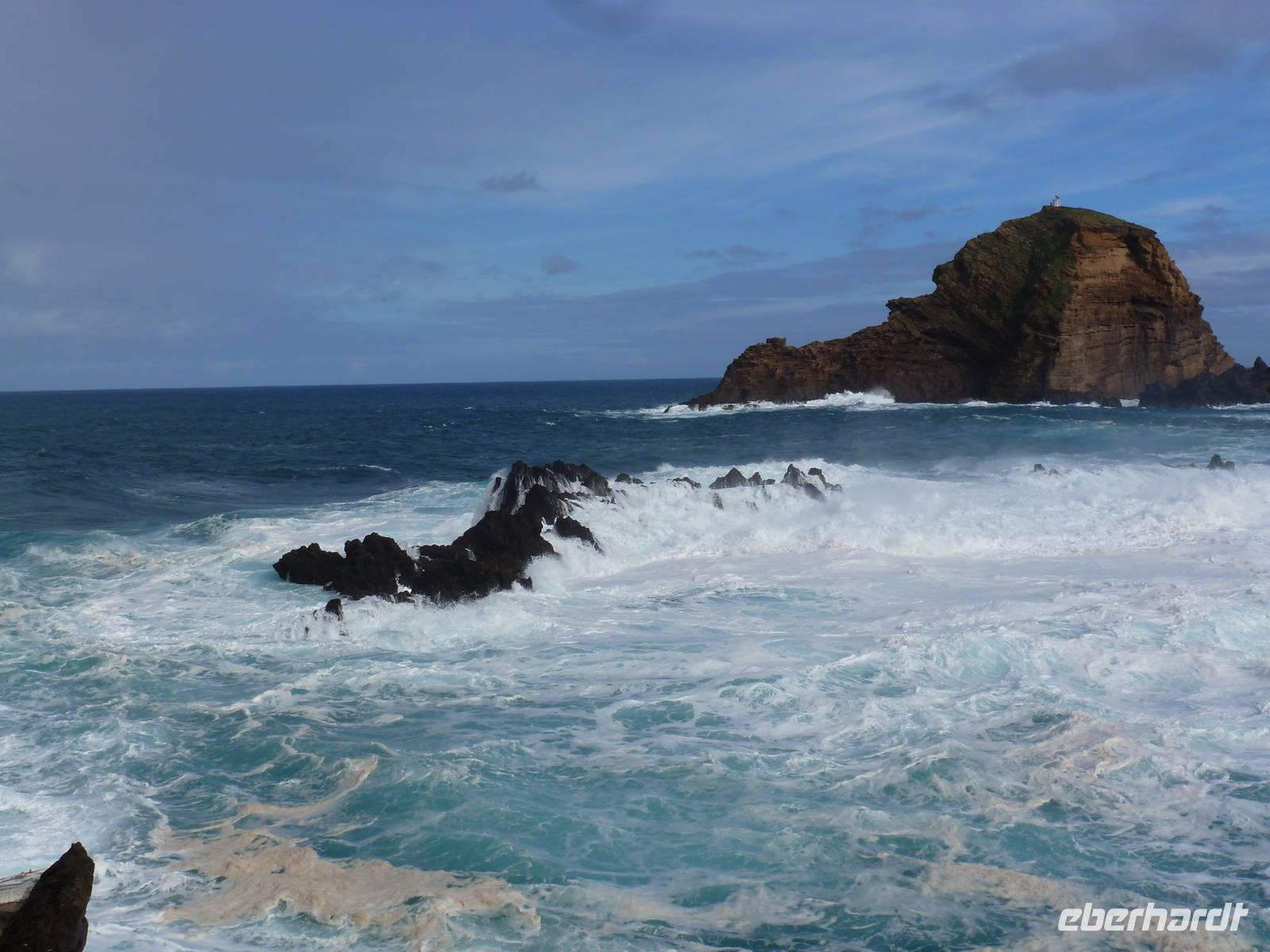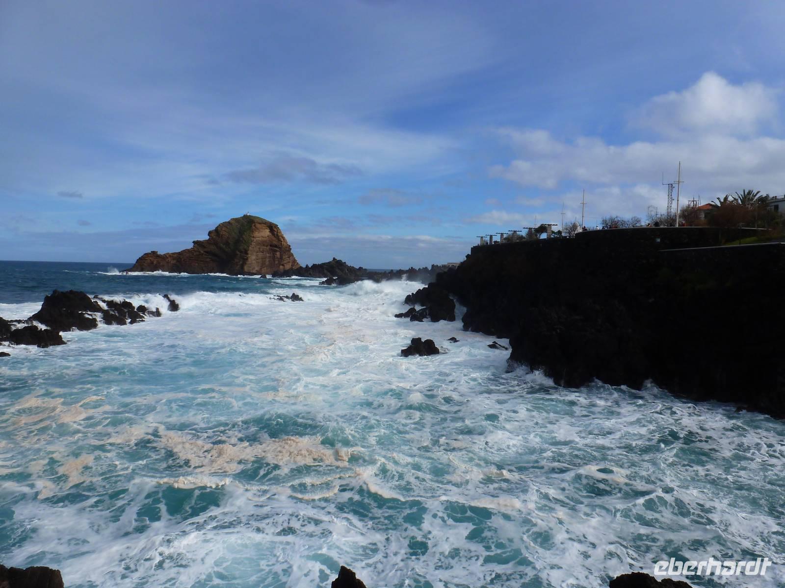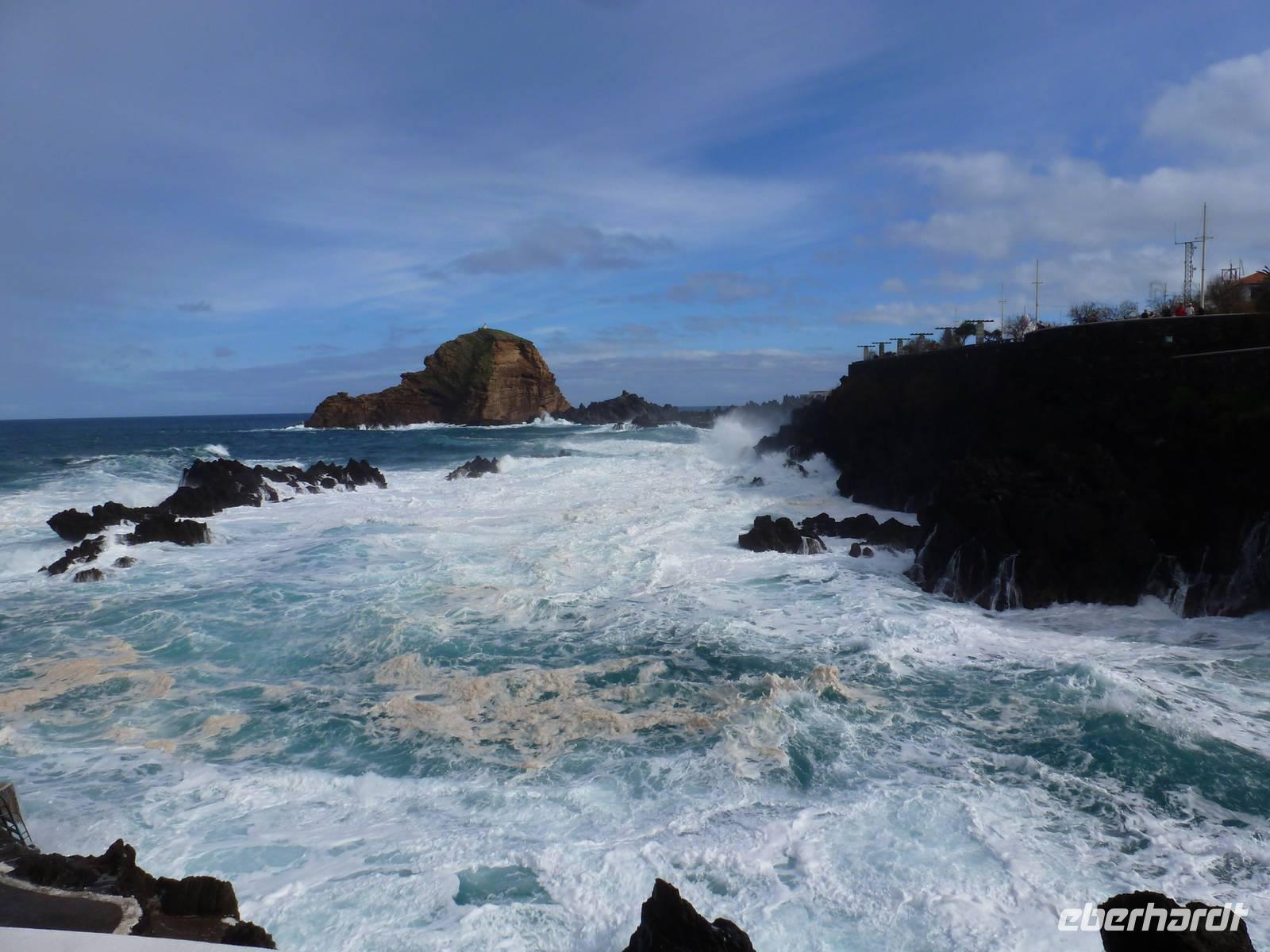 Heute Morgen müssen wir uns bereits von einigen Gästen verabschieden, denn diese fliegen heute bereits zurück nach Hause. Wir dürfen noch ein wenig bleiben und so fahren wir nach einem ausgiebigen Frühstück bei anfänglichen Regen zunächst nach Ribeira Brava, dem Zentrum des Westens. In Canico hat es bereits die ganze Nacht geregnet und eigentlich glauben wir alle nicht an einen Umschwung des Wetters, da sich der Himmel in einem düsteren Grau zeigt. Aber Luisa hat Petrus eine SMS geschickt und so strahlt wirklich wenige Minuten später wieder die Sonne. Wir hatten bei unserer Reise wirklich ein unfassbares Glück mit dem Wetter. In Ribeira Brava besuchen wir die kleine Ortskirche und die kleine Markthalle, in der nur drei Degenfische Platz haben. Auf Madeira ist eben alles ein bisschen kleiner. Anschließend fahren wir auf den berühmten Encumeada-Pass, der sich ganz oben dann doch nur im Nebel zeigt. Aber vorher können wir wirklich wunderbar sonnige Ausblicke auf die Westküste genießen. Unten angekommen besuchen wir das kleine Städtchen Sao Vicente, dessen Kirche und Friedhof wir besuchen. Danach führt uns unser Weg weiter nach Porto Moniz. Auf der Strecke sehen wir einige schöne Wasserfälle und Straßen, die durch Erdrutsche nicht mehr befahren werden können. Bereits von Weitem können wir anschließend die natürlichen Meeresschwimmbecken im Vulkangestein erkennen. Da es aber hier ein wenig regnerisch ist, entscheiden wir uns erst in das Restaurant Orca direkt am Meer einzukehren. Hier gilt es nun, welcher Degenfisch mit Banane den Gästen besser schmeckt. Und wie so oft, gewinnt der deutsche Koch vom Vortag, obwohl der Degenfisch auch hier nicht schlecht geschmeckt hat. Nach einem ausgiebigen Mittagessen unternehmen wir einen ausführlichen Spaziergang in Porto Moniz und sind begeistert, von den Wellen, die hier gegen das Gestein prallen. Ein tolles Naturschauspiel und auch hier werden wir nach dem Essen von Sonne verwöhnt. Anschließend kehren wir am Nachmittag zurück zu unserem Hotel und verabschieden unseren Gast, der erst morgen Vormittag nach Hause fliegt. Welch ein Glück, denn für uns beginnt die Heimreise bereits um 03:15 Uhr. So verbringen alle Gäste den Abend individuell und bereiten sich auf die frühe Abfahrt vor.