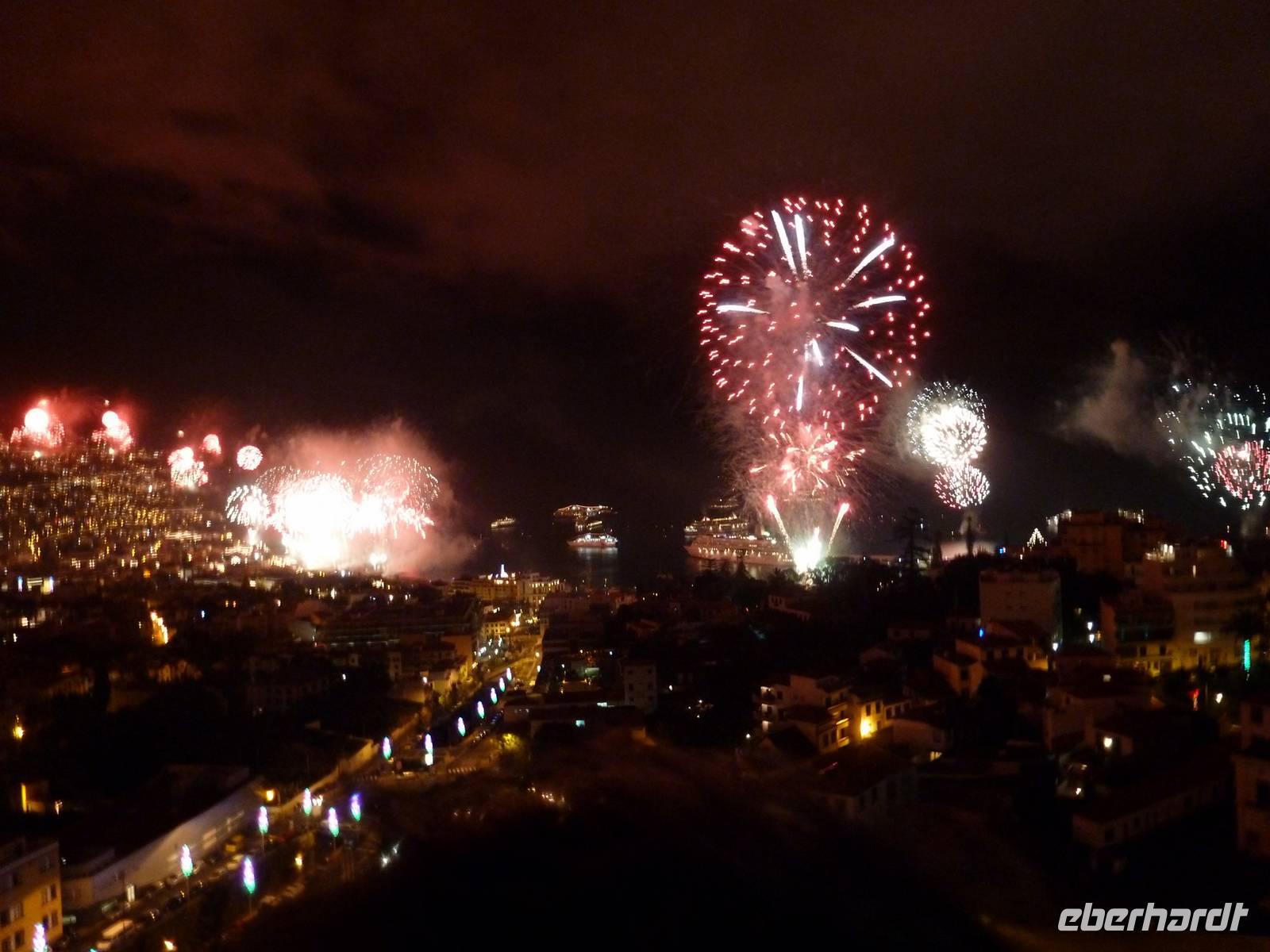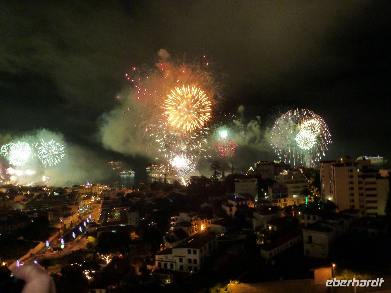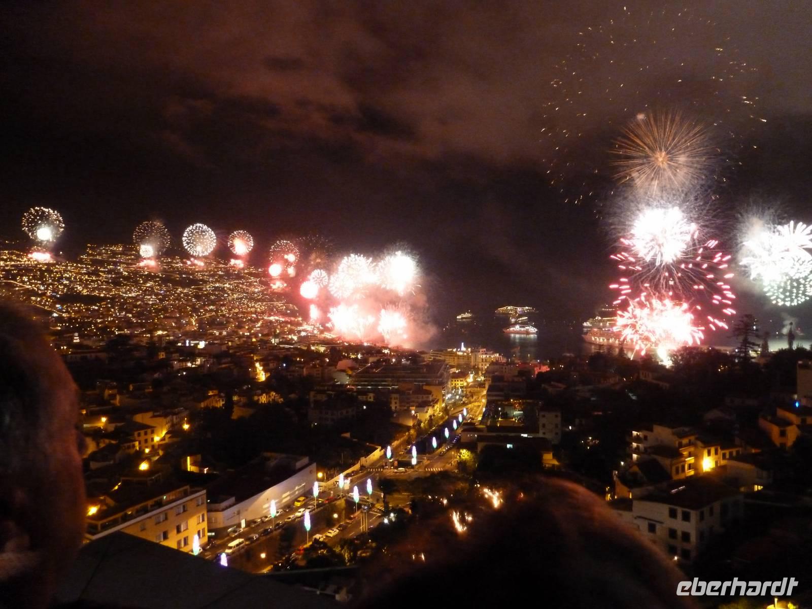 Anschließend führt uns unsere Reise in das kleine Fischerdorf Camara de Lobos, das schon Winston Churchill in seinen Bann zog. Hier genießen wir in einer Bar einen leckeren Nikita oder einen Passisonsfrucht Ponscha und danken dem edlen Spender, der diesen aufgrund eines wichtigen Anlasses heute für uns ausgegeben hat. Wir genießen das Kaiserwetter und verweilen ein wenig, auch wenn uns die Fischer hier doch etwas unheimlich vorkommen. Luisa erklärt uns auch, wie man die Spezialität, den schwarzen Degenfisch hier fängt und anschließend zubereitet. Einige von uns kamen schon in den Genuss dieser leckeren Spezialität, die mit einer frittierten Banane serviert wird. Anschließend führen uns einige Serpentinen nach Eira do Serrado. Hier genießen wir vom Aussichtspunkt eine tolle Aussicht auf das Nonnental und auf den Bodern eines erloschenen Vulkans. Eine tolle Sicht beschert uns traumhafte Fotomotive. Hier kehren wir in ein Restaurant ein und probieren traditionnelle maderensische Tomaten - oder Esskastaniensuppe und maderensischen Wein. Alles schmeckt wunderbar und so ist es heute schon wieder nachmittags. Man merkt gar nicht wie die Zeit vergeht. Bevor wir uns heute auf unsere Silvesterfeier vorbereiten, statten wir der Kräuterhexe Esmeralda noch einen Besuch in Ihrem Kräutergarten ab. Sie freut sich immer über unser Kommen und zeigt uns gern Ihre seltenen Kräuter, wie Nelken, Rosmarin oder auch ihren Lippenstiftbaum. Natürlich hat Sie auch Obstsorten wie Avocados oder Sternfrüchte. Herzlich lädt Sie uns anschließend zu einem Stück Ihrer berühmten Wallnusstorte und zu einem Brot mit Chilli-Pfeffer-Marmelade ein. Wir bedanken uns und machen uns auf den Rückweg zu unserem Hotel. Den restlichen Nachmittag ruhen wir uns aus und machen uns hübsch für unser Gala Dinner, das am Abend um 19:00 Uhr stattfindet. Wir bekommen ein Glas Sekt zum Einlass und rüsten uns mit Kopfschmuck und Trompeten. Bei Live-Musik genießen wir ein tolles Buffet und der ein oder andere wagt auch ein Tänzchen. Um 22:00 Uhr holt uns unser Rogerio mit unserem Bus ab und wir fahren zum Four Views Baia Hotel in der Stadt Funchal. Hier fahren wir bis zur 11. Etage und genießen bei einem Glas Sekt pünkltich um 24:00 Uhr ein Feuerwerk, das wirklich seinesgleichen sucht. Hunderte Raketen bilden ein wahres Synchrontheater um uns herum und wir sind einfach nur beeindruckt. Happy New Year! Anschließend bringt uns unser Bus zurück zum Hotel und nach einem ereignisreichen Tag suchen viele den Weg in die Betten. Einige genießen noch eine Mitternachtssuppe an der Bar und ein Glas Wein oder Bier. Herzlich Willkommen im Jahr 2014!