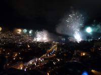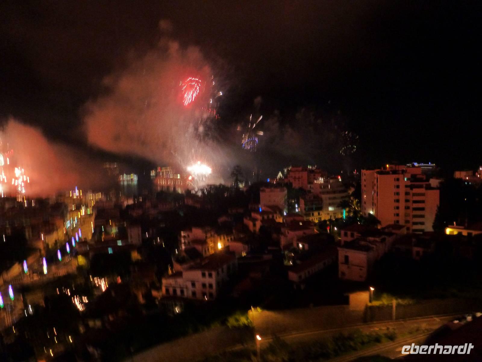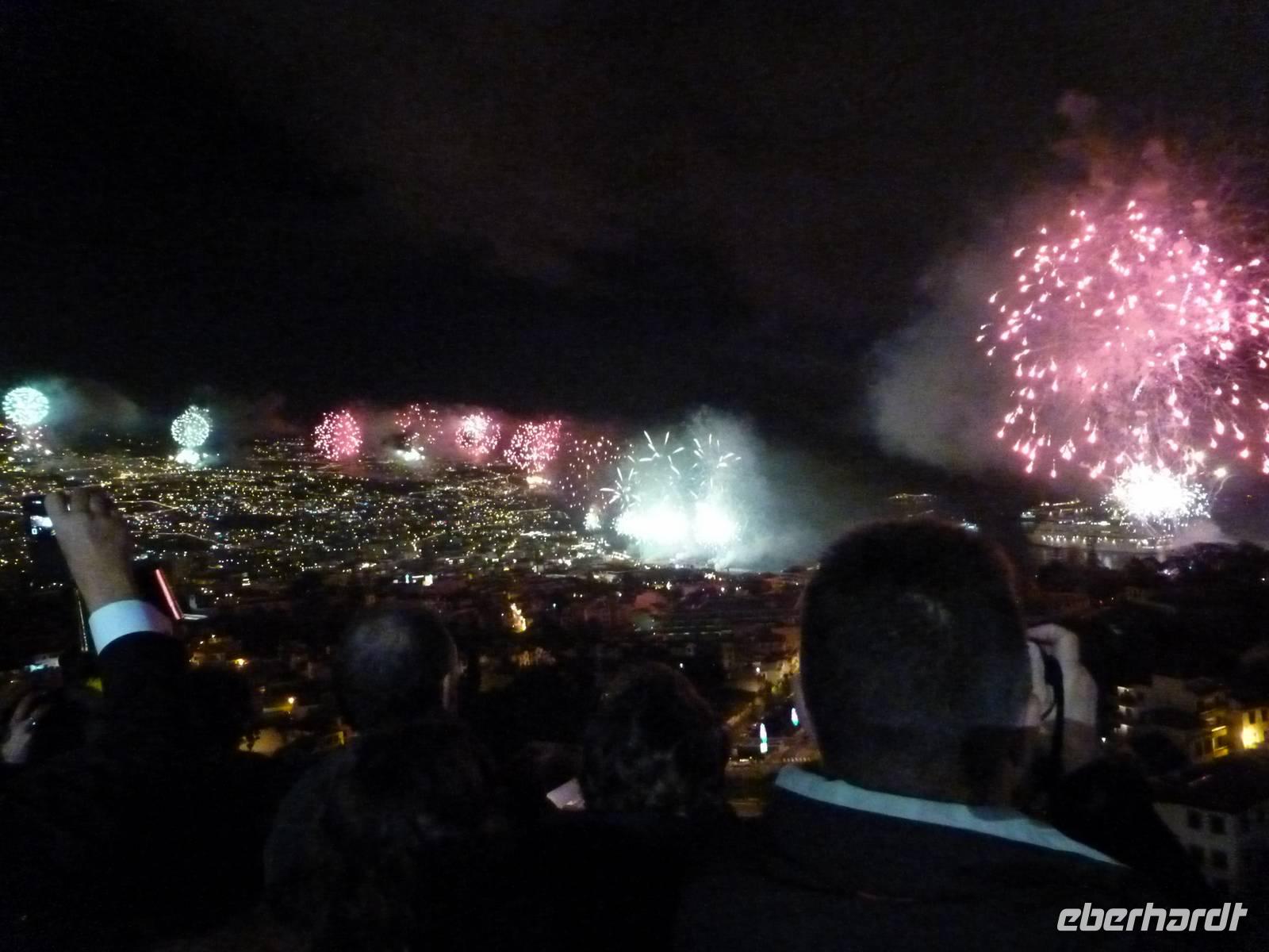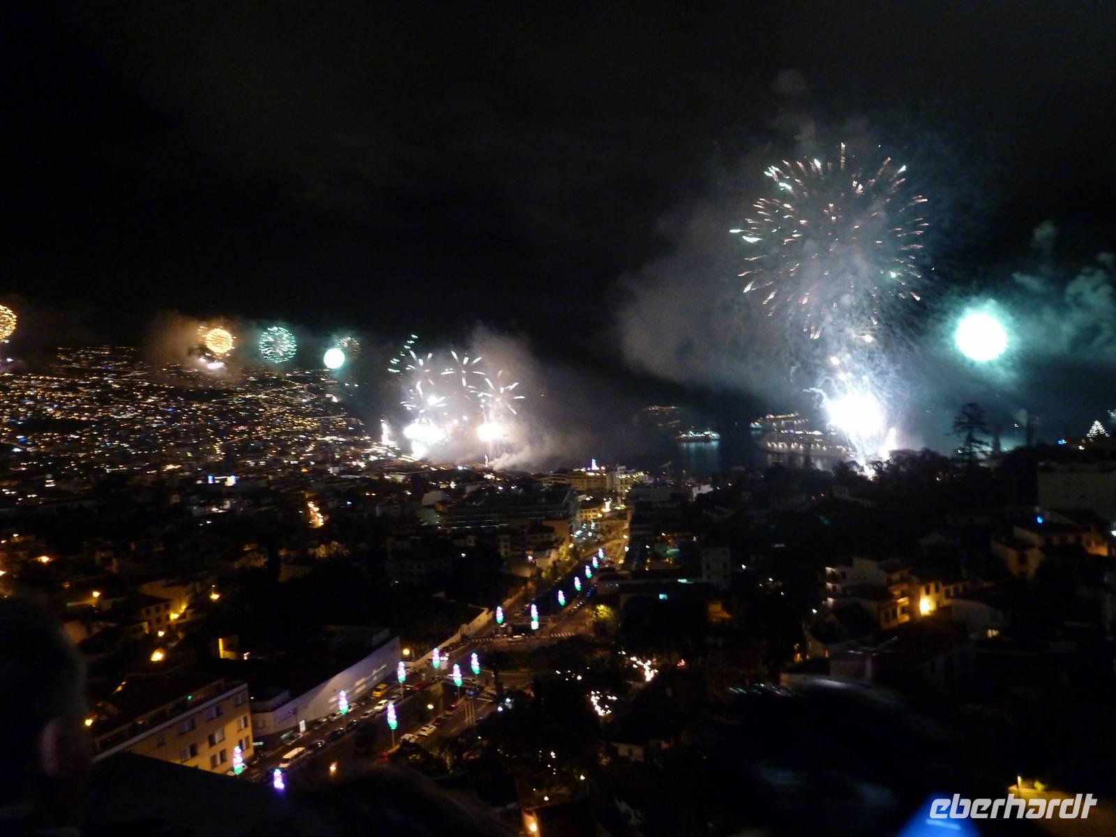 Anschließend führt uns unsere Reise in das kleine Fischerdorf Camara de Lobos, das schon Winston Churchill in seinen Bann zog. Hier genießen wir in einer Bar einen leckeren Nikita oder einen Passisonsfrucht Ponscha und danken dem edlen Spender, der diesen aufgrund eines wichtigen Anlasses heute für uns ausgegeben hat. Wir genießen das Kaiserwetter und verweilen ein wenig, auch wenn uns die Fischer hier doch etwas unheimlich vorkommen. Luisa erklärt uns auch, wie man die Spezialität, den schwarzen Degenfisch hier fängt und anschließend zubereitet. Einige von uns kamen schon in den Genuss dieser leckeren Spezialität, die mit einer frittierten Banane serviert wird. Anschließend führen uns einige Serpentinen nach Eira do Serrado. Hier genießen wir vom Aussichtspunkt eine tolle Aussicht auf das Nonnental und auf den Bodern eines erloschenen Vulkans. Eine tolle Sicht beschert uns traumhafte Fotomotive. Hier kehren wir in ein Restaurant ein und probieren traditionnelle maderensische Tomaten - oder Esskastaniensuppe und maderensischen Wein. Alles schmeckt wunderbar und so ist es heute schon wieder nachmittags. Man merkt gar nicht wie die Zeit vergeht. Bevor wir uns heute auf unsere Silvesterfeier vorbereiten, statten wir der Kräuterhexe Esmeralda noch einen Besuch in Ihrem Kräutergarten ab. Sie freut sich immer über unser Kommen und zeigt uns gern Ihre seltenen Kräuter, wie Nelken, Rosmarin oder auch ihren Lippenstiftbaum. Natürlich hat Sie auch Obstsorten wie Avocados oder Sternfrüchte. Herzlich lädt Sie uns anschließend zu einem Stück Ihrer berühmten Wallnusstorte und zu einem Brot mit Chilli-Pfeffer-Marmelade ein. Wir bedanken uns und machen uns auf den Rückweg zu unserem Hotel. Den restlichen Nachmittag ruhen wir uns aus und machen uns hübsch für unser Gala Dinner, das am Abend um 19:00 Uhr stattfindet. Wir bekommen ein Glas Sekt zum Einlass und rüsten uns mit Kopfschmuck und Trompeten. Bei Live-Musik genießen wir ein tolles Buffet und der ein oder andere wagt auch ein Tänzchen. Um 22:00 Uhr holt uns unser Rogerio mit unserem Bus ab und wir fahren zum Four Views Baia Hotel in der Stadt Funchal. Hier fahren wir bis zur 11. Etage und genießen bei einem Glas Sekt pünkltich um 24:00 Uhr ein Feuerwerk, das wirklich seinesgleichen sucht. Hunderte Raketen bilden ein wahres Synchrontheater um uns herum und wir sind einfach nur beeindruckt. Happy New Year! Anschließend bringt uns unser Bus zurück zum Hotel und nach einem ereignisreichen Tag suchen viele den Weg in die Betten. Einige genießen noch eine Mitternachtssuppe an der Bar und ein Glas Wein oder Bier. Herzlich Willkommen im Jahr 2014!