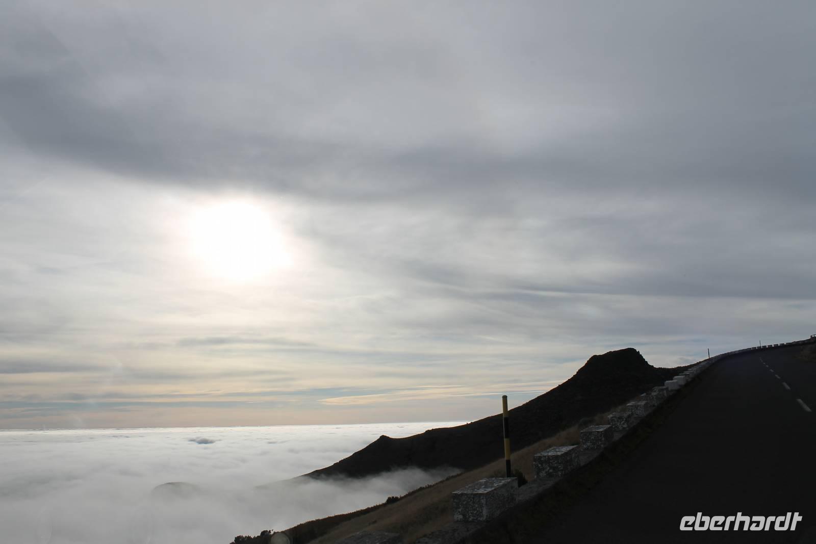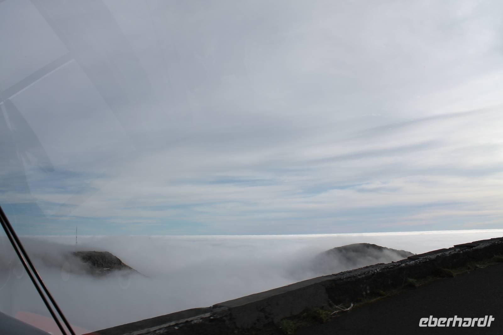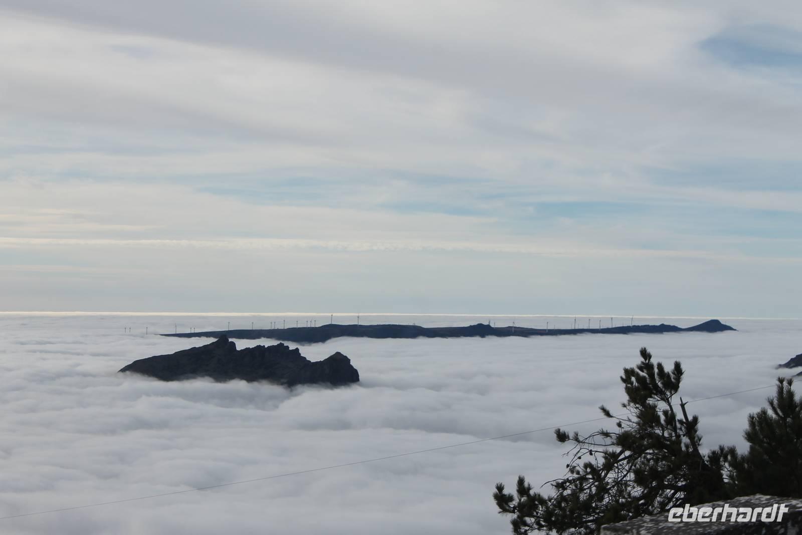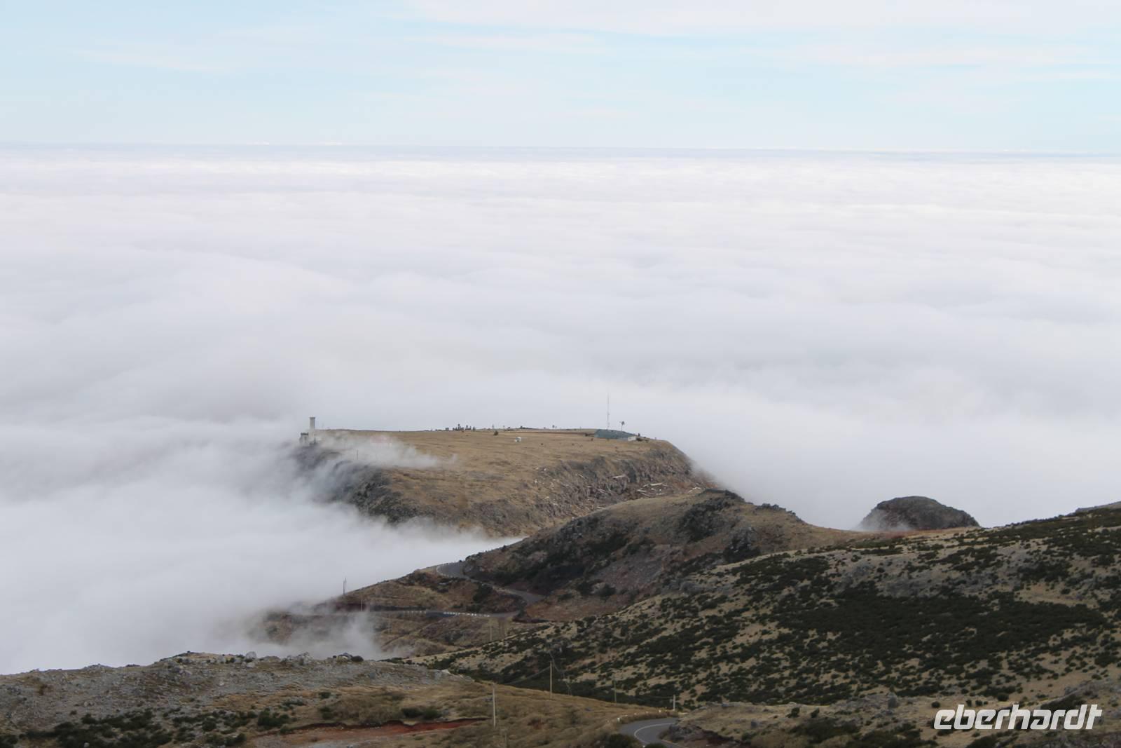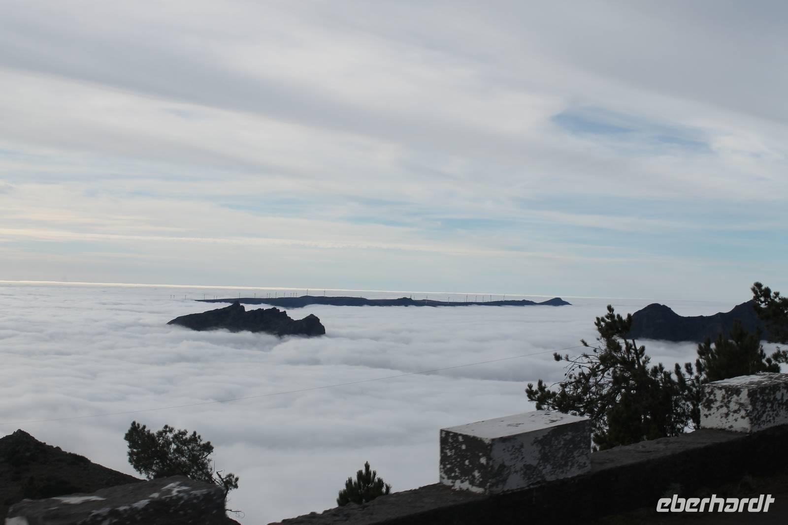 In ausgelassener Stimmung fahren wir nach Santana zum Mittagessen, was unsere Reiseleiterin vorher organisierte. Nach einer ausgiebigen Pause, spazieren wir gemütlich die wenigen Meter zu den wunderschönen Strohhäusern, wofür Santana bekannt ist. Nach einer halben Stunde. Gut gestärkt geht es mit dem Bus etwas weiter höher in die Berge. Dort unternehmen wir eine kleine Wanderung entlang einer Levada bis zum Aussichtspunkt Balcoen. Die Wolken hängen tief in den Bergen und es zieht sich immer mehr zu. Ganz im Gegenteil, bei unserem nächsten Stopp. Wir fahren zum Pico do Arieeiro, dem zweithöchsten Berg der Insel. Ab ca. 1600m überwinden wir die dichten Wolken und erreichen das Gipfelhaus auf ca. 1800m Höhe bei strahlendem Sonnenschein. Ein Traum! Die Wolken liegen unter uns und nur die höchsten Berge der Insel schauen leicht durch die Wolkendecke heraus. Nach diesem großen Highlight geht langsam der erste Tag zuende und wir erreichen unser Hotel gegen 18:00Uhr. Zum Abendessen spazieren wir dann in die Villa Ventura. Die meisten probieren die leckeren Fleischspieße oder den bekannten Degenfisch.