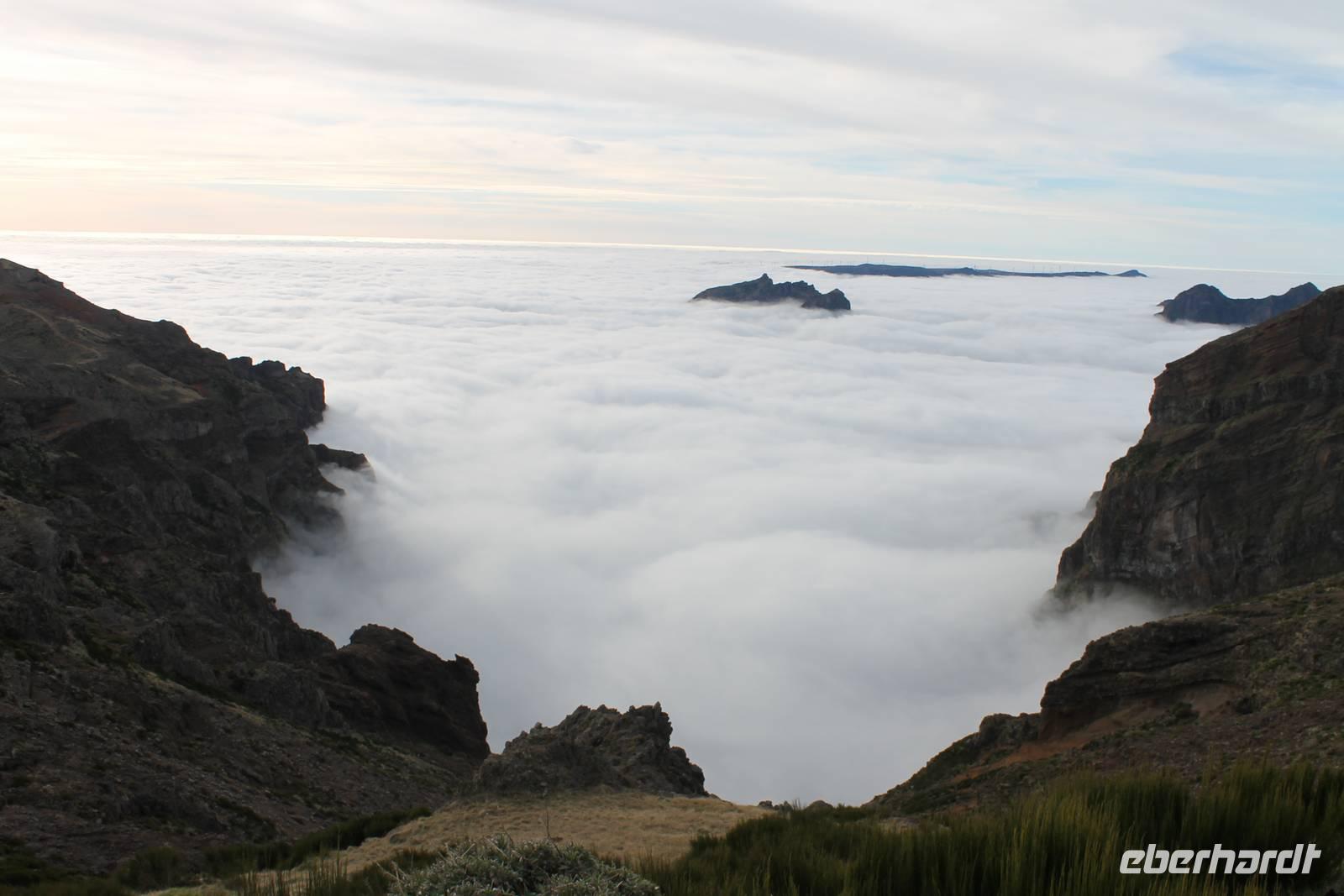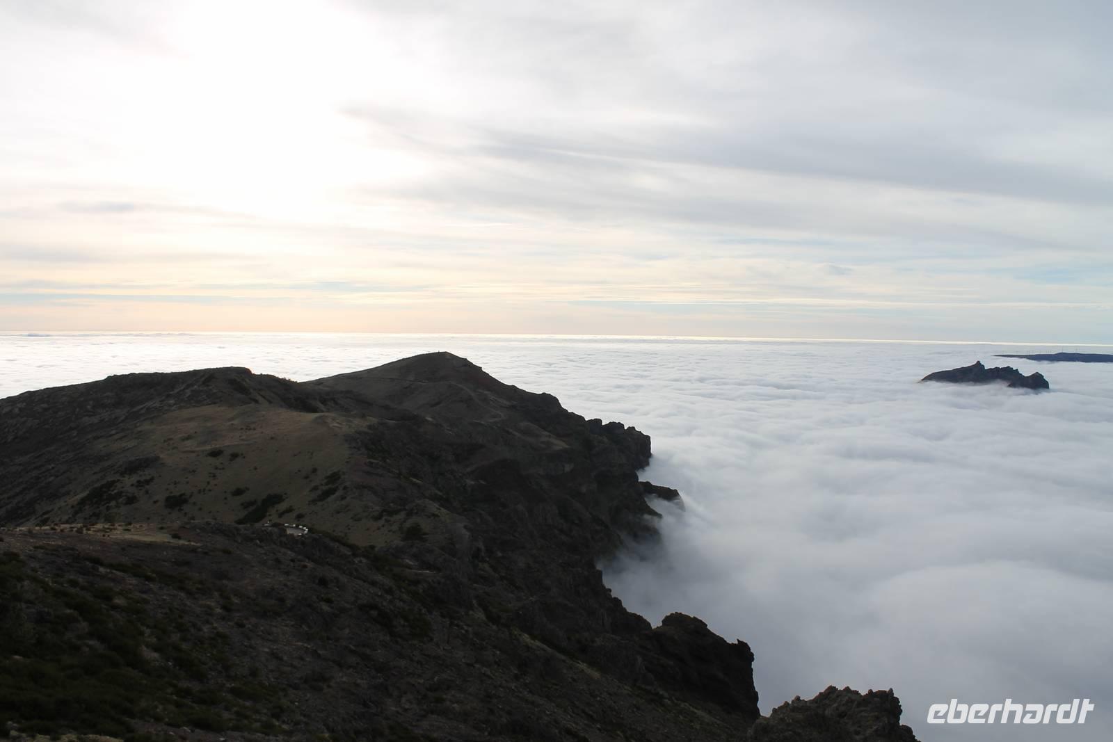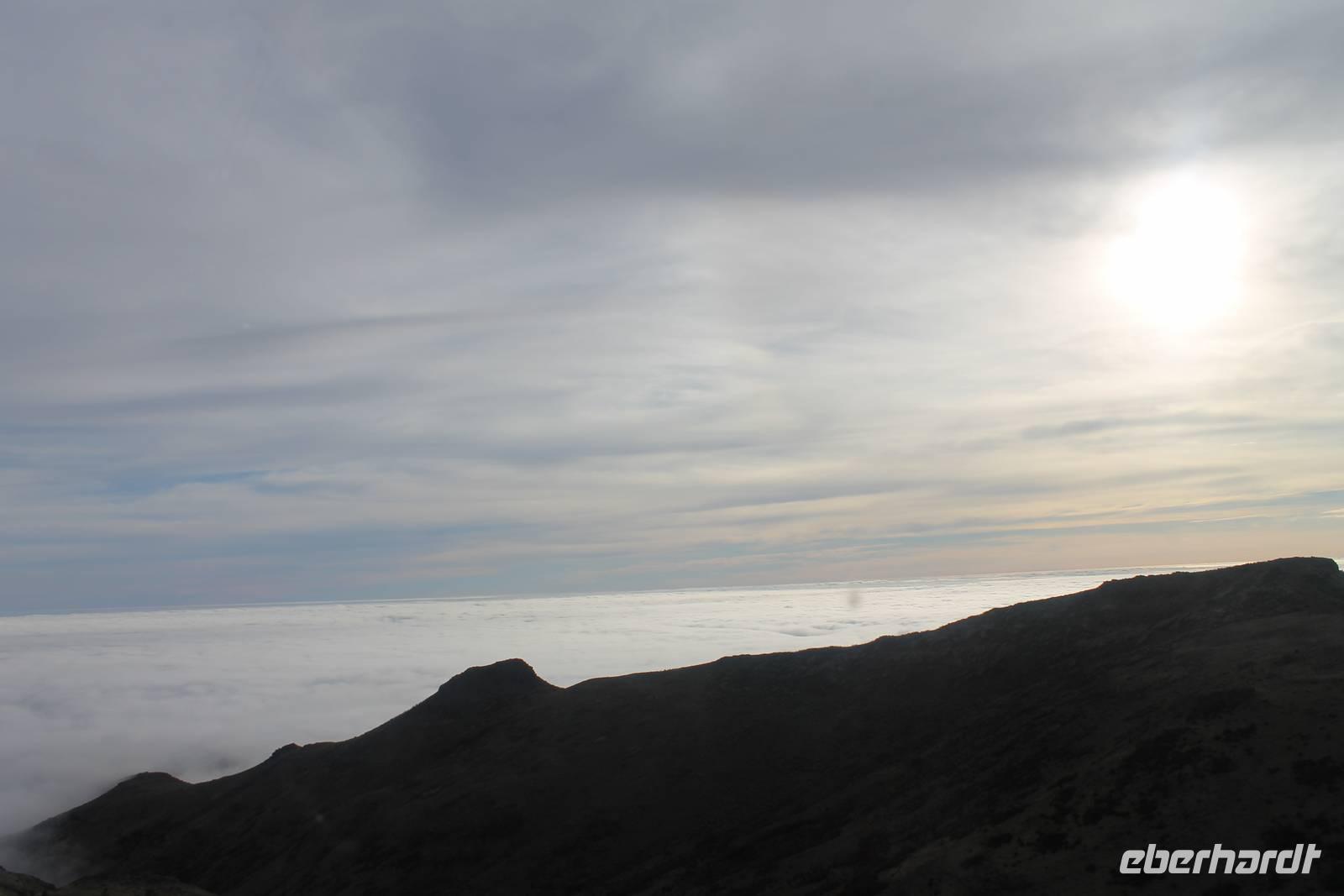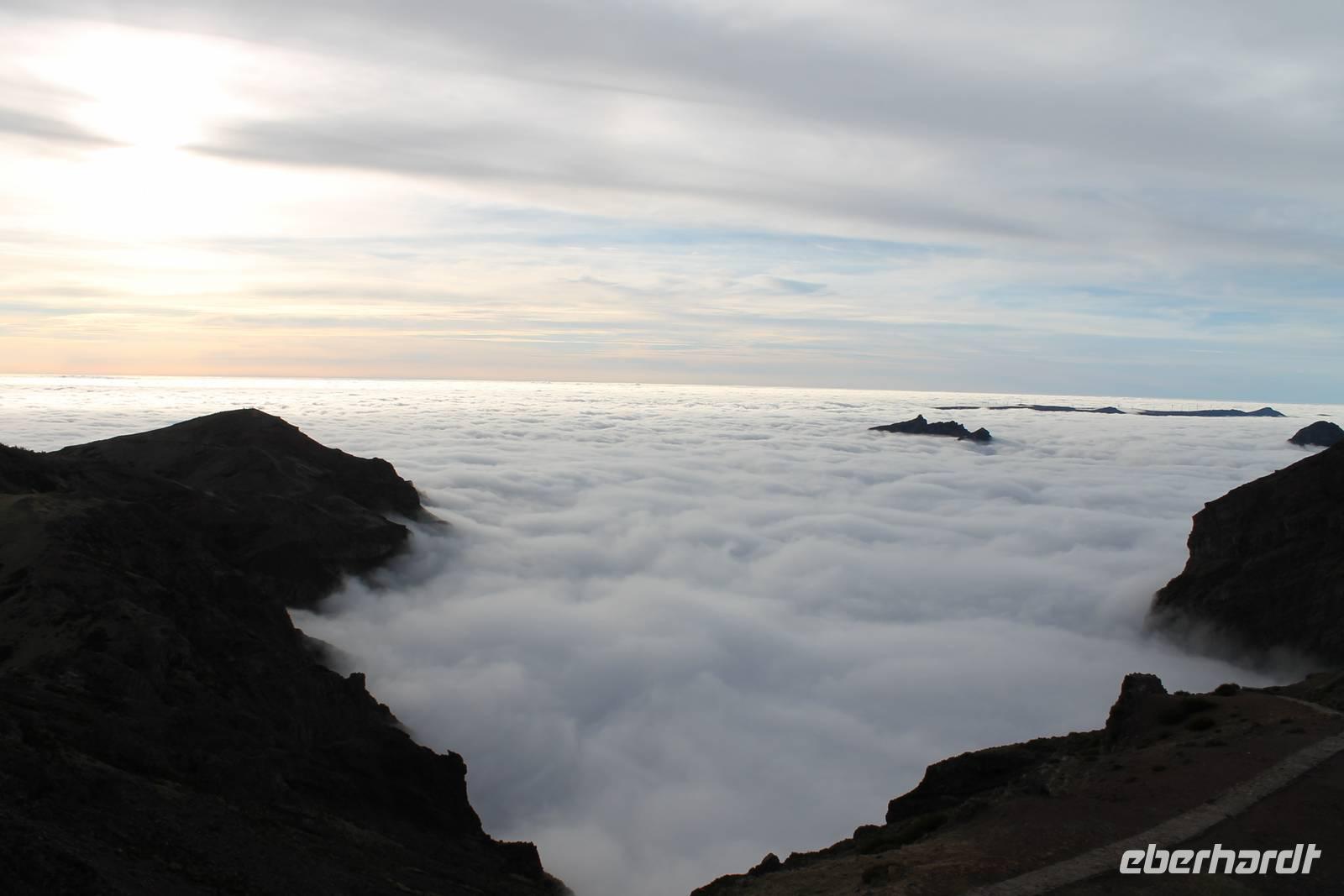In ausgelassener Stimmung fahren wir nach Santana zum Mittagessen, was unsere Reiseleiterin vorher organisierte. Nach einer ausgiebigen Pause, spazieren wir gemütlich die wenigen Meter zu den wunderschönen Strohhäusern, wofür Santana bekannt ist. Nach einer halben Stunde. Gut gestärkt geht es mit dem Bus etwas weiter höher in die Berge. Dort unternehmen wir eine kleine Wanderung entlang einer Levada bis zum Aussichtspunkt Balcoen. Die Wolken hängen tief in den Bergen und es zieht sich immer mehr zu. Ganz im Gegenteil, bei unserem nächsten Stopp. Wir fahren zum Pico do Arieeiro, dem zweithöchsten Berg der Insel. Ab ca. 1600m überwinden wir die dichten Wolken und erreichen das Gipfelhaus auf ca. 1800m Höhe bei strahlendem Sonnenschein. Ein Traum! Die Wolken liegen unter uns und nur die höchsten Berge der Insel schauen leicht durch die Wolkendecke heraus. Nach diesem großen Highlight geht langsam der erste Tag zuende und wir erreichen unser Hotel gegen 18:00Uhr. Zum Abendessen spazieren wir dann in die Villa Ventura. Die meisten probieren die leckeren Fleischspieße oder den bekannten Degenfisch.