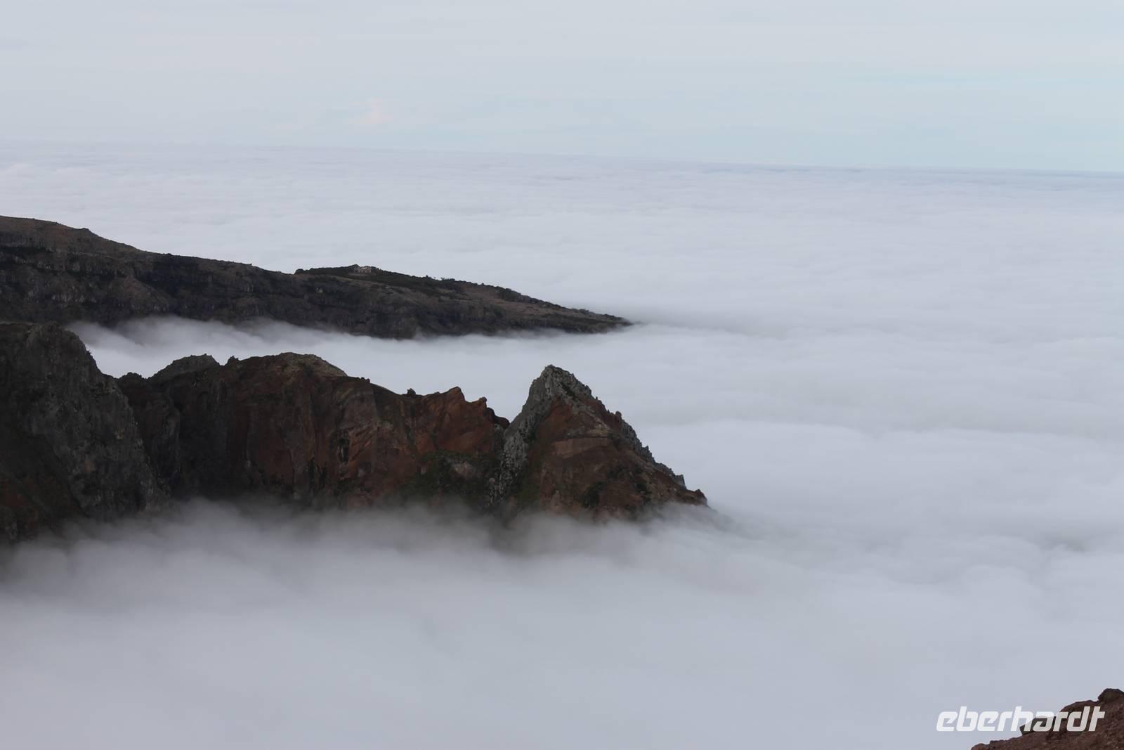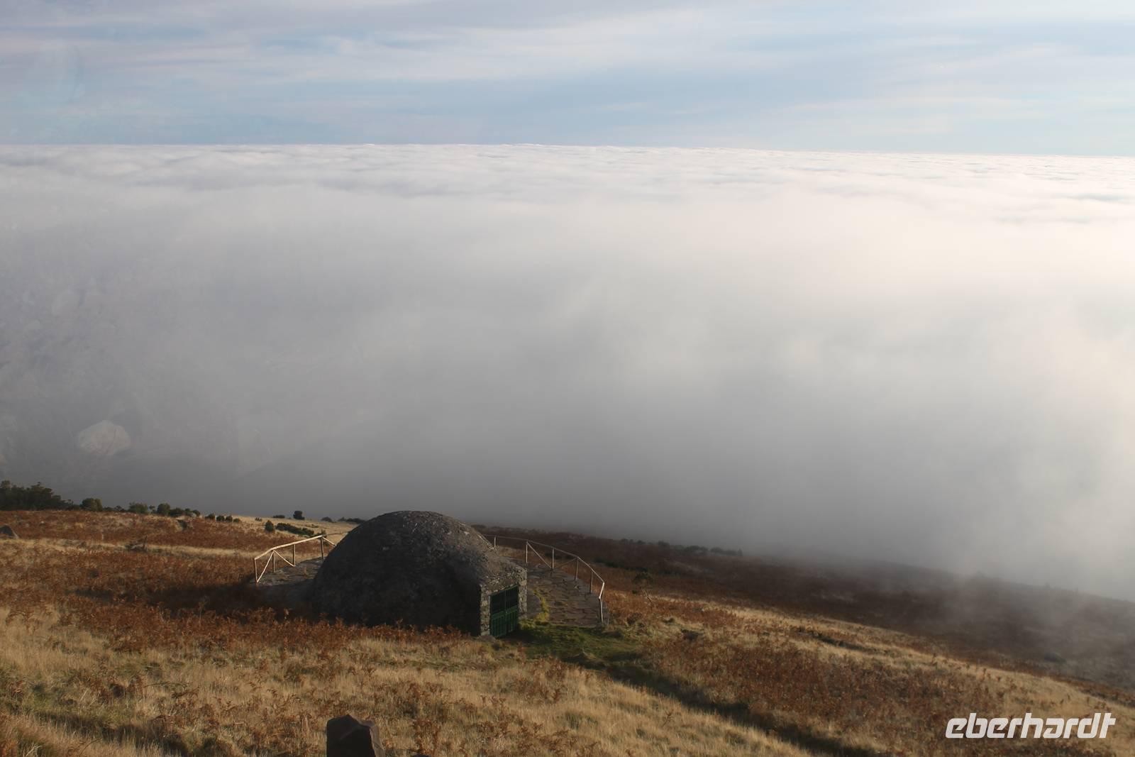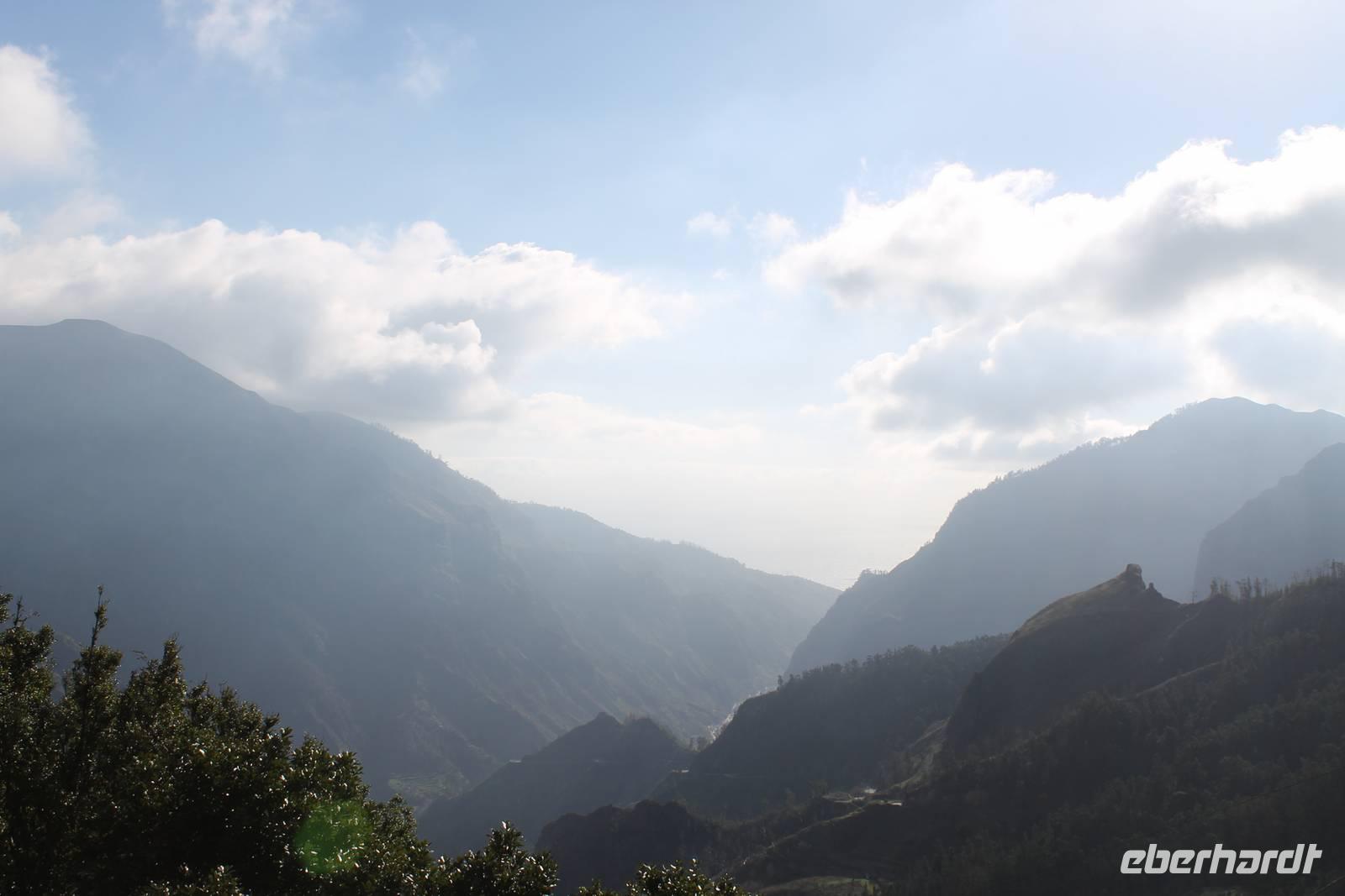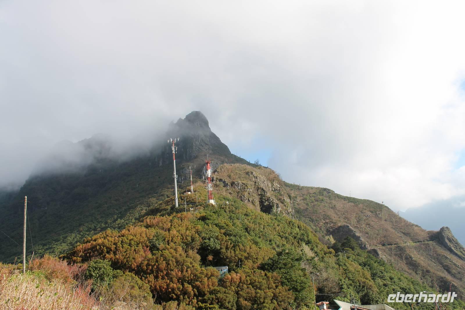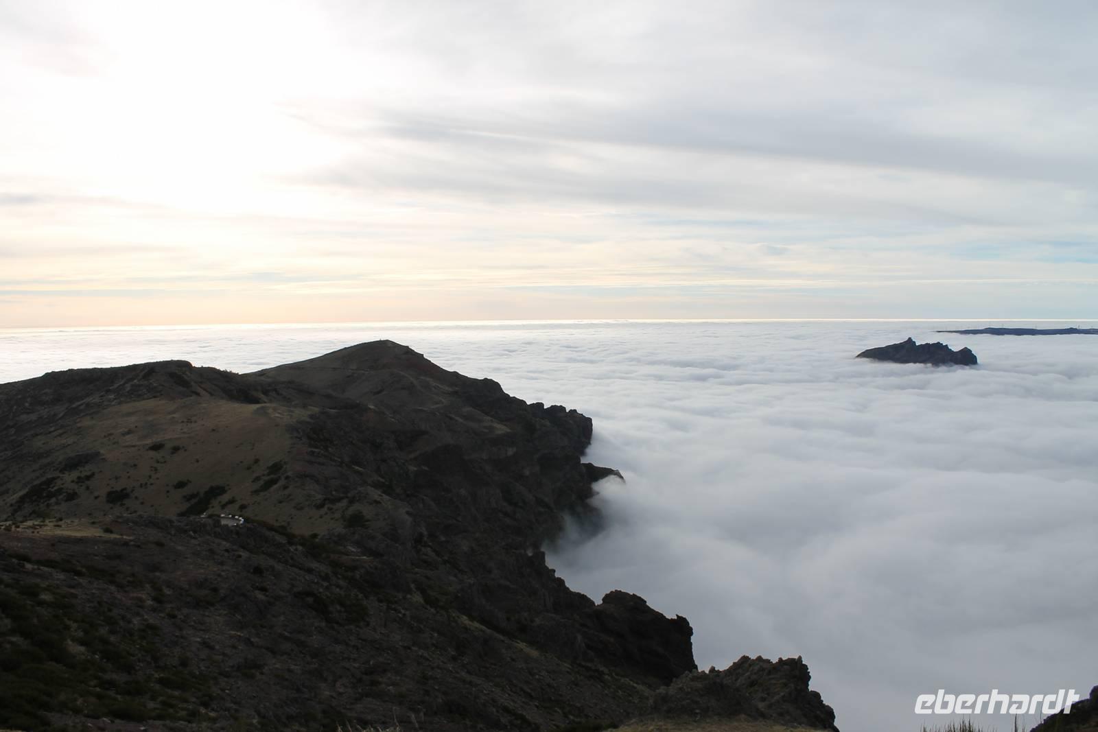 In ausgelassener Stimmung fahren wir nach Santana zum Mittagessen, was unsere Reiseleiterin vorher organisierte. Nach einer ausgiebigen Pause, spazieren wir gemütlich die wenigen Meter zu den wunderschönen Strohhäusern, wofür Santana bekannt ist. Nach einer halben Stunde. Gut gestärkt geht es mit dem Bus etwas weiter höher in die Berge. Dort unternehmen wir eine kleine Wanderung entlang einer Levada bis zum Aussichtspunkt Balcoen. Die Wolken hängen tief in den Bergen und es zieht sich immer mehr zu. Ganz im Gegenteil, bei unserem nächsten Stopp. Wir fahren zum Pico do Arieeiro, dem zweithöchsten Berg der Insel. Ab ca. 1600m überwinden wir die dichten Wolken und erreichen das Gipfelhaus auf ca. 1800m Höhe bei strahlendem Sonnenschein. Ein Traum! Die Wolken liegen unter uns und nur die höchsten Berge der Insel schauen leicht durch die Wolkendecke heraus. Nach diesem großen Highlight geht langsam der erste Tag zuende und wir erreichen unser Hotel gegen 18:00Uhr. Zum Abendessen spazieren wir dann in die Villa Ventura. Die meisten probieren die leckeren Fleischspieße oder den bekannten Degenfisch.