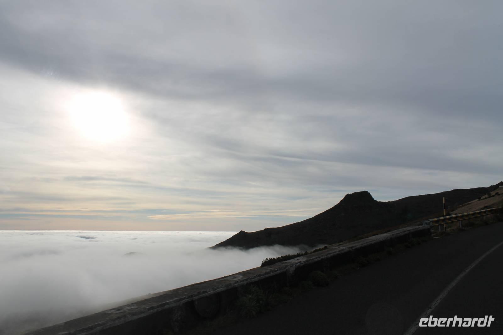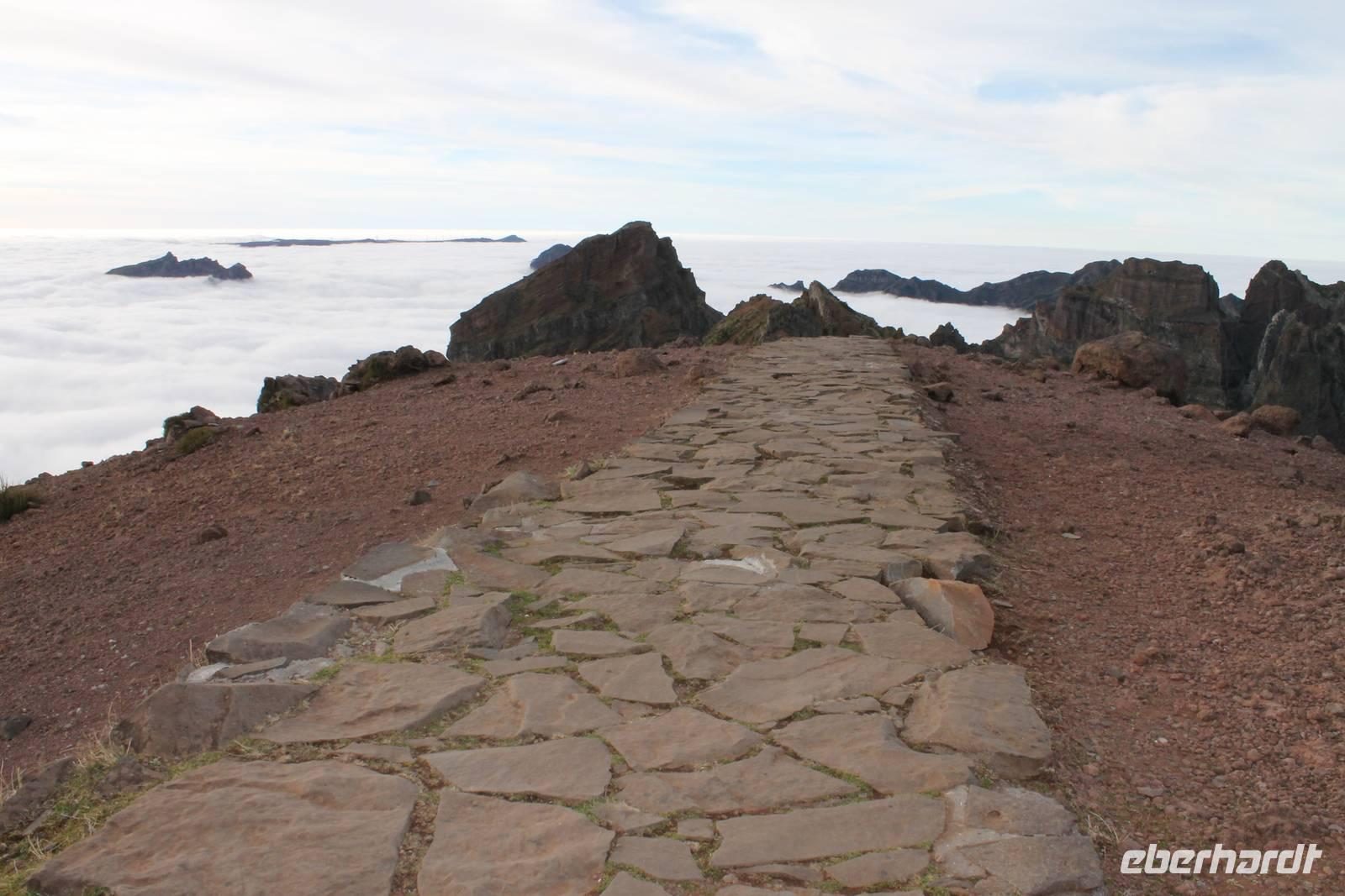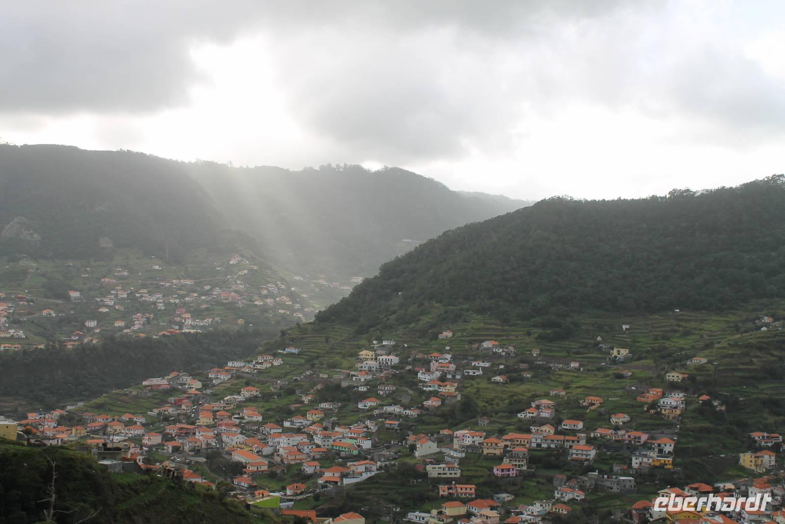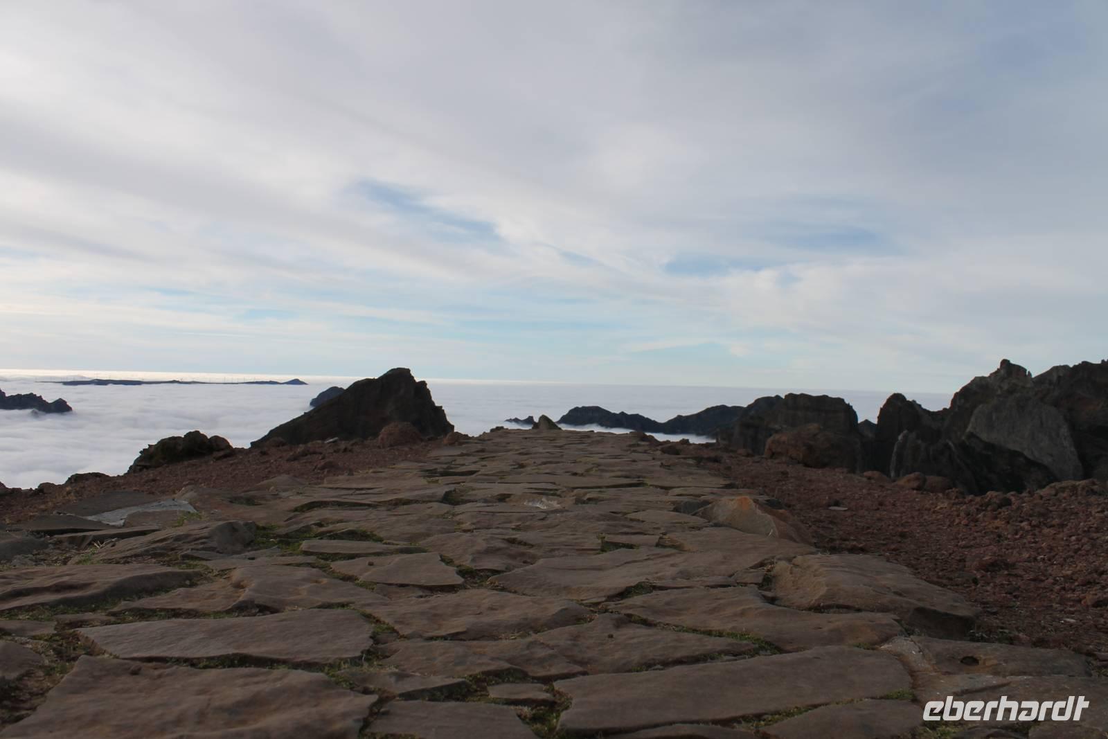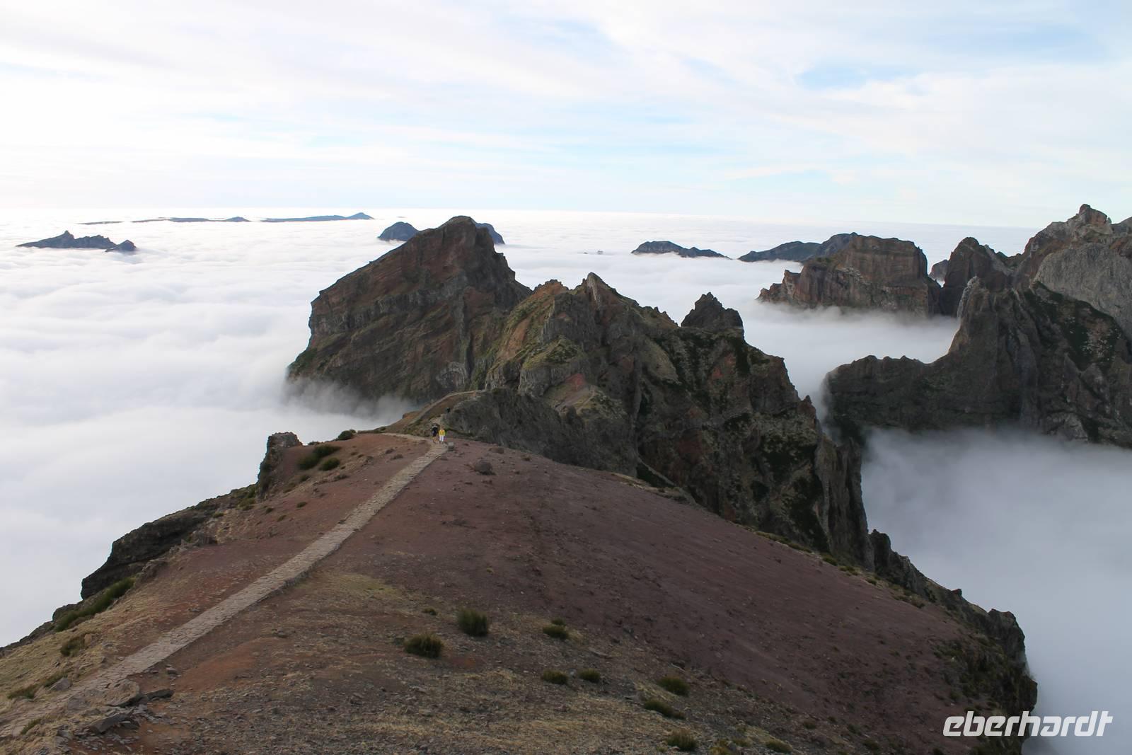 In ausgelassener Stimmung fahren wir nach Santana zum Mittagessen, was unsere Reiseleiterin vorher organisierte. Nach einer ausgiebigen Pause, spazieren wir gemütlich die wenigen Meter zu den wunderschönen Strohhäusern, wofür Santana bekannt ist. Nach einer halben Stunde. Gut gestärkt geht es mit dem Bus etwas weiter höher in die Berge. Dort unternehmen wir eine kleine Wanderung entlang einer Levada bis zum Aussichtspunkt Balcoen. Die Wolken hängen tief in den Bergen und es zieht sich immer mehr zu. Ganz im Gegenteil, bei unserem nächsten Stopp. Wir fahren zum Pico do Arieeiro, dem zweithöchsten Berg der Insel. Ab ca. 1600m überwinden wir die dichten Wolken und erreichen das Gipfelhaus auf ca. 1800m Höhe bei strahlendem Sonnenschein. Ein Traum! Die Wolken liegen unter uns und nur die höchsten Berge der Insel schauen leicht durch die Wolkendecke heraus. Nach diesem großen Highlight geht langsam der erste Tag zuende und wir erreichen unser Hotel gegen 18:00Uhr. Zum Abendessen spazieren wir dann in die Villa Ventura. Die meisten probieren die leckeren Fleischspieße oder den bekannten Degenfisch.