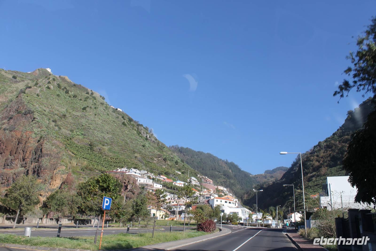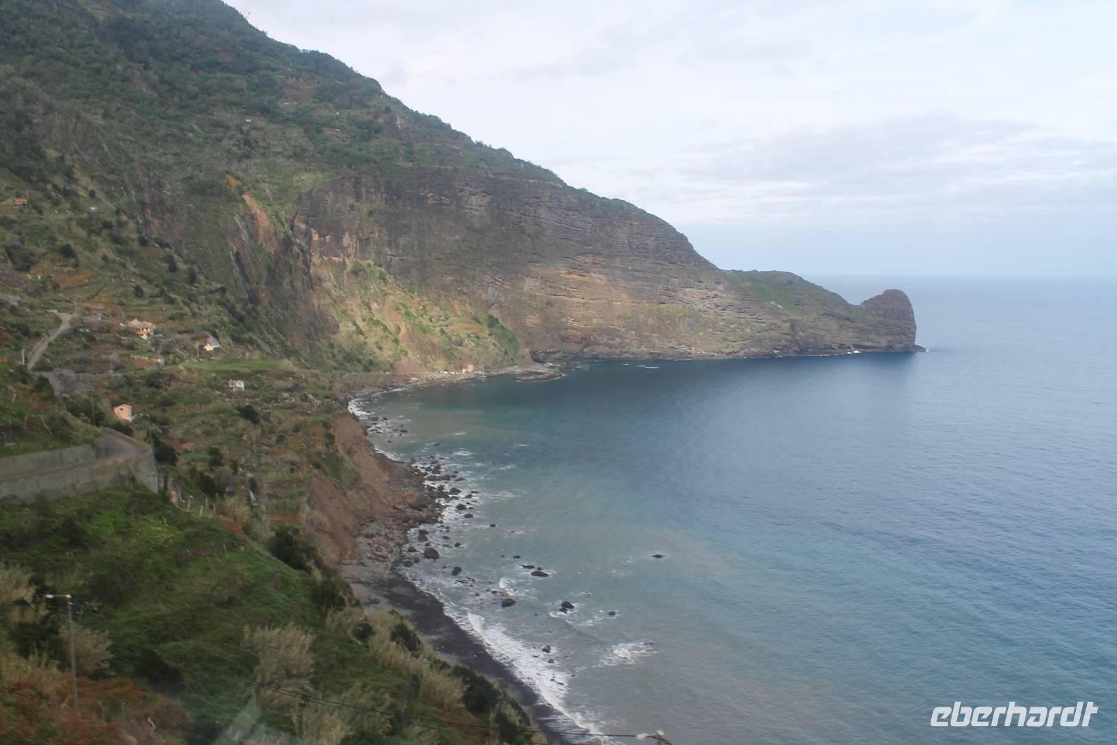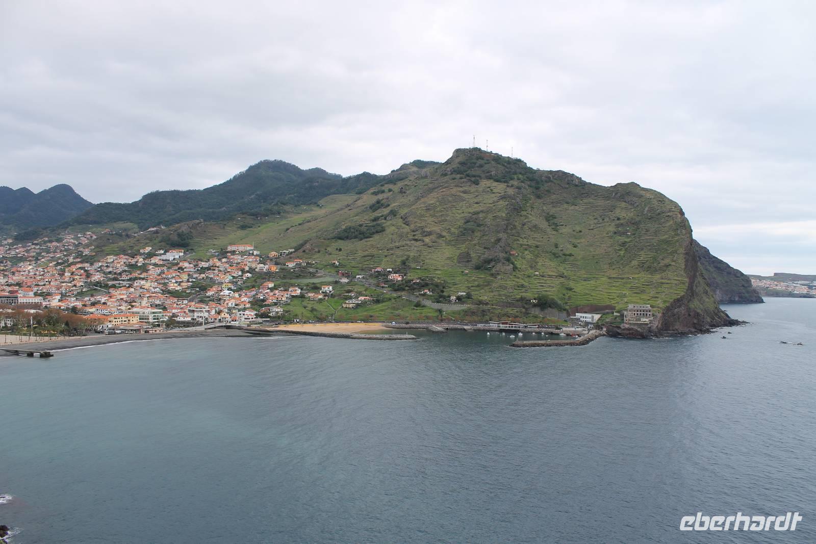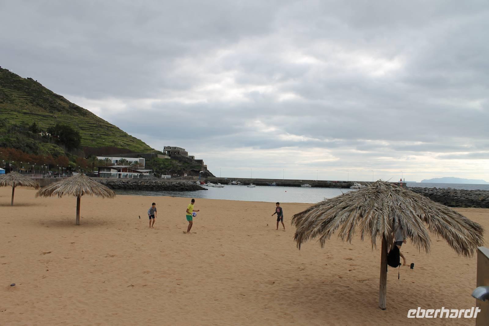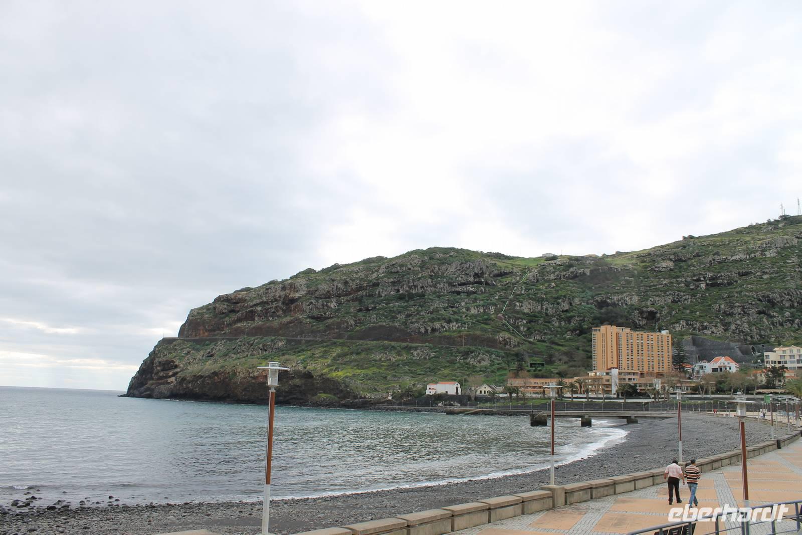 Nach der Ankunft werden wir direkt zum Hotel gebracht, checken ein und kurz danach treffen wir uns auch schon wieder mit der anderen Gruppe, um gemeinsam gegen 10.30 das Programm zu beginnen. Heute steht das gebirgige Landesinnere und die Ostküste auf dem Programm. Wir fahren zuerst nach Machico an der Ostküste, wo sich ein schöner (dunkler) Sandstand befindet.