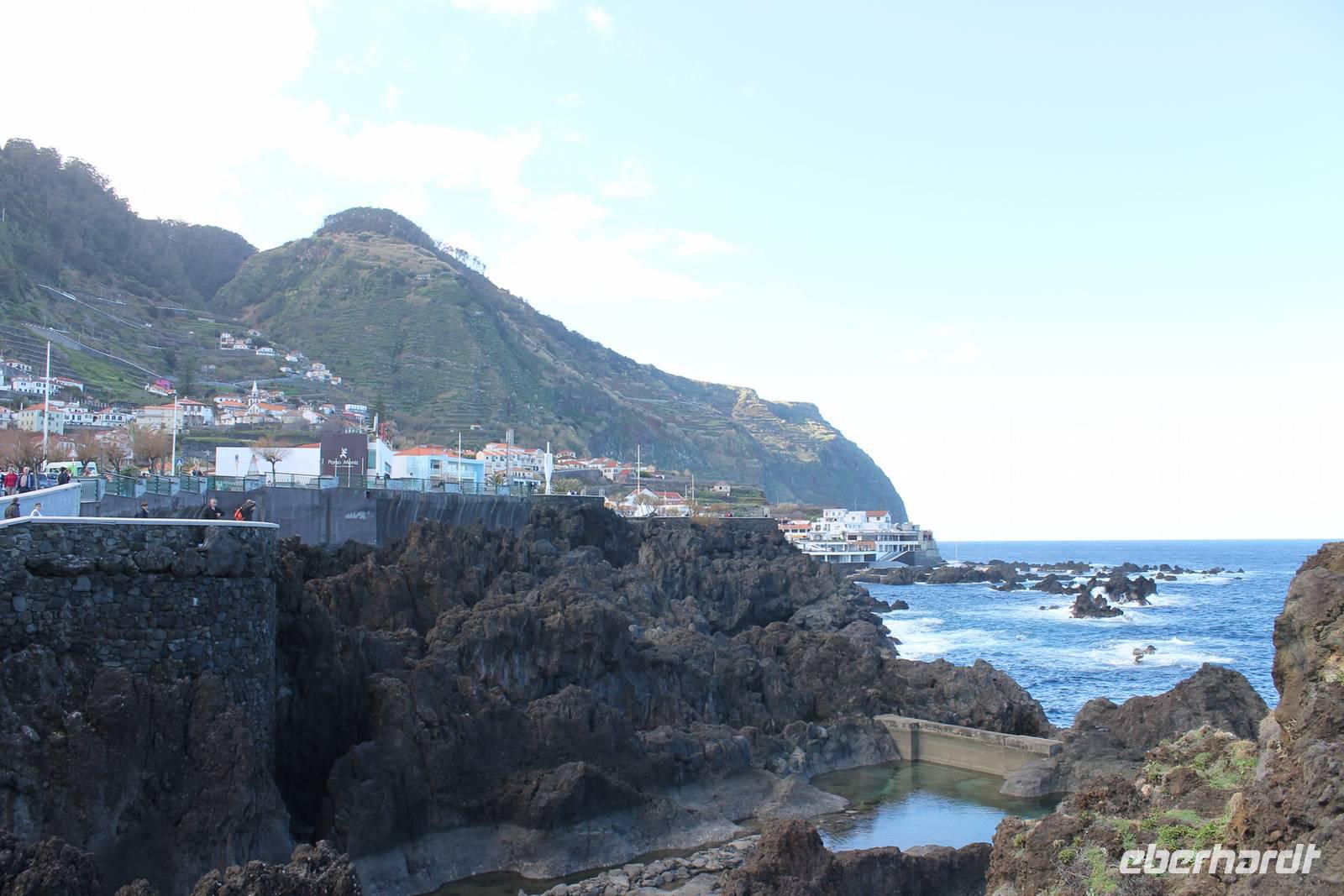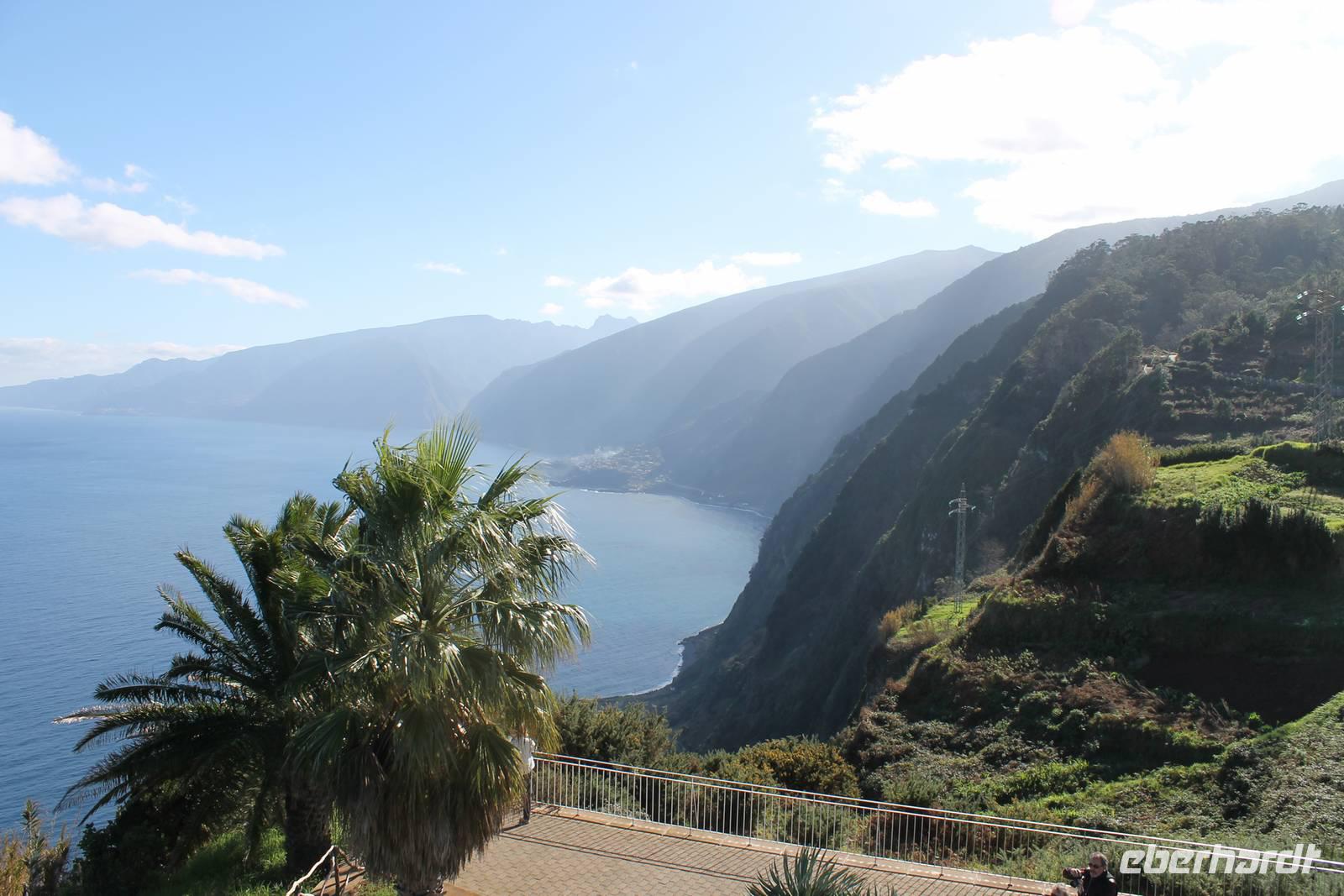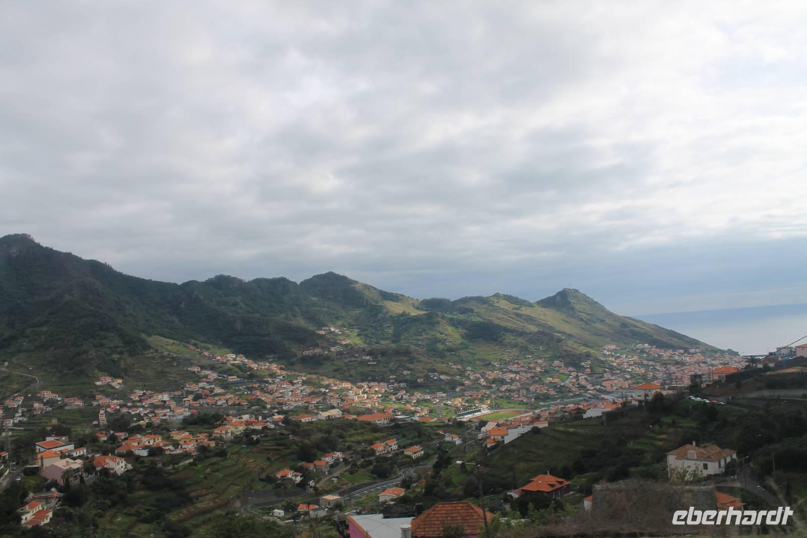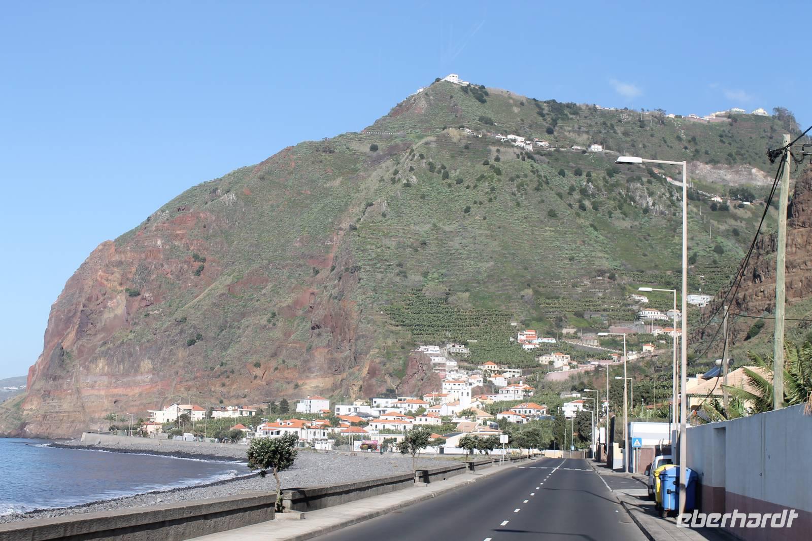 Nach der Ankunft werden wir direkt zum Hotel gebracht, checken ein und kurz danach treffen wir uns auch schon wieder mit der anderen Gruppe, um gemeinsam gegen 10.30 das Programm zu beginnen. Heute steht das gebirgige Landesinnere und die Ostküste auf dem Programm. Wir fahren zuerst nach Machico an der Ostküste, wo sich ein schöner (dunkler) Sandstand befindet.
