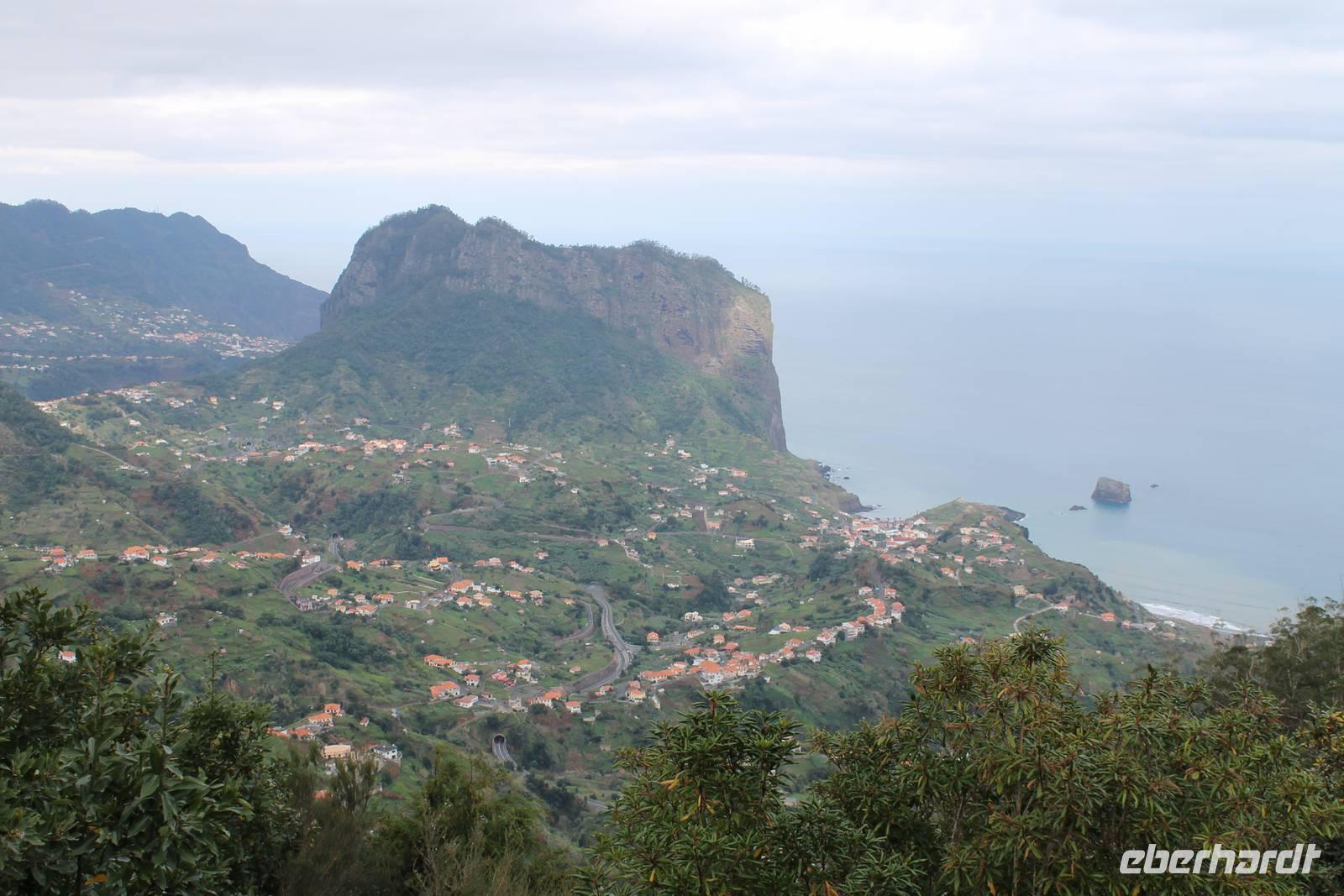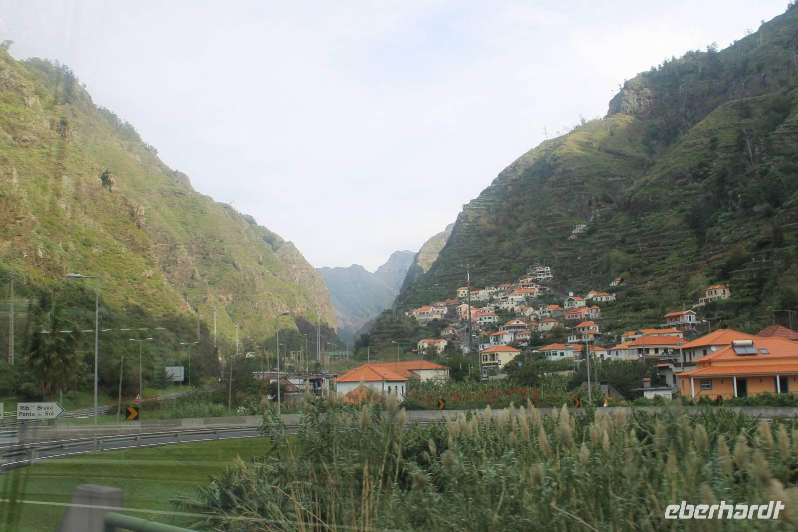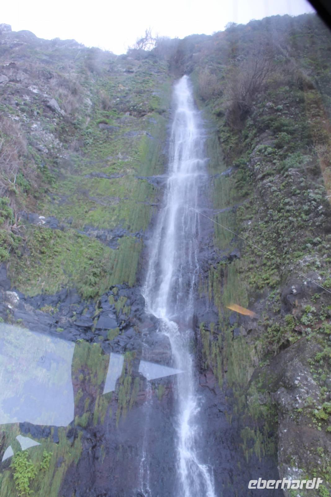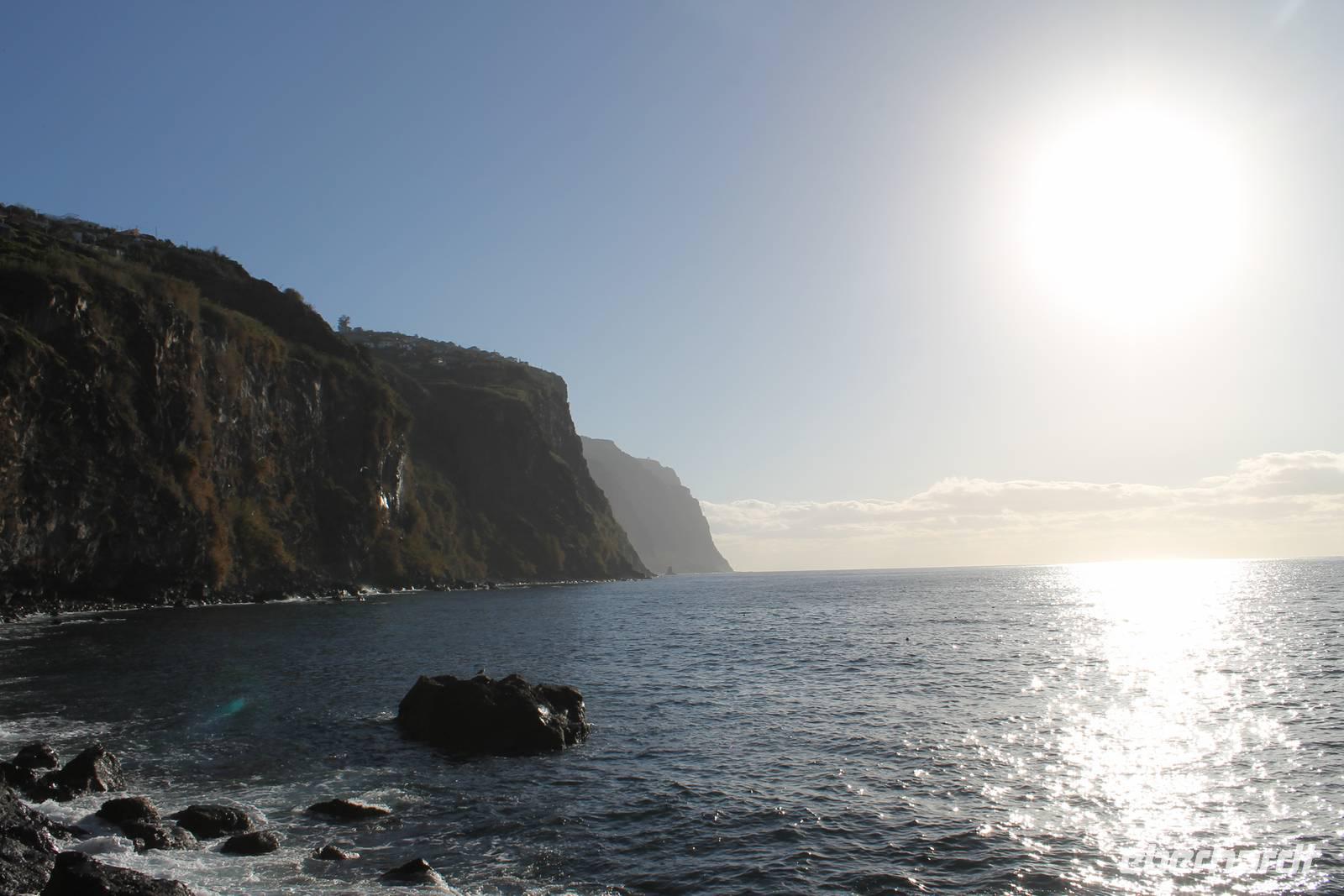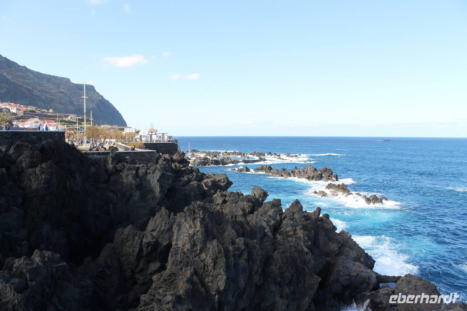 Nach der Ankunft werden wir direkt zum Hotel gebracht, checken ein und kurz danach treffen wir uns auch schon wieder mit der anderen Gruppe, um gemeinsam gegen 10.30 das Programm zu beginnen. Heute steht das gebirgige Landesinnere und die Ostküste auf dem Programm. Wir fahren zuerst nach Machico an der Ostküste, wo sich ein schöner (dunkler) Sandstand befindet.