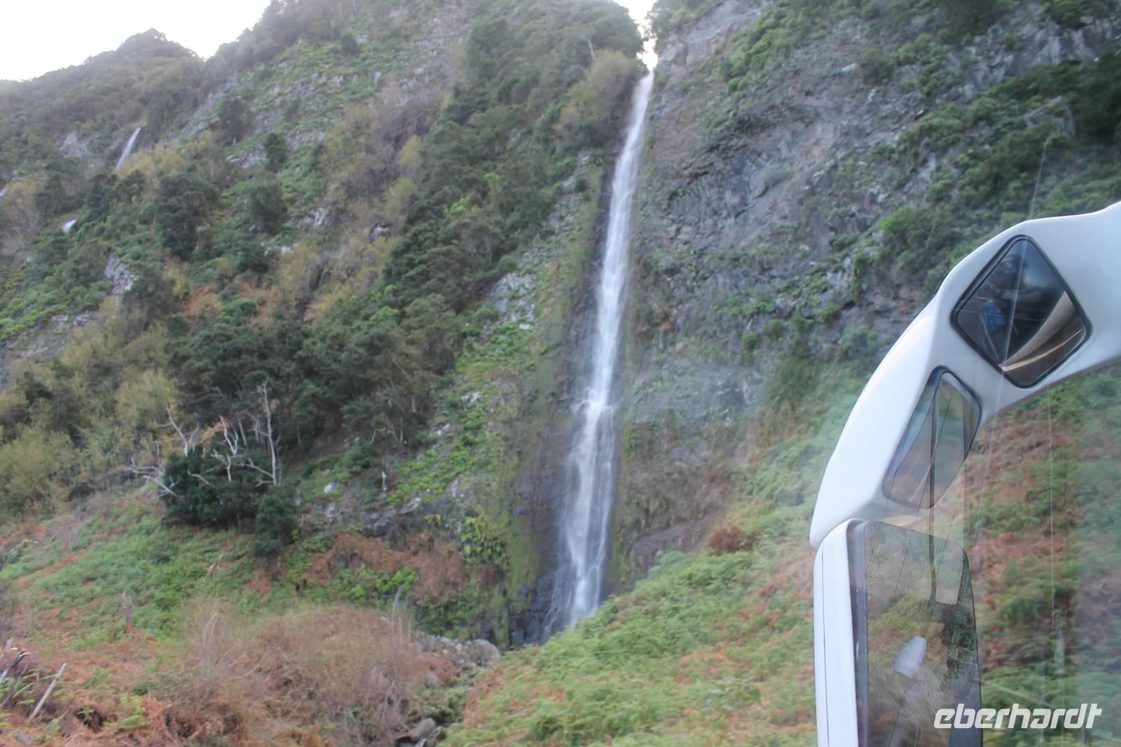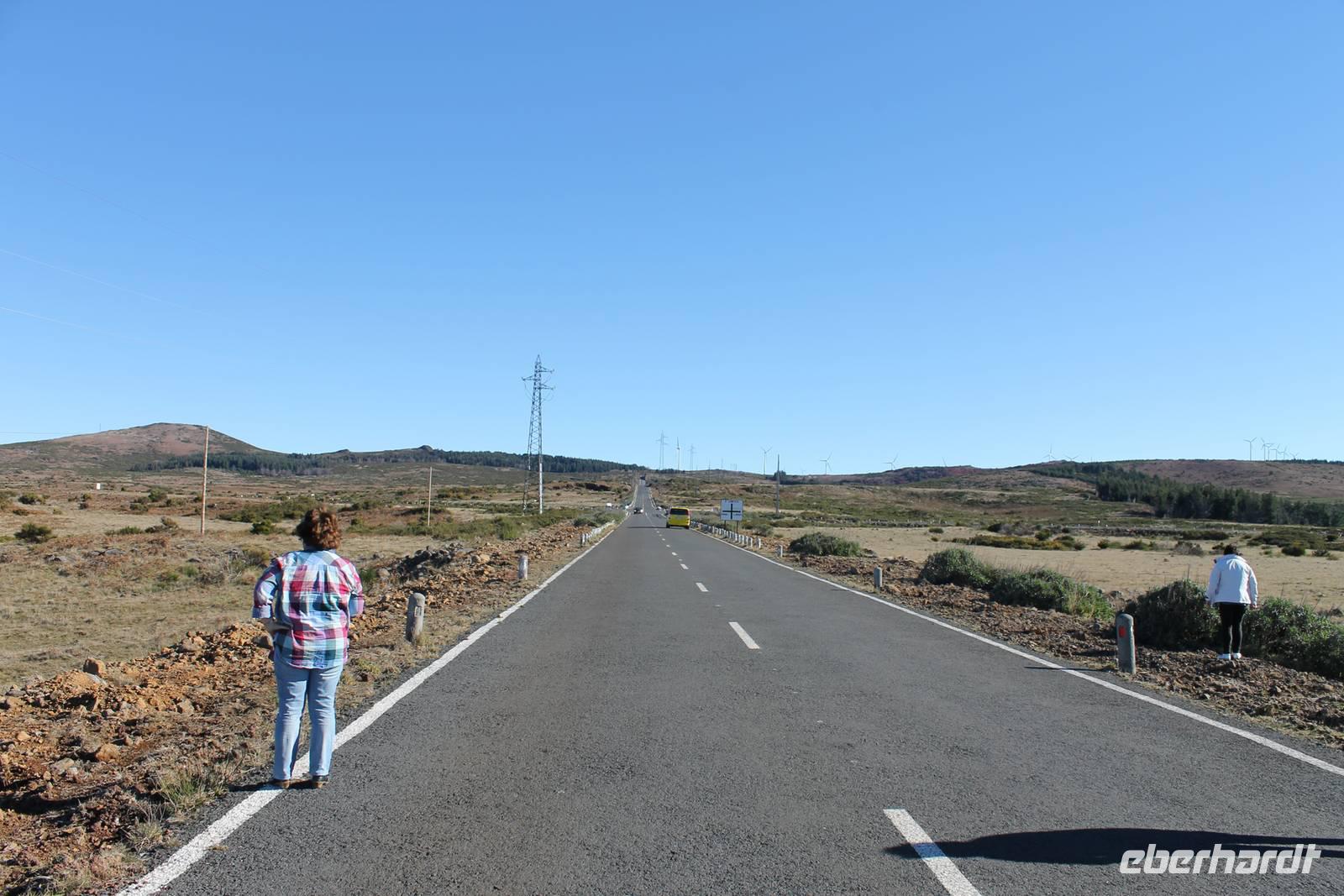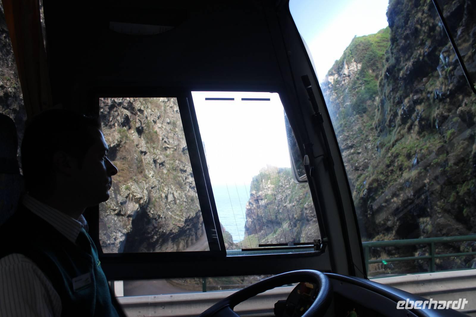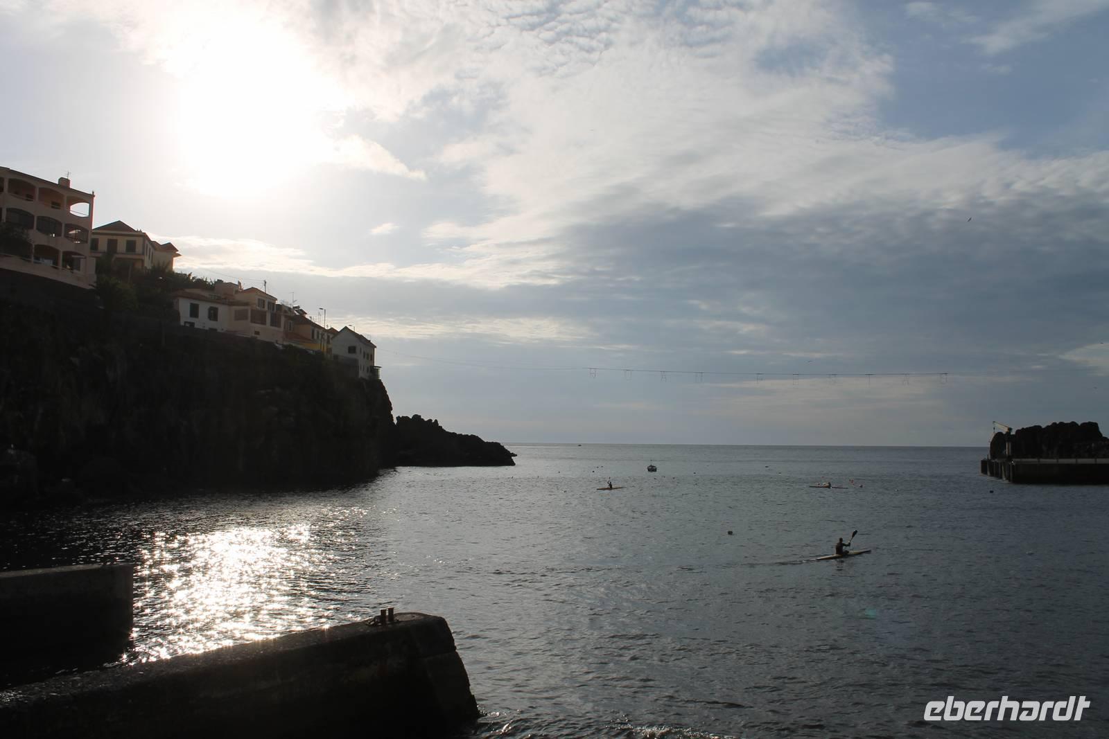 Nach der Ankunft werden wir direkt zum Hotel gebracht, checken ein und kurz danach treffen wir uns auch schon wieder mit der anderen Gruppe, um gemeinsam gegen 10.30 das Programm zu beginnen. Heute steht das gebirgige Landesinnere und die Ostküste auf dem Programm. Wir fahren zuerst nach Machico an der Ostküste, wo sich ein schöner (dunkler) Sandstand befindet.