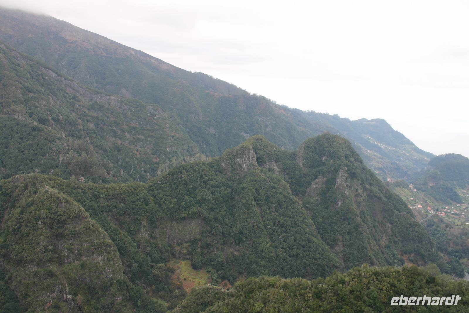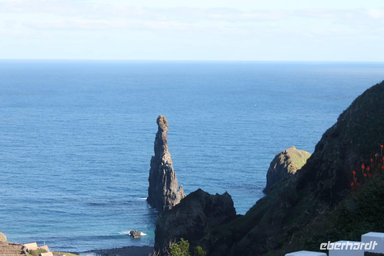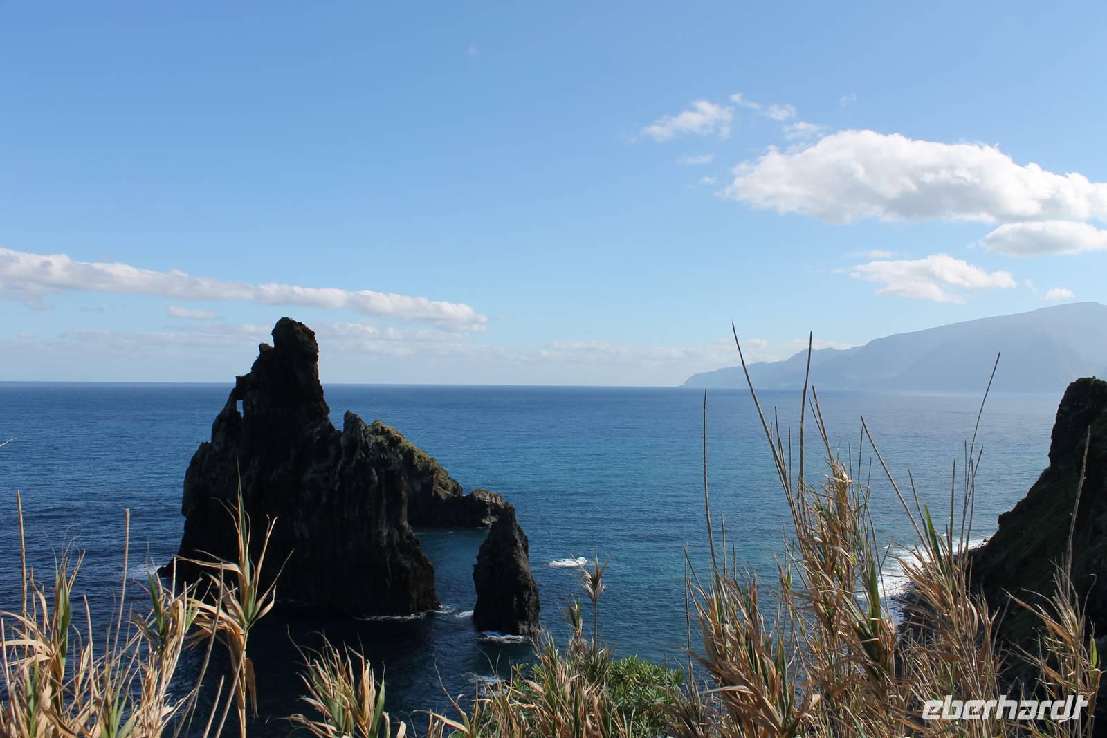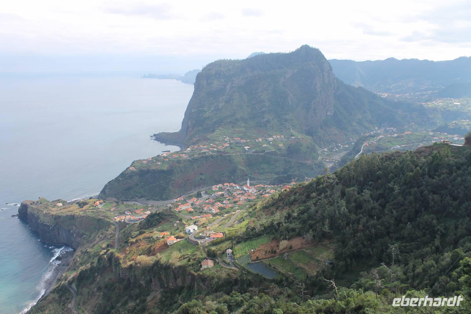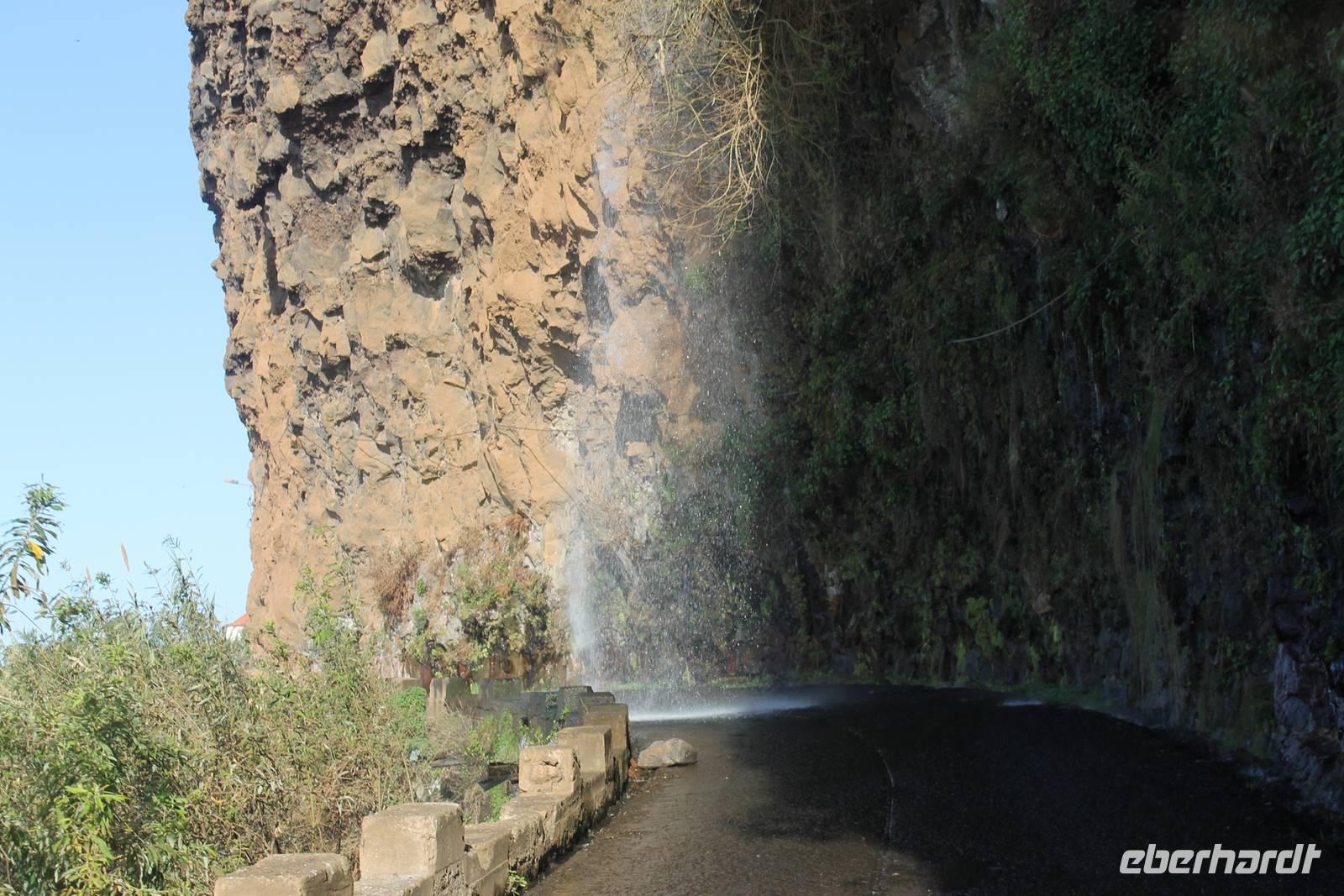 Nach der Ankunft werden wir direkt zum Hotel gebracht, checken ein und kurz danach treffen wir uns auch schon wieder mit der anderen Gruppe, um gemeinsam gegen 10.30 das Programm zu beginnen. Heute steht das gebirgige Landesinnere und die Ostküste auf dem Programm. Wir fahren zuerst nach Machico an der Ostküste, wo sich ein schöner (dunkler) Sandstand befindet.