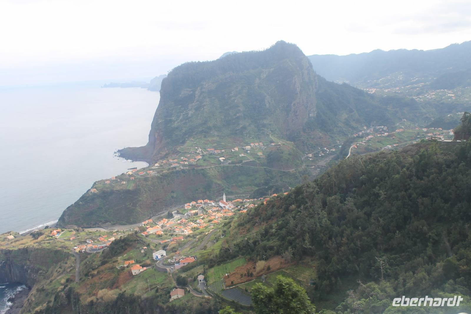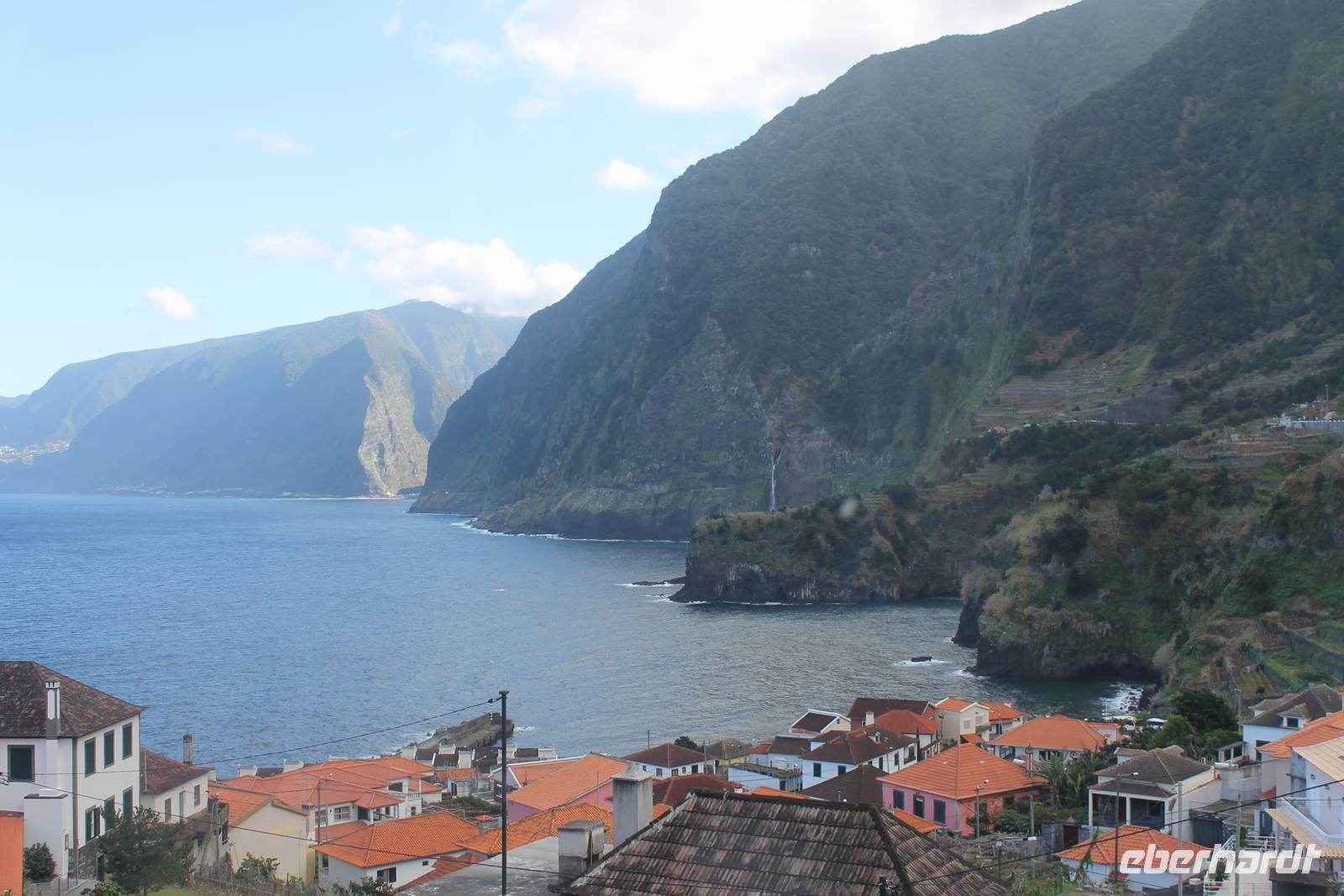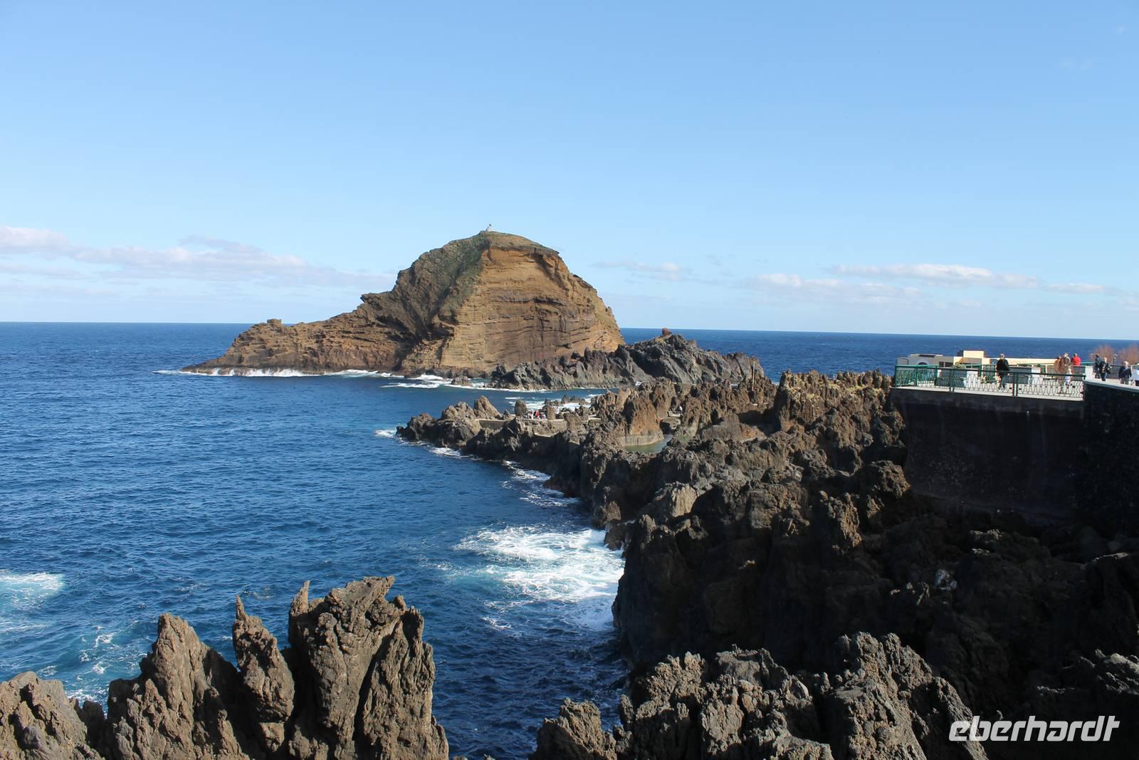 Der heutige ist wieder fakultativ, bei dem der Großteil der Gruppe auch mitkommt. Wir fahren entlang der Südküste bis in das kleine Örtchen Ribeira Brava. Wir besichtigen die kleine Kirche mit einem alten Taufbecken und schlendern durch die Straßen, wo es einige Souvenirgeschäfte gibt. Anschließend fahren wir weiter durch das Landesinnere über das Hochplateau, bei herrlichen Sonnenschein in den Nordwesten nach Porto Moniz. Von einem Aussichtspunkt haben wir einen schönen Blick auf den Ort, bevor wir dort etwas Freizeit haben. Der Atlantik ist ziemlich stürmisch und es geht auch ein starker Wind, aber sonst ist das Wetter schön und angenehm warm. Später fahren wir weiter ins Dörfchen Sao Vicente, welchem wir einen kurzen Besuch abstatten. Letzter Stopp ist an einer kleinen Raststätte mitten in den Bergen, von wo aus sich ein toller Blick ins Tal bietet. Wer möchte, geht ein paar Stufen bis zu einem Aussichtspunkt, wo sich ein 360° Panorama bietet. Zum Schluss kann jeder noch einmal den frisch gemachten Poncha probieren. Anschließend fahren wir zurück ins Hotel - zum Kofferpacken.