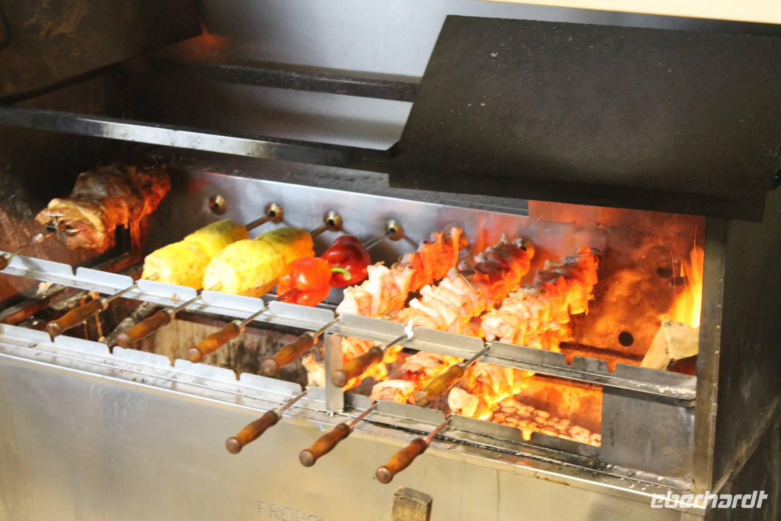 Mit dem Bus fahren wir jedoch vorher durch die geschmückten Straßen, die durch die Weihnachtsbeleuchtung in allen Farben und Variationen hell erleuchtet ist. Birnenbäume (sogenannte Glühbirnenbäume) säumen die Straßen. Der Anblick ist wunderschön und wird mit einigen „Ohhs" und „Ahhs" kommentiert. Im Anschluss fahren wir zu einem traditionellen Espetada-Abendessen ins Restaurant Vasco da Gama. Von der Dachterrasse aus haben wir einen schönen Blick auf den Hafen von Funchal. Die Fleischspieße werden an eine Vorrichtung am Tisch gehängt, sodass wir die Fleischstücken „runter schneiden" müssen. Erlebnis-Gastronomie sozusagen.