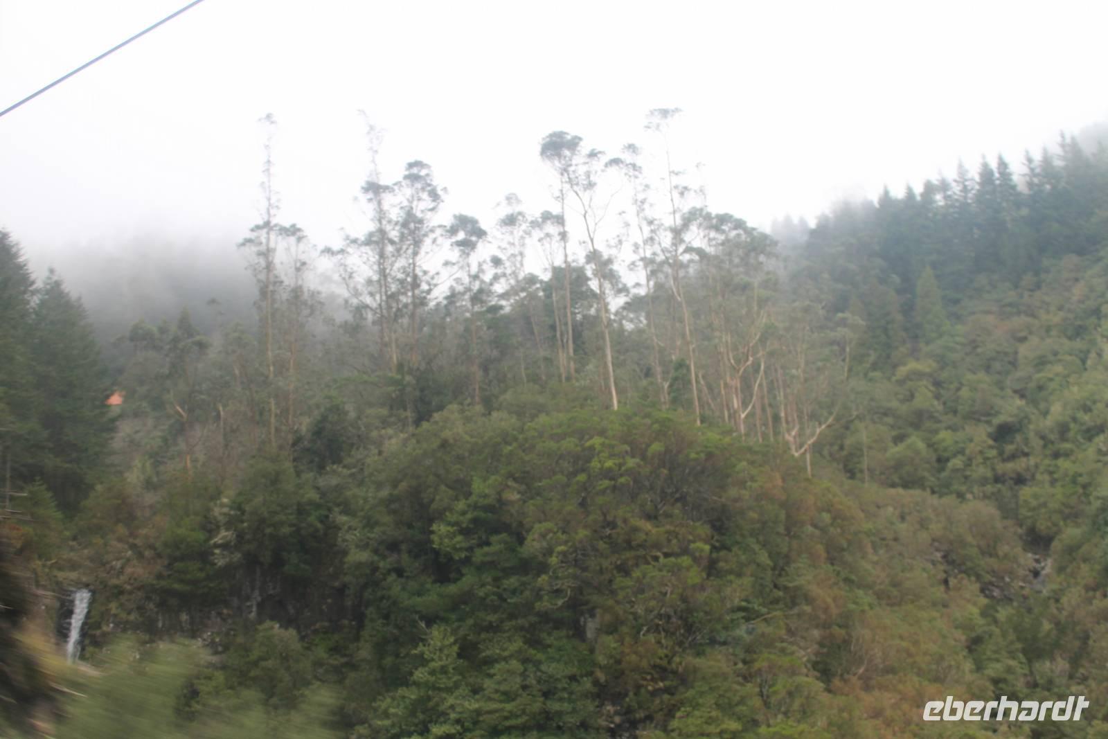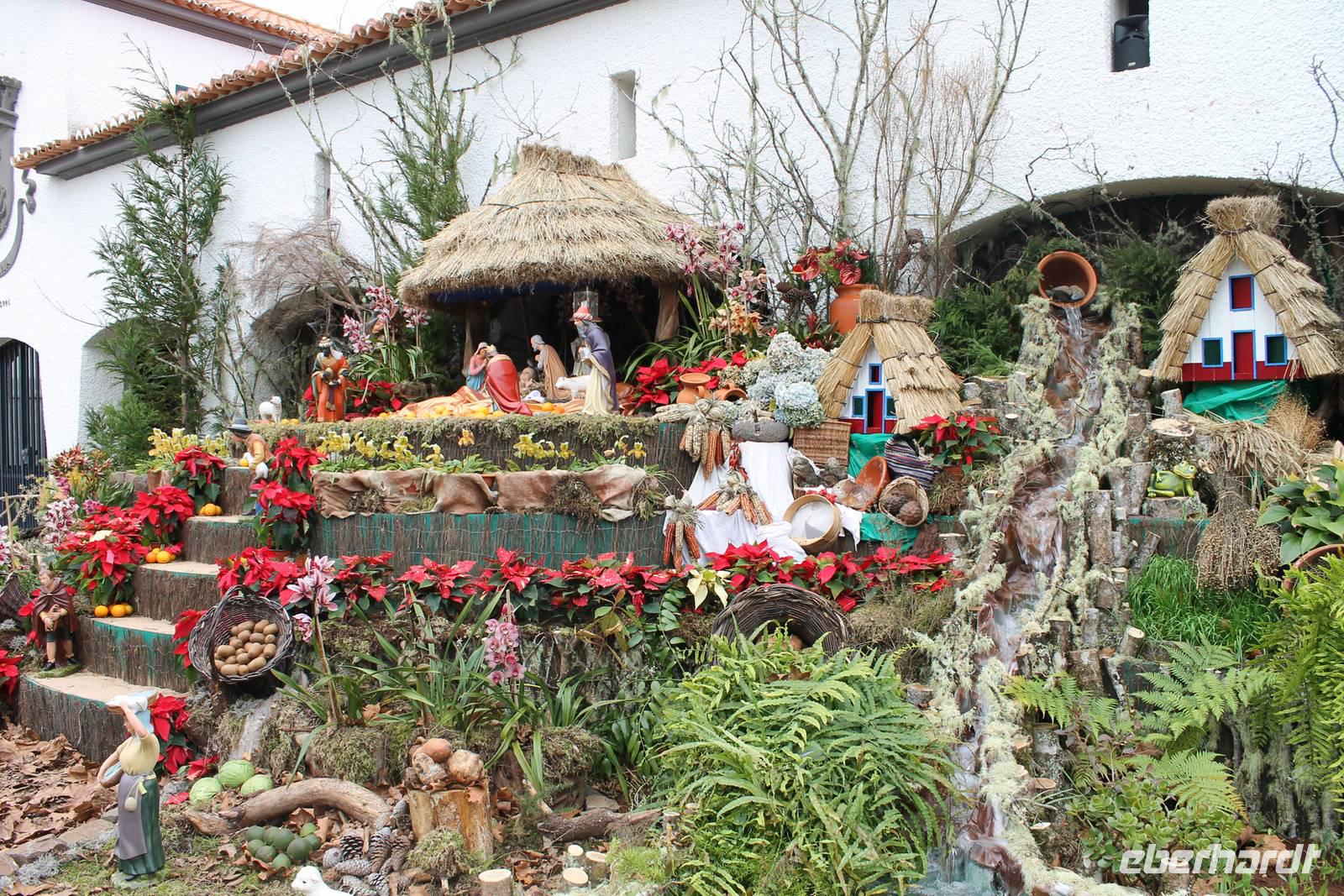 Danach laufen wir gemeinsam zum Bus zurück. Das offizielle Tagesprogramm ist an dieser Stelle beendet - es besteht allerdings die Möglichkeit, mit der Seilbahn auf den Berg Monte zu fahren und mit den Korbschlitten hinab „zu rutschen". Mit ca. 20 Personen fahre ich hinauf, die restlichen Gäste fahren entweder mit dem Bus zum Hotel zurück oder vergnügen sich noch ein wenig selbst in der Stadt. Nach ca. 20min. Fahrtzeit in den Gondeln, erreichen wir Monte. Leider beginnt es zu diesem Moment etwas zu regnen. Nichts desto trotz besichtigen wir die schöne Kirche und die weihnachtlich dekorierte Grippe. Danach fahren 10 Personen mit mir auf Korbschlitten ins Tal hinunter. Zwei starke Madeirenser ziehen bzw. schieben uns in einem Schlitten eine zwei Kilometer lange, steile Straße hinunter. Das war ein Adrenalinschub! Unten angekommen fahren wir mit dem Taxi zurück zum Hotel, die anderen Gäste fahren mit der Gondel wieder hinab in die Stadt. Das Abendessen lassen wir uns in einem Restaurant nahe Funchal schmecken.