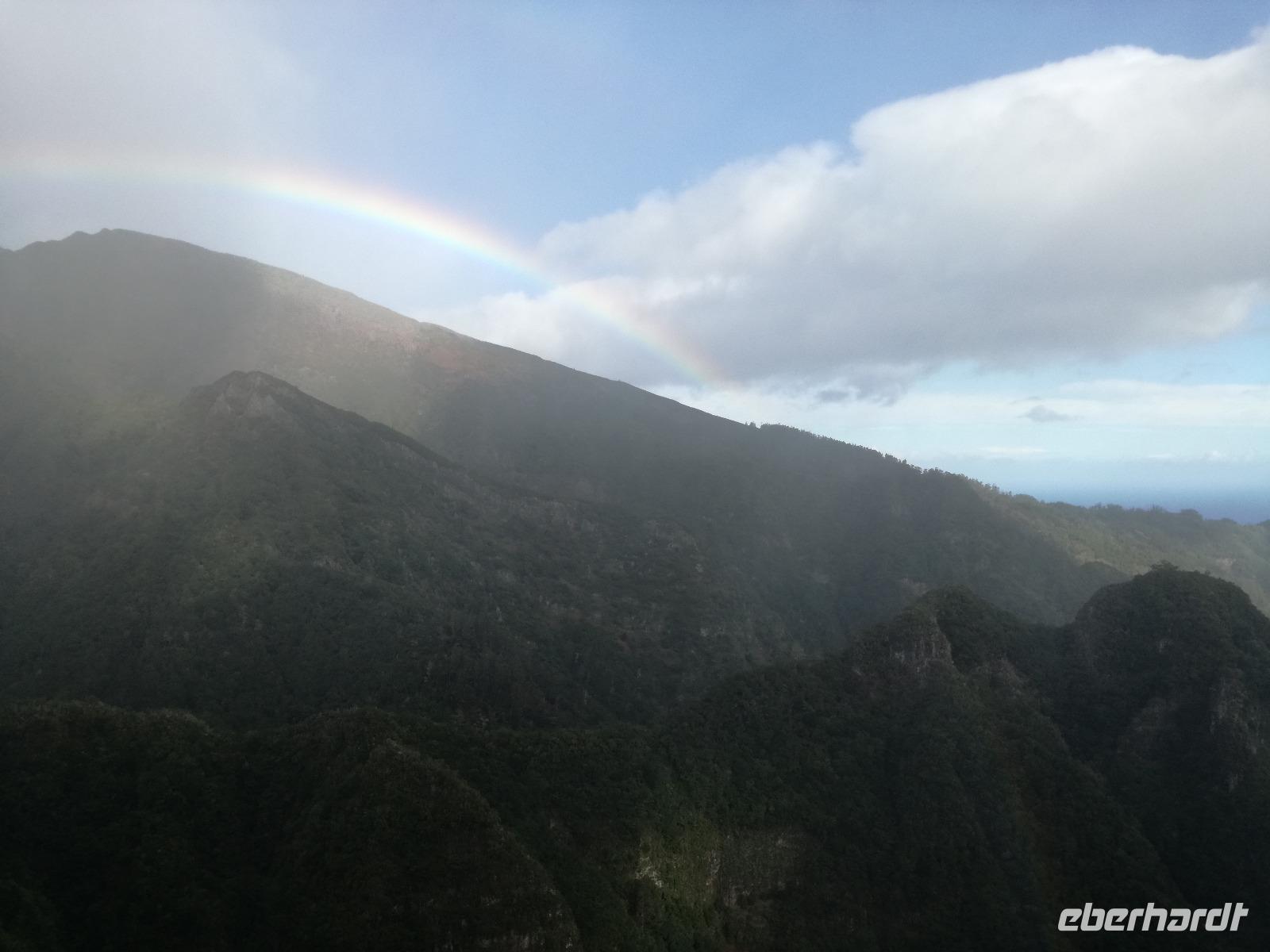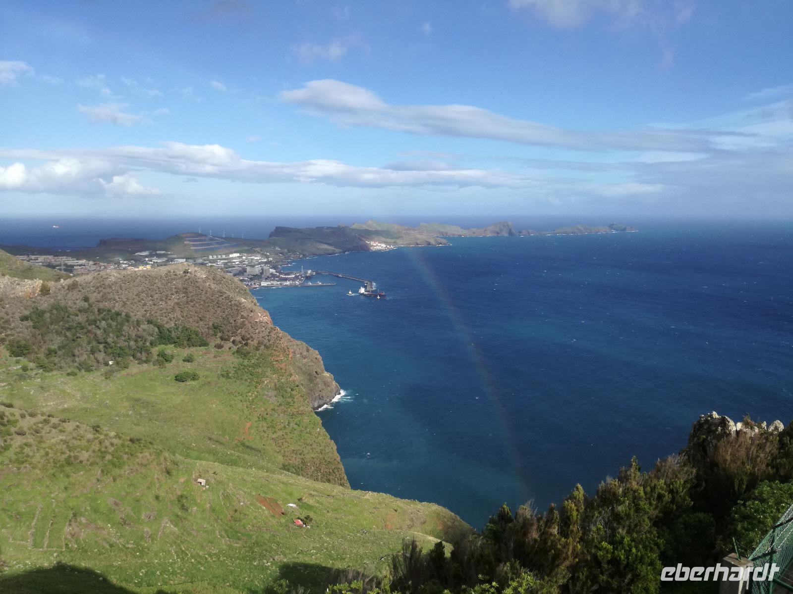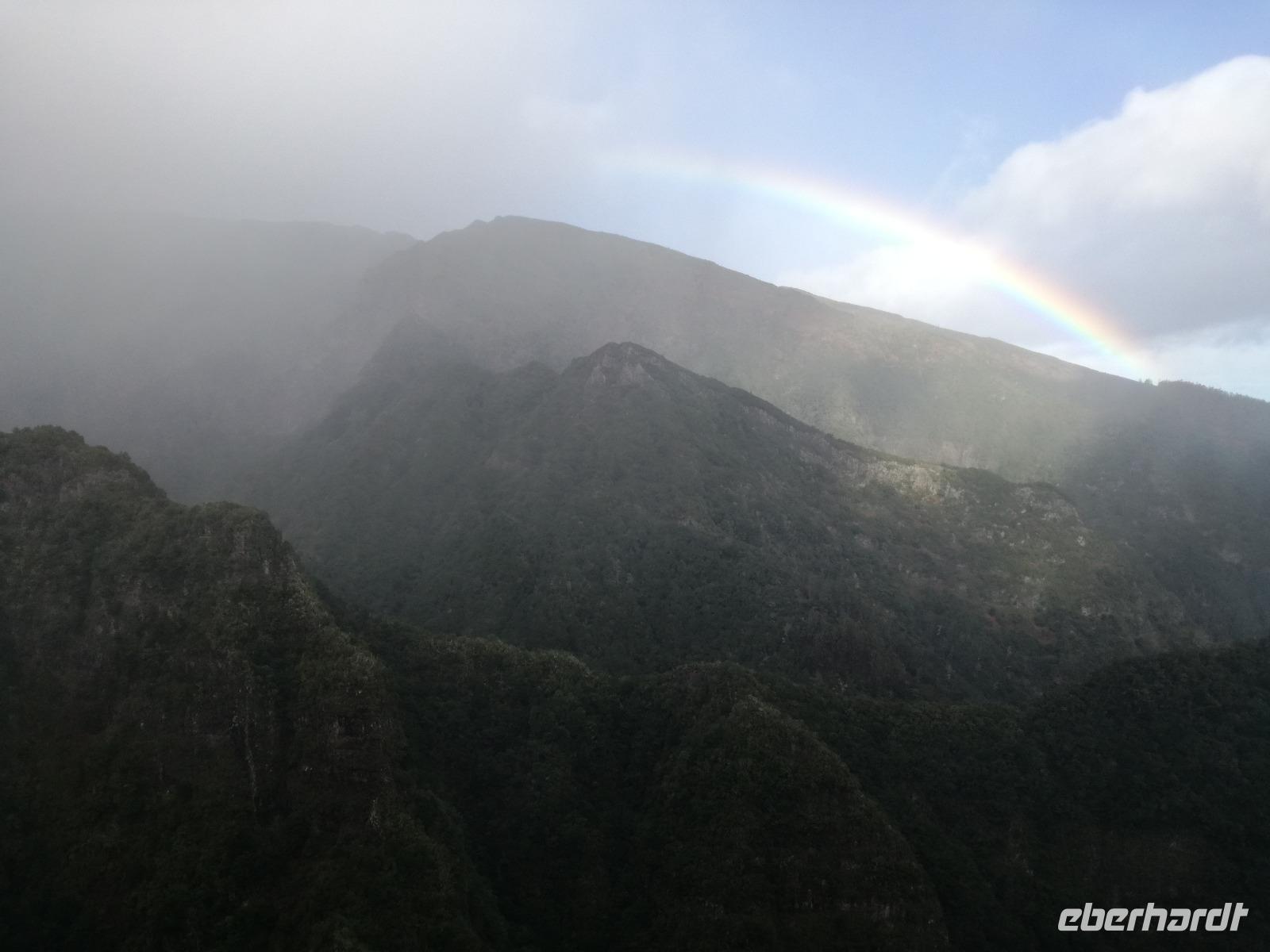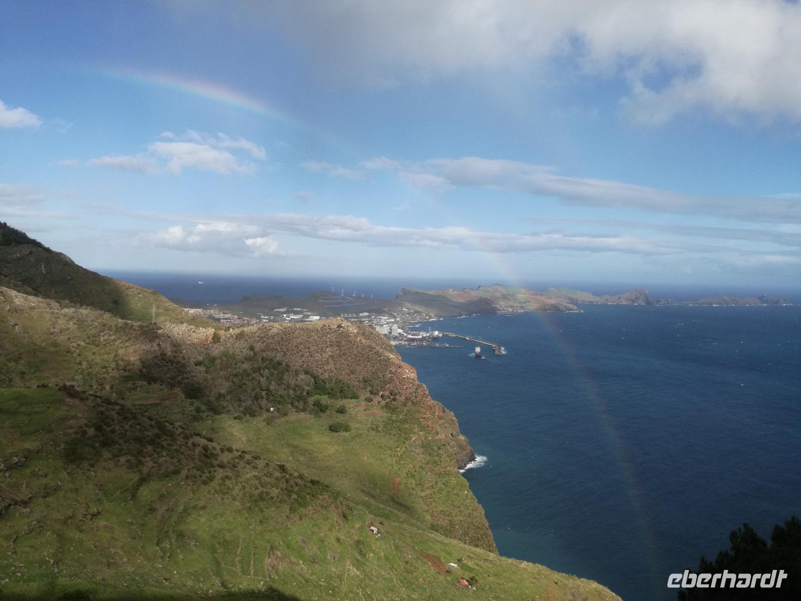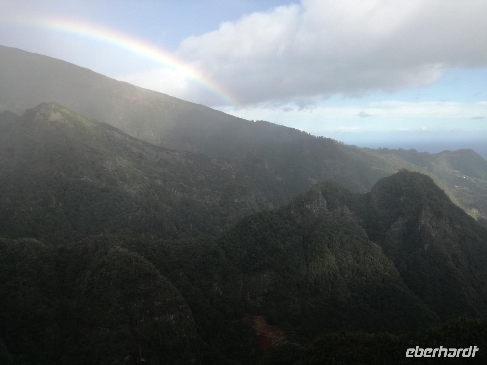 Unser heutiger Tag begann wie immer mit einem leckeren und ausführlichen Frühstück. Im Anschluss begann unsere Reise in den Osten der Insel. Zunächst führte uns unsere Route wieder vorbei Flughafen und wir unter der Landebahn, die auf 118 Säulen steht, entlang. Im Herzen der Insel liegt der zweithöchste Gipfel der Insel - der Pico do Arieiro. Leider war uns Petrus auf dem Gipfel des Picos do Arieiro nicht wohlgesonnen. Im Nebel versteckte sich der Gipfel und es begann auch zu regnen. Aber unser Programm führte uns wieder herab in Richtung Sonne. In Ribeiro Frio erfolgte unser nächster Halt mitten ins Naturschutzgebiet. Nach einer Besichtigung einer heimischen Forellenzucht begannt unsere kleine Levada Wanderung durch einen Lorbeerwald zum Aussichtspunkt Balcoes. Der hiesige Ausblick war eine Augenweide. Zu unserem Glück erstreckte sich ein malerischer Regenbogen über das Tal und machte den Ausblick zu einem unvergesslichen Erlebnis. Am Ende der Wanderung lag ein nettes Cafe. Hier stärkten wir uns Kaffee (mancher mit einen Schuss Madeira Wein)und setzten unsere Reise fort. In Santana sollte unsere Mittagspause erfolgte. Einige Gäste nutzen die Gelegenheit um die typischen Madeira-Häuser von Santana zu besichtigen. Andere speisten zunächst und probierten eine typische Weizensuppe. Nach dem Essen folgte noch ein Fototermin. Schließlich wollten wir die Reise auf einem gemeinsamen Gruppenbild festhalten. Anschließend fuhren wir weiten über den Portela-Pass nach Machico. Der älteste und zweitgrößte Ort der Insel besitzt neben schönen und historischen Gebäuden auch einen der wenigen Sandstrände Madeira. Der Sand aus Marokko importiert und bietet eine schöne Bademöglichkeit für Touristen und Einheimische. Nach einem kurzen Aufenthalt folgte unser letzter Programmpunkt des Tages. Wir fuhren den Aussichtspunkt Pico do Facho an und wurden neben Sonnenschein, auch mit einem beeindruckenden Ausblick belohnt. Von hier aus kann man bis zur Ostspitze der Insel gucken. Außerdem erhält man einen Überblick auf Machico und die berüchtigten Flughafen Madeira, der in Zukunft Christiano Ronaldo Airport heißen soll. Dieser Panorama-Blick war ein toller Abschluss unseres schönen Tages. Am letzten Abend besuchten wir ein lokales Fischrestaurant und aßen zum letzten Mal den schwarzen Degenfisch mit Bananen, Napfschnecken oder weitere köstliche Fischspezialitäten.