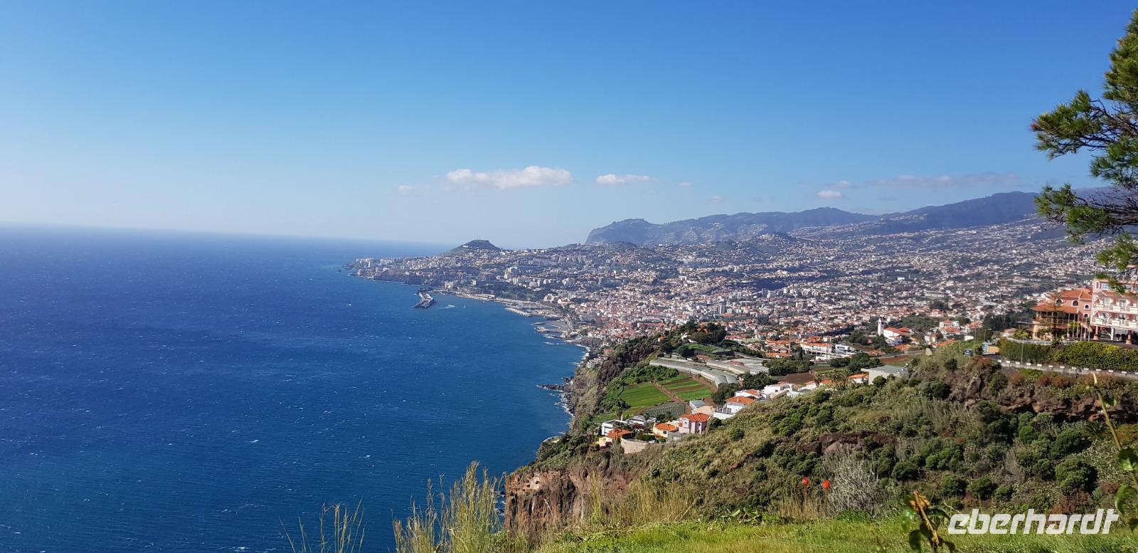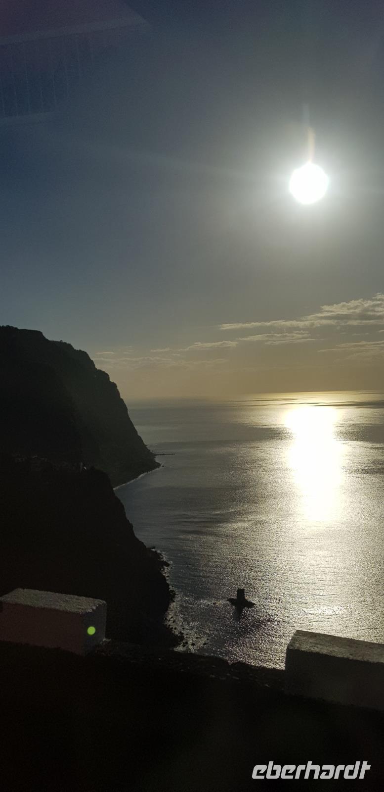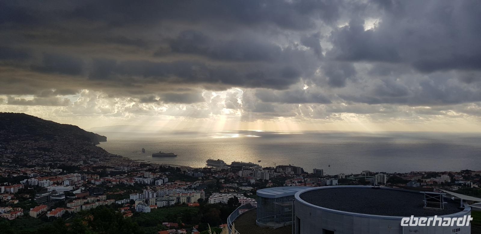 Da sich heute Morgen schon 4 große Kreuzfahrtschiffe im Hafen von Funchal aufhalten, bietet Sandro an, unser Programm mit dem vom 02. Januar zu tauschen, um den Menschenmassen etwas zu entgehen. Kurz entschlossen folgen wir seiner Empfehlung und fahren zunächst zum Aussichtspunkt Pico dos Barcelos und genießen einen tollen Ausblick auf die Stadt und die Bucht von Funchal. Weiter geht die Fahrt wieder bergauf. Da sich das Wetter heute recht neblig und regnerisch zeigt, können wir nur etwas getrübte Blicke in das Nonnental werfen. Auch am „Eira do Serrado" regnet es oder der Nebel verhüllt den Ausblick, sodass sich nur die wenigsten bis zum Aussichtspunkt wagen, von dem man auf den Boden eines erloschenen Vulkans schauen kann. Einige nutzen die Zeit zum Souvenirkauf oder um sich mit einem Poncha aufzuwärmen. Danach fahren wir weiter nach „Camara de Lobos", was übersetzt „Die Höhle der Seelöwen" bedeutet und haben dort etwas Zeit zur Verfügung, um durch den hübschen kleinen Ort zu schlendern und einen Blick in die kleine, aber gemütliche Kapelle zu werfen. Danach fahren wir weiter zum „Cabo Girao", die zweithöchste Klippe der Welt. Von der Aussichtsplattform, die zum Teil aus Glas besteht und in 580m Höhe liegt, haben wir einen tollen Blick auf die Küste und die umliegenden Ortschaften. Nachdem einige Fotos im Kasten sind, fahren wir zu unserem letzten heutigen Stopp: nach Ponta do Sol zu einer Bananenplantage. Hier führt uns Sandro durch die Vielzahl der Bananenstauden und erklärt alles Wissenswerte rund um den Bananenanbau. Danach geht es zurück zum Hotel, wo wir noch einige Stunden haben, um uns für das Silvester-Dinner in Galakleidung zu werfen.