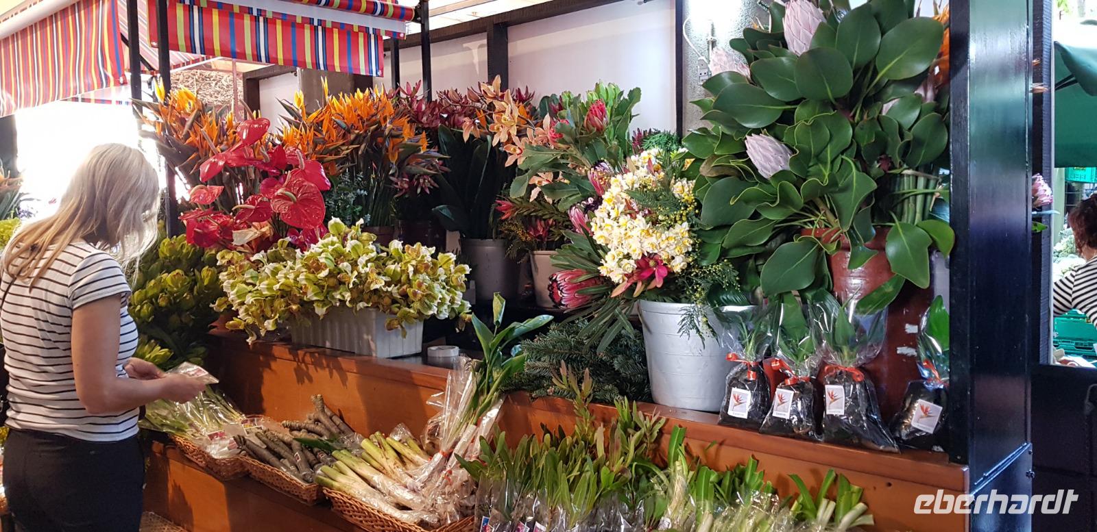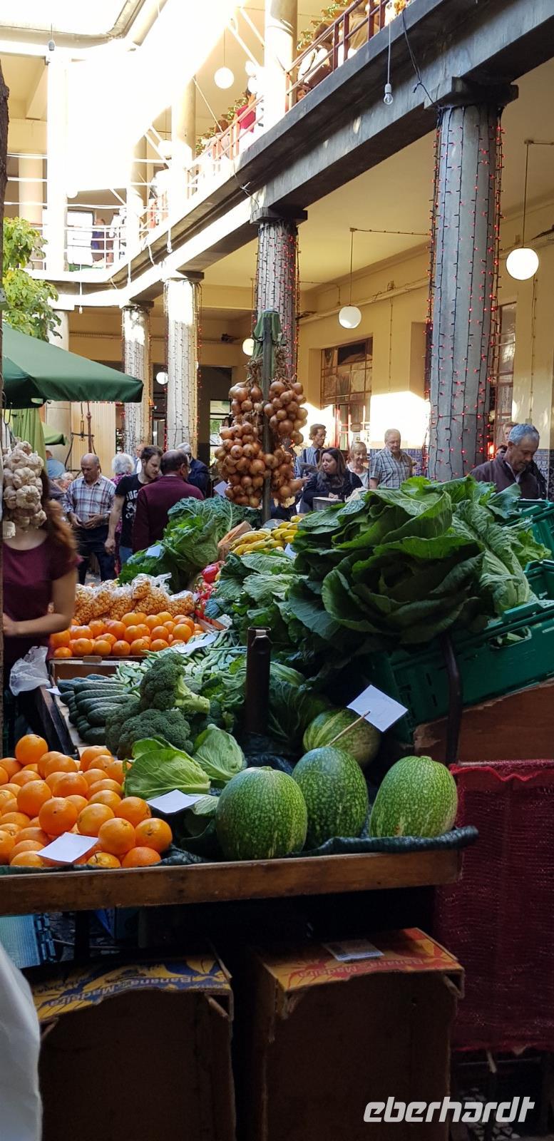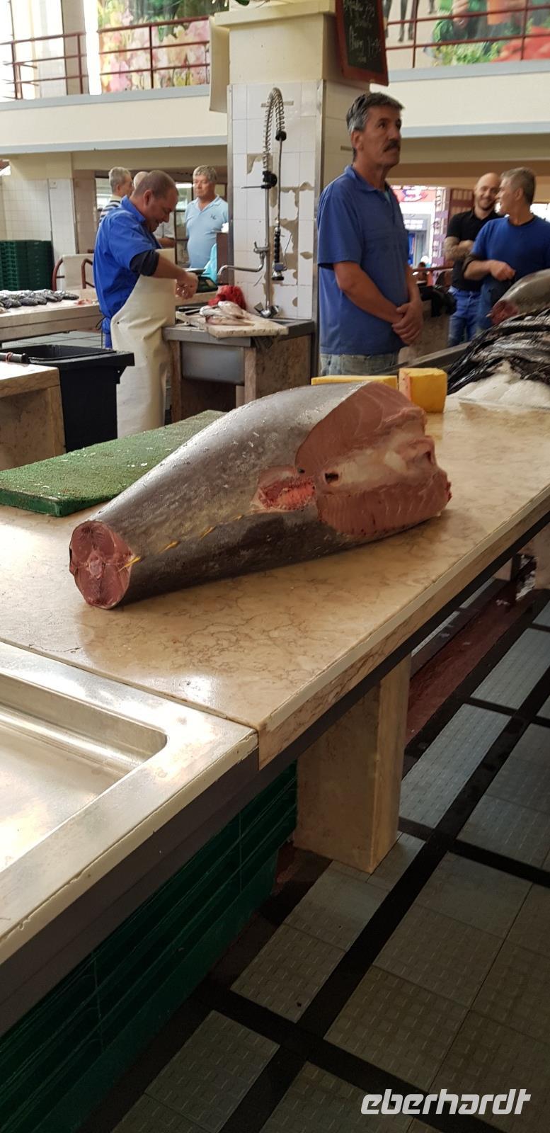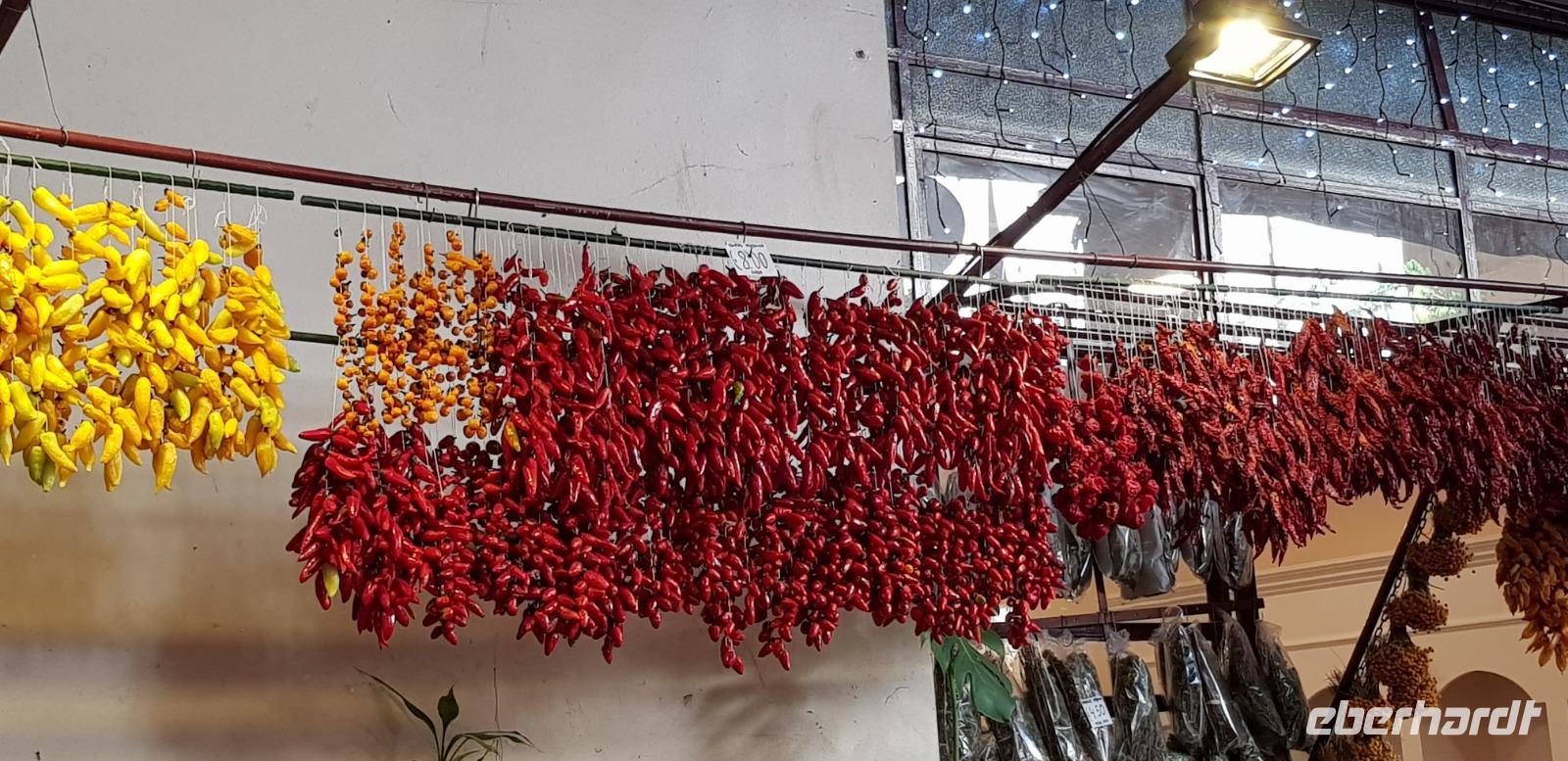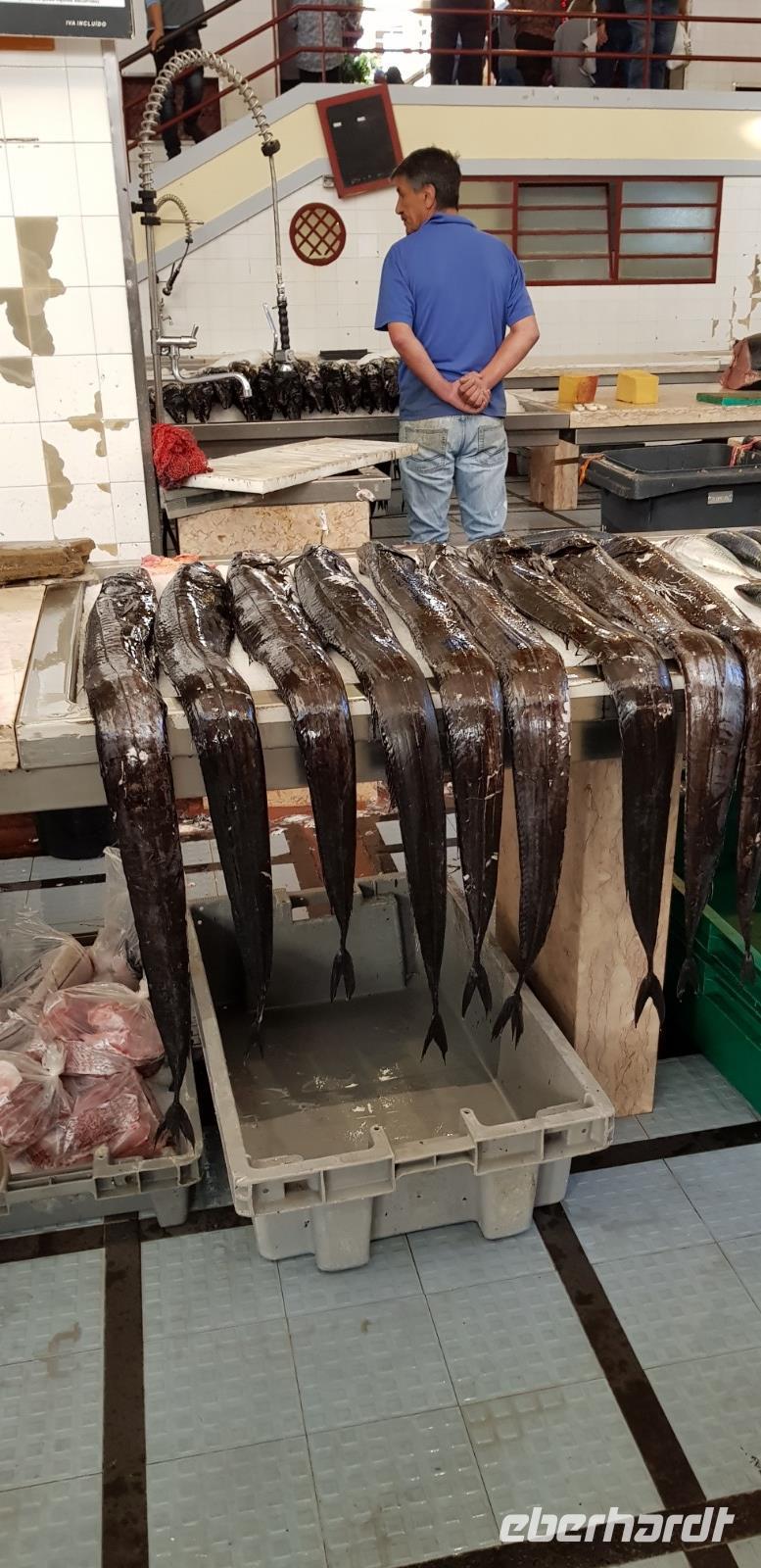 Nach der wohlverdienten Nachtruhe und einem ausgiebigen Frühstück erwartet uns Funchal, die Hauptstadt von Madeira. Gegen 9.30 Uhr brechen wir auf, um die kleinen Gassen erst einmal bei einem gemütlichen Spaziergang zu erkunden. Es erwartet uns unter anderem die Markthalle von Funchal, wo wir den typisch madeirensischen Fisch, den recht finster dreinblickenden Schwarzen Degenfisch und einige andere Arten seinesgleichen zu sehen bekommen. Weiter geht es durch den wesentlich angenehmer riechenden Teil der Halle, wo uns unser Reiseleiter Sandro viele einheimische Obst- und Gemüsesorten zeigt und erläutert. Danach geht es mit dem Bus zu Blandy´s Weinkellerei, wo der typische Madeirawein hergestellt wird und in riesigen Fässern lagert. Natürlich darf auch eine Verkostung der Spezialität nicht fehlen. Danach haben wir etwas Freizeit, um den direkt gegenüber befindlichen Weihnachtsmarkt zu besuchen. Bei frühlingshaften Temperaturen und Sonnenschein wird hier Madeirawein und Poncha anstelle des bei uns üblichen Glühweins ausgeschenkt. Mit dem Bus geht es weiter zu einem privaten Kräutergarten. Wir werden mit einem mit Schokolade garnierten Obstteller und selbstgebackenem Kuchen verköstigt. Dazu gibt es je eine Kostprobe Madeirawein, Zuckerrohrschnaps und Heidelbeerlikör. Nach einer kurzen Besichtigung des zugehörigen Kräutergartens geht es zurück zum Hotel. Am Nachmittag haben wir etwas Zeit zum Entspannen bevor wir von Hilario noch einmal offiziell begrüßt werden, er gibt uns Einblicke in unser Programm für die kommende Woche auf der schönen Blumeninsel Madeira. Am Abend genießen wir den Schwarzen Degenfisch beim gemeinsamen Abendessen im Restaurant „Villa Ventura".