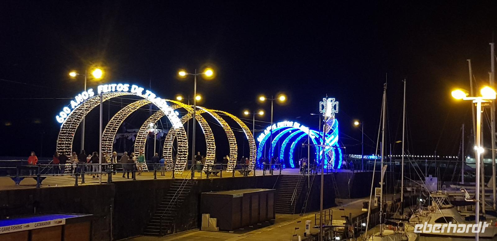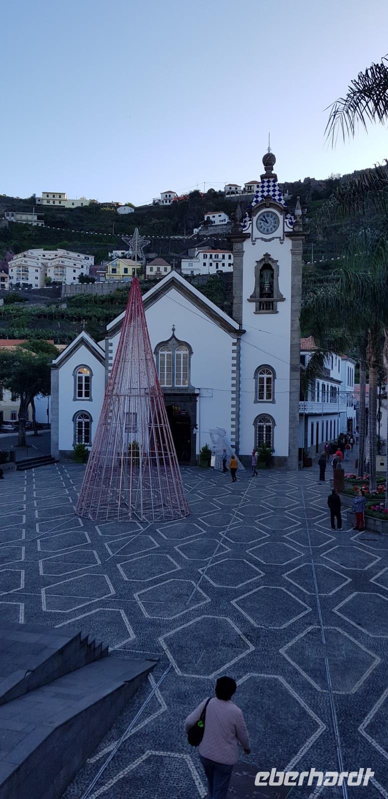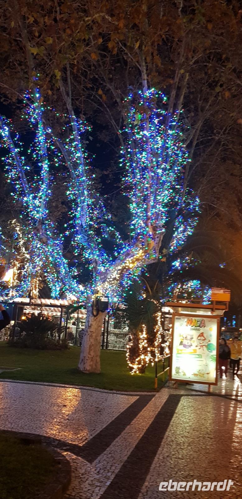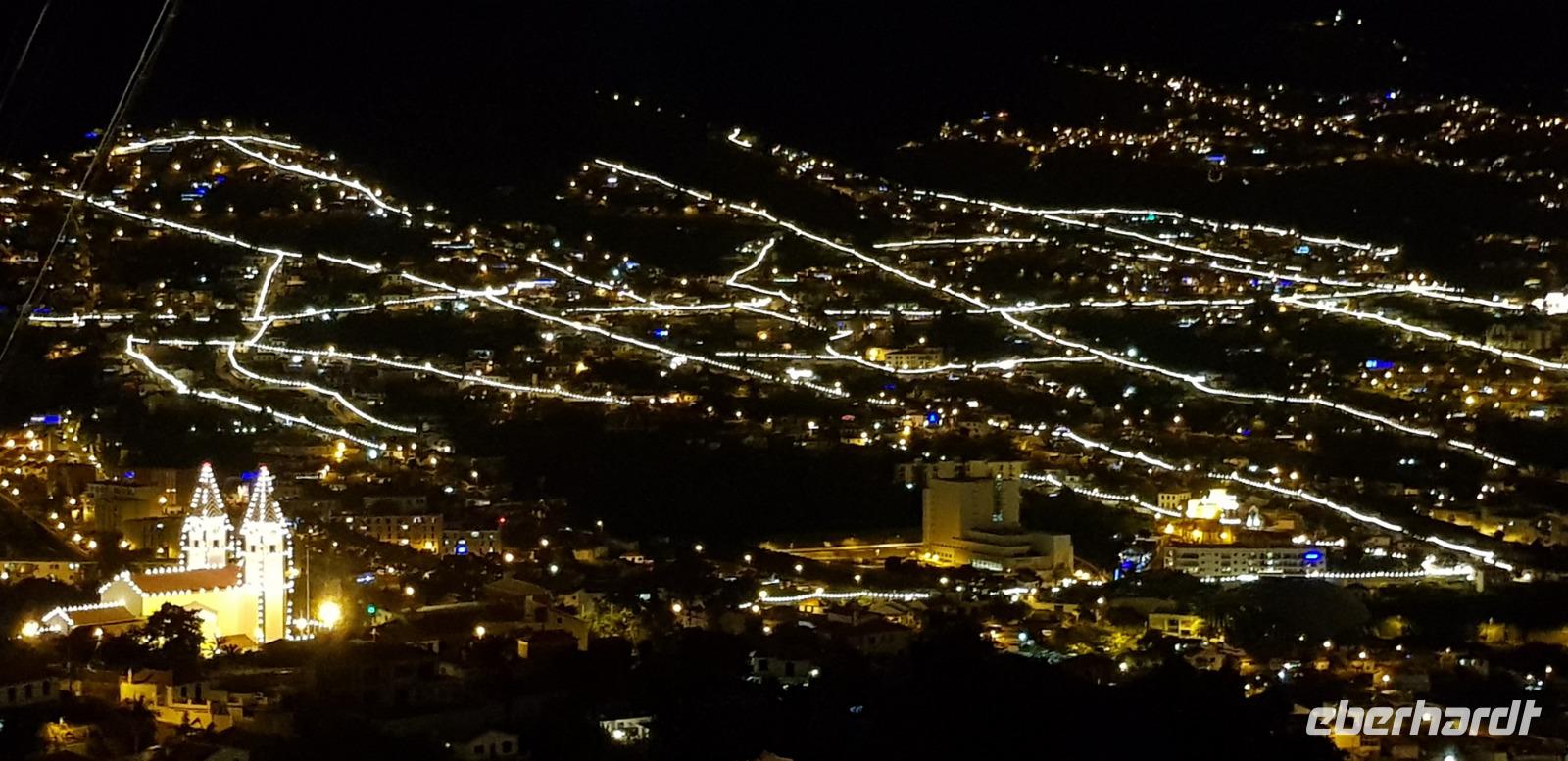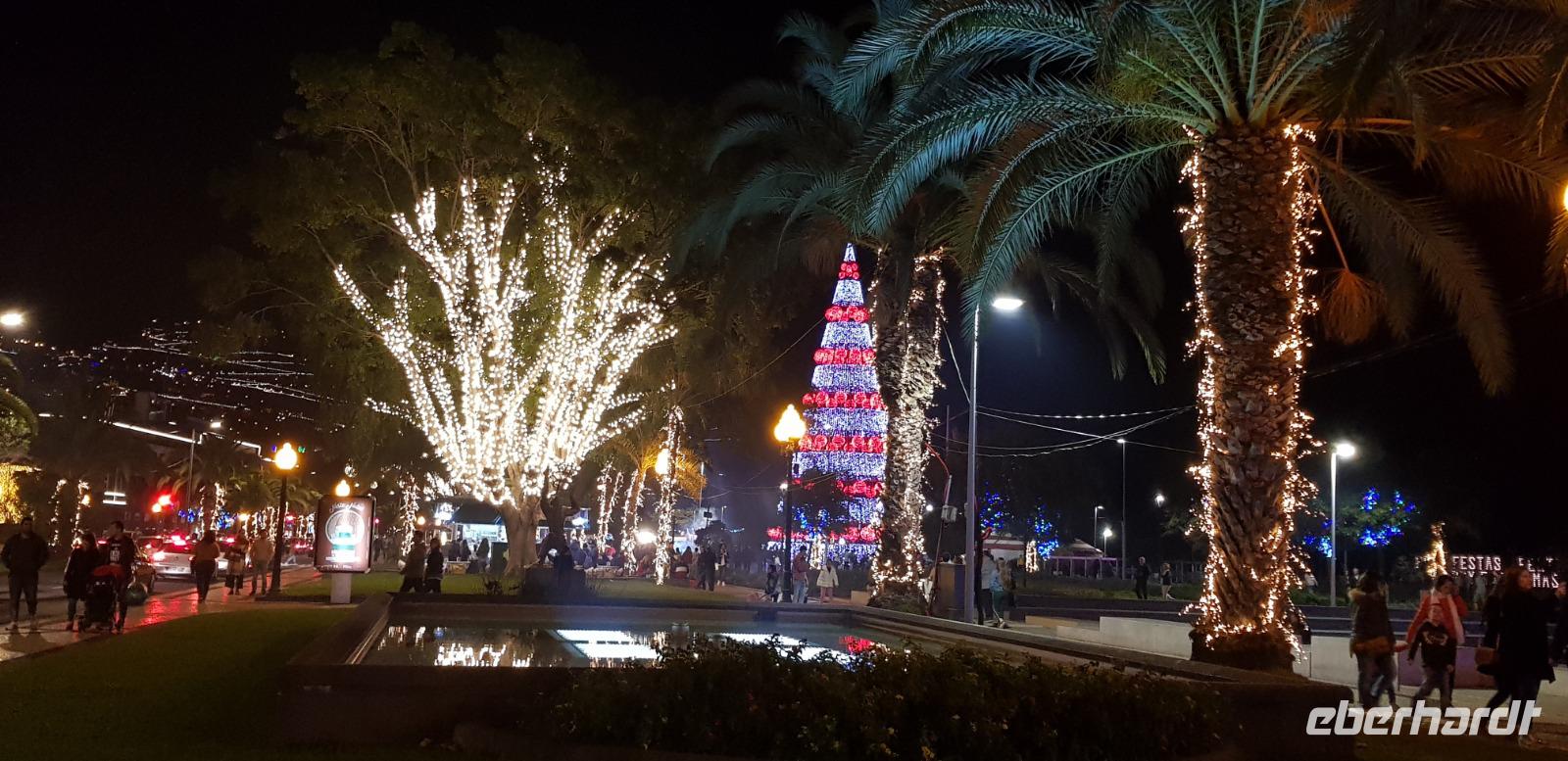 Weiter führt uns unser Ausflug nach Machico, den ältesten Ort der Insel. Wir genießen von einem Aussichtspunkt aus den Blick über den Ort und das Meer und haben im Anschluss noch die Gelegenheit, den Ort bei einem Spaziergang kennen zu lernen. Danach geht es zurück zum Hotel, wo uns noch ein paar Stunden bleiben, um uns auf den Abend vorzubereiten. Bevor wir uns bei der abendlichen Lichterfahrt das weihnachtlich beleuchtete Funchal anschauen können, werden wir in einem Restaurant zu einem typisch portugiesischen Abendessen eingeladen. Unsere Vorspeise ist eine Tomatensuppe mit pochiertem Ei, danach gibt es den typischen Espetada - am Spieß gegrilltes Rindfleisch in Knoblauchmarinade mit Salat, Pommes Frites und Polenta. Als Nachspeise bekommen wir einen Maracujapudding und einen Espresso gereicht. Im Anschluss unternimmt unser örtliche Reiseleiter Claudio noch eine schöne Rundfahrt durch das festlich beleuchtete Funchal. Am Hafen und in der ganzen Stadt leuchten überall Weihnachtsbäume, Sterne und jede Menge Lichterketten, die noch bis zum 6. Januar die Stadt bei Nacht erhellen.