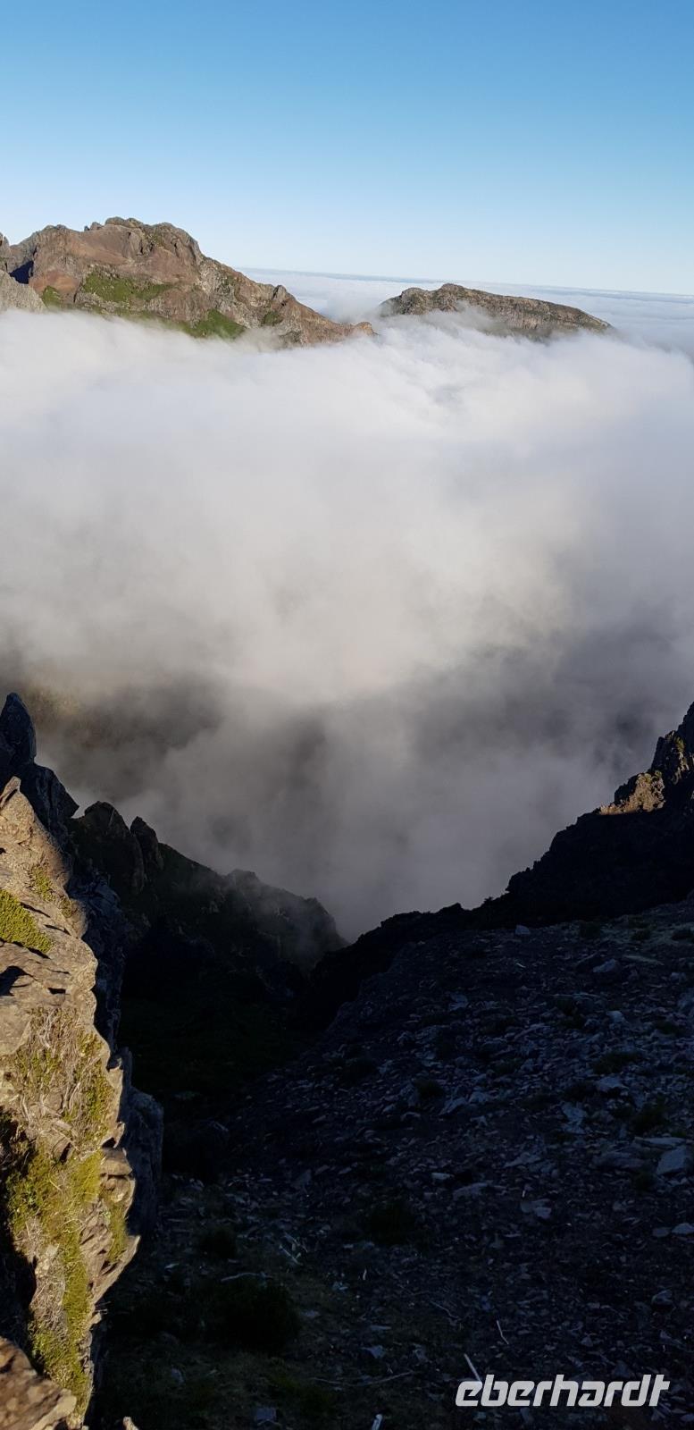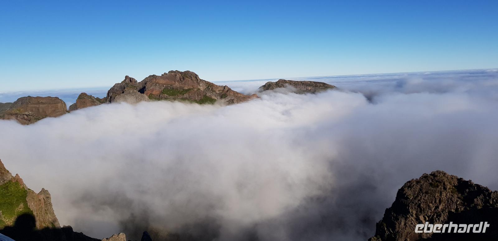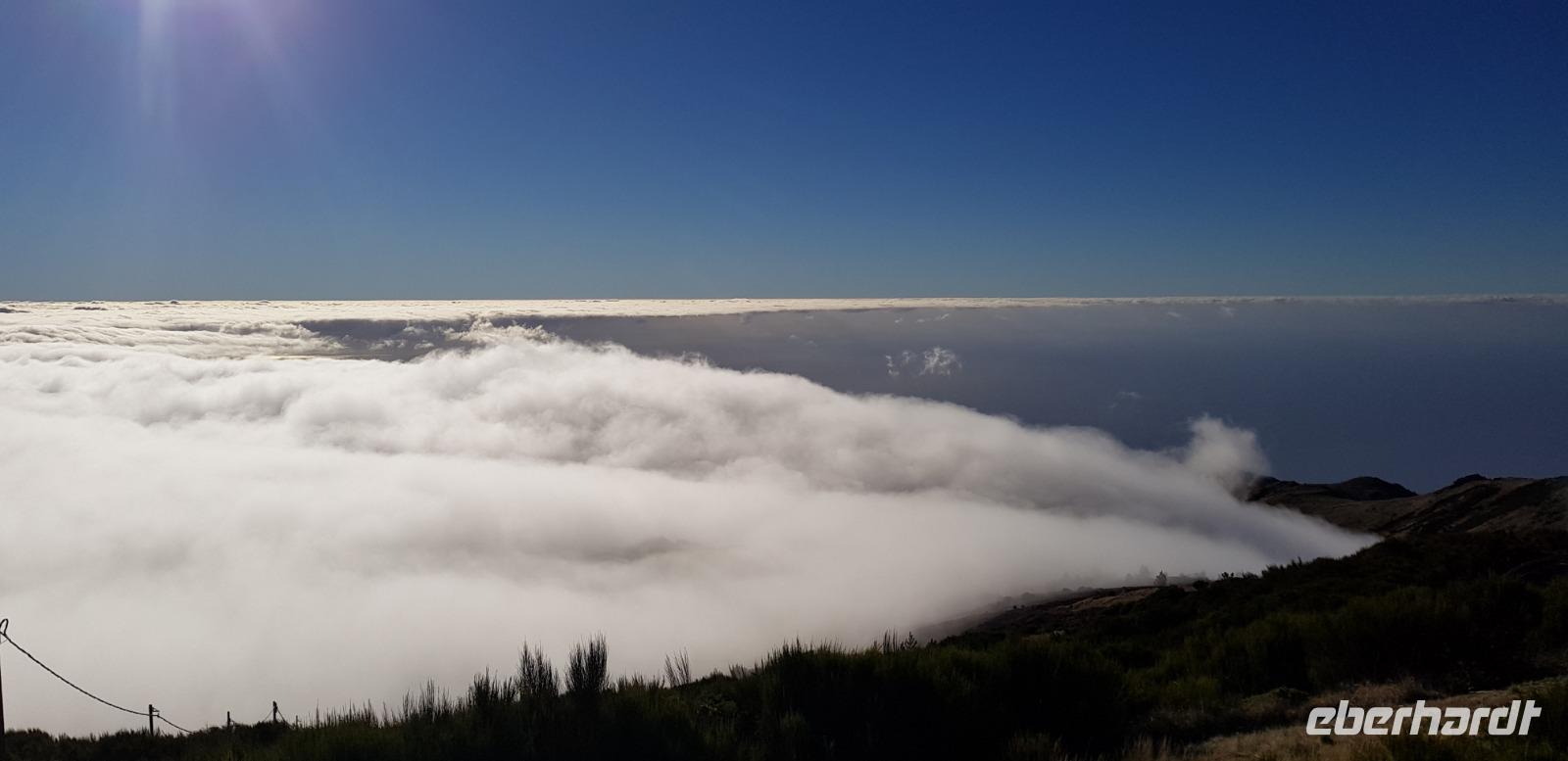 Heute erwartet uns mit seinen 1818m zunächst der dritthöchste Gipfel der Insel Madeira, der Pico do Arieiro. Unser Guide Sandro fährt uns souverän entlang der Serpentinen und durch teils recht dichten Nebel über die Wolken, wo uns der Gipfel bei schönstem Sonnenschein empfängt. Ein bisschen mystisch wirkt der Blick in das Tal, das von der Wolkendecke eingehüllt wird. Wir haben etwas Zeit zum Verweilen und um den Blick auf die Wanderwege und die Umgebung schweifen zu lassen bis wir ein Stück bergab bis zu einer Forellenfarm fahren, wo unsere kleine Wanderung bis zum Aussichtspunkt Balcoes entlang einer der vielen bekannten Levadas beginnt. Bereits im 15. Jahrhundert wurden diese künstlichen Wasserläufe angelegt, um Wasser aus den niederschlagsreicheren in die niederschlagsärmeren Gebieten der Insel zu leiten. Dabei werden oft kilometerweite Strecken bei zum Teil sehr geringem Gefälle überwunden. Angekommen am Aussichtspunkt bietet sich uns ein toller Blick über das Tal bis hin zum Meer. Auch die einheimische Tierwelt lässt sich von hier aus gut beobachten. Ein paar kleine, freche Vögelchen sind ziemlich hungrig und lassen sich das ein oder andere Stück Apfel von uns schmecken.