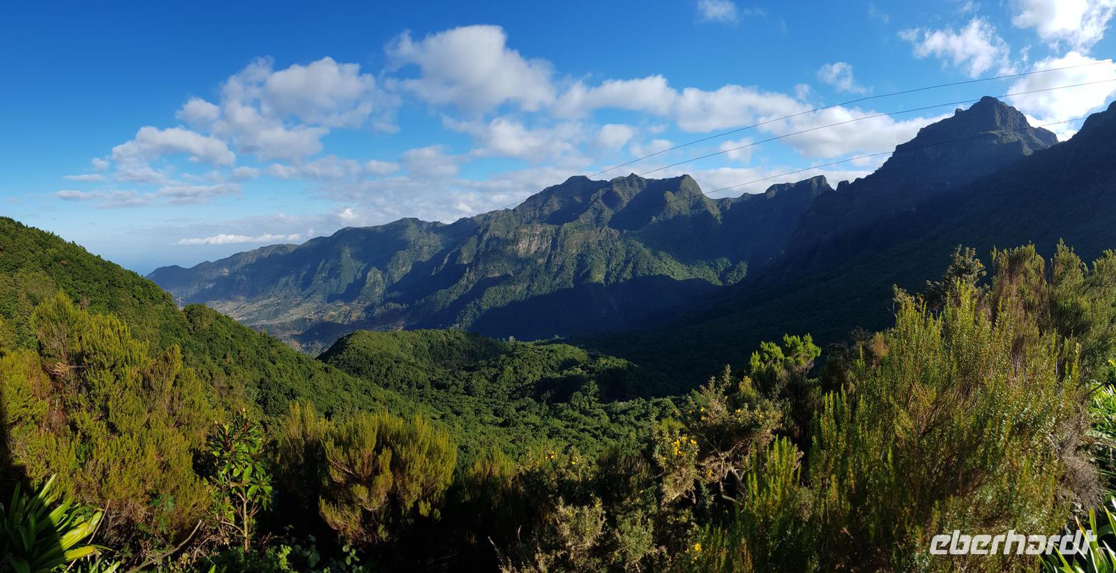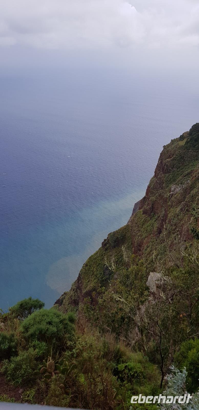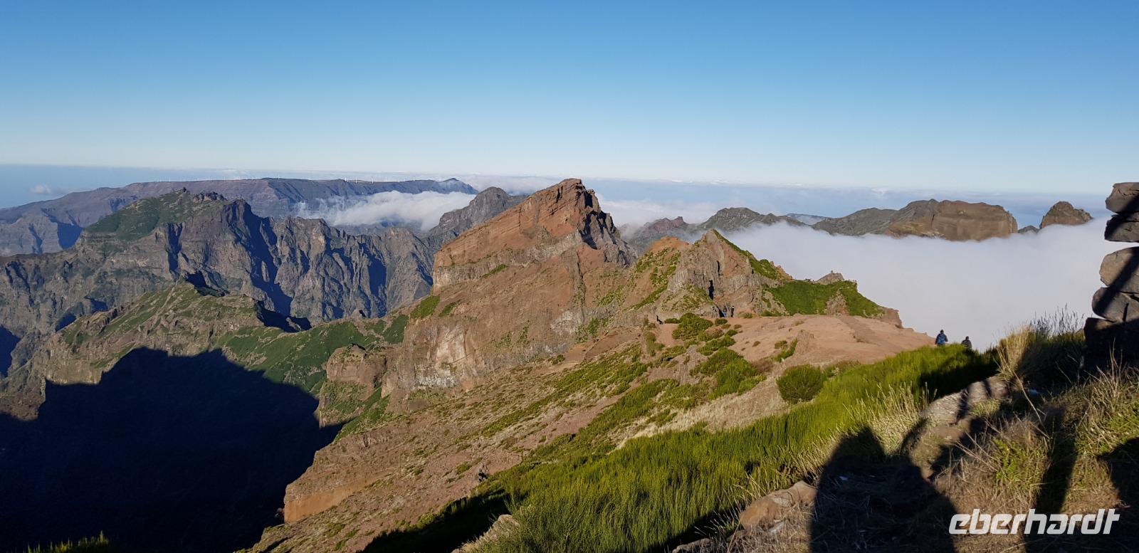Heute erwartet uns mit seinen 1818m zunächst der dritthöchste Gipfel der Insel Madeira, der Pico do Arieiro. Unser Guide Sandro fährt uns souverän entlang der Serpentinen und durch teils recht dichten Nebel über die Wolken, wo uns der Gipfel bei schönstem Sonnenschein empfängt. Ein bisschen mystisch wirkt der Blick in das Tal, das von der Wolkendecke eingehüllt wird. Wir haben etwas Zeit zum Verweilen und um den Blick auf die Wanderwege und die Umgebung schweifen zu lassen bis wir ein Stück bergab bis zu einer Forellenfarm fahren, wo unsere kleine Wanderung bis zum Aussichtspunkt Balcoes entlang einer der vielen bekannten Levadas beginnt. Bereits im 15. Jahrhundert wurden diese künstlichen Wasserläufe angelegt, um Wasser aus den niederschlagsreicheren in die niederschlagsärmeren Gebieten der Insel zu leiten. Dabei werden oft kilometerweite Strecken bei zum Teil sehr geringem Gefälle überwunden. Angekommen am Aussichtspunkt bietet sich uns ein toller Blick über das Tal bis hin zum Meer. Auch die einheimische Tierwelt lässt sich von hier aus gut beobachten. Ein paar kleine, freche Vögelchen sind ziemlich hungrig und lassen sich das ein oder andere Stück Apfel von uns schmecken.