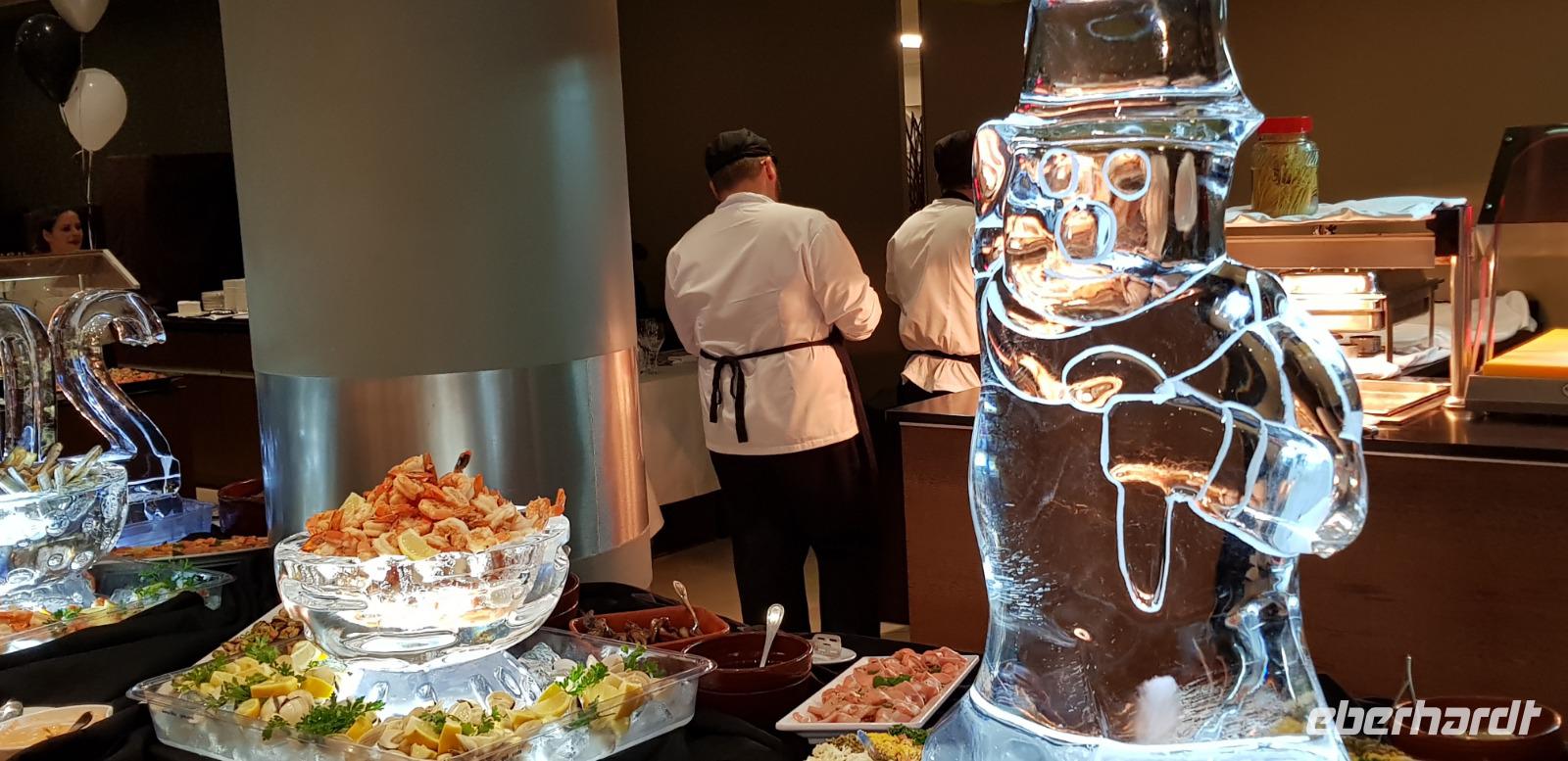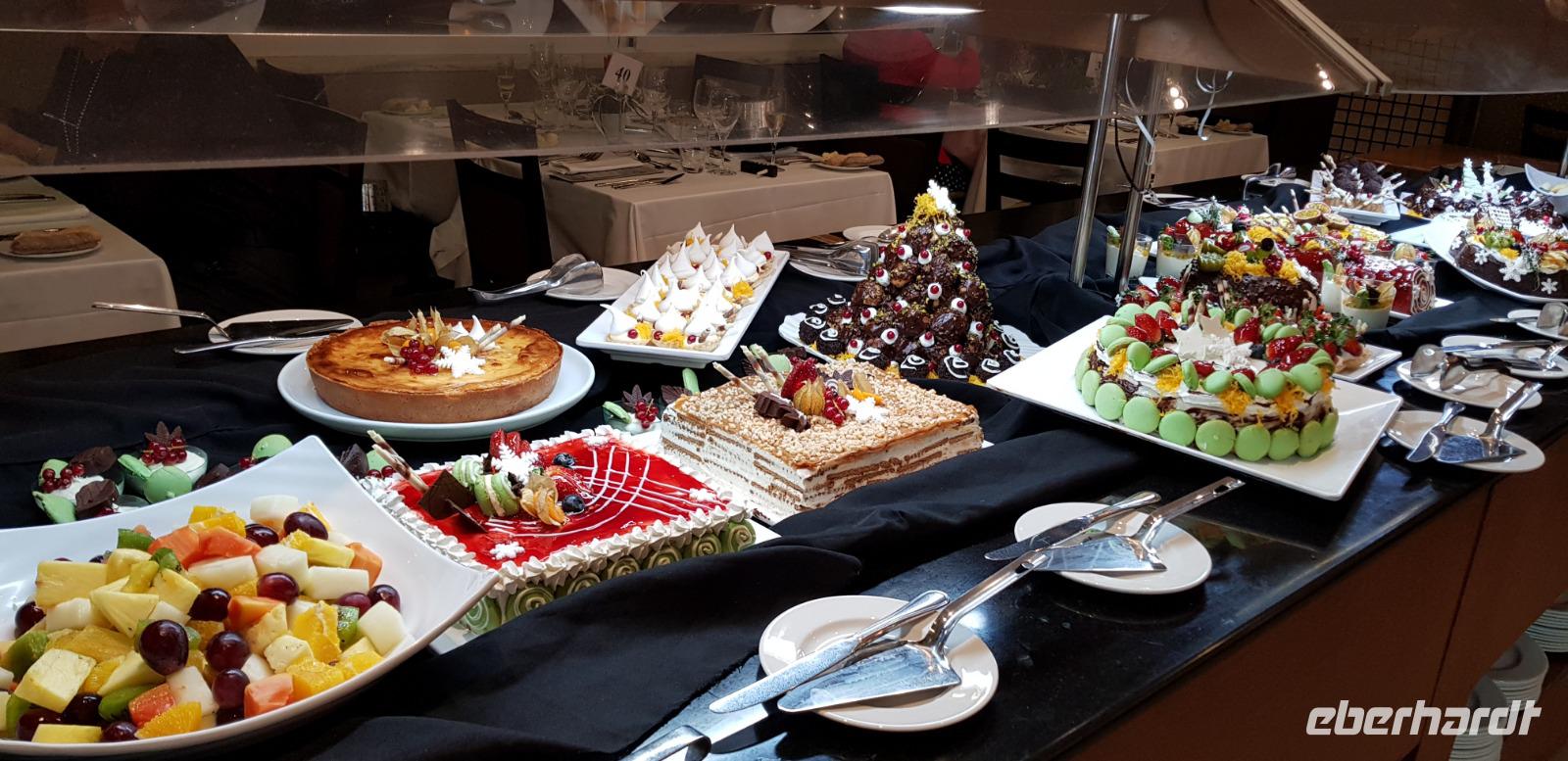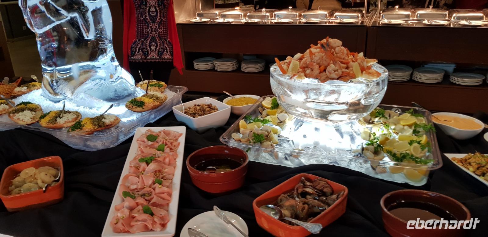 Gegen 19 Uhr stoßen wir mit einem Glas Sekt noch auf das alte Jahr an, bevor unser Dinner mit einem Hummergang beginnt. Mit zahlreichen anderen Köstlichkeiten können wir uns am Buffet nach belieben bedienen. Vom kalten Büffet, das unzählige Fisch- und Meeresfrüchtesorten, Käse oder Schinkenspezialitäten enthält, über Suppe, warme und frisch vor unseren Augen zubereitete Hauptspeisen, verschiedenste Käsespzialitäten bis hin zum Dessertbüffet bleiben keine Wünsche offen und wir schlemmen und genießen allerlei Delikatessen.