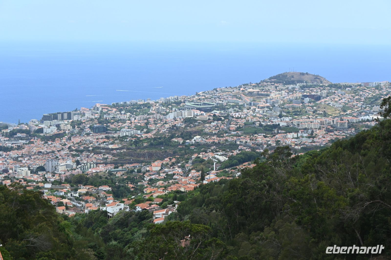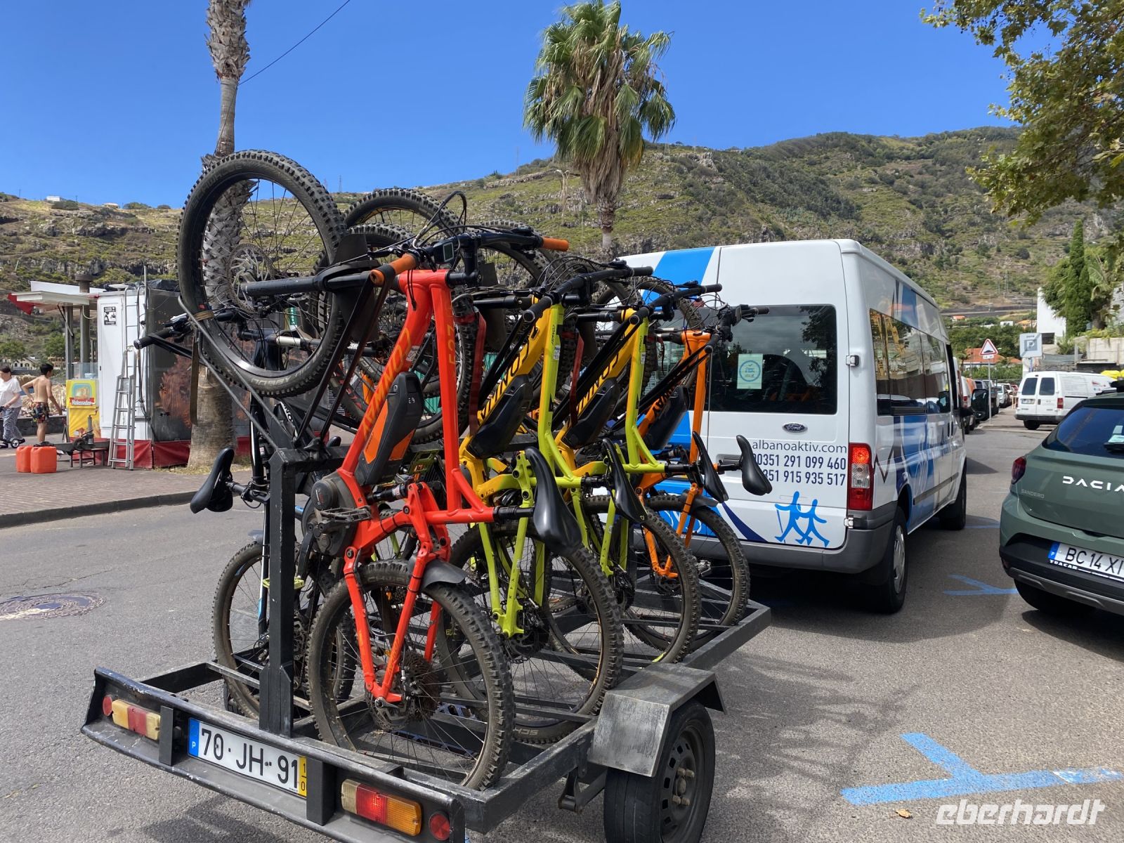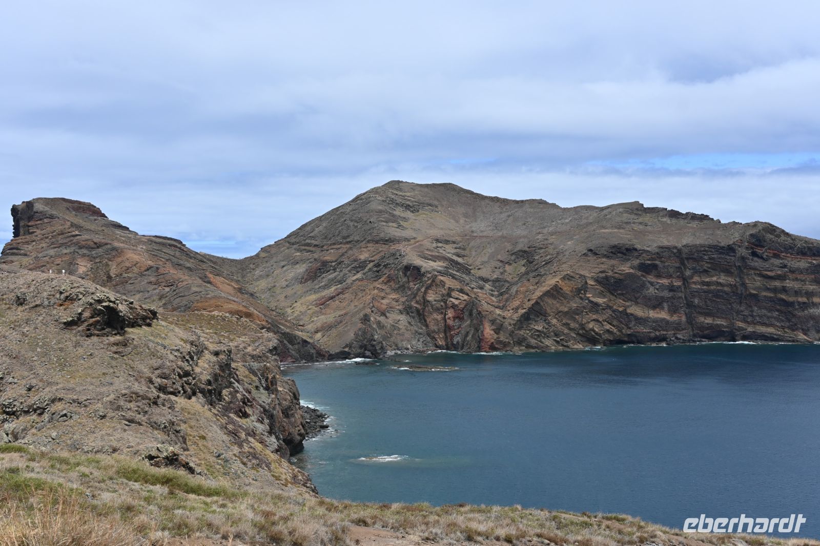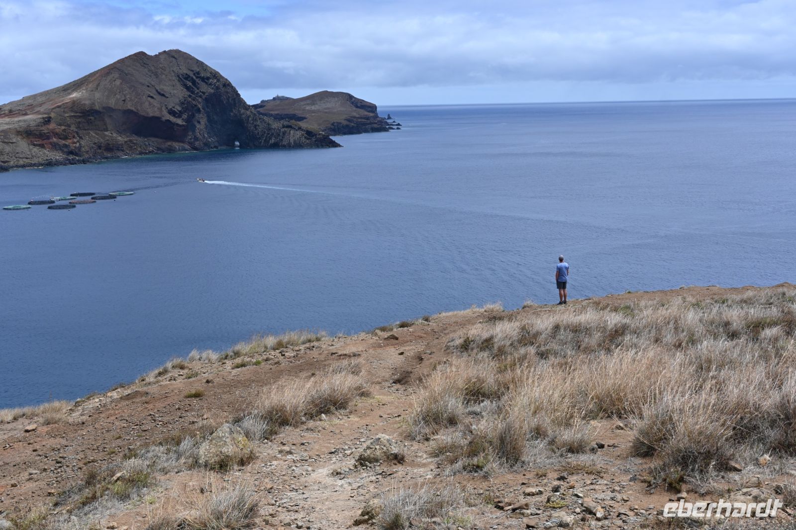Heute empfängt uns Albano in der Hotellobby. Er kam vor 25 Jahren nach Madeira und hat den Weg nicht mehr nach Deutschland zurückgefunden. Auf dem Hänger seines BUsses transportiert es bereits unser heutiges Fortbewegungsmittel - zehn glänzende und voll aufgeladene E-Mountainbikes. Wir starten in Camacha, oberhalb von Canico. Von dort geht es, hauptsächlich bergab, über Stock und Stein bis an die Küste von Machico. Für die rund 32 Kilometer benötigen wir reine Fahrtzeit 2,5 Stunden. Mit einigen Pausen für Erklärungen von Albano oder um einfach mal die Arme auszuschütteln, erreichen wir zur Mittagszeit unser Ziel. Der Strand von Machico wurde künstlich mit Sand aus Marokko angelegt und ist einer der wenigen Sandstrände der Insel. Wir sind froh, dass wir die Pause nutzen können, um kurz ins Wasser zu springen, uns abzukühlen und anschließend haben wir noch Zeit einen kleinen Snack an der Promenade zu kaufen. Punkt 14 Uhr fährt Fatima mit dem Bus an der Promenade vor und wir springen hinein. Mit unserer vorbildlichen Pünktlichkeit haben wir uns einen extra Fotostopp erarbeitet. Wir fahren zu einem Aussichtspunkt auf die östliche Spitze. Die vulkanische Halbinsel ist neun Kilometer lang und lädt viele Touristen auf eine Wandertour ein.