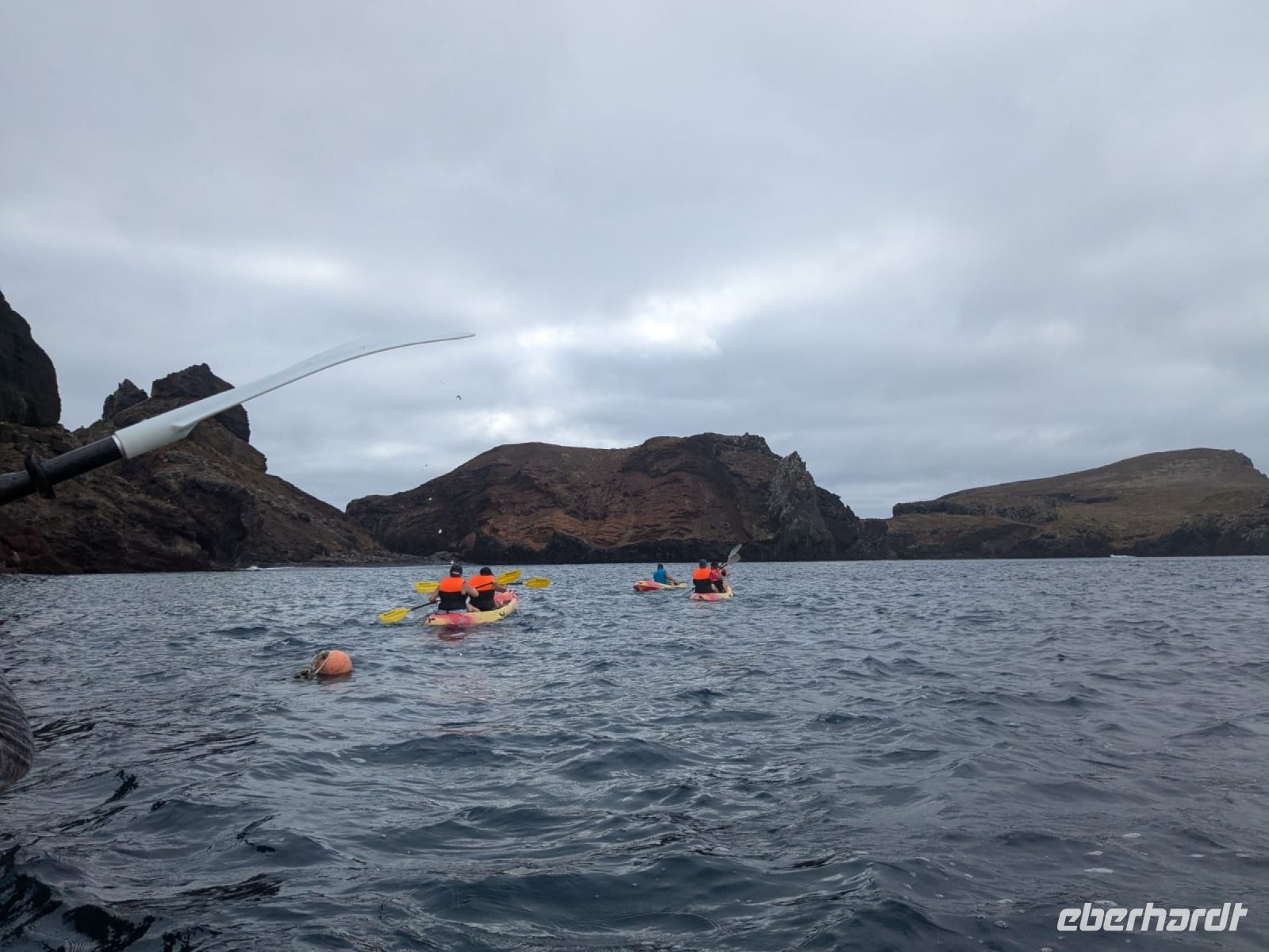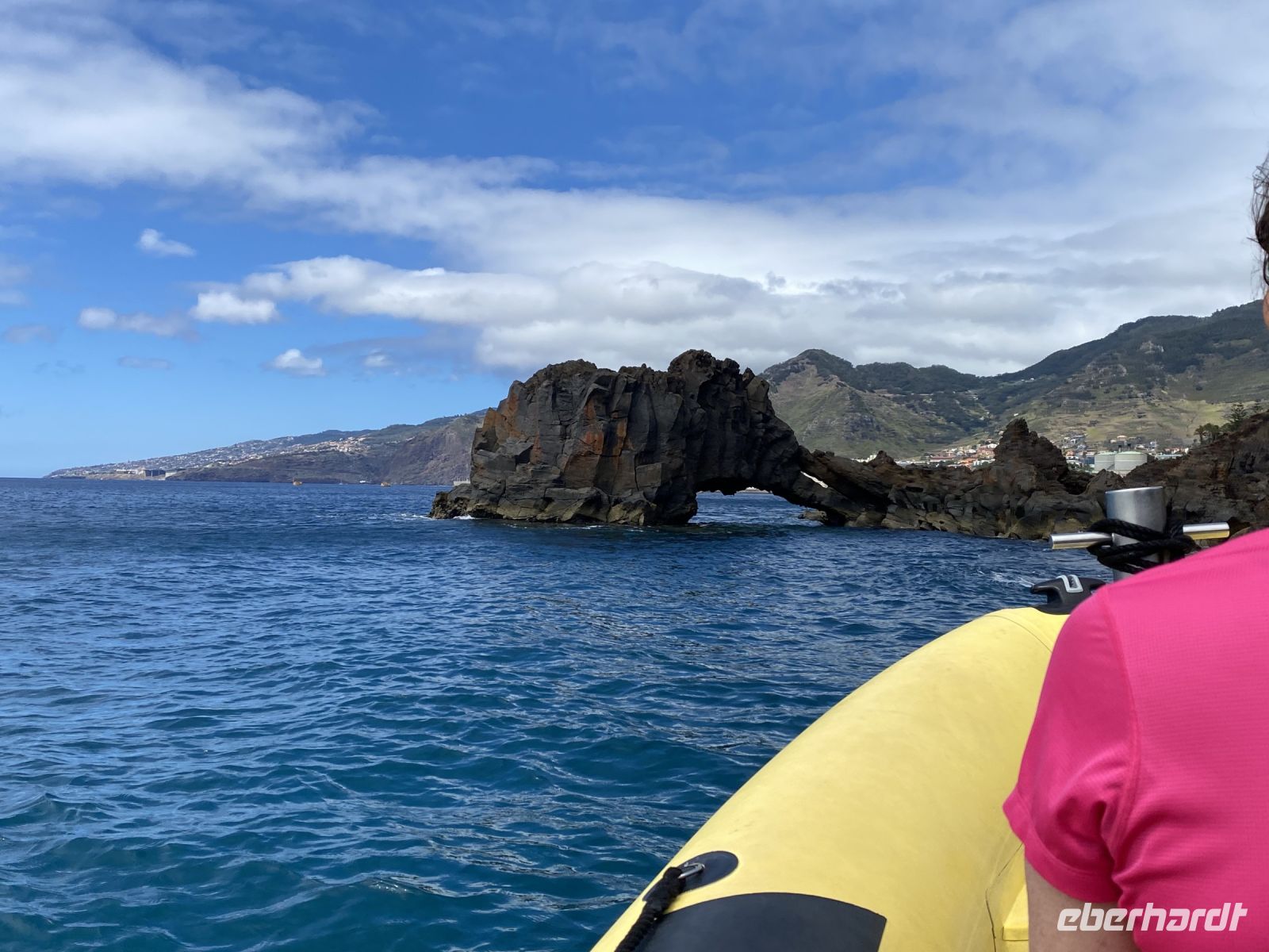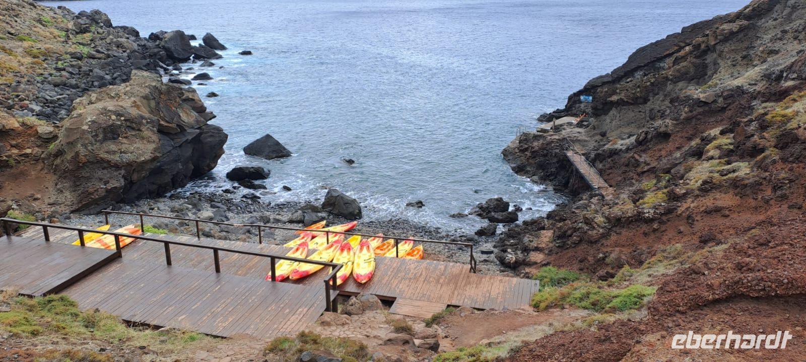 Heute haben wir wieder Fatima an unserer Seite. Für den Vormittag wird es heute nochmal nass und salzig. Bei strahlendem Sonnenschein starten wir an unserem Hotel, entlang der Ostküste Richtung Norden wird es jedoch immer wolkiger und windiger, aber wir sind ja nicht aus Zucker. Wir erreichen den Hafen Quinta do Lorde, dieser gehört zur großen Hotelanlage, die im Oktober wieder eröffnen soll. Dennoch liegen hier viele Yachten und Ausflugsboote. Obwohl wir eine Kayak-Tour gebucht haben, werden wir zu einem Schnellboot geführt. Auch Fatima ist etwas ratlos, da sie die Tour zum ersten Mal macht. Wir vertrauen den Guides und nehmen Platz. Kaum aus dem Hafen raus, gibt der Kapitän Gas und bringt uns in eine kleine Bucht der Ostspitze. Dort liegen die Kayaks. Wir verstauen unsere Sachen, bekommen Schwimmwesten und verteilen uns auf die kleinen Boote. Jetzt ist unsere Armkraft gefragt, es ist gar nicht so einfach gegen die Wellen anzukommen. Wir paddeln entlang der Klippen der Ostspitze der „Ponto de Sao Lourenco“. Das Gebiet ist teilweise als Naturschutzgebiet eingestuft. Zur Halbinsel gehören noch drei weitere Inseln, die die Ostspitze bilden. Auf einer davon fühlen sich besonders die Seemöwen wohl, hier haben sie ihre Ruhe, können ungestört brüten und haben das fischreiche Meer vor der Nase. Nach den drei Desertas war dieses Gebiet, das erste, das von den Vulkanen gebildet wurde und ist somit der älteste Teil von Madeira. Die Vegetation hier könnte nicht kontrastreicher sein, denn im Gegensatz zur restlichen Insel ist es hier karg und vegetationslos.
