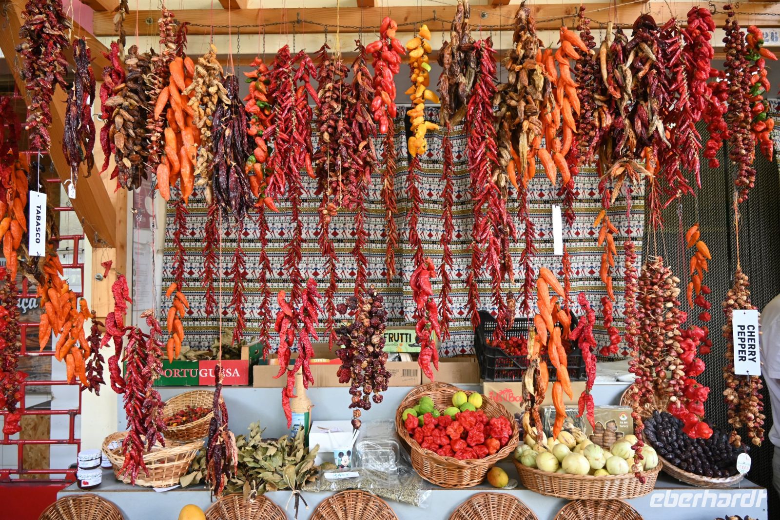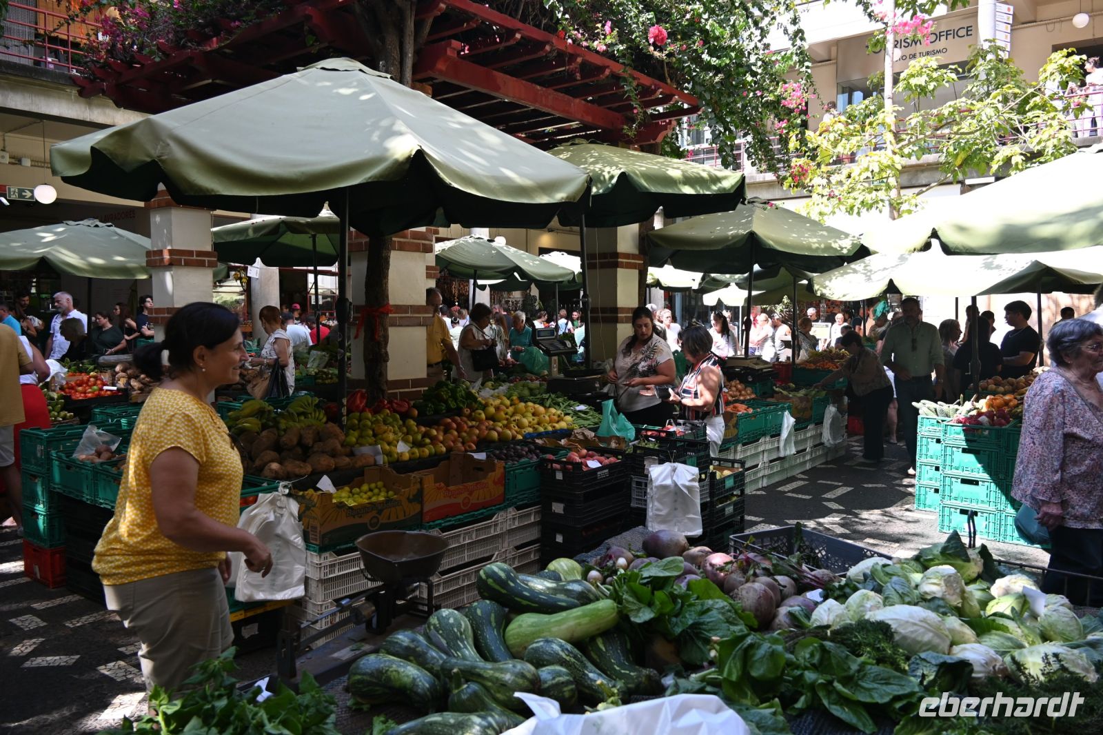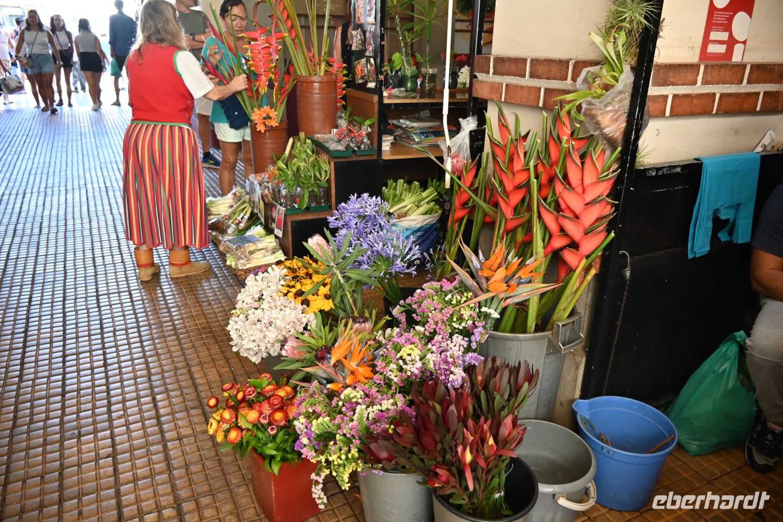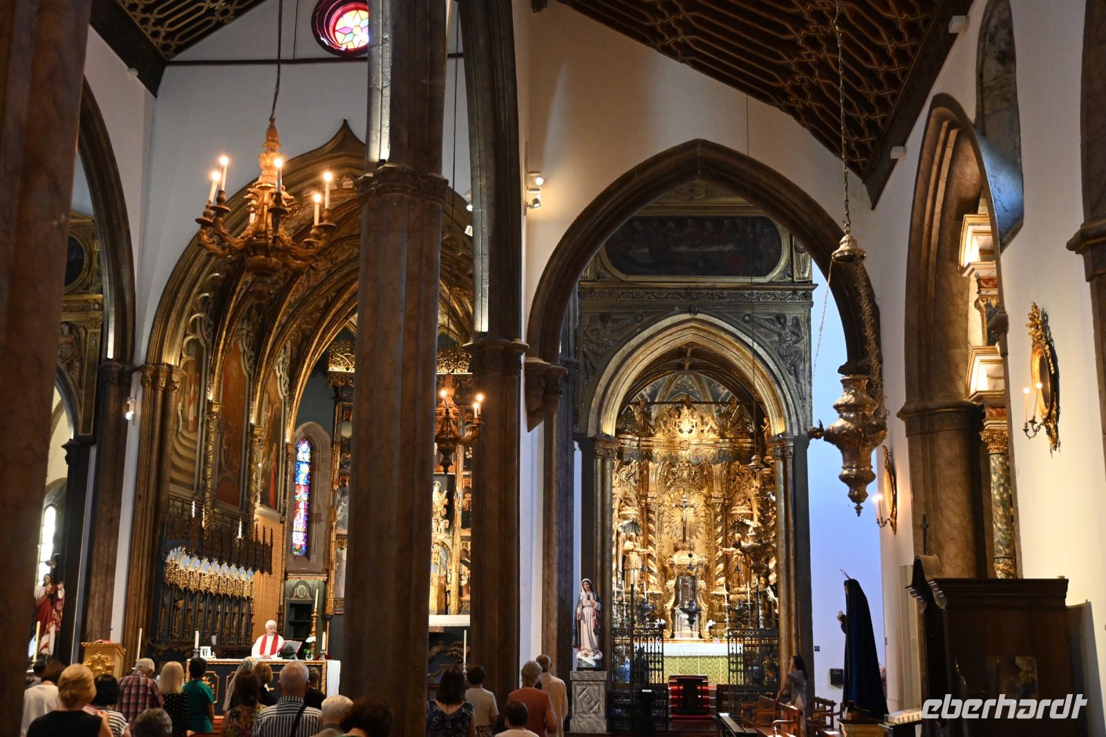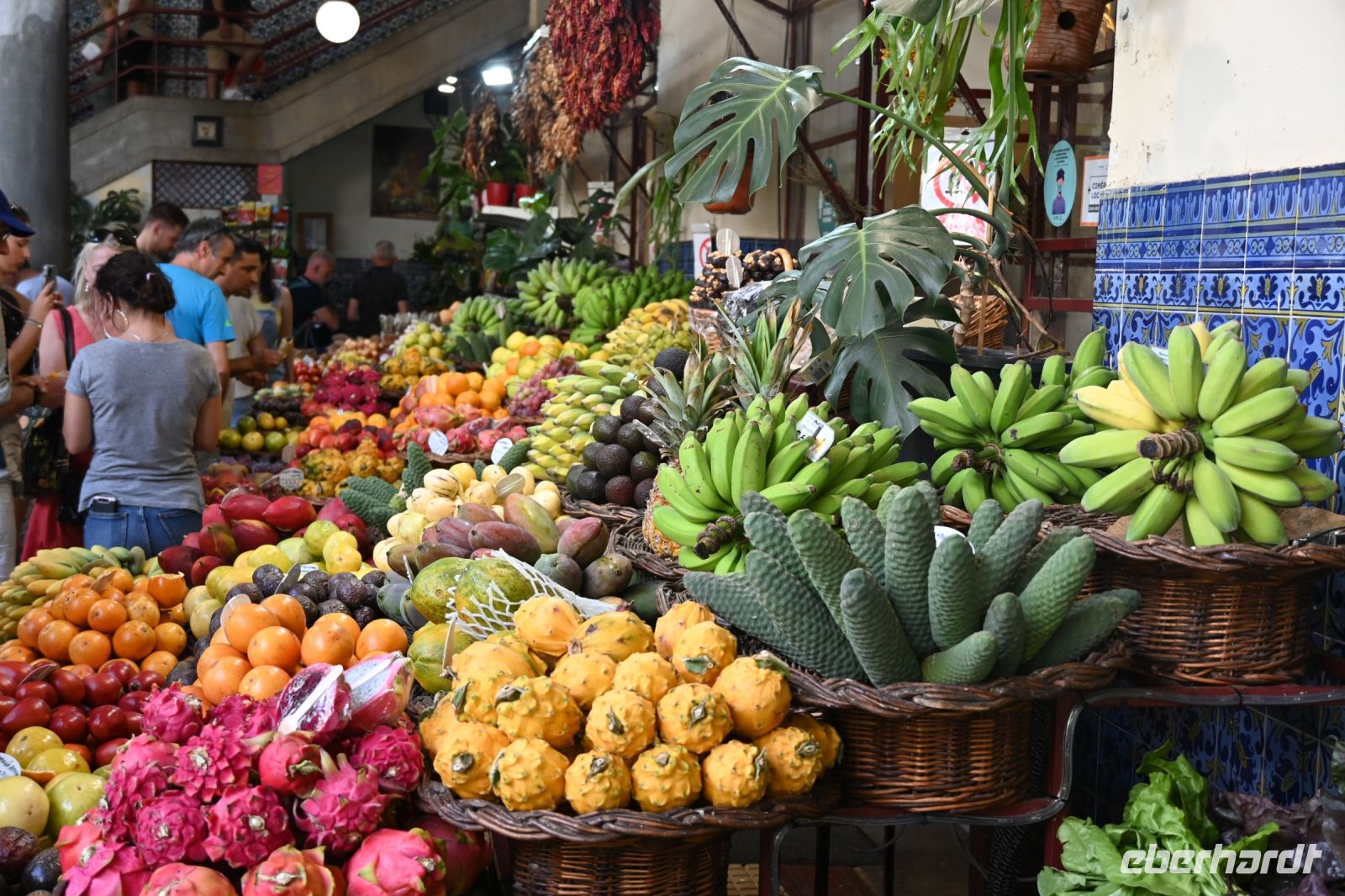 Zuerst besichtigen wir die Gärten der Quinta Vigia, dem Wohnsitz des Präsidenten der Regionalregierung und das bereits seit 1984. Fatima hat ein breites Wissen über die Pflanzenwelt und stellt uns fast jede Pflanze persönlich vor. Wir hoffen, dass diese Sachen nicht im Laufe der Reise nochmal abgefragt werden. Die Gärten sind sehr schön gepflegt, was den vielen Gärtnern, die wir sehen, zuzuschrnta Maria“ eiben ist. Von der Anhöhe an der Küste haben wir einen wunderschönen Blick auf die Stadt und den Hafen. Gleich nebenan befinden sich der Park der Santa Catarina. Auch hier finden viele einheimische und exotische Pflanzen ihren Platz. Wir erreichen die Kathedrale von Funchal, die als „Sé“ betitelt wird und beschreibt den Bischofswohnsitz. Von außen sehr einfach gestaltet, wundert uns im inneren der gotische Baustil mit vielen Verziehrungen und einer prunkvollen Decke aus Holz. Als wir die Kathedrale betreten, wird soeben die Messe abgehalten und uns wir erfahren von Fatima, dass der Glauben in Portugal noch sehr stark ausgeprägt ist. Der Besuch des Gebets wird von einigen Einheimischen sicher mit einem Besuch der Markthalle verbunden. Hier tummeln sich zum Freitag viele Menschen, die für das Wochenende einkaufen oder Touristen, wie uns, die einfach nur mal schauen wollen. Wir erfahren, dass Freitag und Samstag die am stärksten besuchten Tage des Markts sind und auch viele Bauern aus dem Umland an diesen beiden Tagen hier ihre Waren verkaufen. Teilweise wird uns auch angeboten, die teils unbekannten Früchte zu probieren.