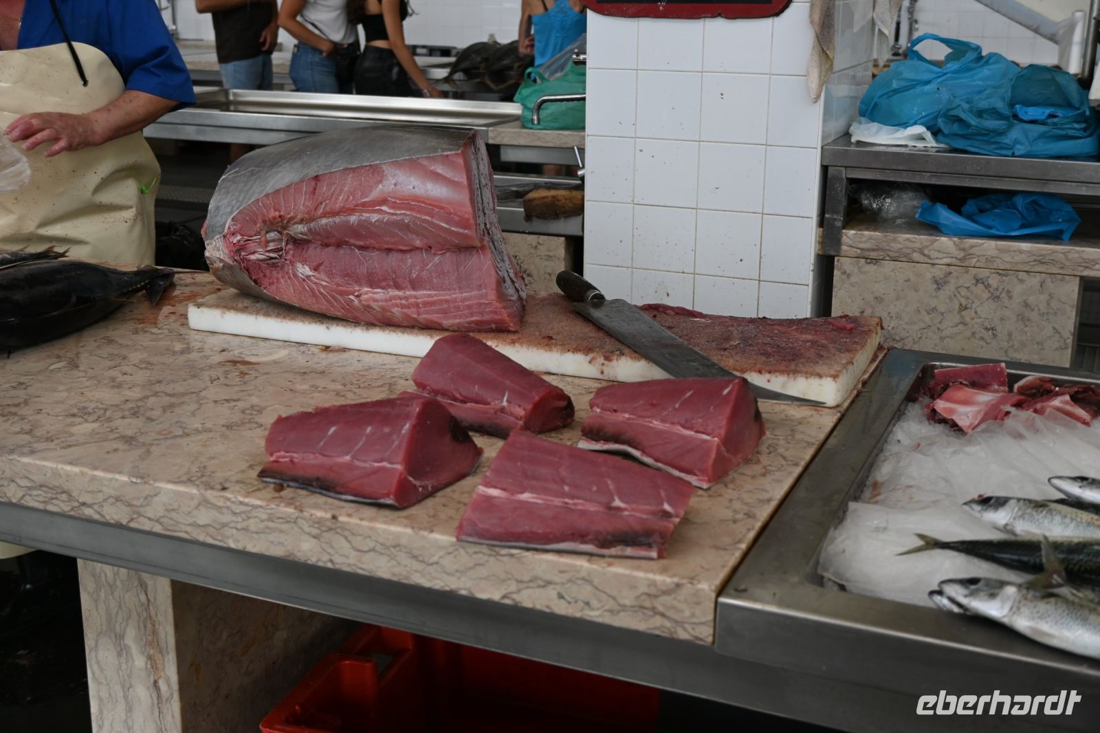 In der Bucht wird auch eine Fischzucht mit Doraden betrieben. Insgesamt gibt es hier acht Tanks im Wasser, jeder ist 20 Meter tief und beherbergt bis zu 250.000 Fische die in den Restaurants und Supermärkten verkauft werden. Auf dem Weg zurück zur Anlegestelle haben wir starken Gegenwind, es ist gar nicht so leicht das kleine Boot vorwärts zu bewegen.