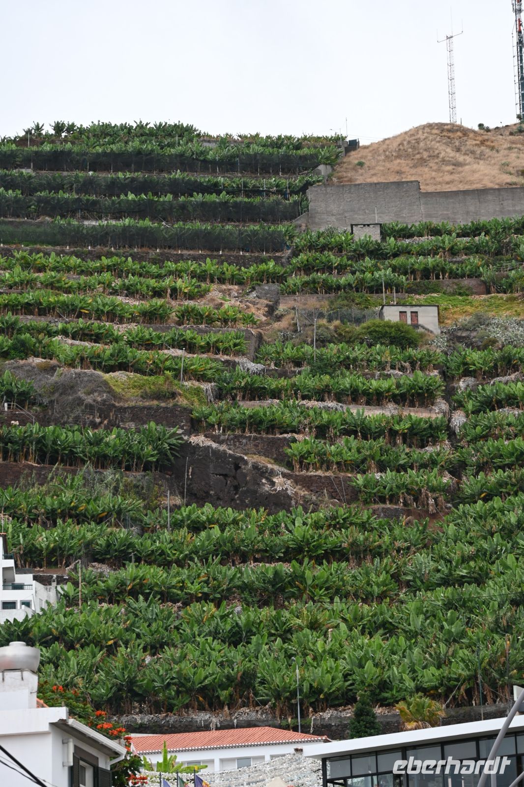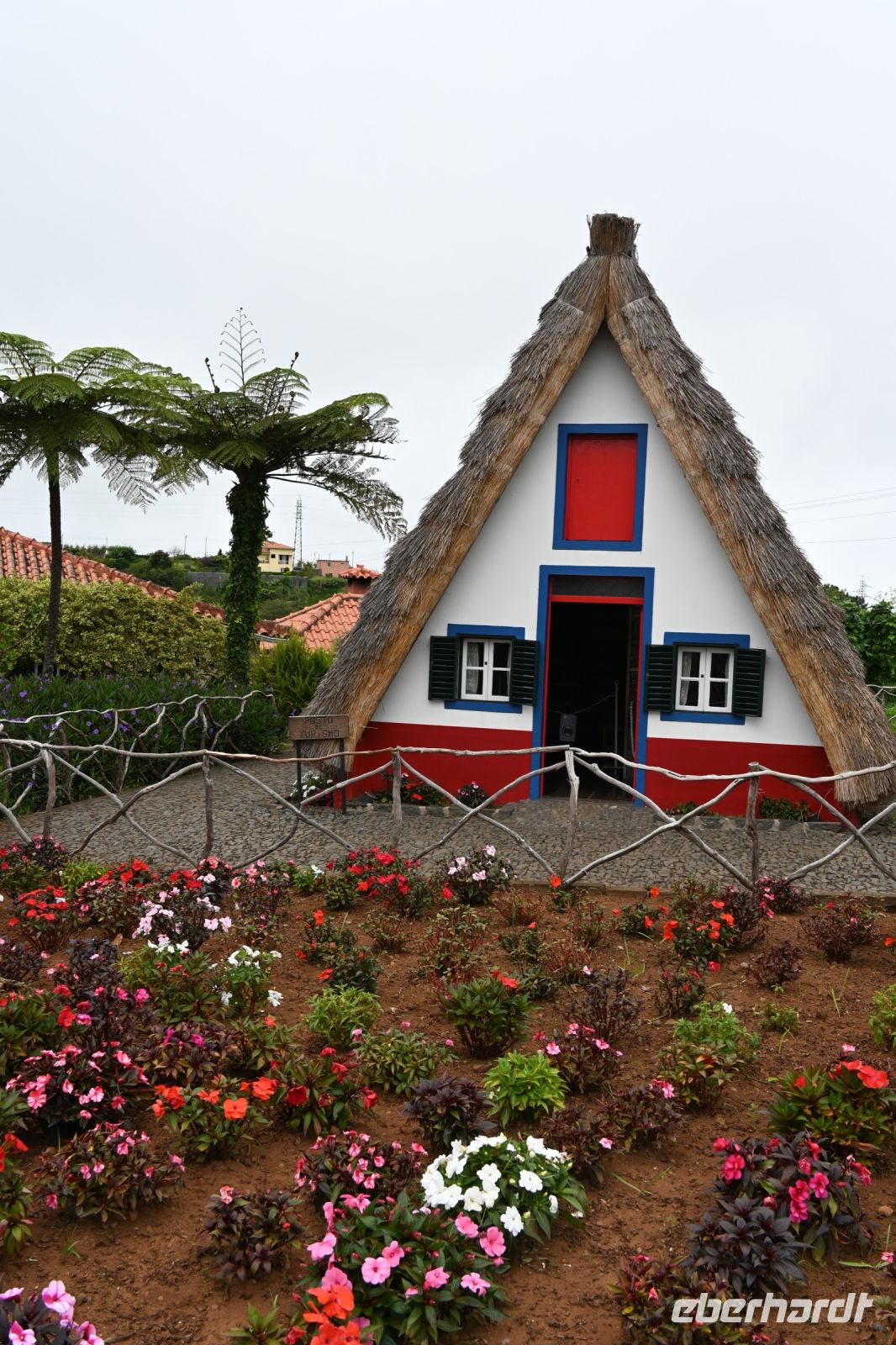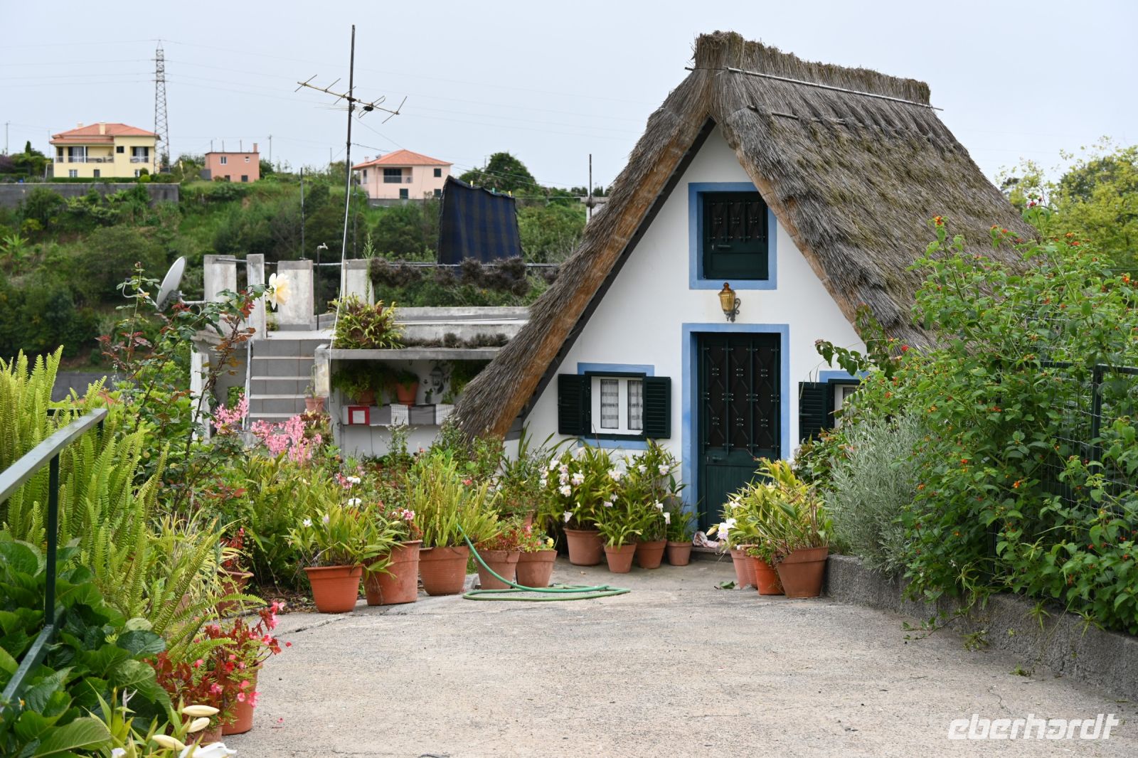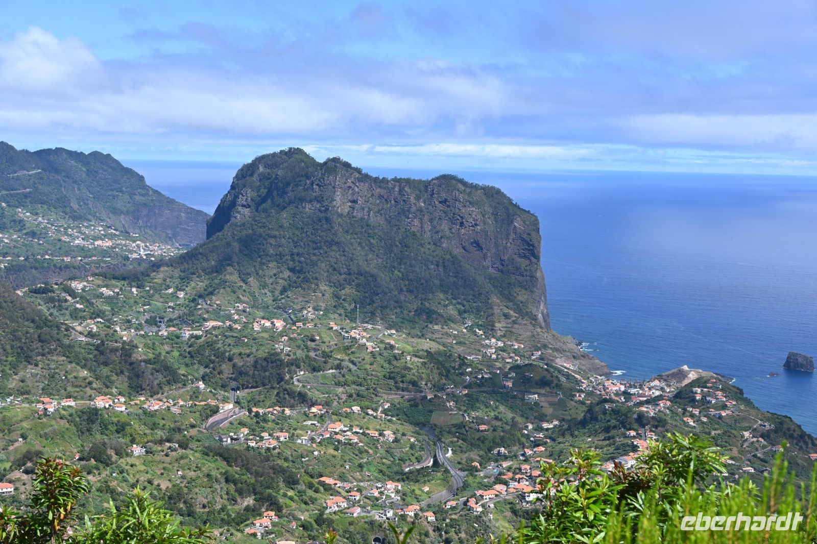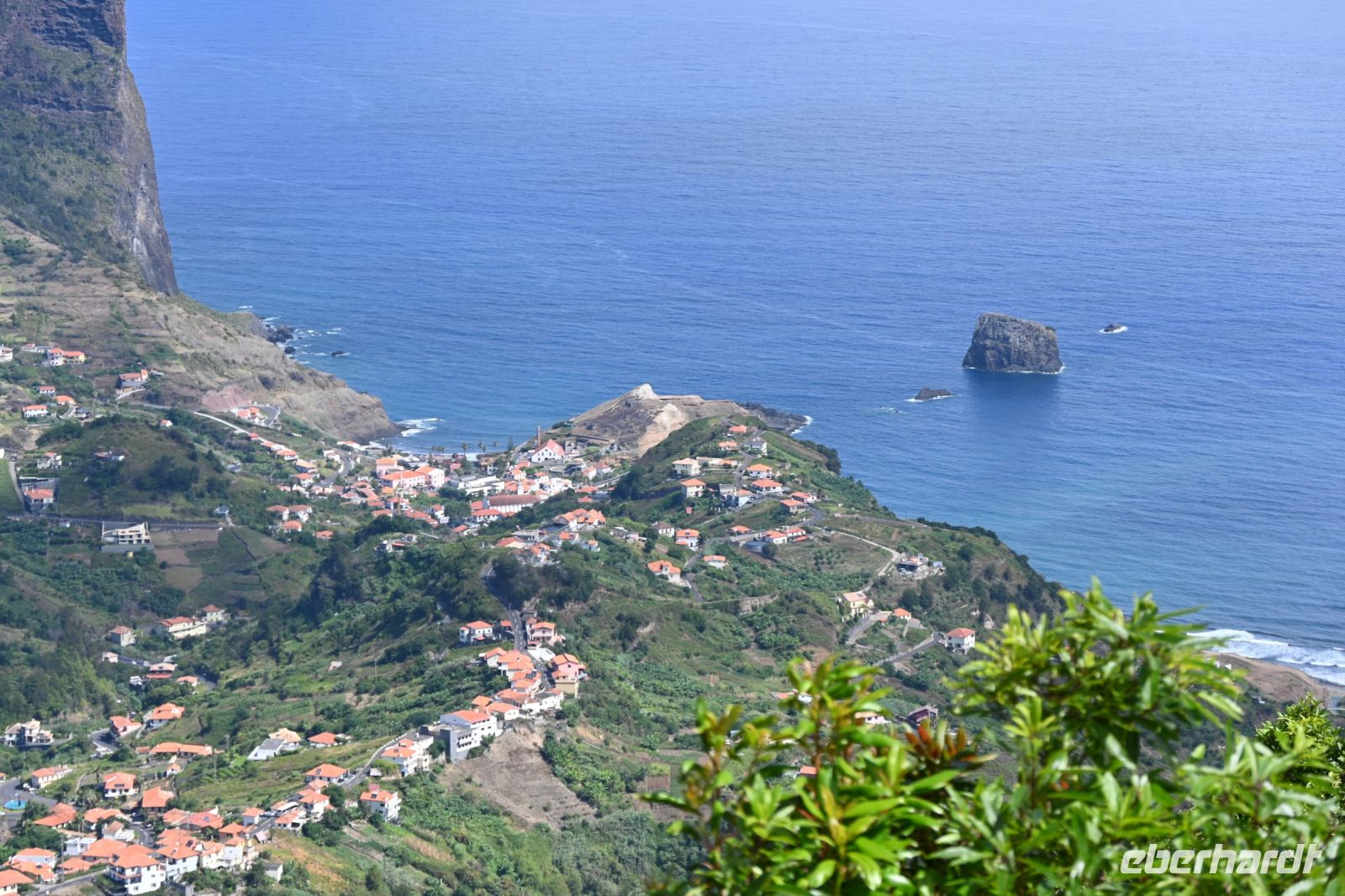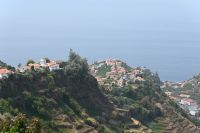Das bekannteste Fotomotiv der Insel ist wohl das der strohbedeckten Häuser. Nur noch wenige dieser typischen dreieckigen Madeirahäuser stehen heute noch in Santana an der Nordküste. Einige davon sind sogar noch bewohnt, wobei zu den kleinen Häusern noch ein Anbau mit Küche und Badezimmer gehört. Anders als in Norddeutschland werden die Dächer nicht mit Schilf, sondern mit Stroh bedeckt. Von hier hat man auch einen schönen Blick auf die Küste und anders als im Norden üblich, haben wir heute auch wolkenlosen Himmel.