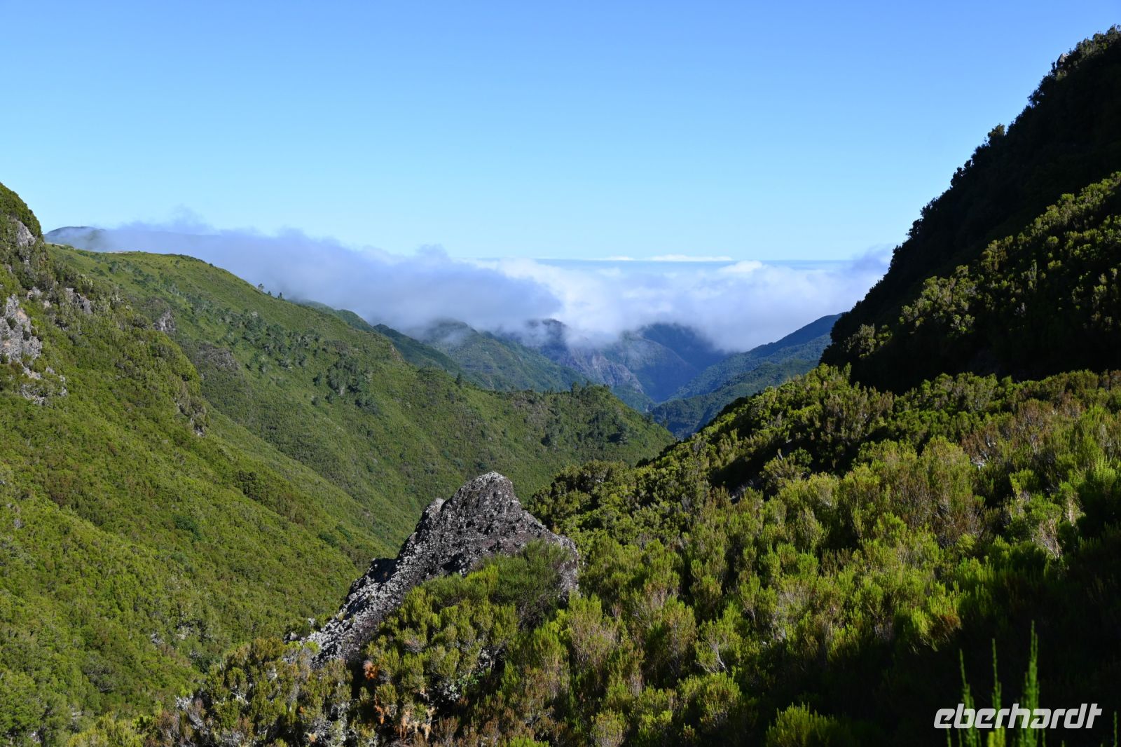Nachdem die Armmuskeln nun trainiert sind, sind jetzt die Beine dran. Es geht nochmal entlang der Ostküste in den Norden, über Machico zum Aussichtspunkt auf den Adlerfelsen. Hier waren wir bereits am Montag mit den E-Bikes. Doch die acht Kilometer lange Wanderung führt uns durch den mystischen Lorbeerwald mit vielen Baumfarnen. Immer wieder gibt es einen kurzen Blick aufs Tal bis die Wolken sich ins Tal legen und alles in Nebel gehüllt wird. Doch das bisschen Luftfeuchtigkeit hält uns nicht auf und wir hatten schließlich die ganze Woche fabelhaftes Wetter. Nachdem die Wanderung doch sehr gemütlich und ohne viele Höhenunterschiede verlief, fordern uns die letzten zwei Kilometer mit einem stetigen Abstieg etwas. Nach drei Stunden ist der Bus in Sicht und bringt uns zurück zum Hotel.
