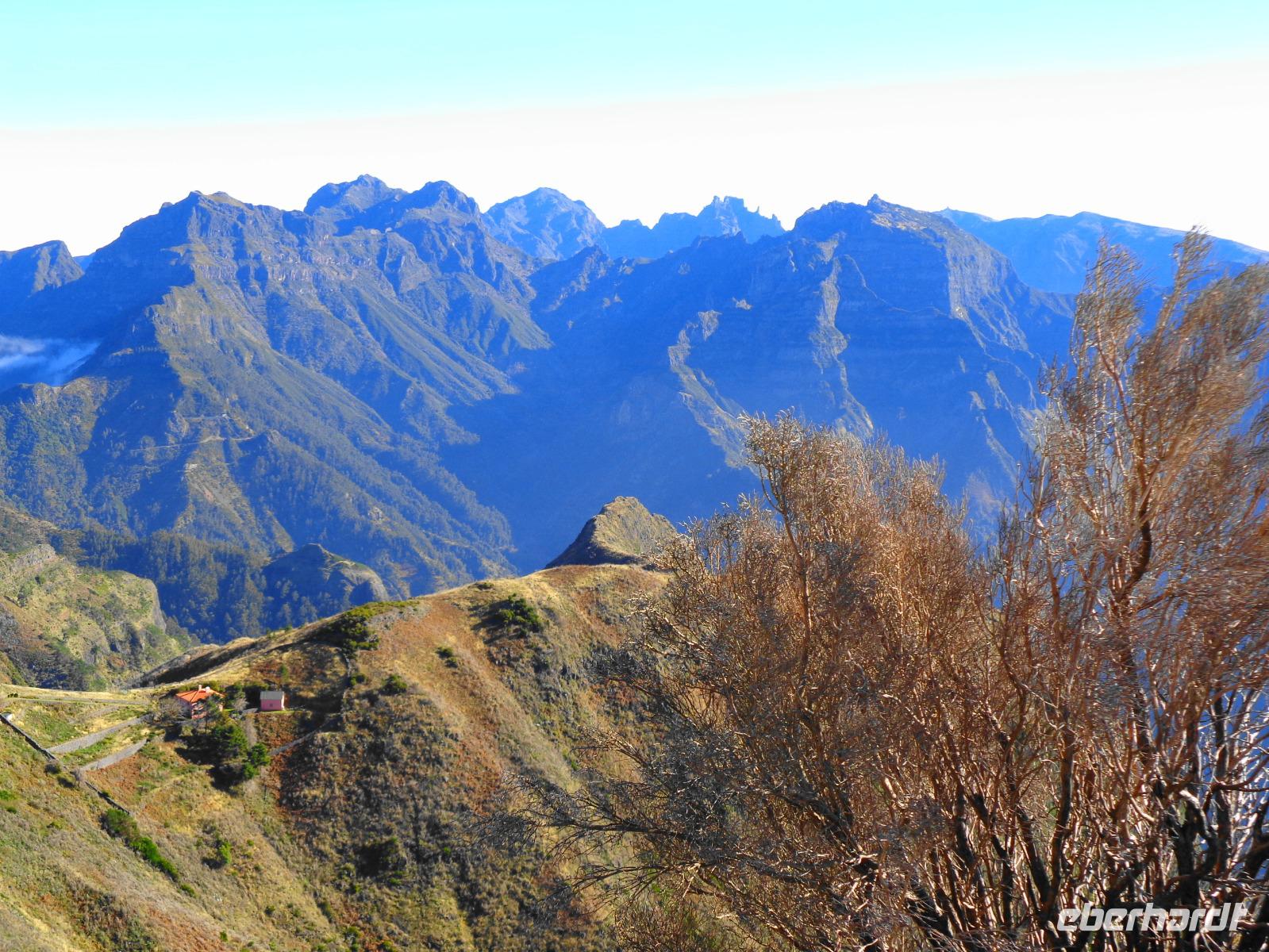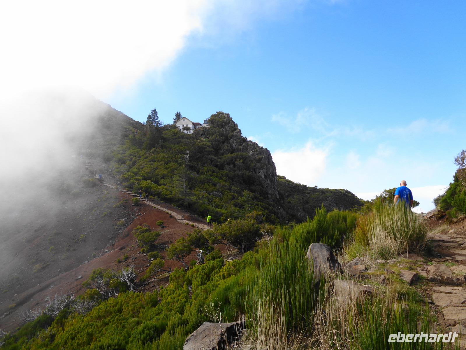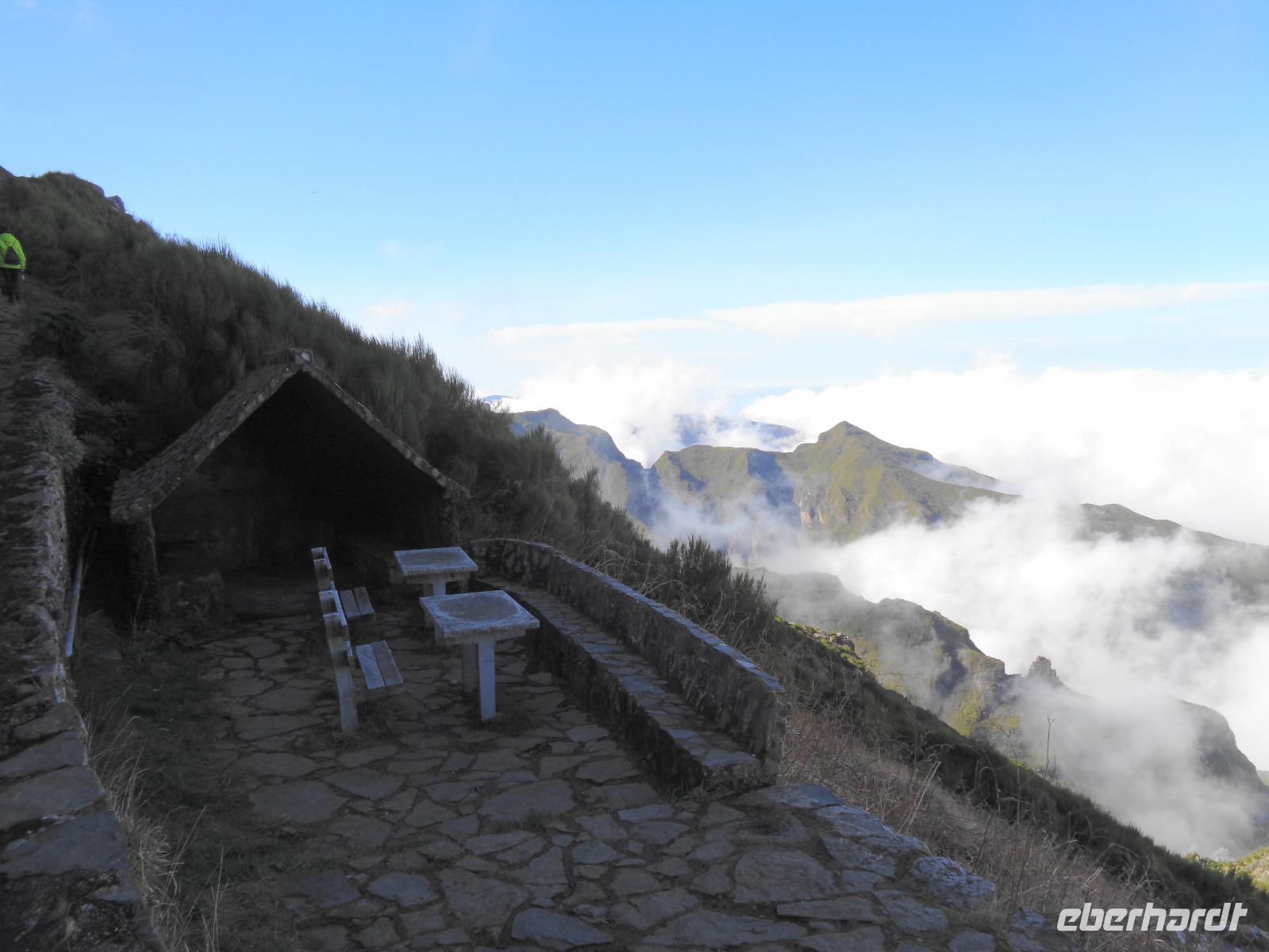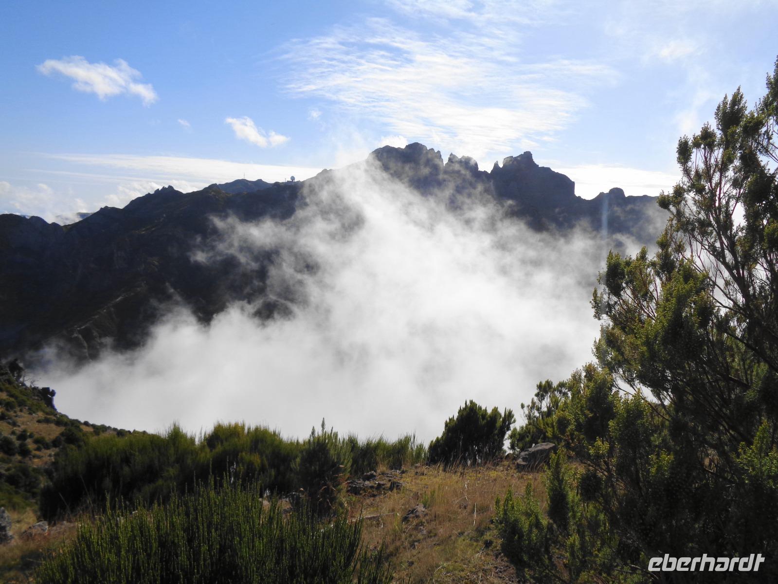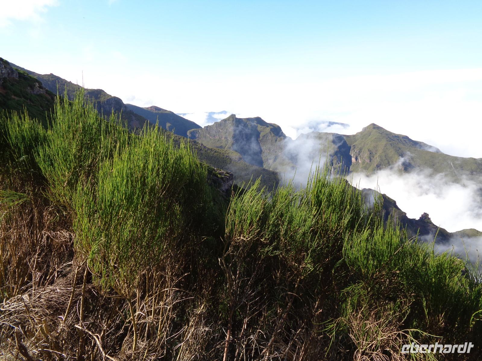 An der anschließenden Wanderung zum Pico do Ruivo wollten nur 3 Gäste teilnehmen und so hatten die restlichen Gäste einen ausgedehnten Aufenthalt in Santana. Die meisten nutzten die Gelegenheit zu einer Mittagseinkehr und einem Spaziergang zu den von unzähligen Fotos bekannten spitzgiebeligen und mit Stroh gedeckten bunten Santana-Häuschen. Die Wanderer wurden trotz der umherziehenden Nebelschwaden mit herrlichen Ausblicken auf die höchsten Berge Madeiras belohnt.