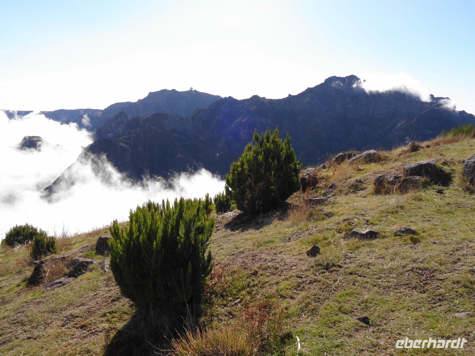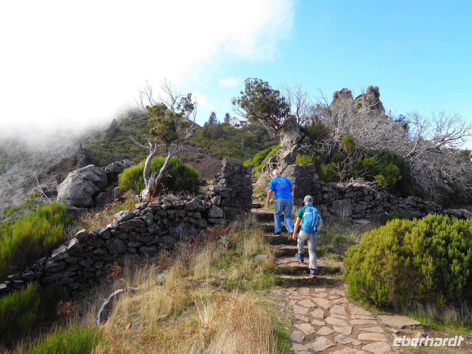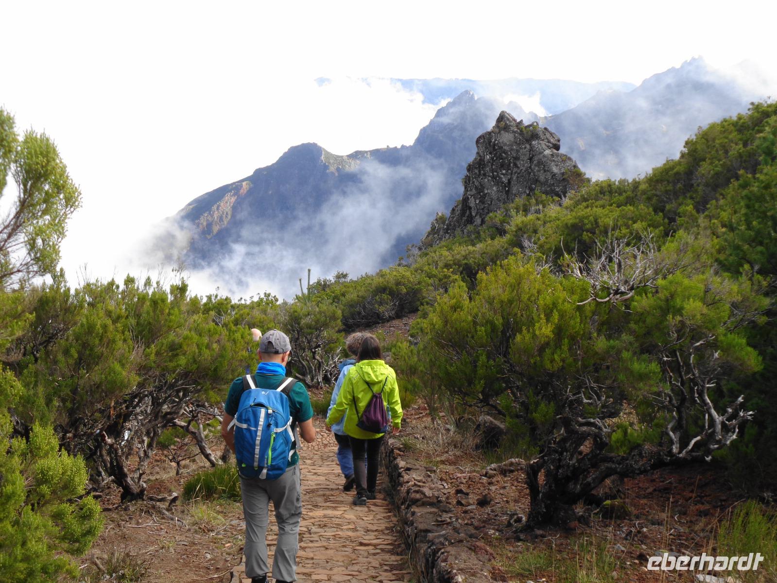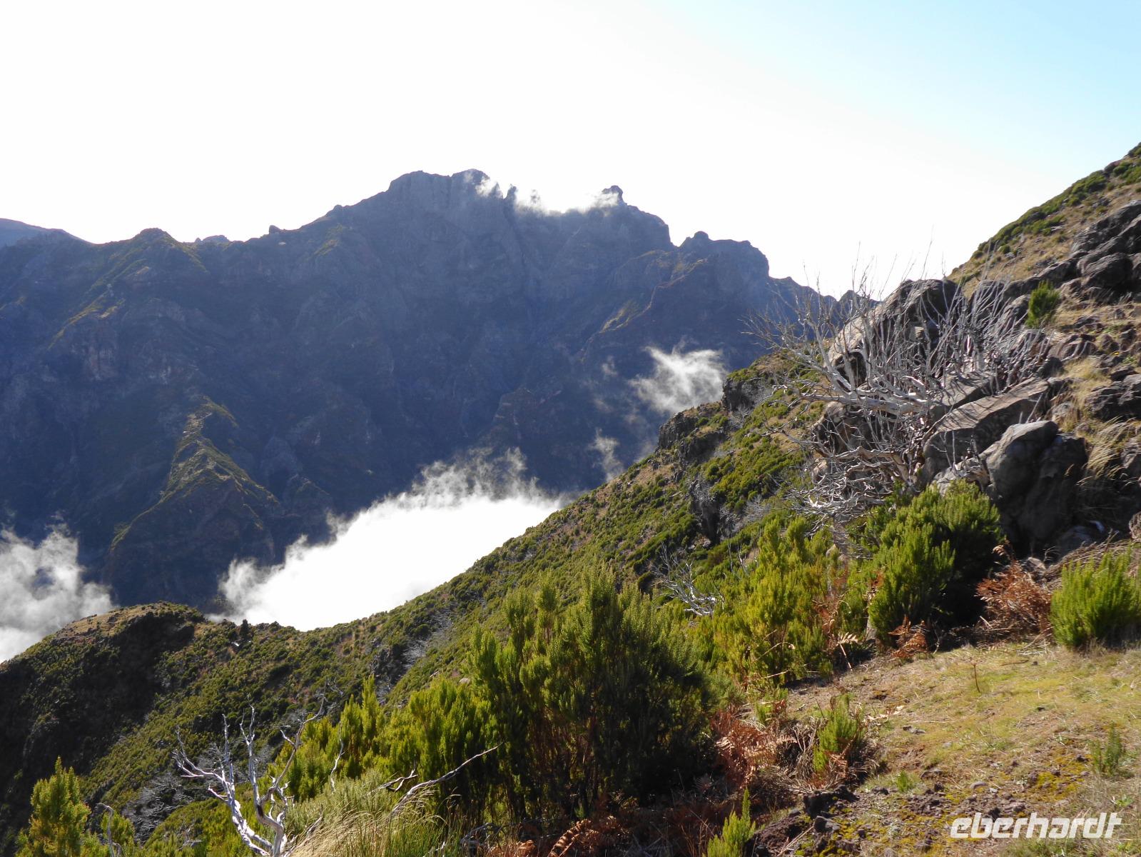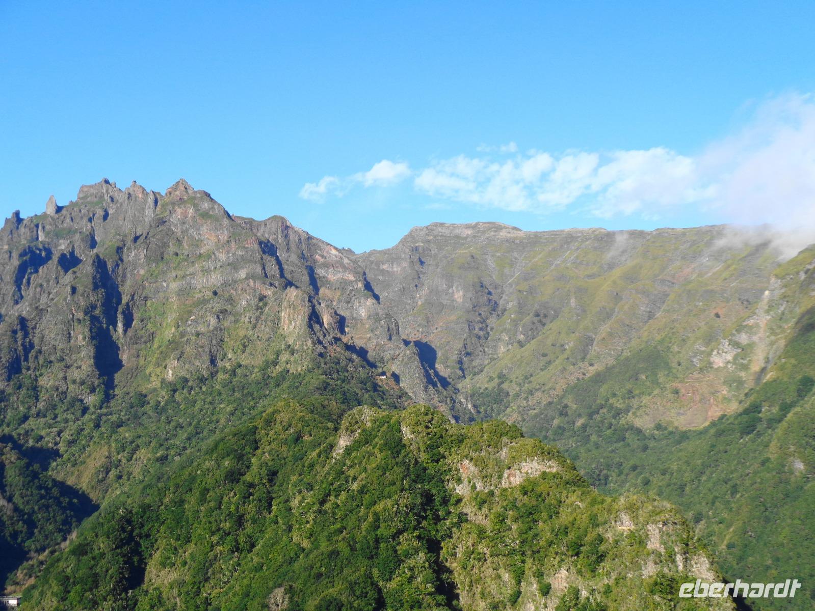 An der anschließenden Wanderung zum Pico do Ruivo wollten nur 3 Gäste teilnehmen und so hatten die restlichen Gäste einen ausgedehnten Aufenthalt in Santana. Die meisten nutzten die Gelegenheit zu einer Mittagseinkehr und einem Spaziergang zu den von unzähligen Fotos bekannten spitzgiebeligen und mit Stroh gedeckten bunten Santana-Häuschen. Die Wanderer wurden trotz der umherziehenden Nebelschwaden mit herrlichen Ausblicken auf die höchsten Berge Madeiras belohnt.