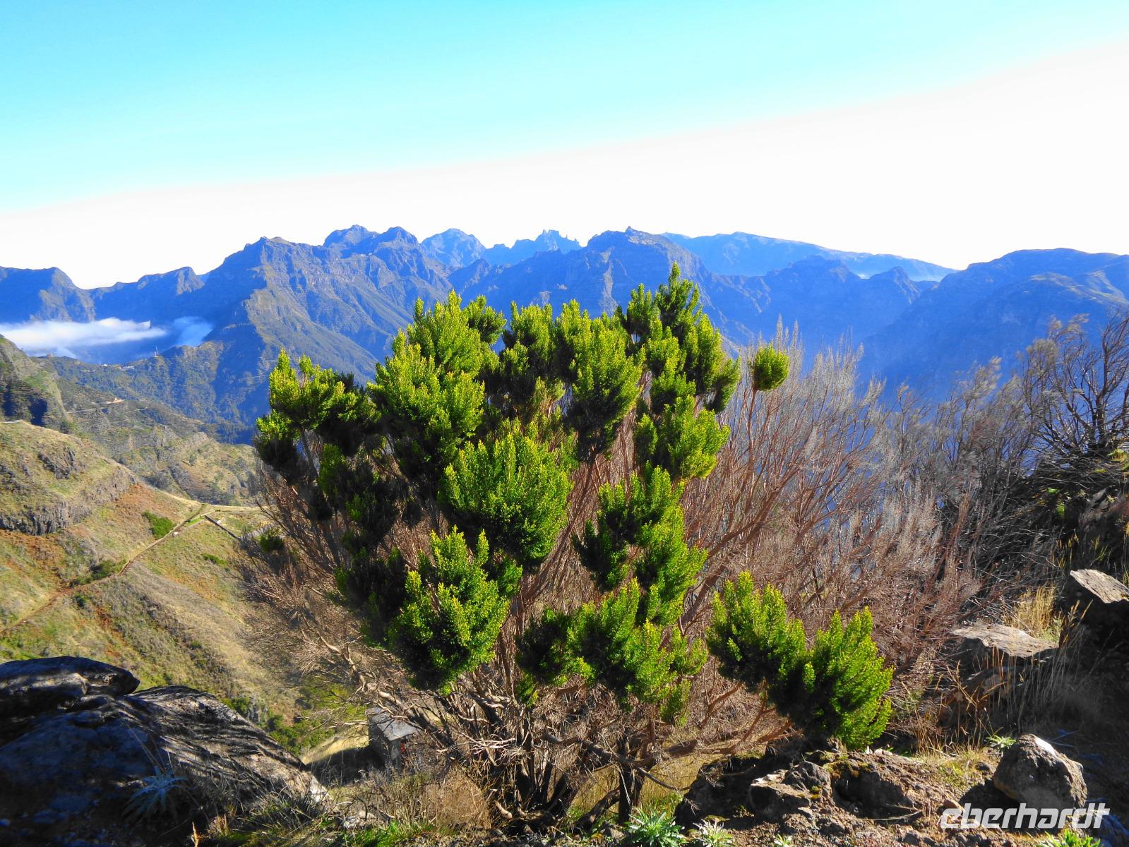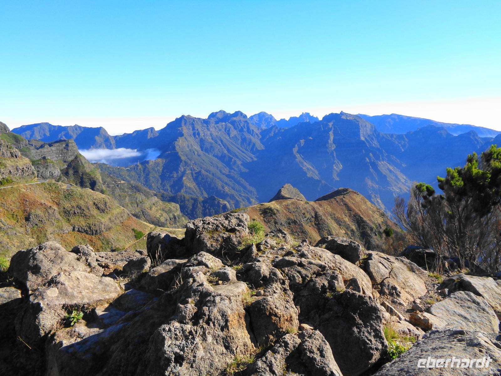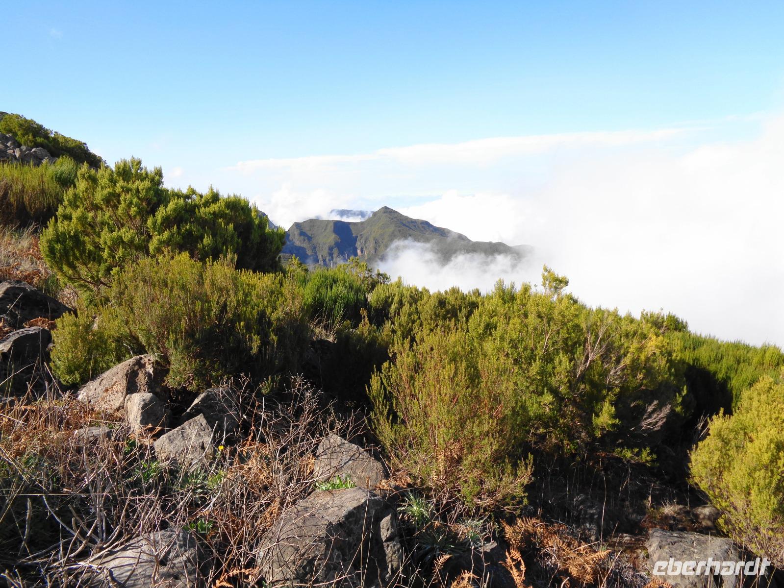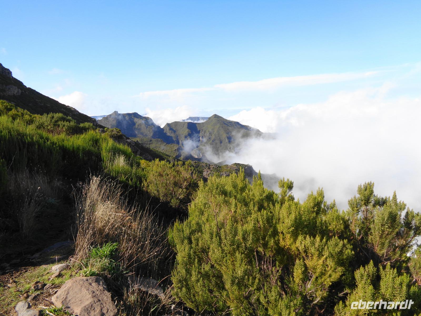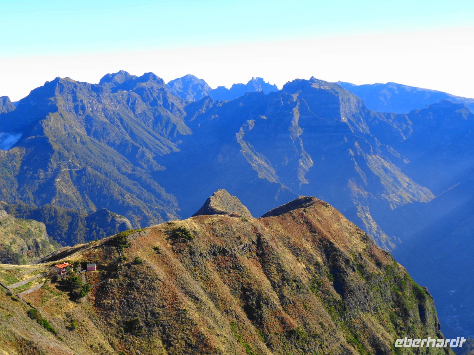 An der anschließenden Wanderung zum Pico do Ruivo wollten nur 3 Gäste teilnehmen und so hatten die restlichen Gäste einen ausgedehnten Aufenthalt in Santana. Die meisten nutzten die Gelegenheit zu einer Mittagseinkehr und einem Spaziergang zu den von unzähligen Fotos bekannten spitzgiebeligen und mit Stroh gedeckten bunten Santana-Häuschen. Die Wanderer wurden trotz der umherziehenden Nebelschwaden mit herrlichen Ausblicken auf die höchsten Berge Madeiras belohnt.