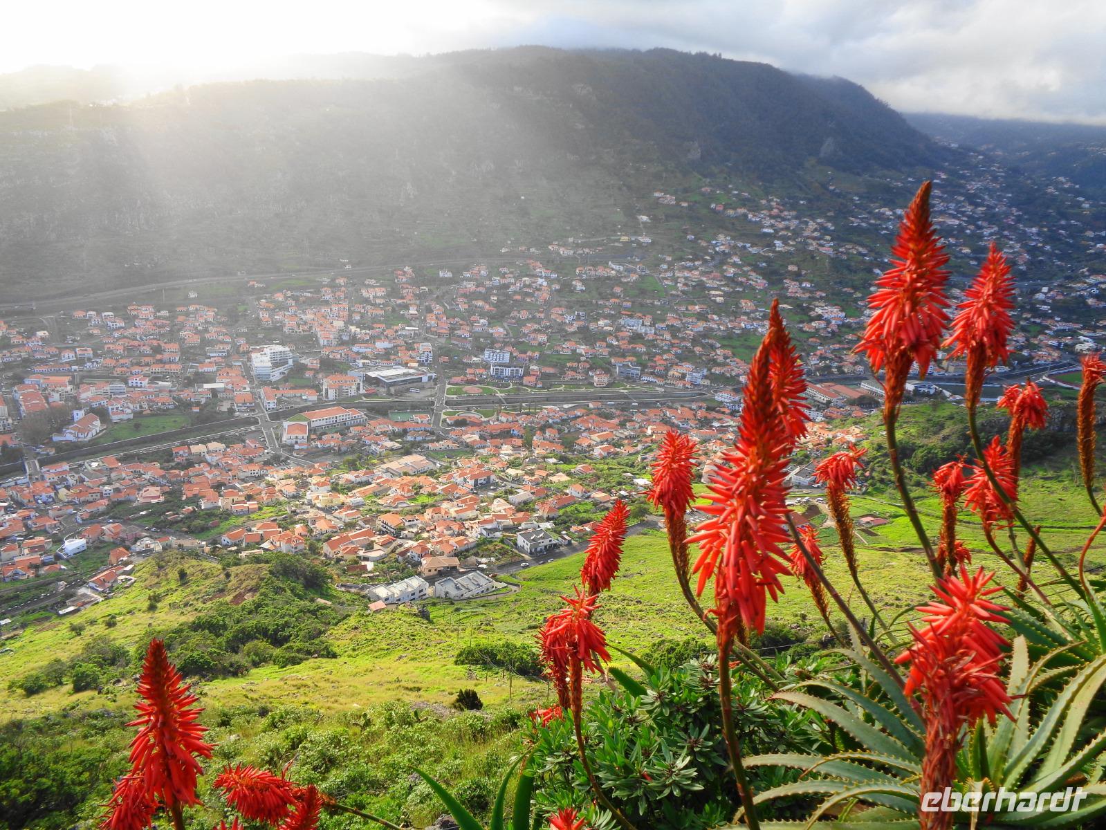 Die anschließend geplante Fahrt über den Portela-Pass ließen wir ausfallen, da inzwischen die tiefhängenden Wolken den Ausblick ins Tal unmöglich gemacht hatten. Dafür war am Aussichtspunkt Pico do Facho hoch über Machico besseres Wetter und wir hatten trotz des leichten Wolkenschleiers schöne Ausblicke auf Machico und den östlichsten Punkt der Insel, die Ponta de São Lourenço.