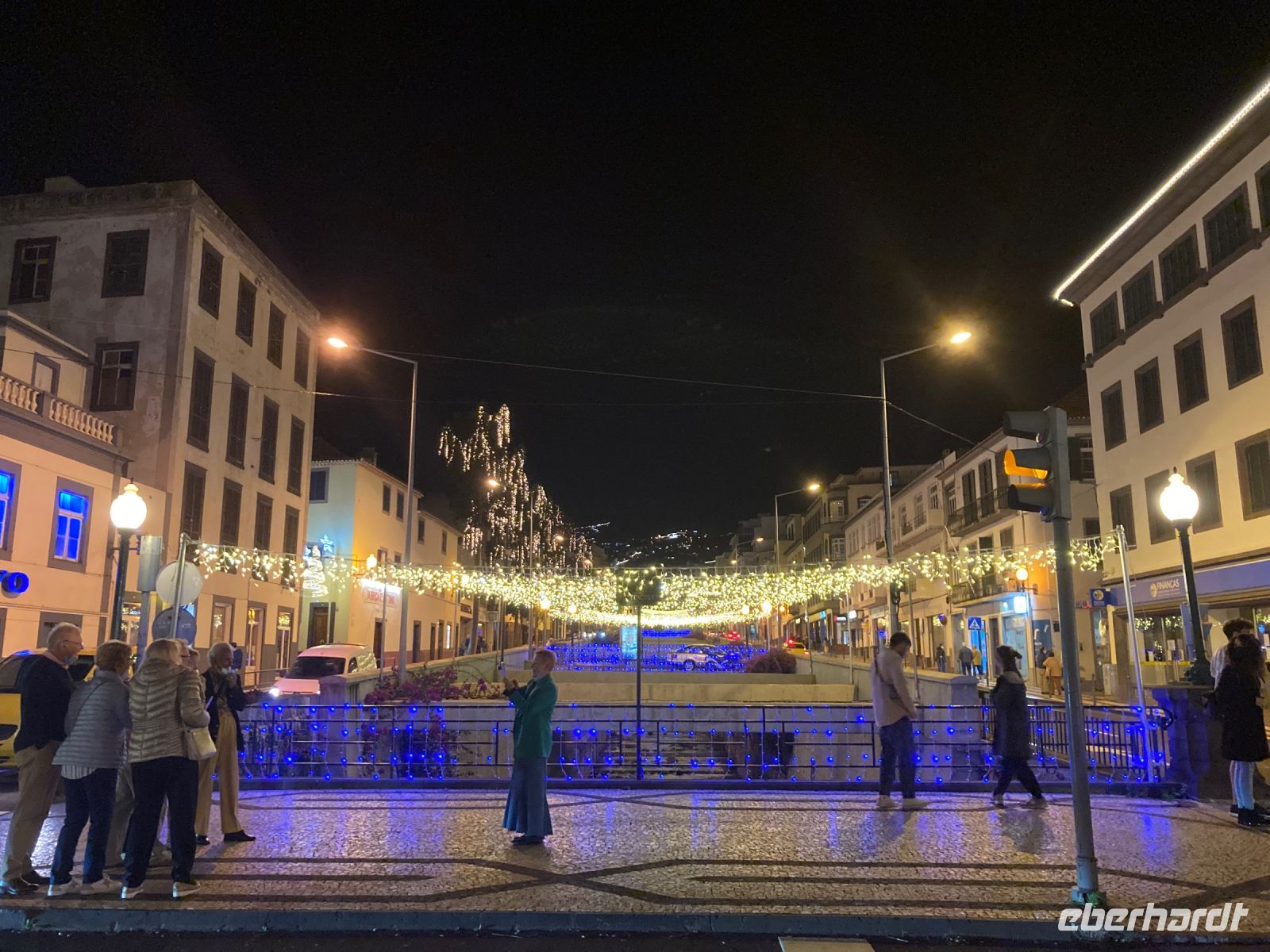 Unser Weg führt uns weiter die Haupteinkaufsstraße hinunter zum Weihnachtsmarkt. Dann schließt sich eine Probe des Madeira-Weines an. Im Gegensatz zu anderen Weinen müssen wir hier bei der Besichtigung nicht darauf hinweisen, dass es kühl sein könnte. Madeira-Wein wird nicht bei Kellertemperatur ausgebaut und gelagert, sondern bei Zimmertemperatur, und diese ist auch im Winter hier über 20 Grad. Weiter geht es in Richtung Camara de Lobos. Noch heute ein wichtiger Fischerort, denn hier wird der Degenfisch aus dem Wasser geholt. Aber auch für das Getränk Madeiras spielt die malerische Gemeinde eine wichtige Rolle, denn von hier stammt der Poncha: eine Mischung aus Rum, Honig und Zitronensaft. Ein Touristenmagnet ist der Ort aber auch wegen eines berühmten Besucher. Winston Churchill hat hier seine künstlerische Ader ausgelebt. Wer möchte kann ihm dabei über die Schulter schauen - natürlich nur seiner Statue. Als Abschluss wagen wir noch einen Blick von der zweithöchsten Steilküste der Welt, dem Cabo Girão. Stolze 580 Meter fällt die Wand ins Meer hinab. Damit wir Höhe auch wirklich ermessen können, hat man ein einen Skywalk errichtet, durch dessen gläsernen Boden wir hinunterblicken können. Wahrlich beeindruckend! Nach einer kurzen Pause im Hotel haben wir heute noch einen weiteren Höhepunkt im Programm: Den Besuch des Nachtmarktes in Funchal. Mit dem Bus geht es in die Hauptstadt, die sich nun in einem wunderbaren Lichtermeer präsentiert. Hatten wir heute schon die Orte bei Tageslicht gesehen, so vermitteln sie uns nun nochmals einen ganzen anderen, geradezu zauberhaften Eindruck. Und spätestens jetzt kommt bei diesem Rundgang wirklich weihnachtliche Stimmung bei uns auf.