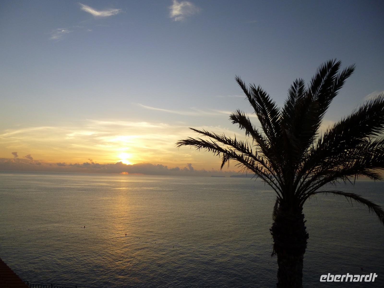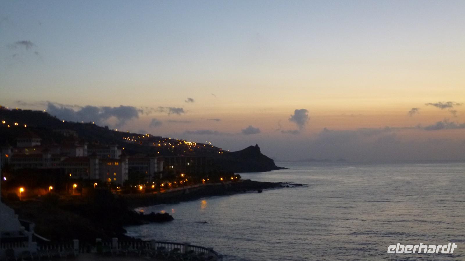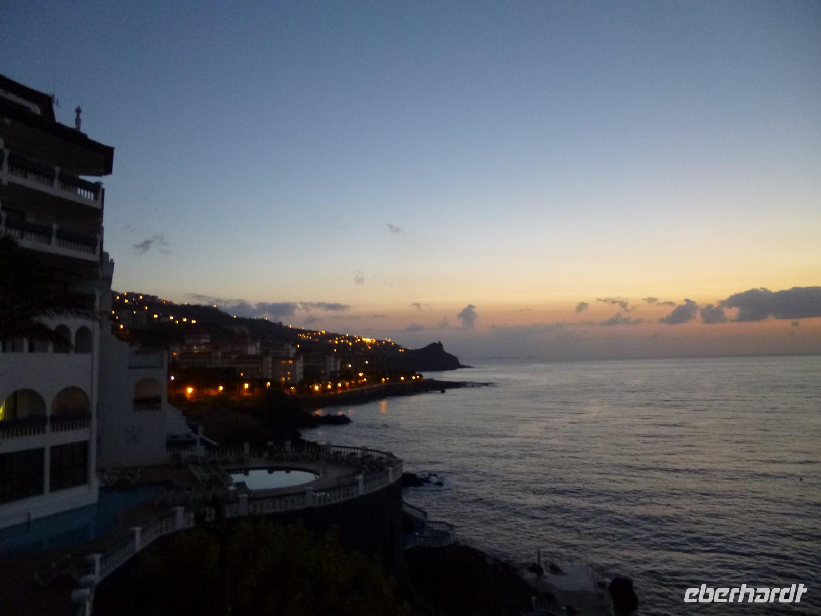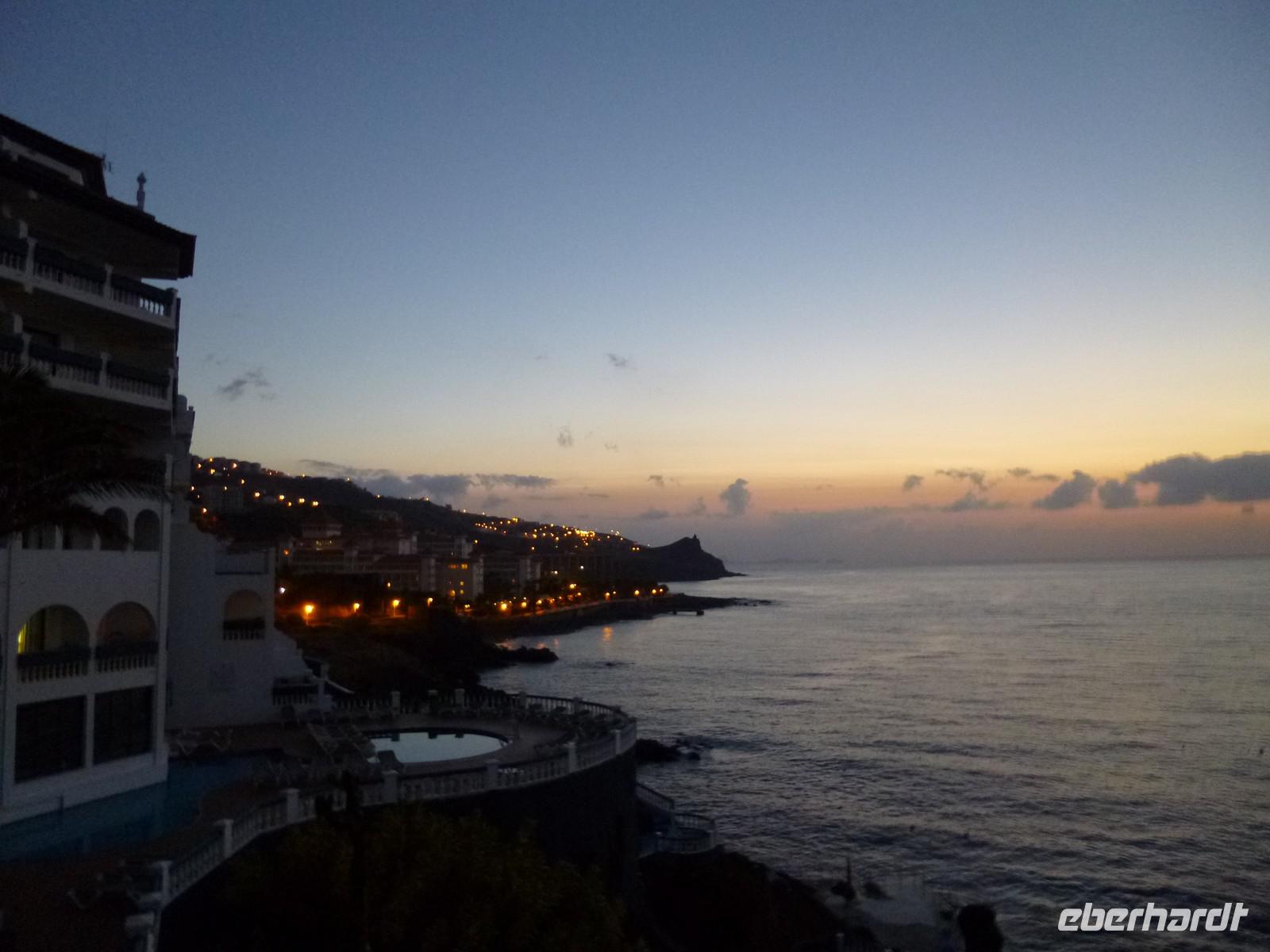Frau Schlosser (Eberhardt Reisebegleiterin der Rundreisegruppe) und ich (Peter Patzelt Reisebegleitung der Wandergruppe) begrüßten unsere Gäste am Flughafen Dresden. Unser Flug startete pünktlich. Nach der geplanten Zwischenlandung auf Lanzarote landeten wir auf dem Flughafen Funchal. Am Ausgang begrüßte uns unser Reiseleiter Sergio Silva. Er erklärte uns, dass die Gäste aus Leipzig schon eher als geplant ankamen und schon am Hotel auf uns warteten. Sergio unterrichtet uns noch über einige landestyptischen Gepflogenheiten, servierte uns einen Madeirawein und den landestypischen Kuchen (Bolo de Mel). Ich stellte mich den Gästen vor und erklärte Ihnen meine Funktion auf der Reise. Nach der Veranstaltung blieb uns noch etwas Zeit, um uns frisch zu machen, danach gingen wir zusammen zum Abendessen. Viele der Gäste probierten den Degenfisch, welcher typisch für Madeira ist. Einige der Gäste entschieden sich, den Abend im Hotel bei Livemusik ausklingen zu lassen.