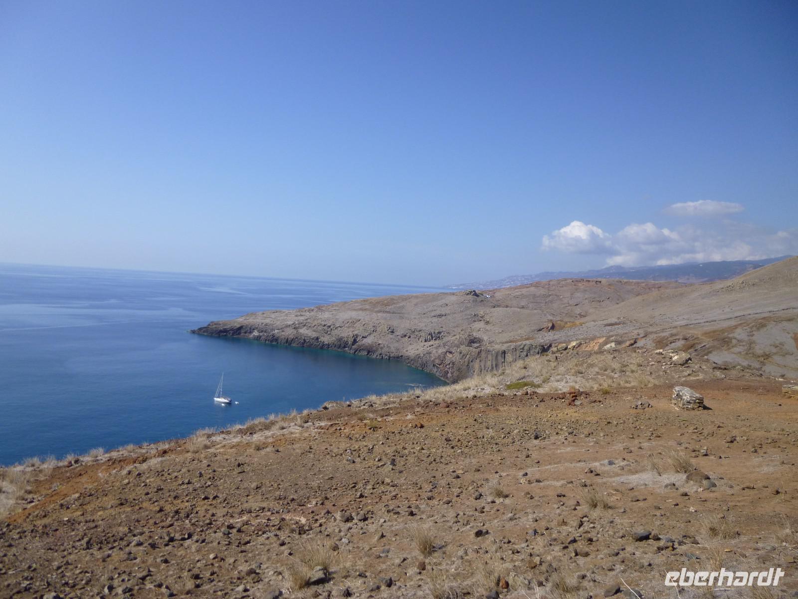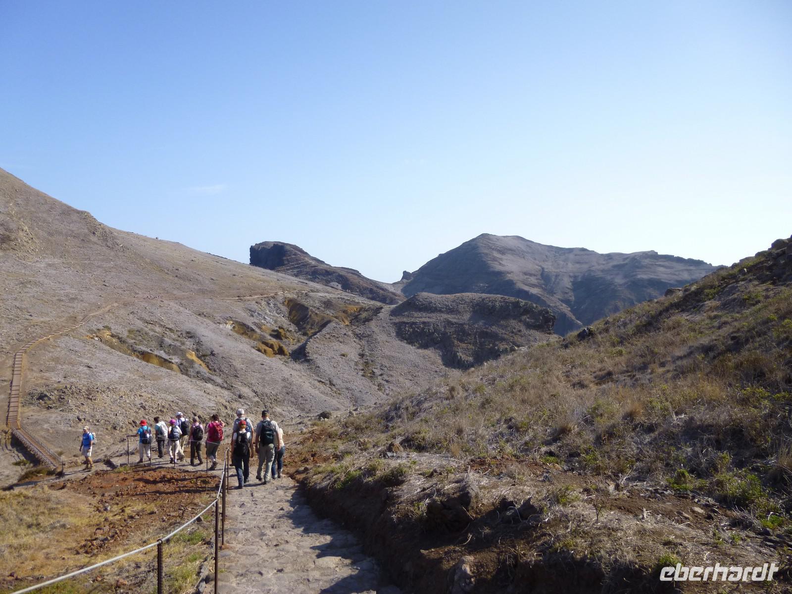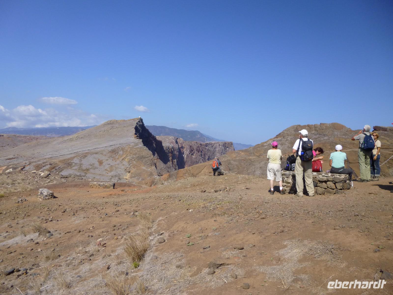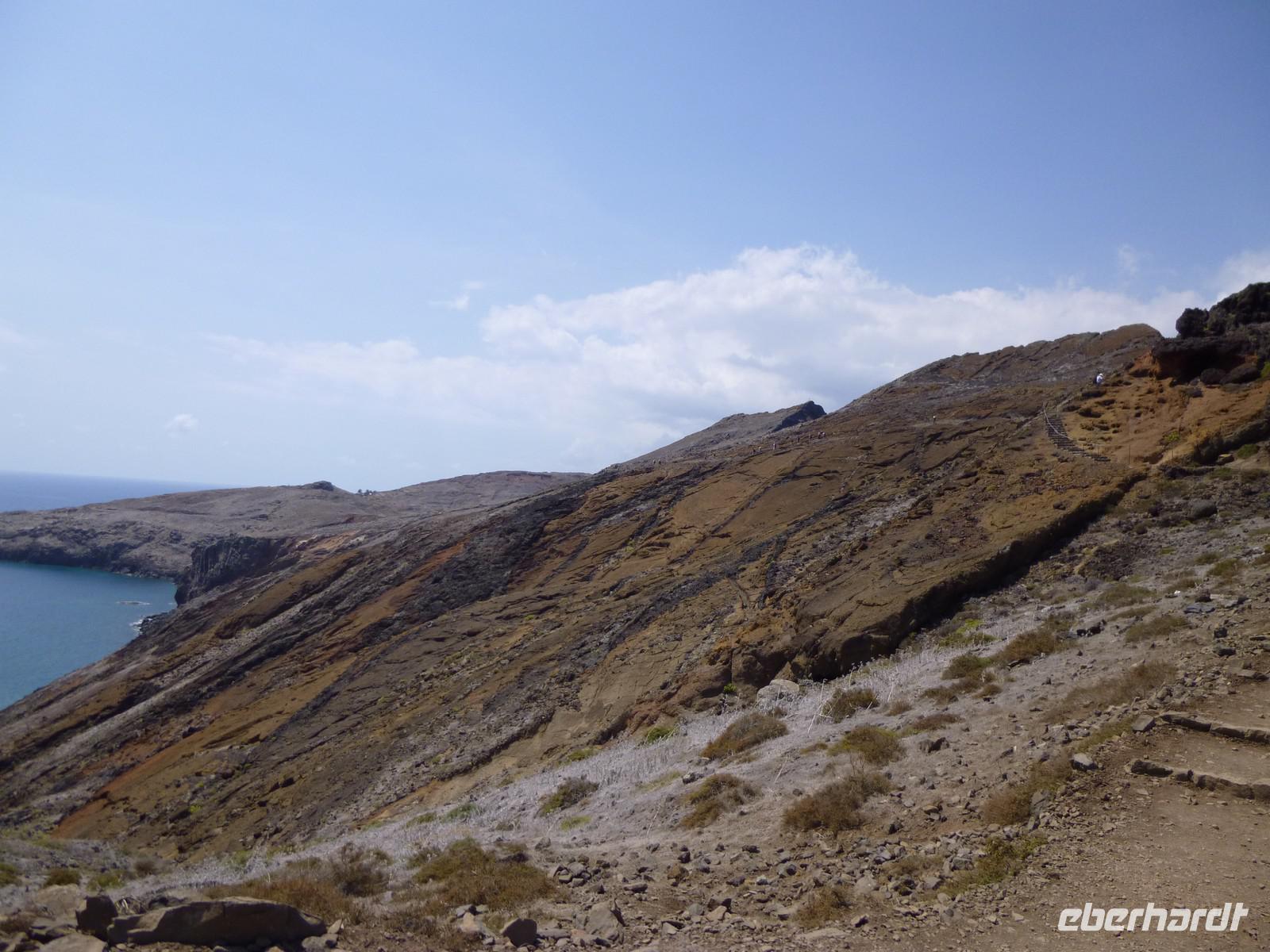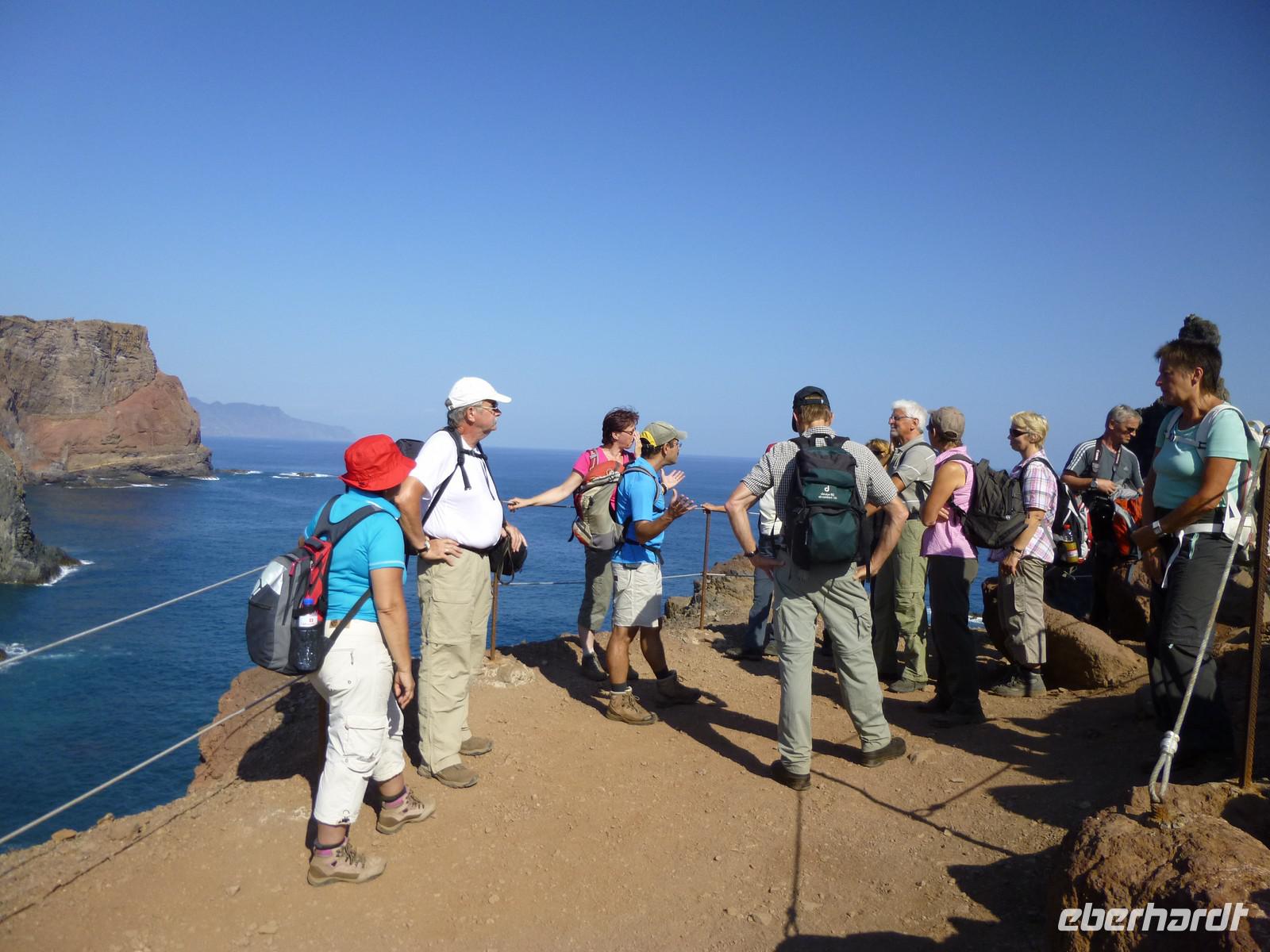 Heute fuhren wir mit Sergio in den Osten der Insel. Nach einem Zwischenstopp im Supermarkt in Santa Cruz begann unsere Wanderung um 10 Uhr. Die Gegend ist im Gegensatz zu den Lavadagebieten karg und trocken, aber genau das machte den Reiz der Halbinsel aus. Auch heute war es sehr heiß, wir legten immer wieder kleine Pausen um etwas zu trinken. Sergio erklärt uns die Gesteinsformationen an den Klippen, was uns gut gefiel. Auch der Blick über die Insel und auf das Meer weckte unser Interesse. An der Casa Sardinha angekommen, entschieden sich einige Gäste mit mir, den Gipfel des Tunnelberges zu ersteigen. Der andere Teil der Gruppe ging mit Sergio an einen kleinen Strandabschnitt. Ein Teil nutzte die Gelegenheit, um sich im Wasser etwas abzukühlen. Der Rückweg führte uns wieder zum Bus, der uns nach Carnisal brachte. Wir besuchten alle in das Cafe Amarelo und erholten uns bei einem Getränk von den Strapazen. Nach einiger Freizeit im Ort fuhren wir zurück zum Hotel.