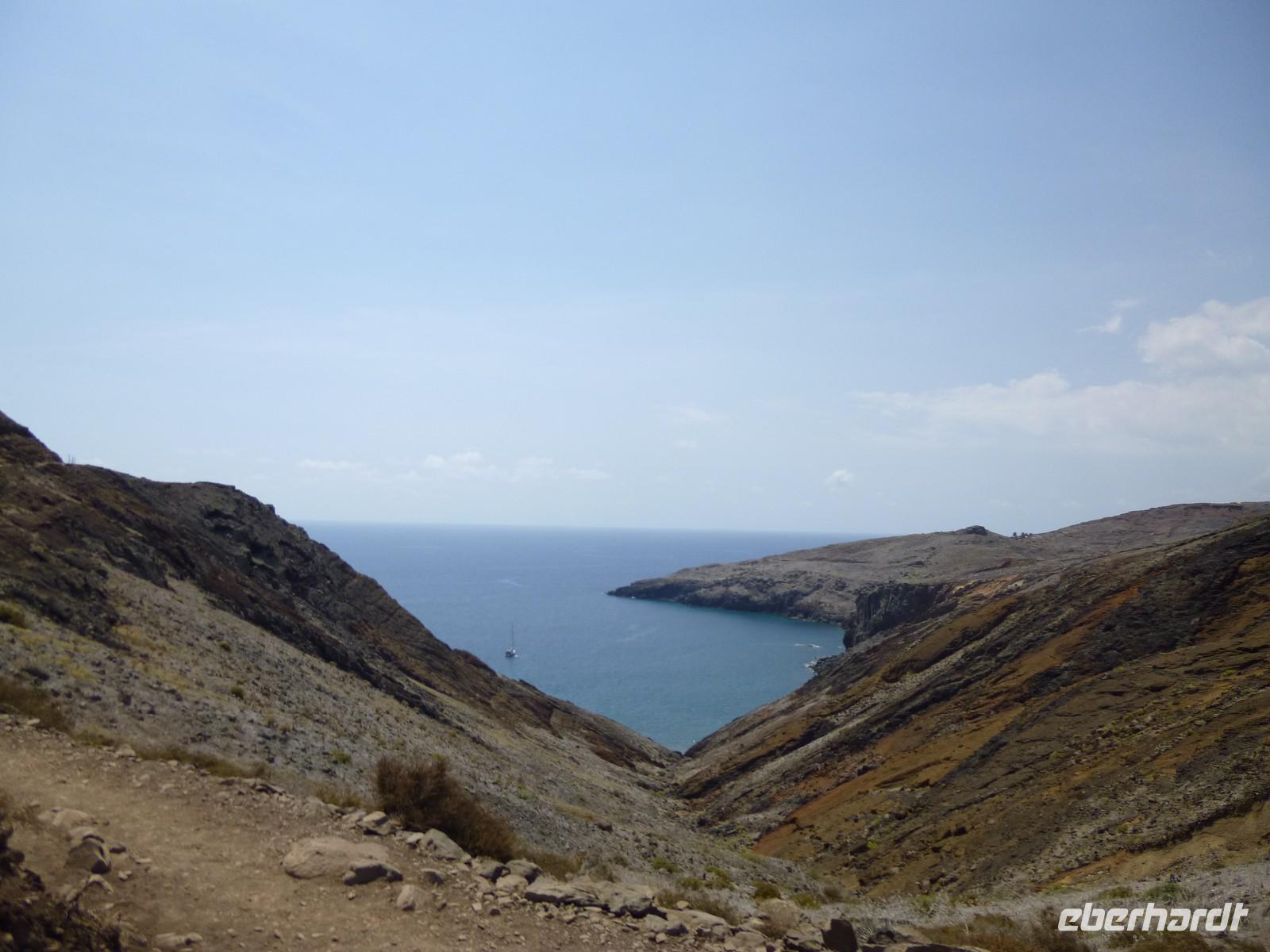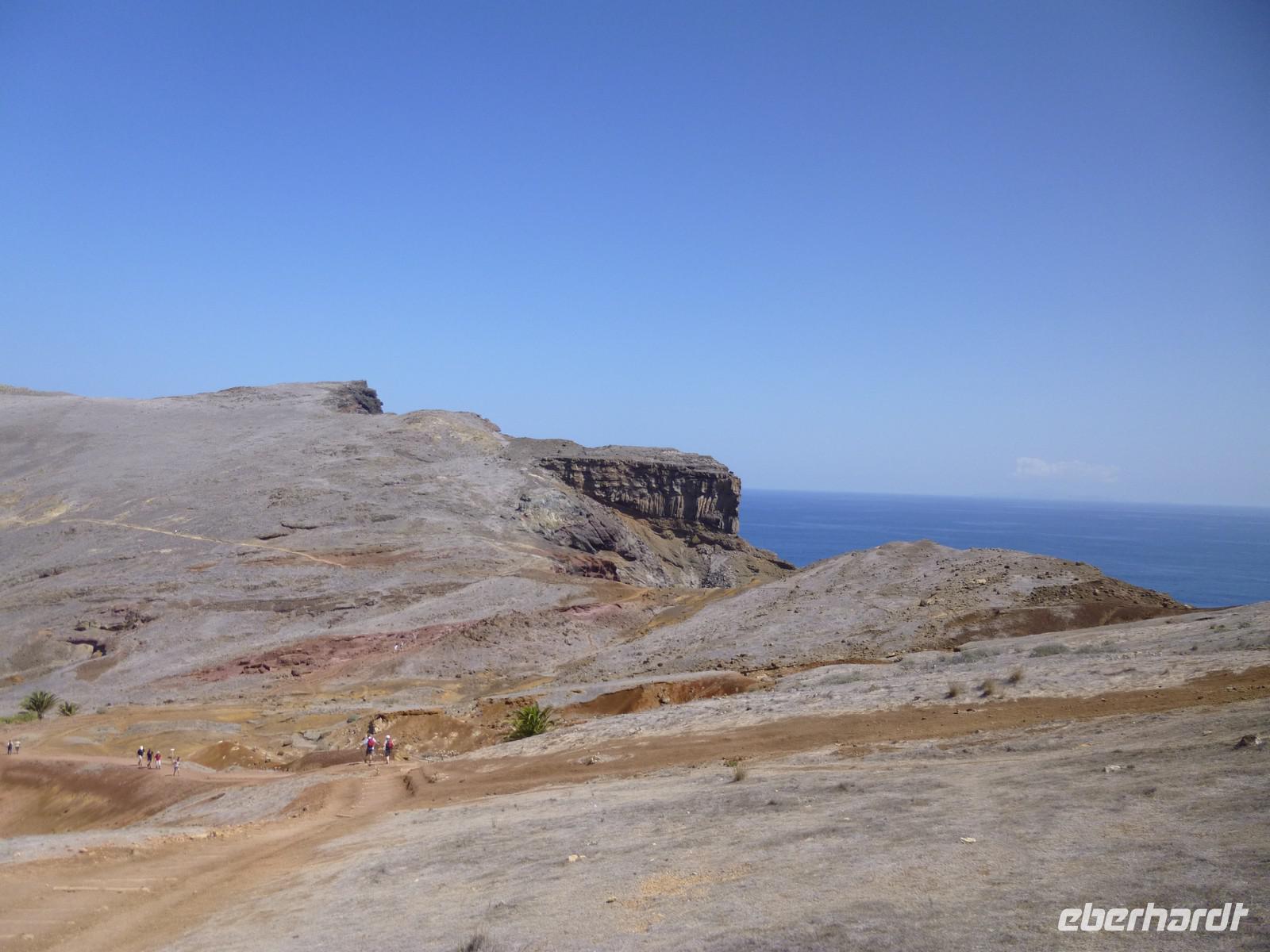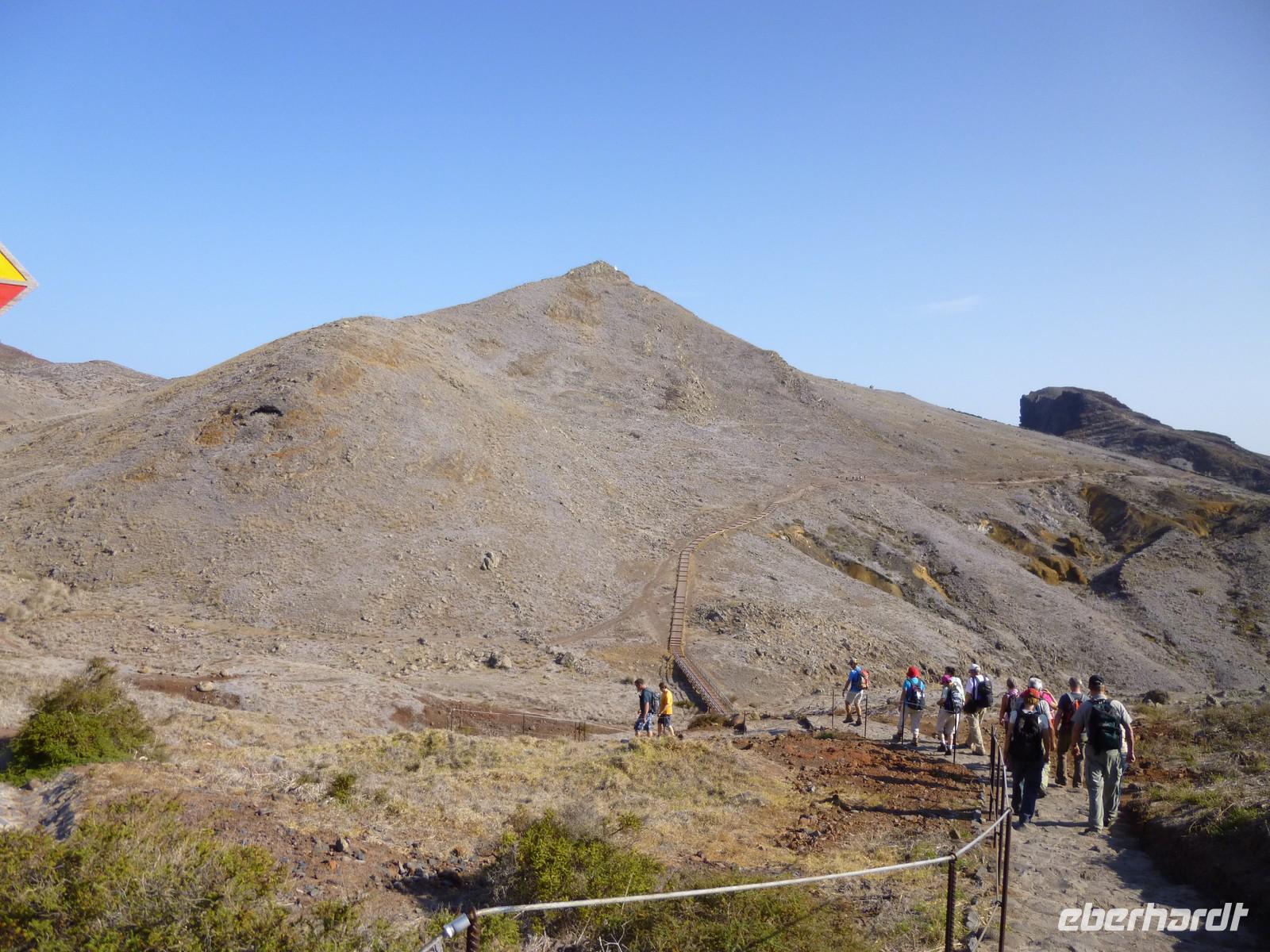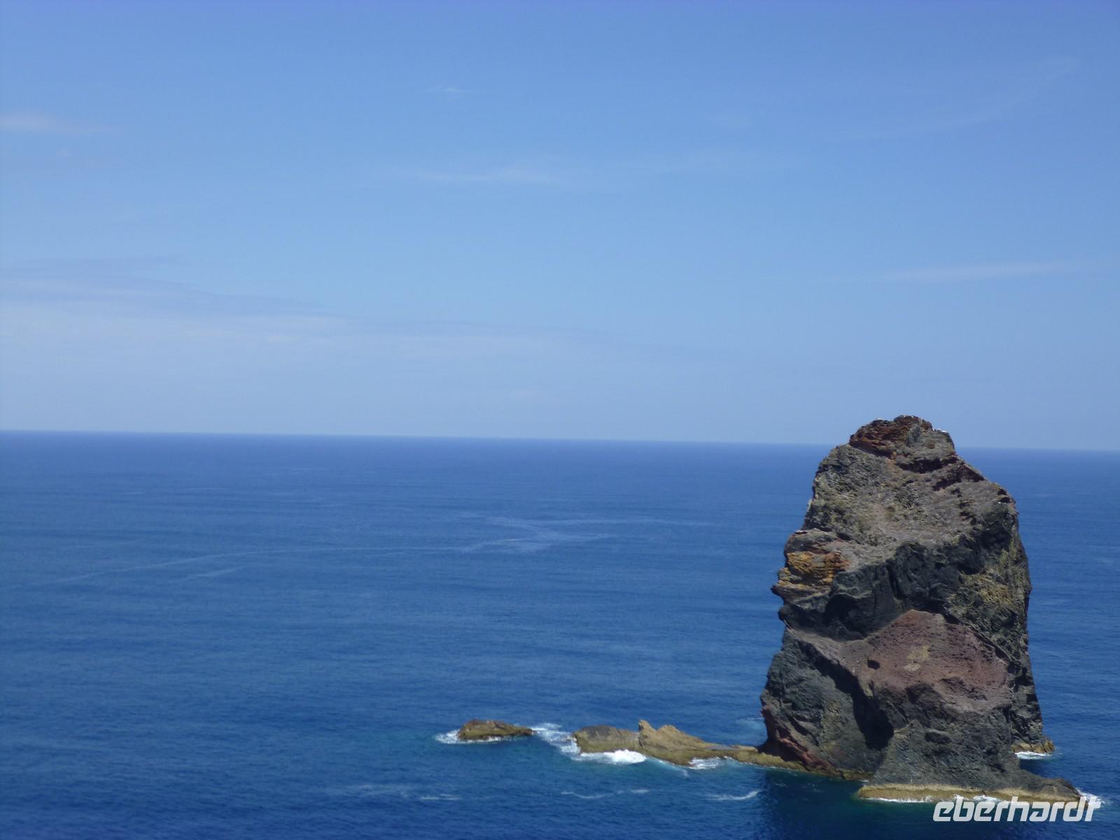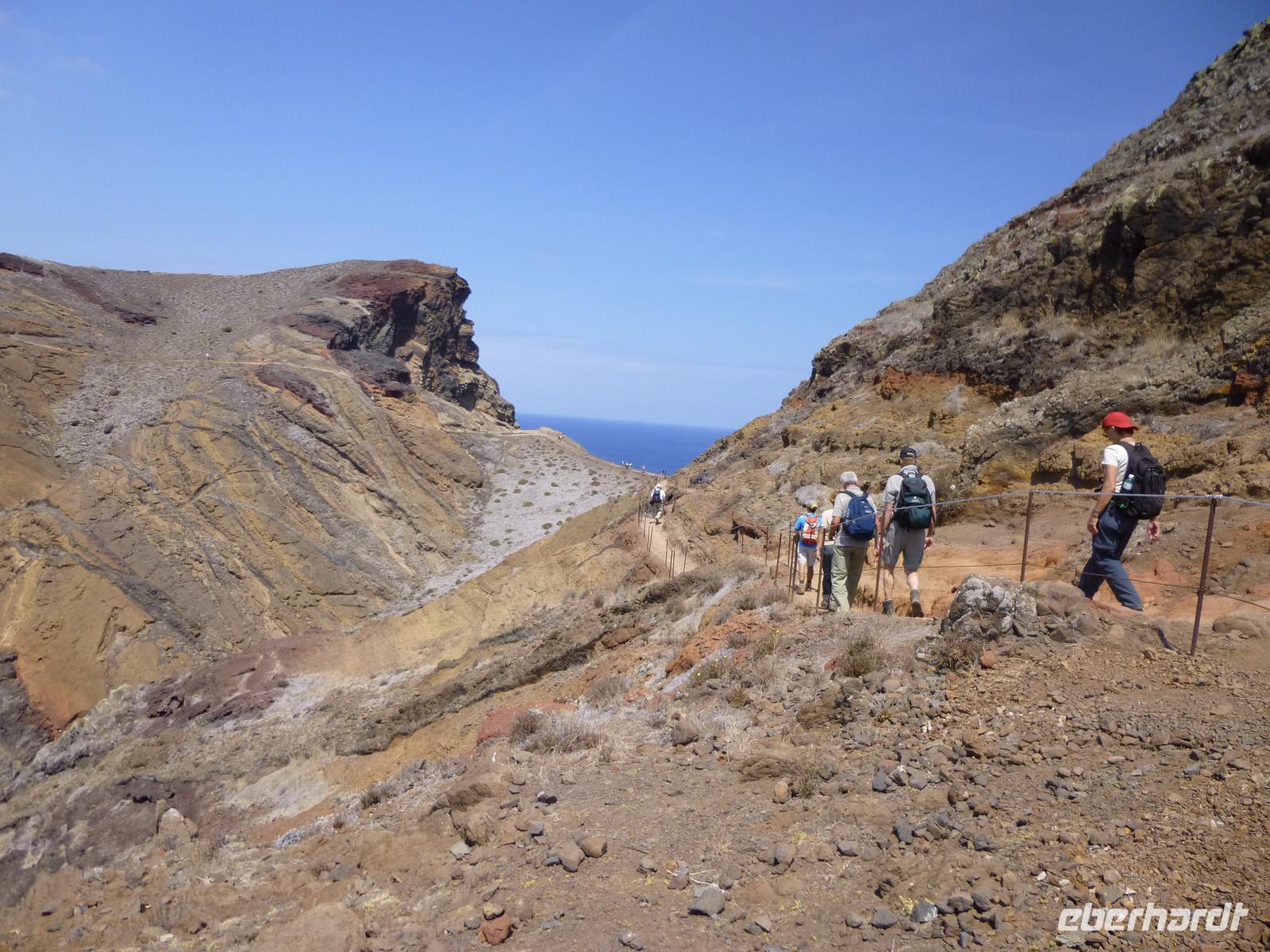 Heute fuhren wir mit Sergio in den Osten der Insel. Nach einem Zwischenstopp im Supermarkt in Santa Cruz begann unsere Wanderung um 10 Uhr. Die Gegend ist im Gegensatz zu den Lavadagebieten karg und trocken, aber genau das machte den Reiz der Halbinsel aus. Auch heute war es sehr heiß, wir legten immer wieder kleine Pausen um etwas zu trinken. Sergio erklärt uns die Gesteinsformationen an den Klippen, was uns gut gefiel. Auch der Blick über die Insel und auf das Meer weckte unser Interesse. An der Casa Sardinha angekommen, entschieden sich einige Gäste mit mir, den Gipfel des Tunnelberges zu ersteigen. Der andere Teil der Gruppe ging mit Sergio an einen kleinen Strandabschnitt. Ein Teil nutzte die Gelegenheit, um sich im Wasser etwas abzukühlen. Der Rückweg führte uns wieder zum Bus, der uns nach Carnisal brachte. Wir besuchten alle in das Cafe Amarelo und erholten uns bei einem Getränk von den Strapazen. Nach einiger Freizeit im Ort fuhren wir zurück zum Hotel.