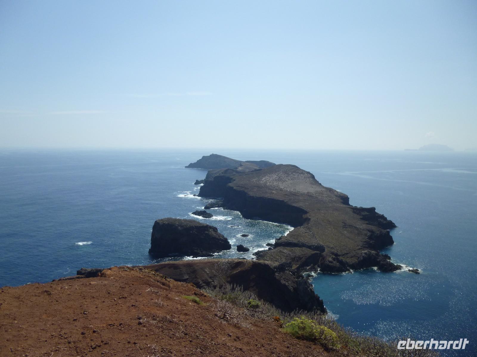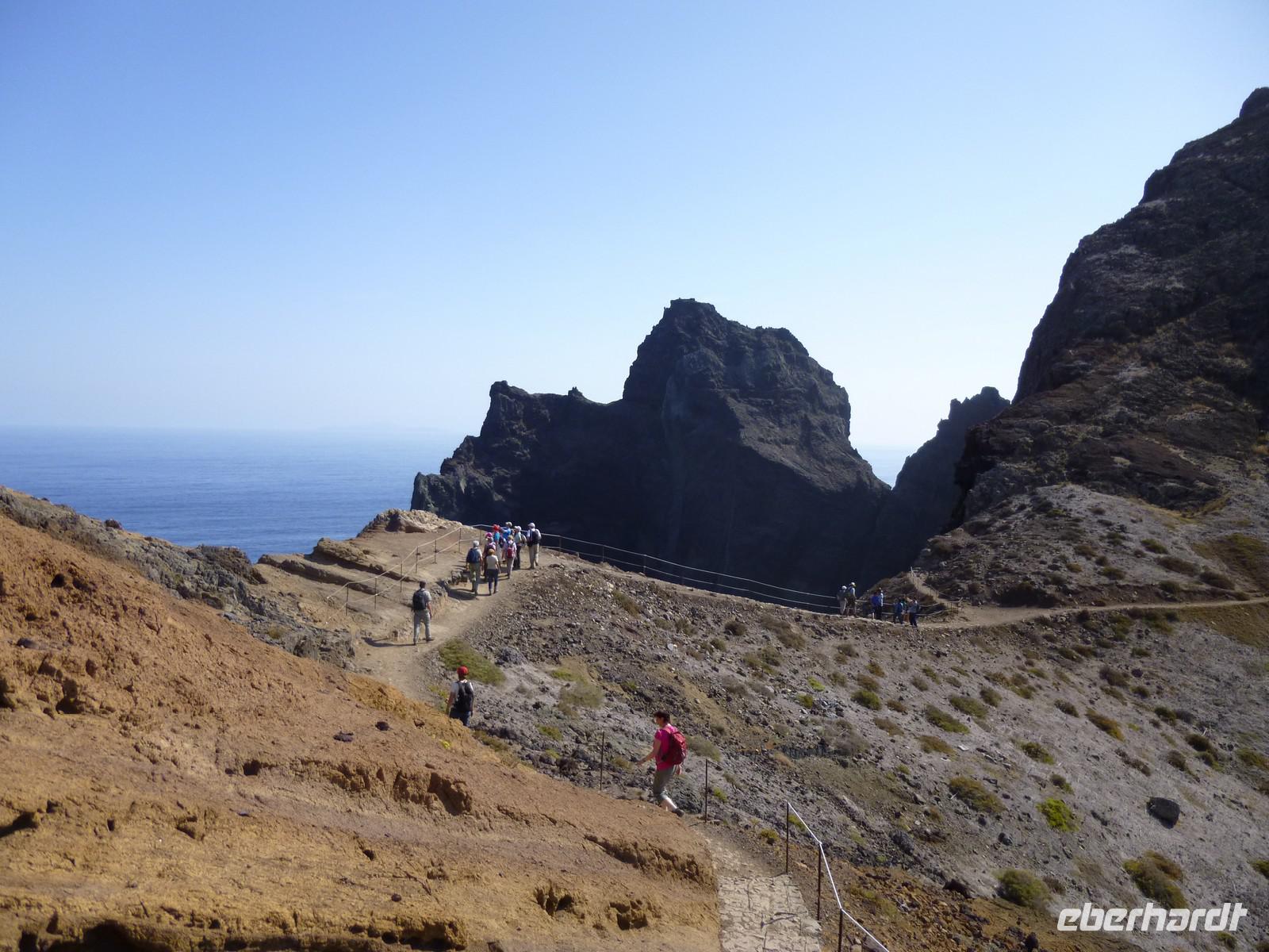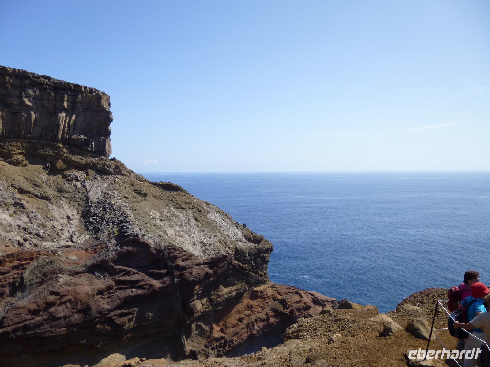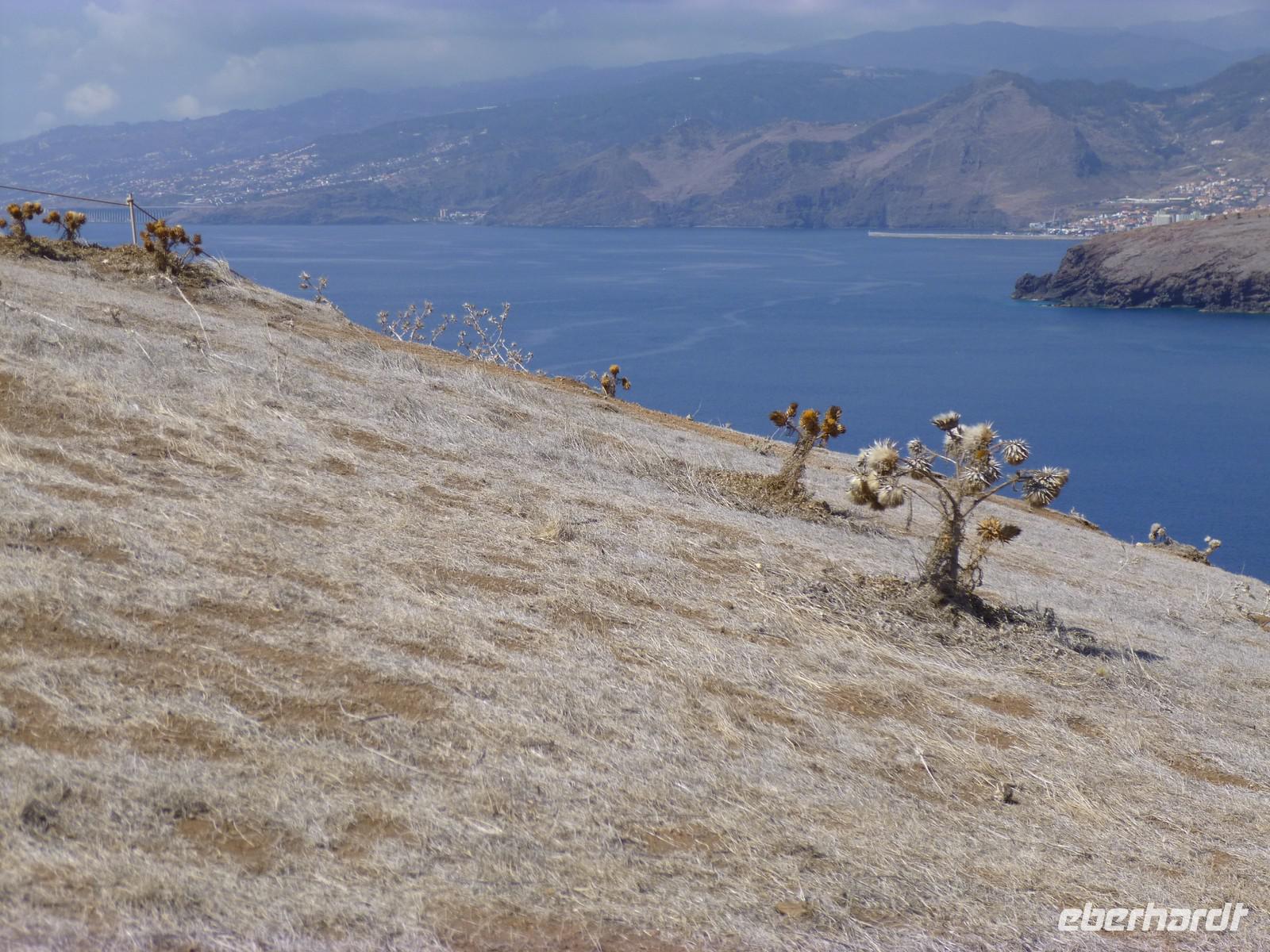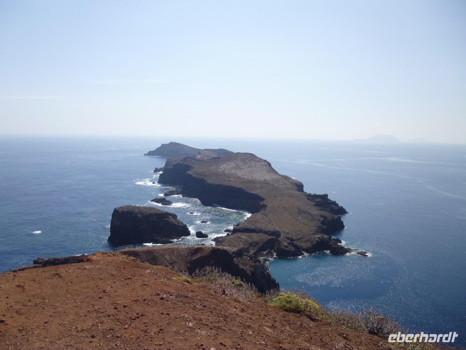 Heute fuhren wir mit Sergio in den Osten der Insel. Nach einem Zwischenstopp im Supermarkt in Santa Cruz begann unsere Wanderung um 10 Uhr. Die Gegend ist im Gegensatz zu den Lavadagebieten karg und trocken, aber genau das machte den Reiz der Halbinsel aus. Auch heute war es sehr heiß, wir legten immer wieder kleine Pausen um etwas zu trinken. Sergio erklärt uns die Gesteinsformationen an den Klippen, was uns gut gefiel. Auch der Blick über die Insel und auf das Meer weckte unser Interesse. An der Casa Sardinha angekommen, entschieden sich einige Gäste mit mir, den Gipfel des Tunnelberges zu ersteigen. Der andere Teil der Gruppe ging mit Sergio an einen kleinen Strandabschnitt. Ein Teil nutzte die Gelegenheit, um sich im Wasser etwas abzukühlen. Der Rückweg führte uns wieder zum Bus, der uns nach Carnisal brachte. Wir besuchten alle in das Cafe Amarelo und erholten uns bei einem Getränk von den Strapazen. Nach einiger Freizeit im Ort fuhren wir zurück zum Hotel.
