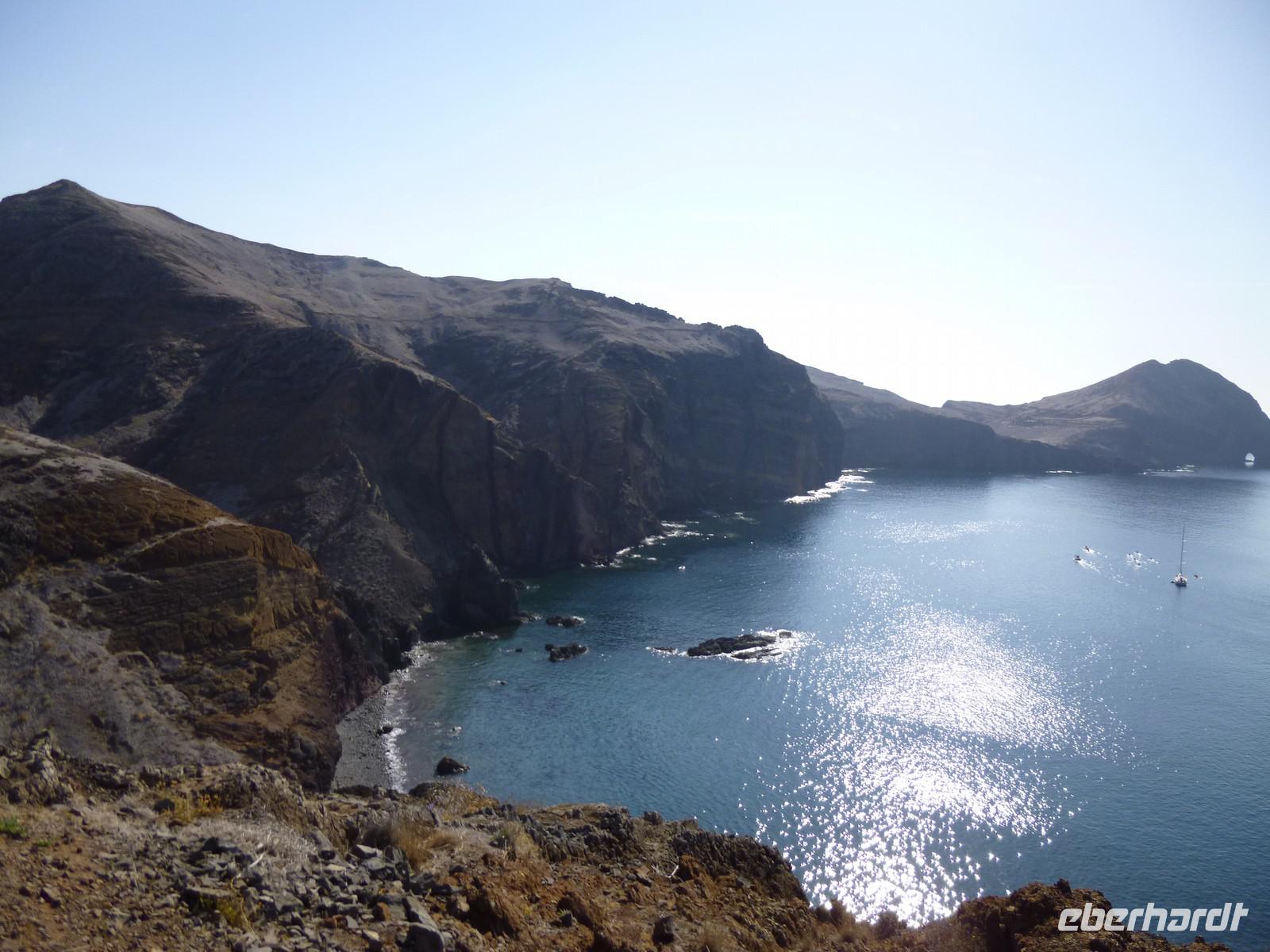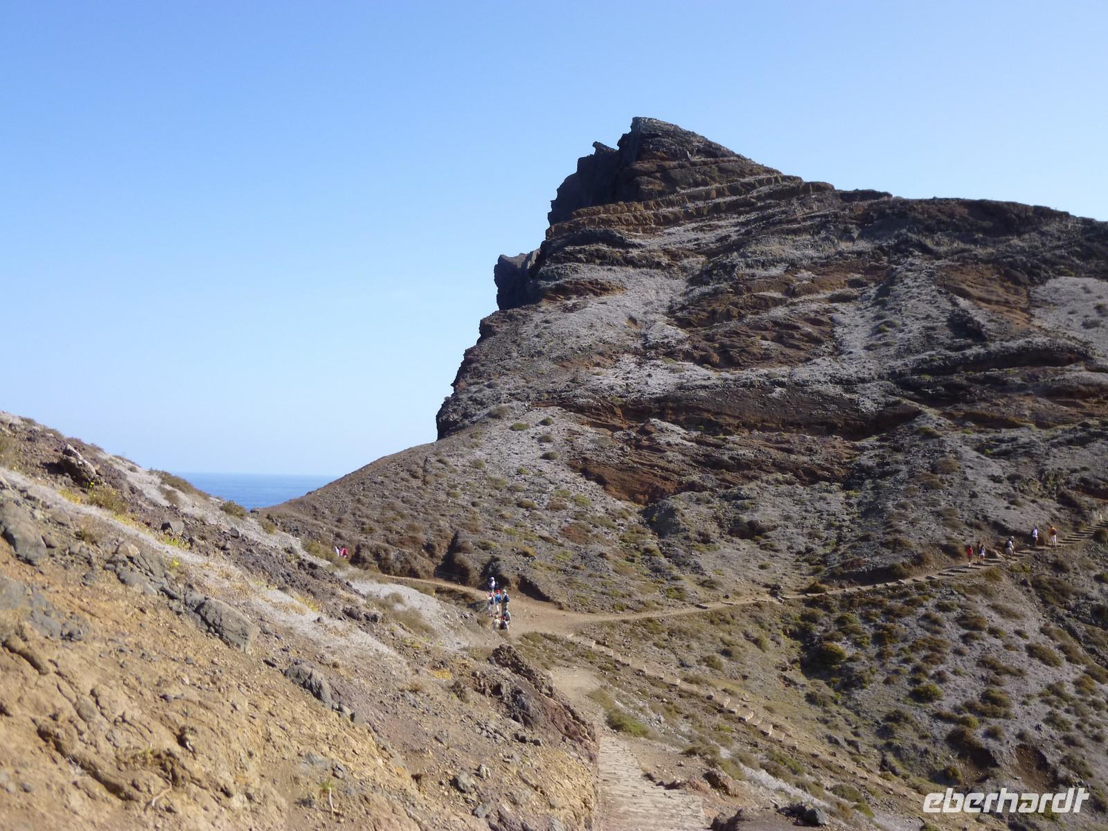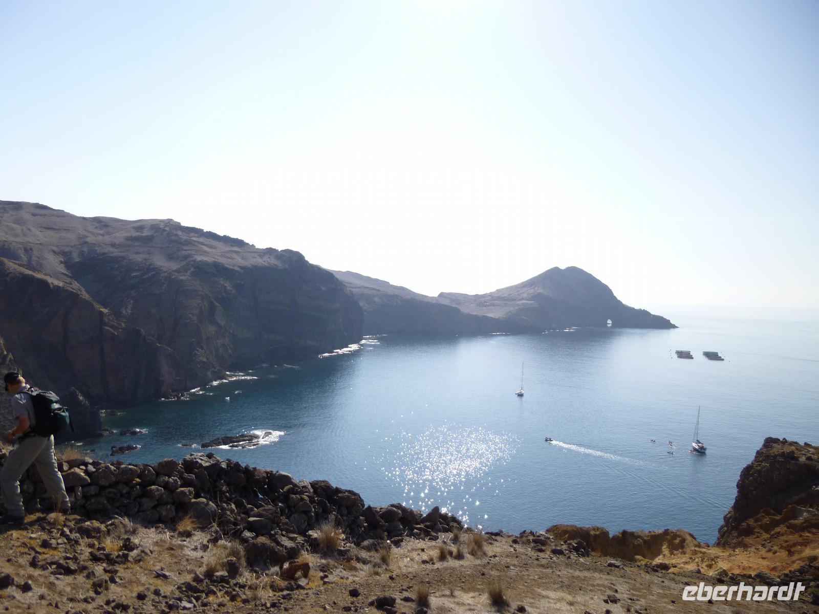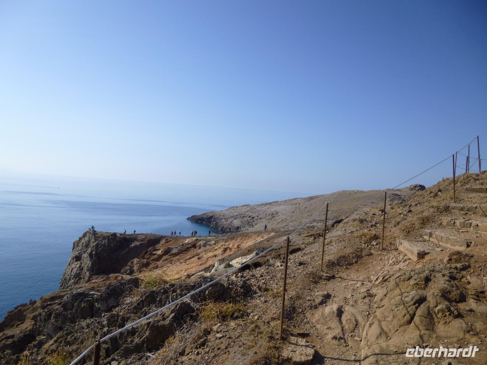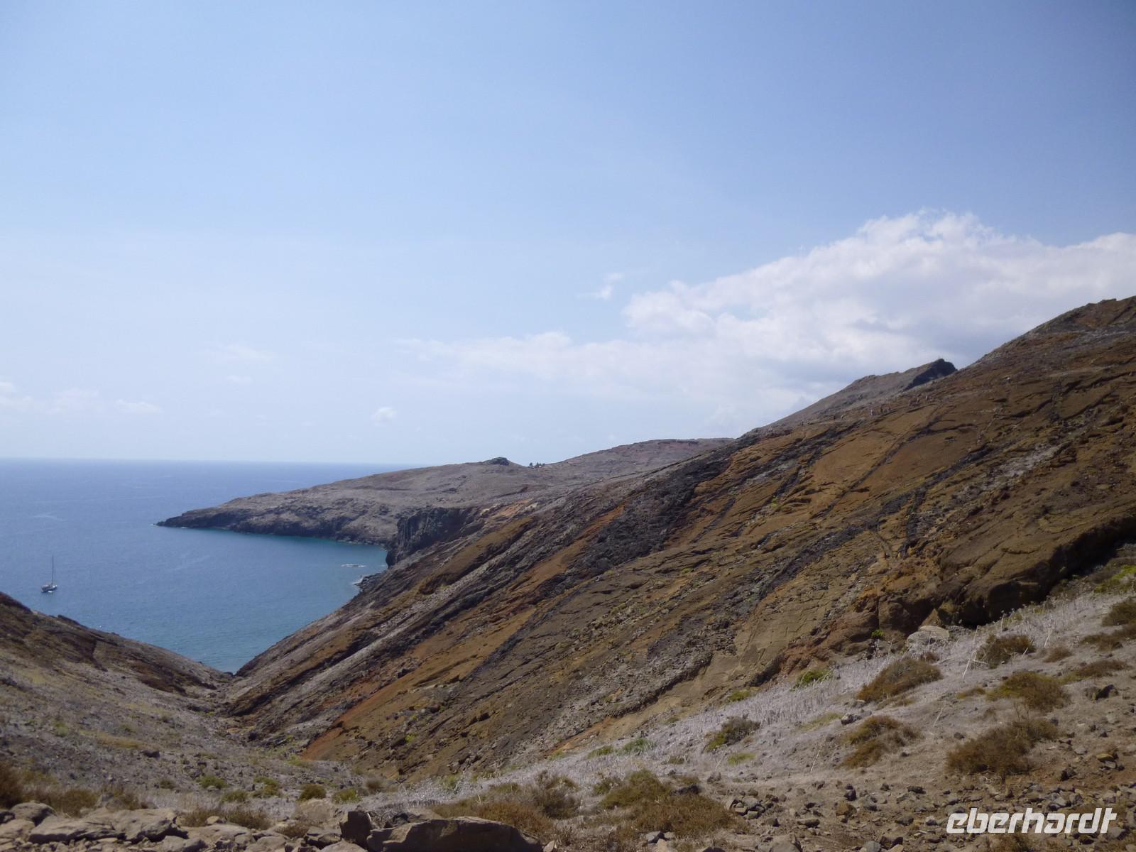 Heute fuhren wir mit Sergio in den Osten der Insel. Nach einem Zwischenstopp im Supermarkt in Santa Cruz begann unsere Wanderung um 10 Uhr. Die Gegend ist im Gegensatz zu den Lavadagebieten karg und trocken, aber genau das machte den Reiz der Halbinsel aus. Auch heute war es sehr heiß, wir legten immer wieder kleine Pausen um etwas zu trinken. Sergio erklärt uns die Gesteinsformationen an den Klippen, was uns gut gefiel. Auch der Blick über die Insel und auf das Meer weckte unser Interesse. An der Casa Sardinha angekommen, entschieden sich einige Gäste mit mir, den Gipfel des Tunnelberges zu ersteigen. Der andere Teil der Gruppe ging mit Sergio an einen kleinen Strandabschnitt. Ein Teil nutzte die Gelegenheit, um sich im Wasser etwas abzukühlen. Der Rückweg führte uns wieder zum Bus, der uns nach Carnisal brachte. Wir besuchten alle in das Cafe Amarelo und erholten uns bei einem Getränk von den Strapazen. Nach einiger Freizeit im Ort fuhren wir zurück zum Hotel.