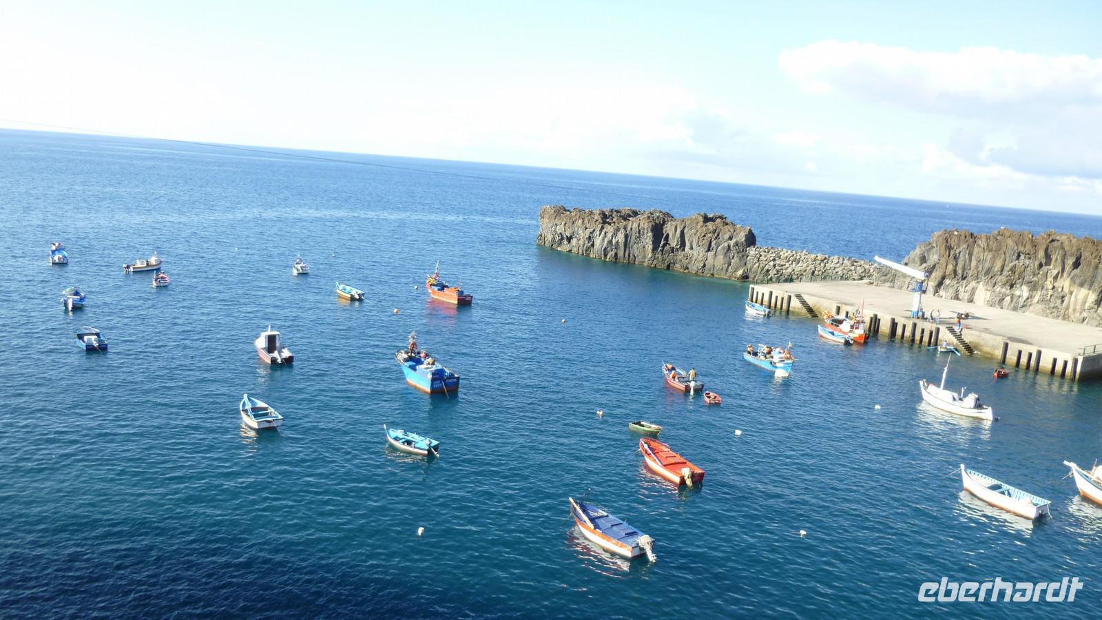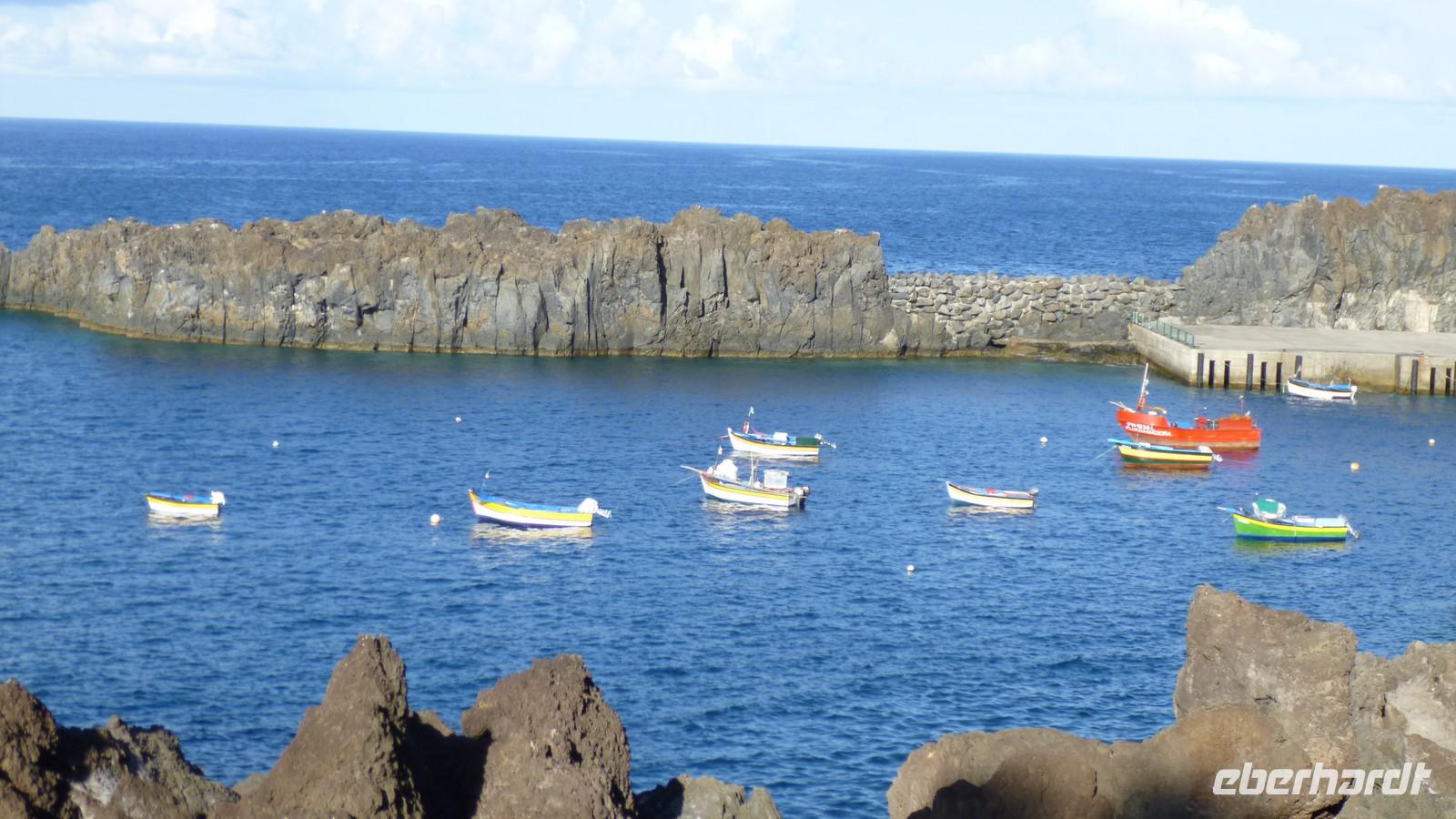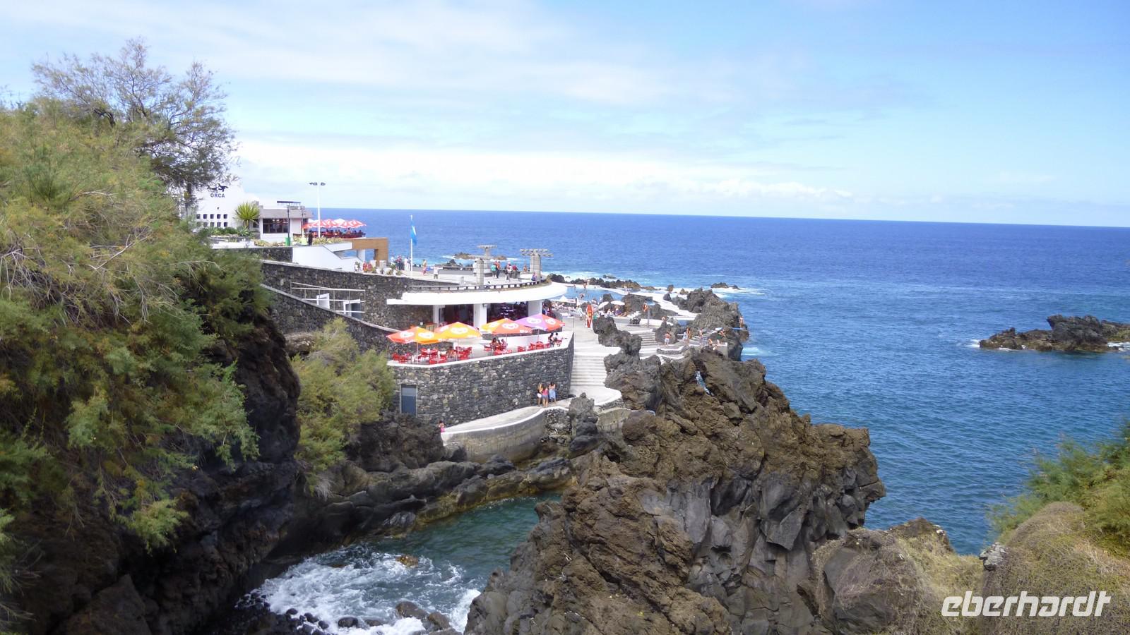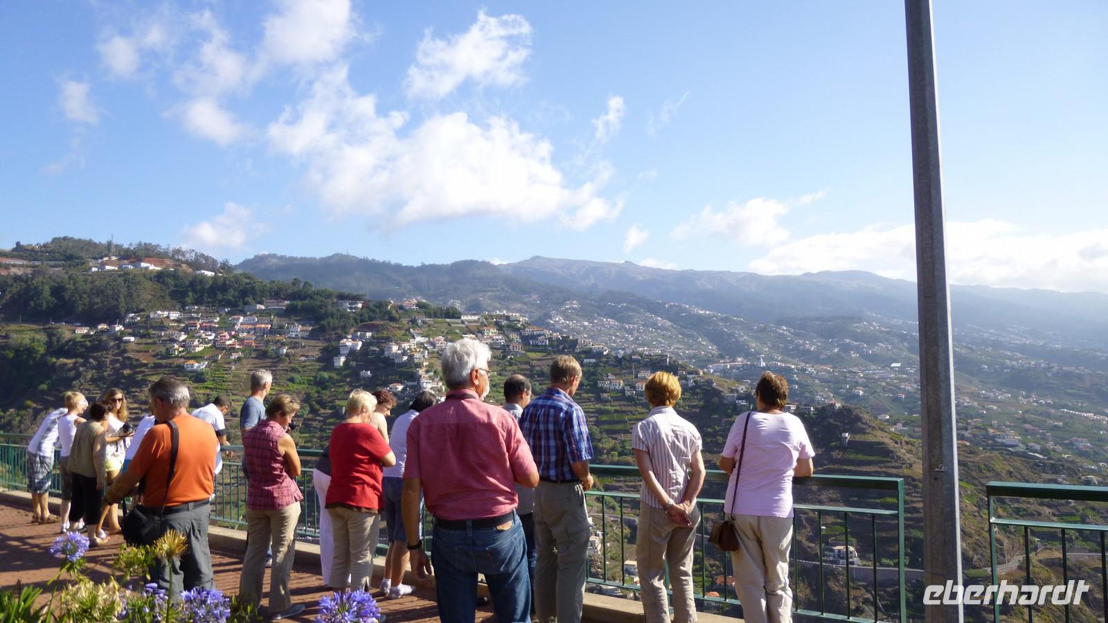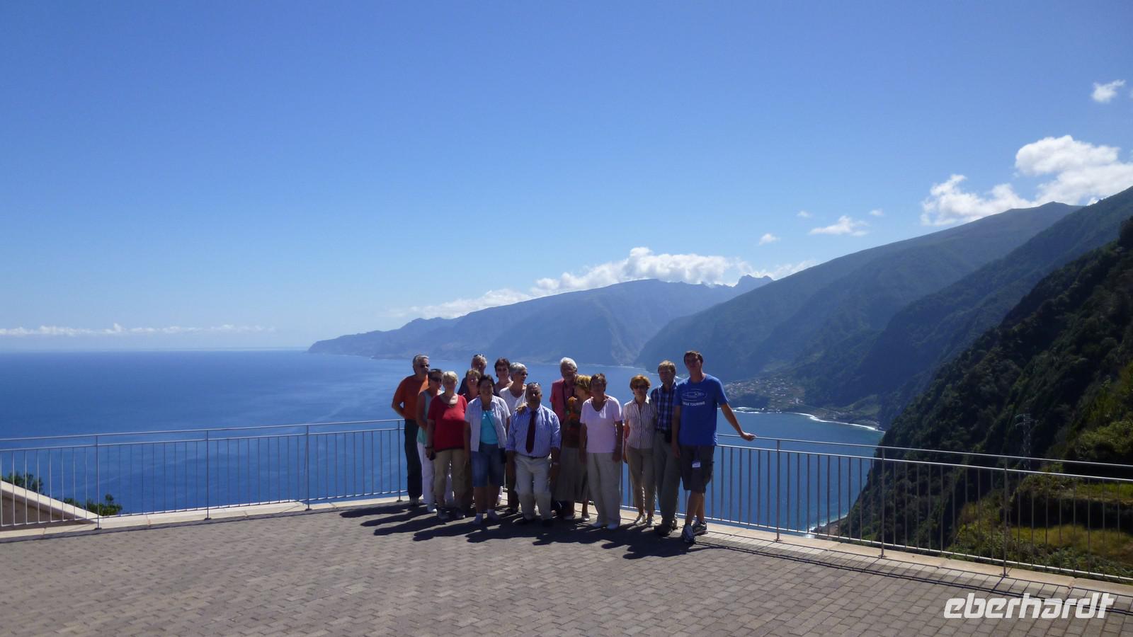 Der letzte Ausflug der Reise war die Nord-Westrundfaht. Von unserem Hotel aus starteten wir nach Camera de Lobos und besichtigten den Hafen und die umliegenden Gassen. Ein örtlicher Barbesitzer zeigte uns wie ein Ponca zubereitet wird und Sergio erklärte uns den Vorgang. Unser nächster größerer Stopp war in Riberia Brava. Hier hatten wir Gelegenheit in den unzähligen Geschäften zu bummeln oder ein zweites Frühstück einzunehmen. Über die Hochebene Paul de Serra ging es weiter in den Norden der Insel. Wir legten auch hier noch einen Fotostopp ein, da uns Sergio ein paar uralte Lorbeerbäume zeigen wollte. In Porto Moniz verbrachten wir unsere Mittagspause. Im Anschluss blieb noch Zeit sich im Natruschwimmbecken etwas abzukühlen. Auf unserer Tour kamen wir noch an einen Wasserfall und einigen Aussichtspunkten vorbei. Ich hatte noch einen Madeirawein besorgt, um mit den Gästen auf die schöne Reise anzustoßen. Der letzte Stopp galt einer Poncabar, die auf Madeira sehr bekannt und beliebt ist. In dieser Bar waren alle Wände mit Visitenkarten "tapeziert". Ich ließ die Gäste auf einer Eberhardt Tischkarte unterschreiben und hing diese auch mit an die Wand, so hinterließen wir unsere Spuren. Die Gruppe genoss den Ausflug bei gutem Wetter, so dass viele, viele Fotos gemacht wurden, die den Tag festhielten. Am Abend trafen wir uns alle wieder um essen zu gehen.
