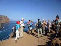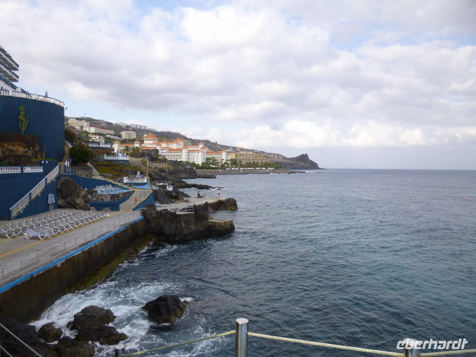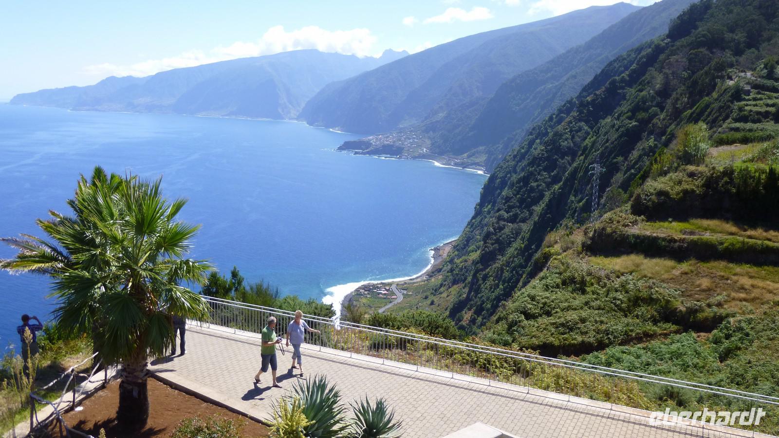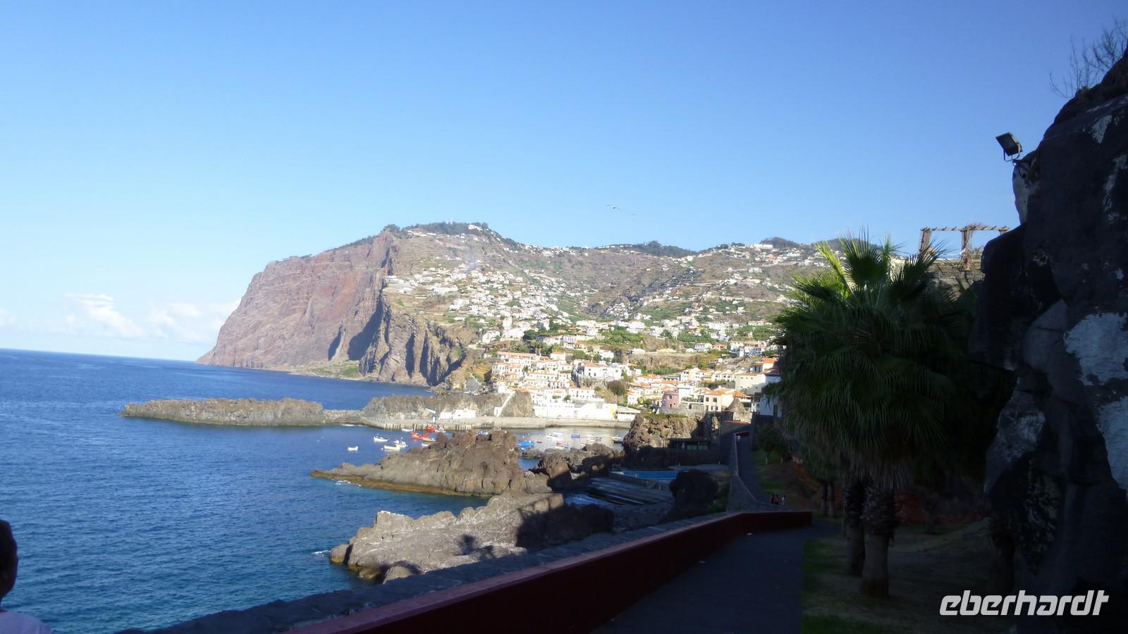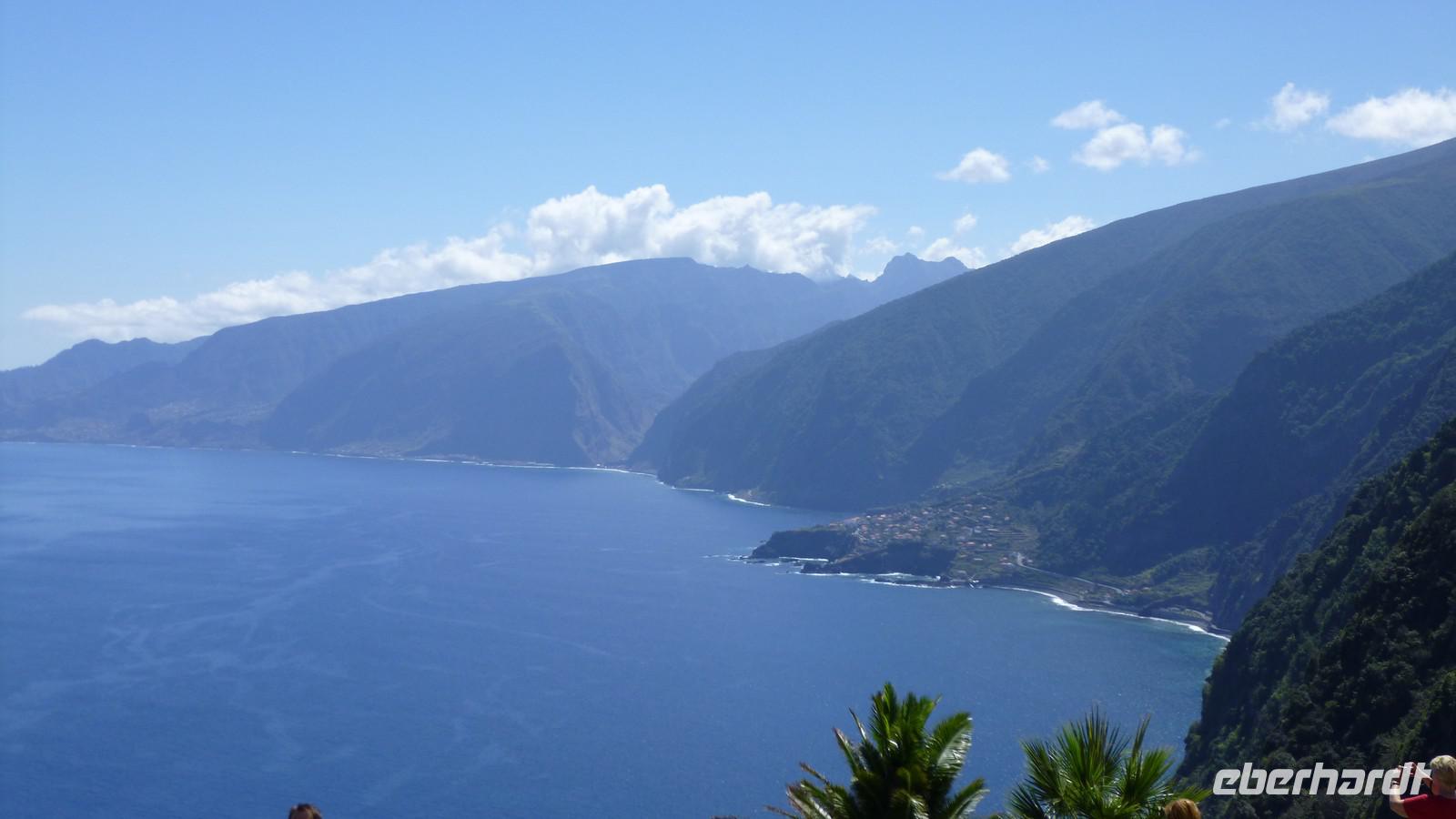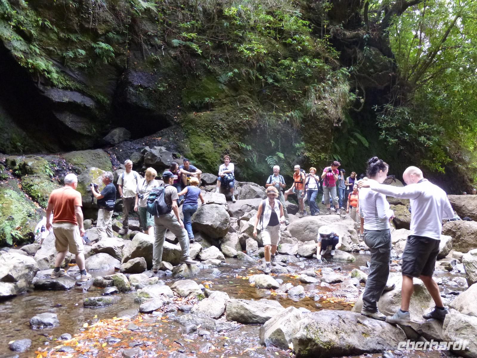 Der letzte Ausflug der Reise war die Nord-Westrundfaht. Von unserem Hotel aus starteten wir nach Camera de Lobos und besichtigten den Hafen und die umliegenden Gassen. Ein örtlicher Barbesitzer zeigte uns wie ein Ponca zubereitet wird und Sergio erklärte uns den Vorgang. Unser nächster größerer Stopp war in Riberia Brava. Hier hatten wir Gelegenheit in den unzähligen Geschäften zu bummeln oder ein zweites Frühstück einzunehmen. Über die Hochebene Paul de Serra ging es weiter in den Norden der Insel. Wir legten auch hier noch einen Fotostopp ein, da uns Sergio ein paar uralte Lorbeerbäume zeigen wollte. In Porto Moniz verbrachten wir unsere Mittagspause. Im Anschluss blieb noch Zeit sich im Natruschwimmbecken etwas abzukühlen. Auf unserer Tour kamen wir noch an einen Wasserfall und einigen Aussichtspunkten vorbei. Ich hatte noch einen Madeirawein besorgt, um mit den Gästen auf die schöne Reise anzustoßen. Der letzte Stopp galt einer Poncabar, die auf Madeira sehr bekannt und beliebt ist. In dieser Bar waren alle Wände mit Visitenkarten "tapeziert". Ich ließ die Gäste auf einer Eberhardt Tischkarte unterschreiben und hing diese auch mit an die Wand, so hinterließen wir unsere Spuren. Die Gruppe genoss den Ausflug bei gutem Wetter, so dass viele, viele Fotos gemacht wurden, die den Tag festhielten. Am Abend trafen wir uns alle wieder um essen zu gehen.