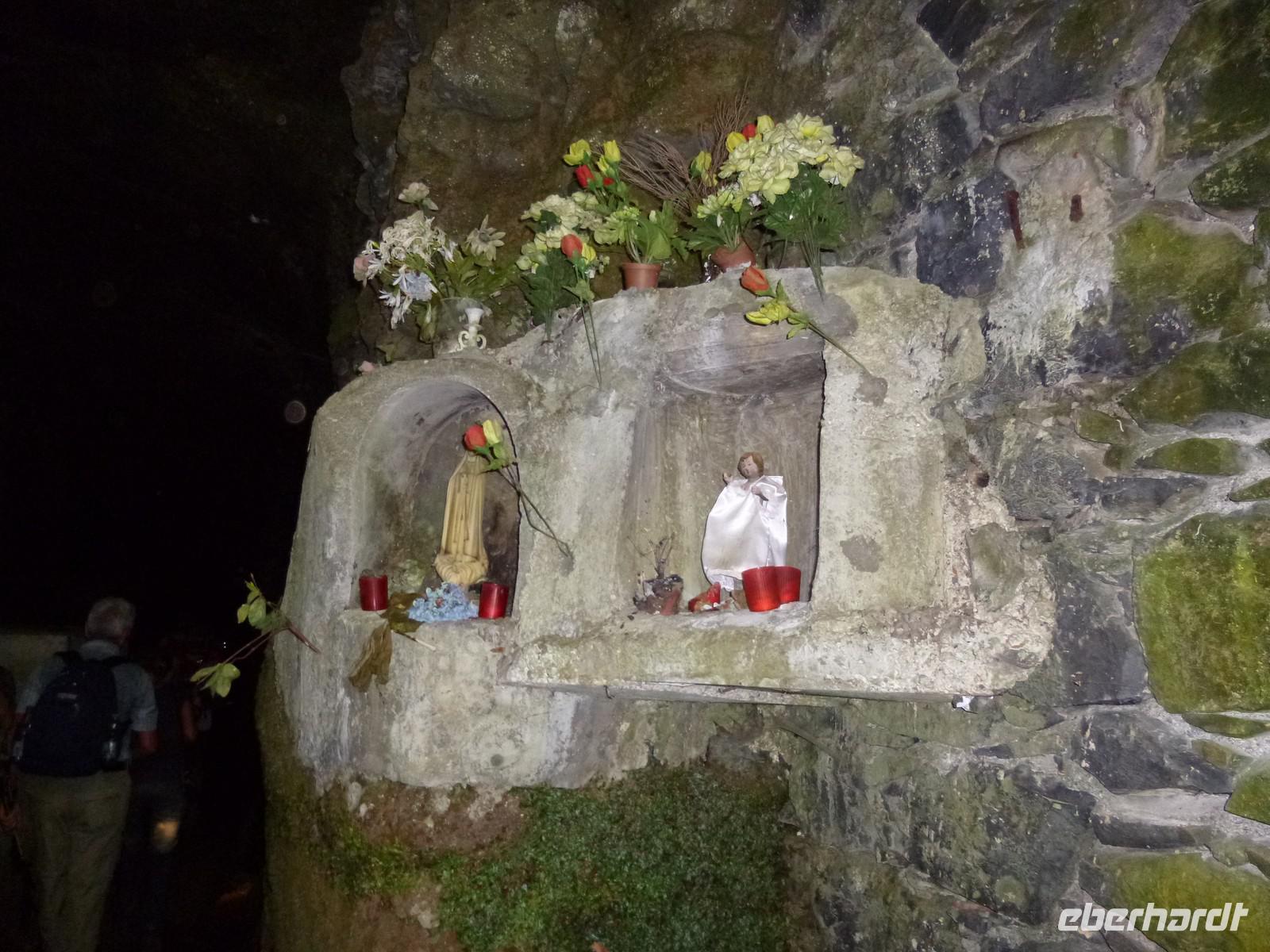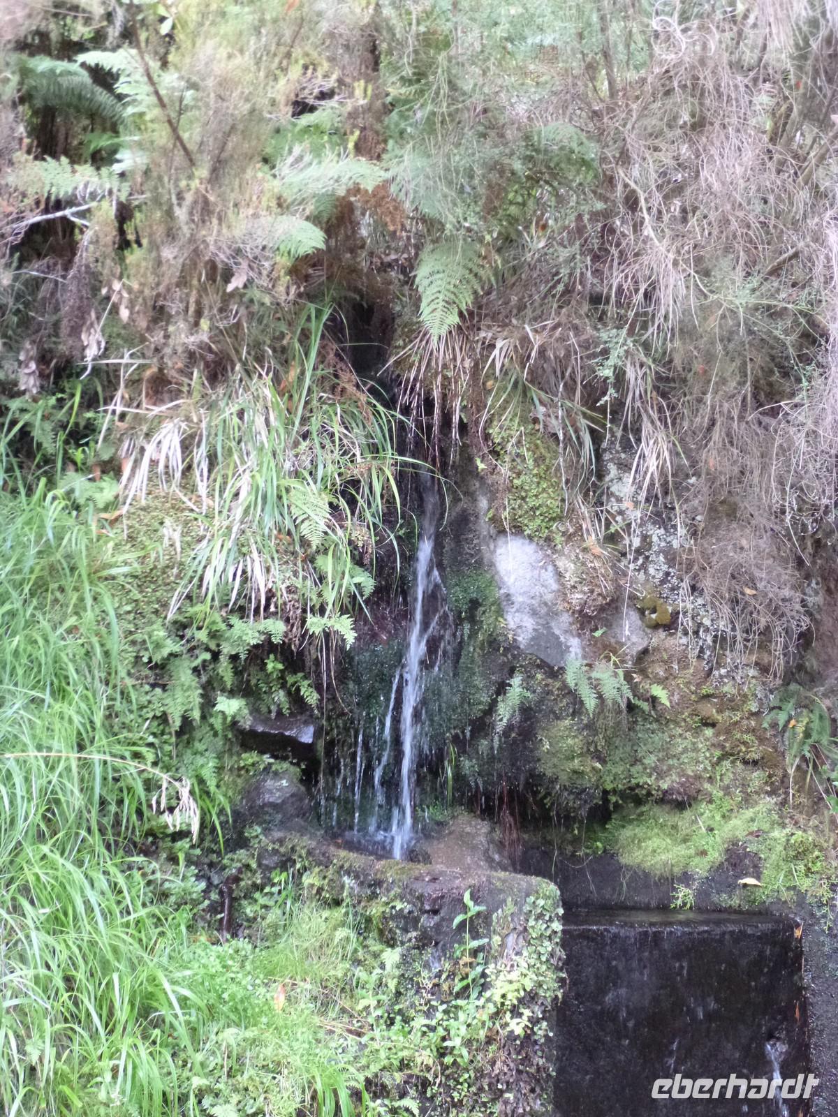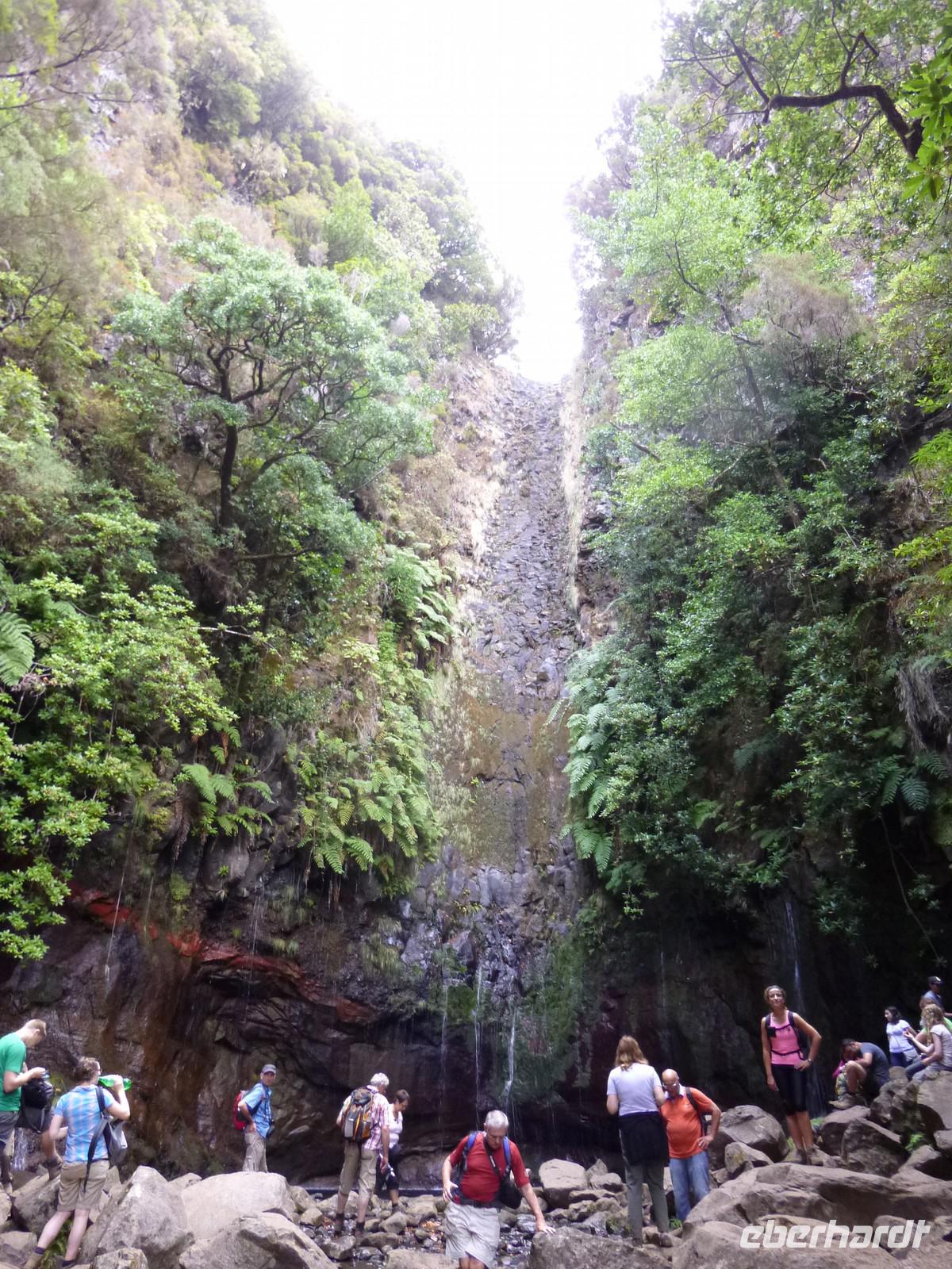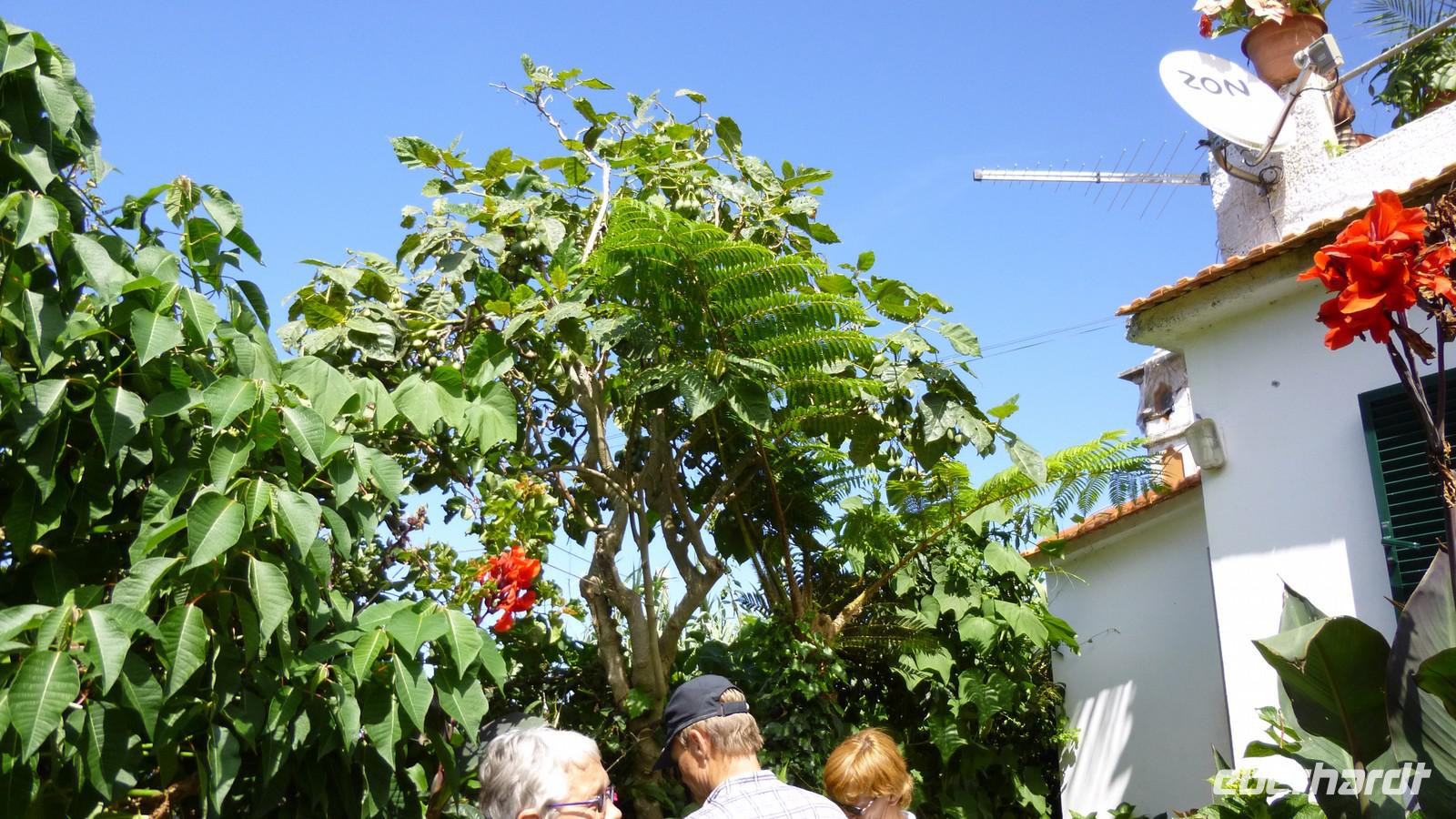 Unsere heutige Wanderung führte zur Quelle der Levadas. Das erste Ziel bildete der Riscowasserfall. Auf dem Weg dahin begegneten wir vielen anderen Wandergruppen. Der erste Teil des Wanderweges war breit und gut ausgebaut. Sergio erklärte uns die Pflanzenwelt, die sich uns im Vergleich zu gestern in völlig neuen Fassetten präsentierte. Am Wasserfall angekommen stellten wir fest, dass durch die große Trockenheit nur ein kleiner Bach den Felsen hinunter lief. Das erklärte zweite Ziel waren die 25 Quellen. Um dahin zu gelangen mussten wir erst einige Treppen überwinden, was für uns aber kein Problem darstellte. Auf dem Weg hatten wir eine Mittagspause, bei der wir unsere zuvor besorgten Snacks aßen. Als besondere Überraschung verteilte ich eine Runde Bolo de Mel und einen Madeira Wein. Frisch gestärkt ging es weiter entlang der Levada. Allerdings wurde der Weg schmaler und wir mussten auf die entgegenkommenden Gruppen Rücksicht nehmen. An den Quellen angekommen hatten wir ausreichend Zeit, die wunderschöne Naturkulisse zu bewundern. Auf den Rückweg zum Bus kamen unsere mitgebrachten Taschenlampen zum Einsatz, denn wir durchquerten einen Tunnel. Am Bus angekommen ging unsere Fahrt weiter nach Funchal in den Kräutergarten von „Quintinha Esmiralda". Wir wurden freundlich begrüßt und bekamen Tee, Kuchen und ein sehr leckeres Chilligelee serviert. Später zeigte uns Esmiralda noch ihren Garten und erklärte uns die Wirkung der verschieden Kräuter. Am Abend wurden die Gäste, die mit zum gemeinsamen Abendessen gehen wollten, vom Shuttle des Cafe Central abgeholt.