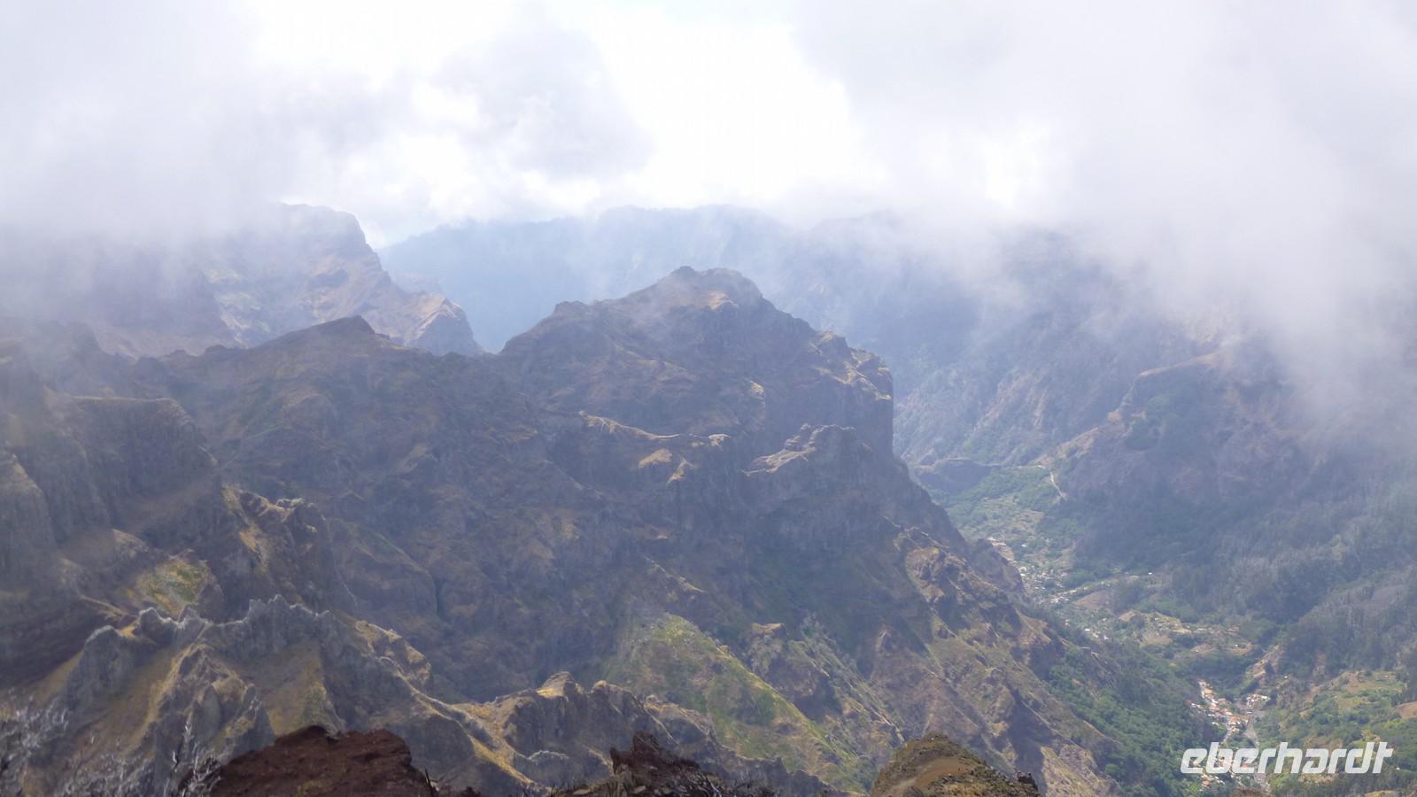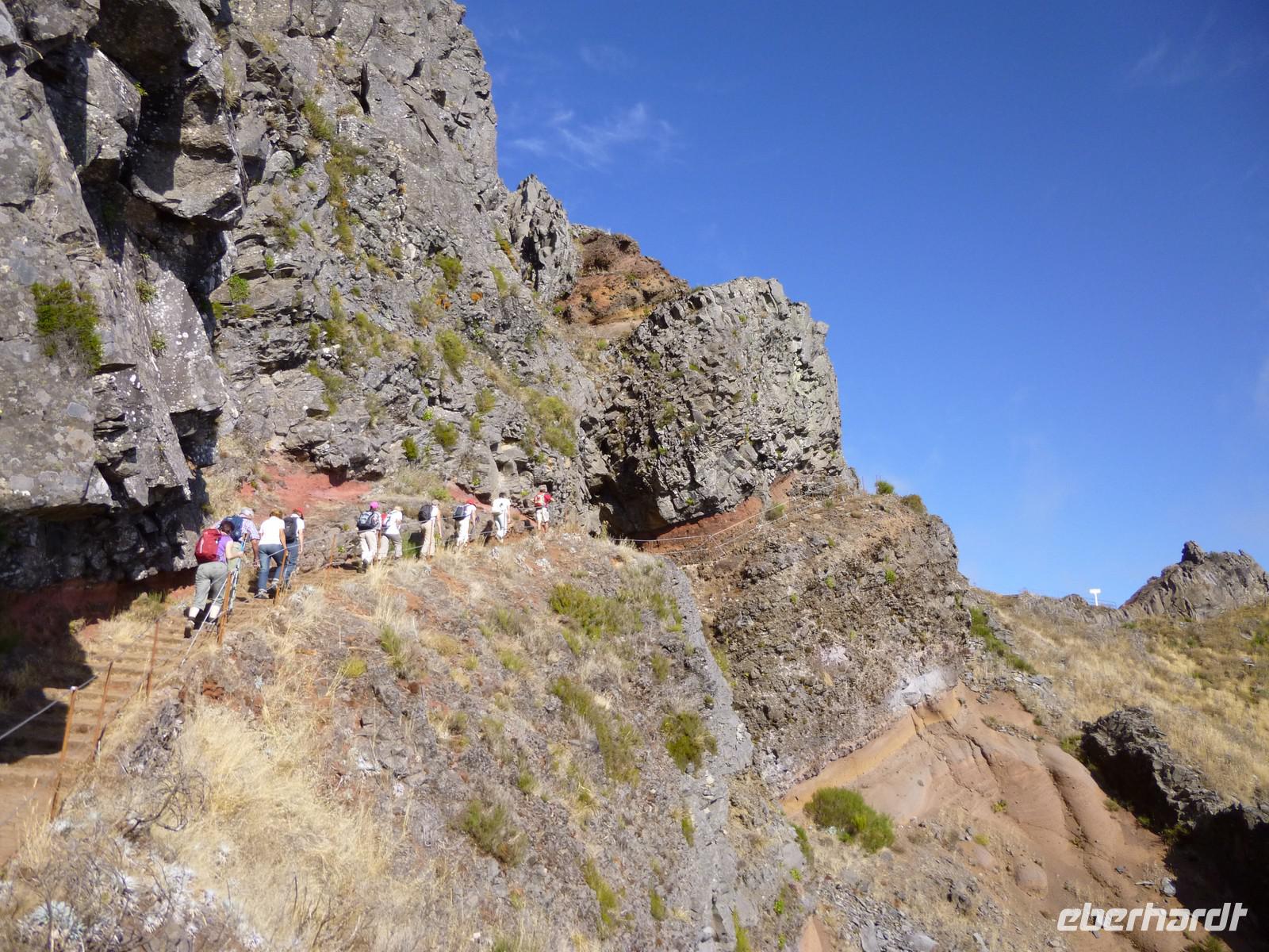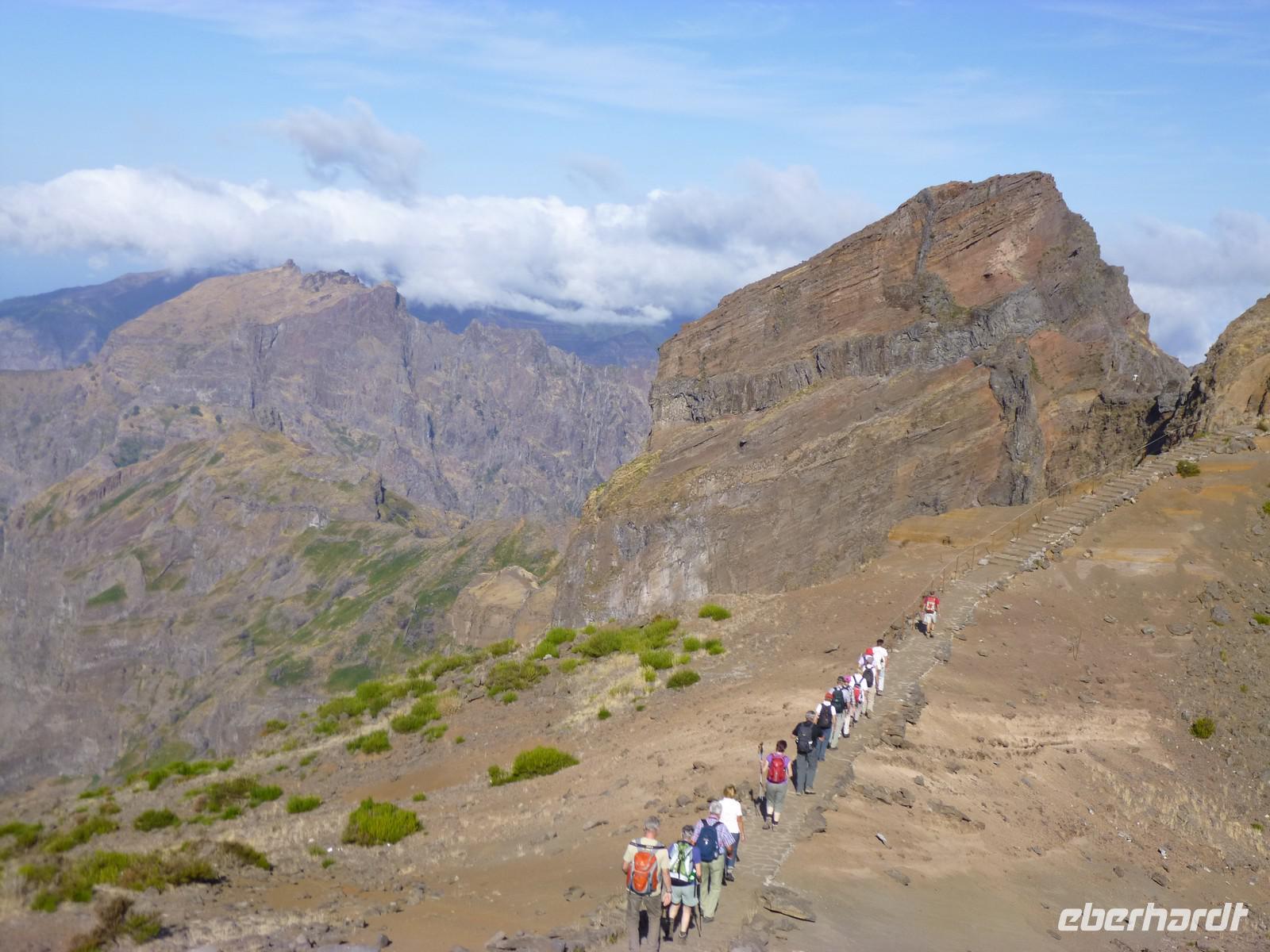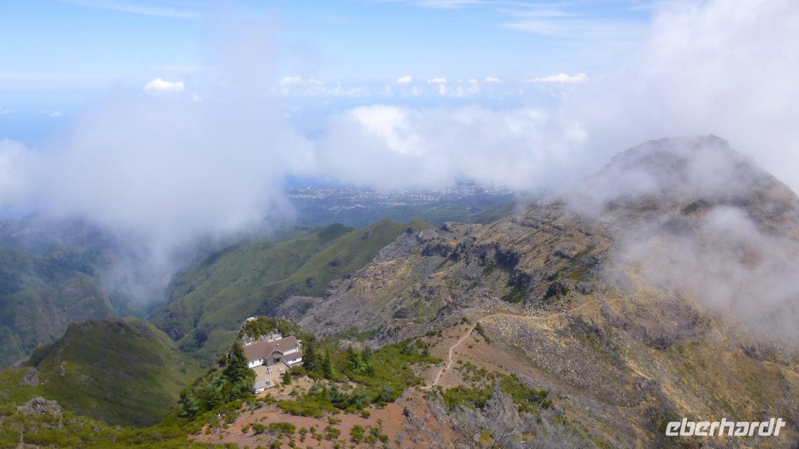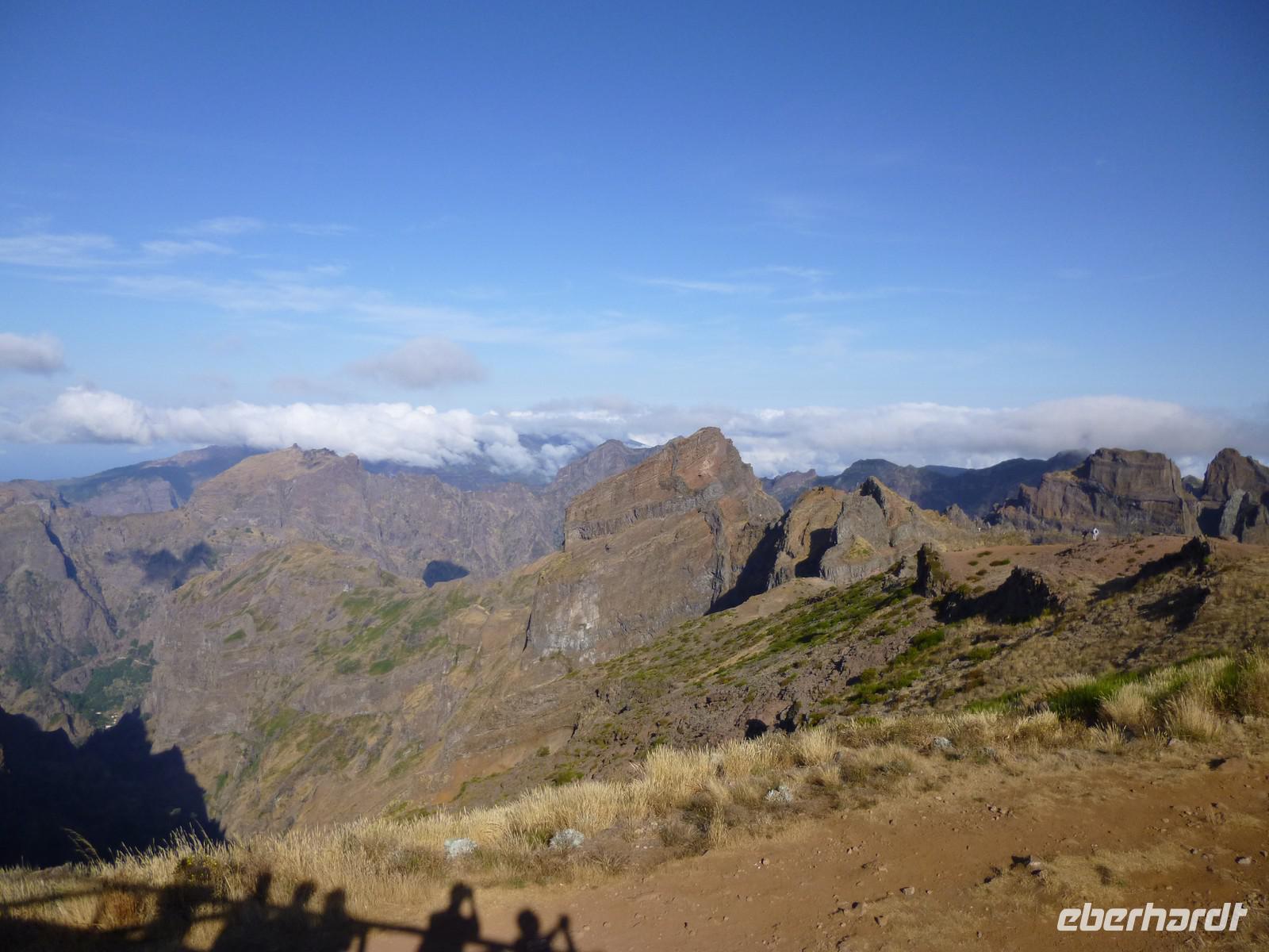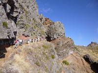 Heute lag die anspruchsvollste Wanderung vor uns, die Wanderung zwischen den Gipfeln Pico de Arivo und Pico Ruivo. Unsere Verpflegung, für diesen Tag, holten wir uns wieder in Santa Cruz. Wir starten unsere Wanderung am Pico Arivo. Vom Gipfel aus hatten wir einen schönen und weiten Blick. Sergio zeigte uns den Nonnenstall und erklärte uns wie der Name des Tals zustande kam. Die Wanderung führte entlang an Steilwänden in eine abgelegene Bergregion. Auf unsere Strecke teilte sich die Gruppe. Ein Teil ging mit Sergio den Tunnelweg, der andere Teil folgte mir über den Berg. Der Aufstieg war steil und durchaus anspruchsvoll, dafür hatte man einen wunderschonen Blick auf die beiden Gipfel. Die Gruppe, die Sergio führte verlief durch sieben Tunnel und über einen befestigten Weg. Beide Gruppen trafen sich am Forsthaus, von hier bewältigten wir die letzten 500m bis zum Gipfel. Von hier aus hatte man einen wunderbaren Blick über Madeira. Die letzte kurze Strecke legten wir dann gemeinsam zurück. Unser Busfahrer brachte uns anschließend nach Santana, wo wir die Möglichkeit hatten uns die Dreieckshäuschen mit ihren Strohdächern anzusehen oder uns die Zeit bei einem Kaffee oder Bier zu genießen.