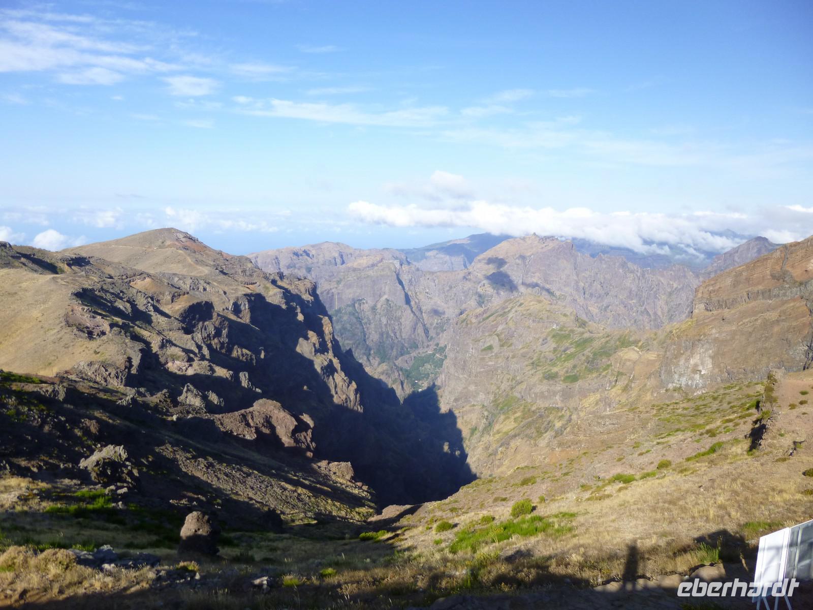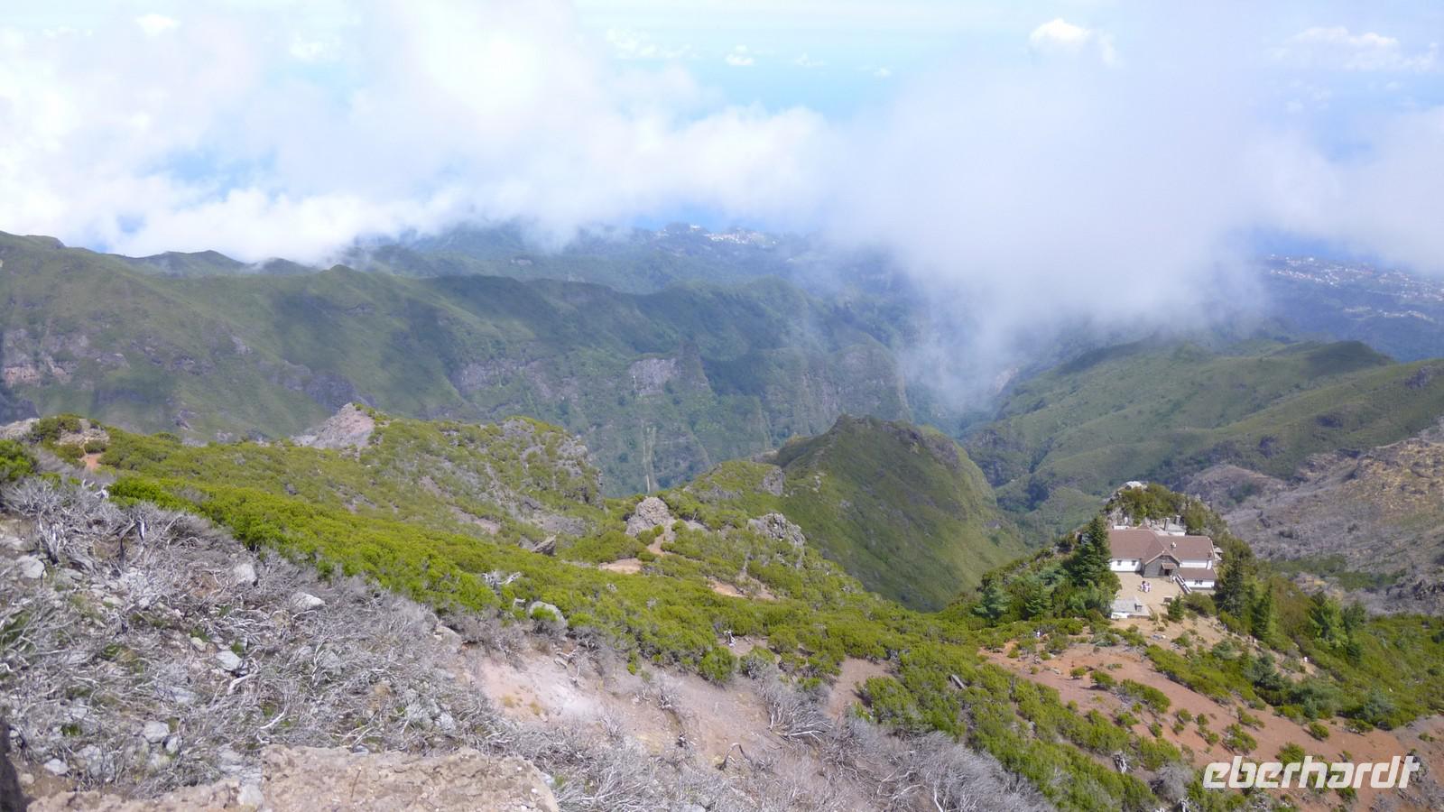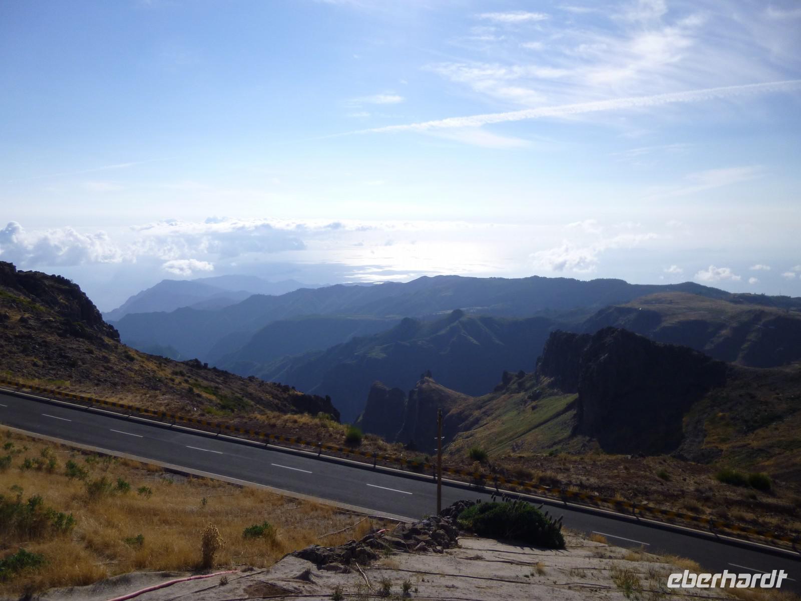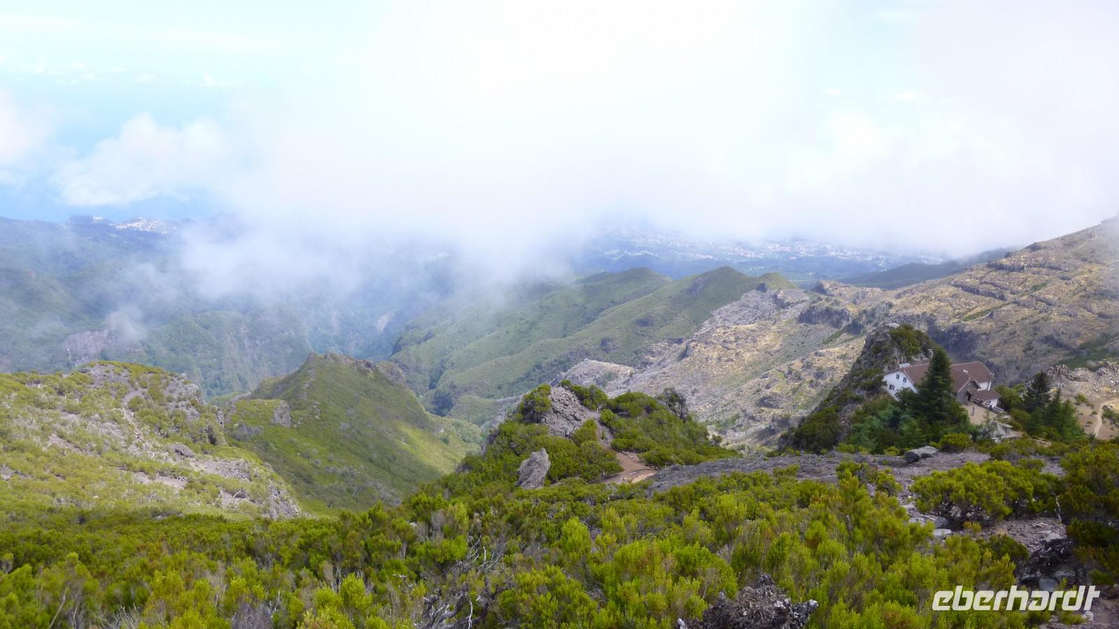 Heute lag die anspruchsvollste Wanderung vor uns, die Wanderung zwischen den Gipfeln Pico de Arivo und Pico Ruivo. Unsere Verpflegung, für diesen Tag, holten wir uns wieder in Santa Cruz. Wir starten unsere Wanderung am Pico Arivo. Vom Gipfel aus hatten wir einen schönen und weiten Blick. Sergio zeigte uns den Nonnenstall und erklärte uns wie der Name des Tals zustande kam. Die Wanderung führte entlang an Steilwänden in eine abgelegene Bergregion. Auf unsere Strecke teilte sich die Gruppe. Ein Teil ging mit Sergio den Tunnelweg, der andere Teil folgte mir über den Berg. Der Aufstieg war steil und durchaus anspruchsvoll, dafür hatte man einen wunderschonen Blick auf die beiden Gipfel. Die Gruppe, die Sergio führte verlief durch sieben Tunnel und über einen befestigten Weg. Beide Gruppen trafen sich am Forsthaus, von hier bewältigten wir die letzten 500m bis zum Gipfel. Von hier aus hatte man einen wunderbaren Blick über Madeira. Die letzte kurze Strecke legten wir dann gemeinsam zurück. Unser Busfahrer brachte uns anschließend nach Santana, wo wir die Möglichkeit hatten uns die Dreieckshäuschen mit ihren Strohdächern anzusehen oder uns die Zeit bei einem Kaffee oder Bier zu genießen.