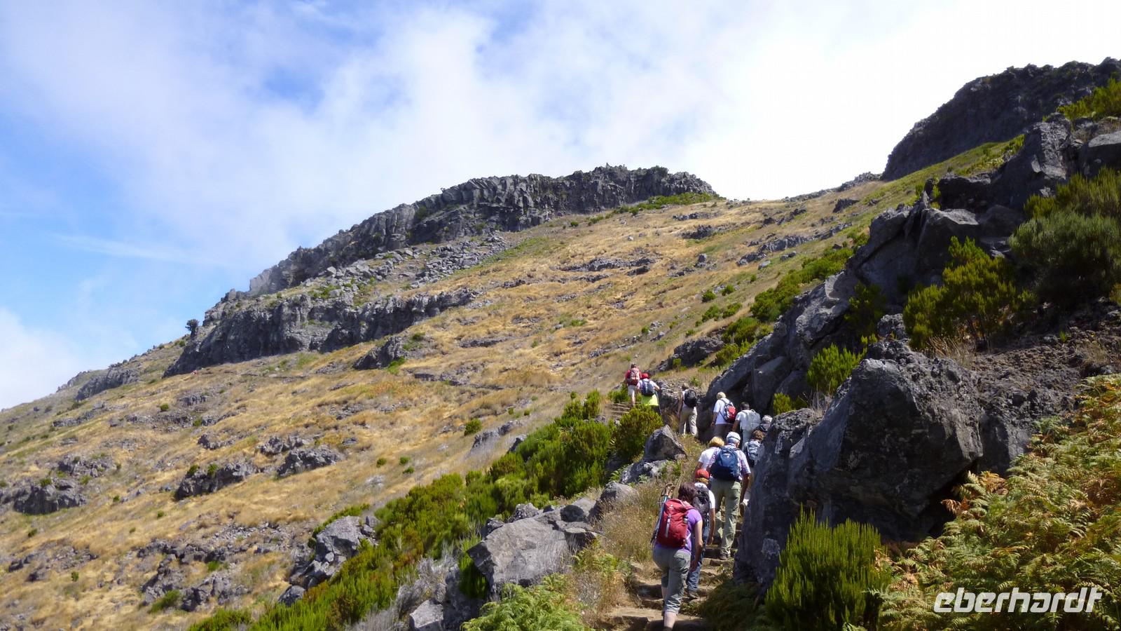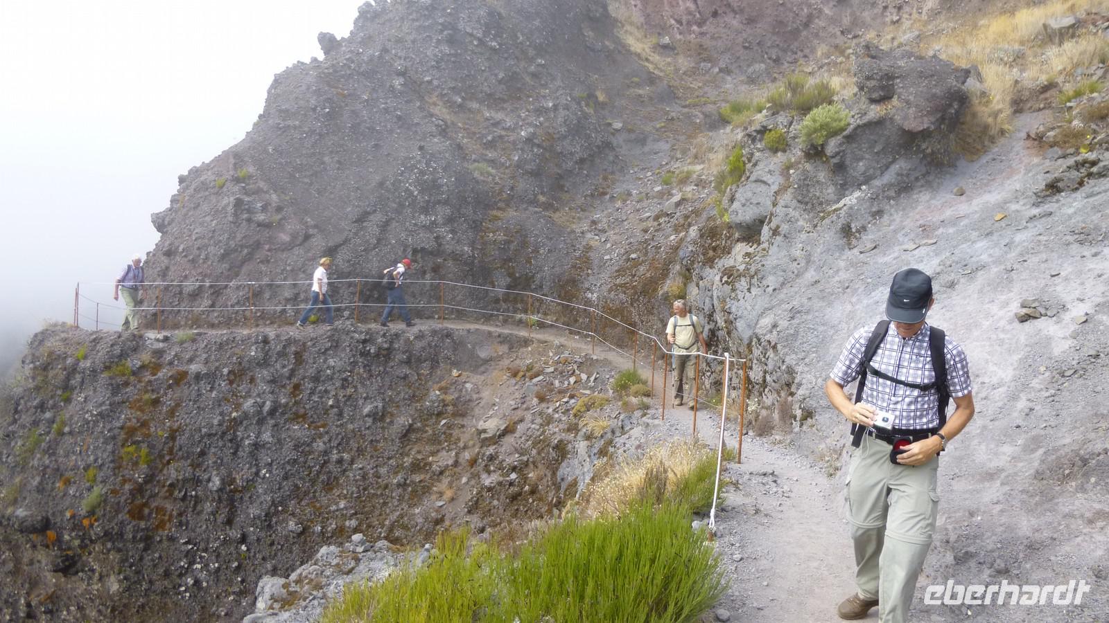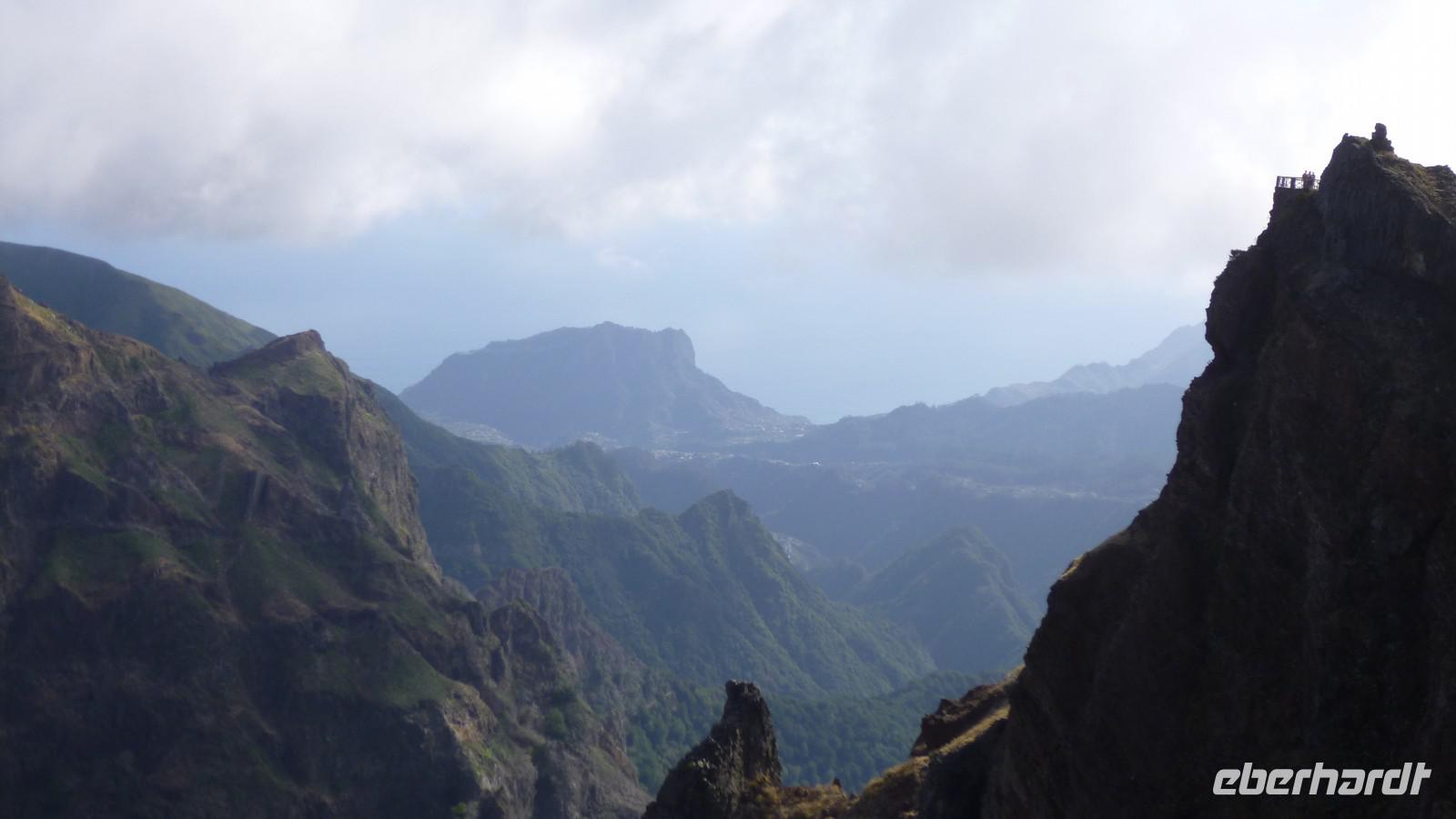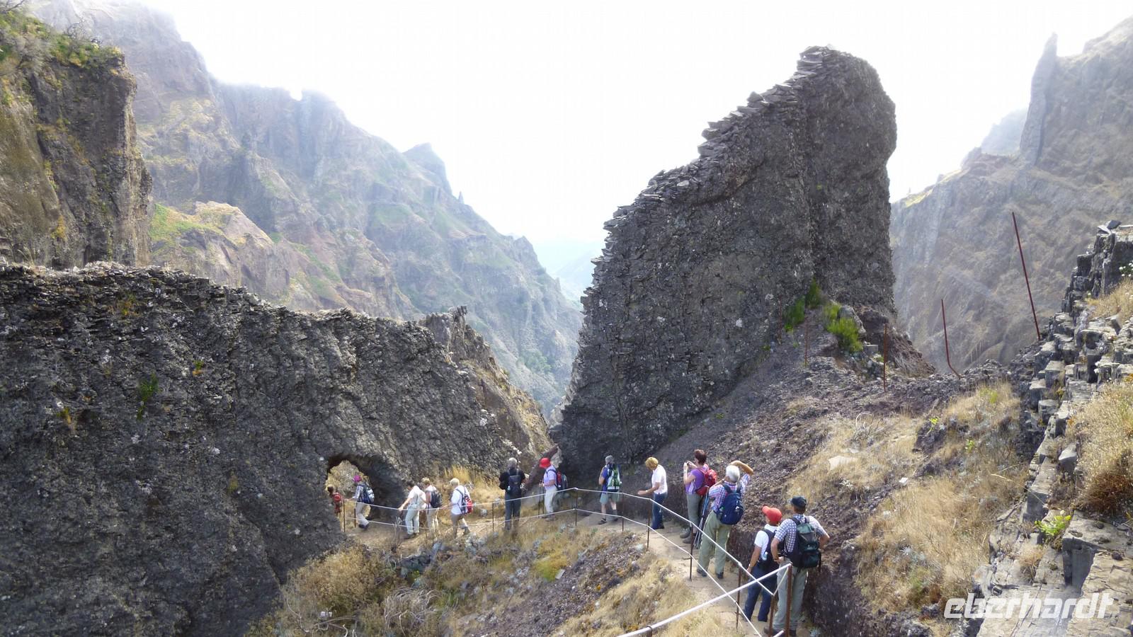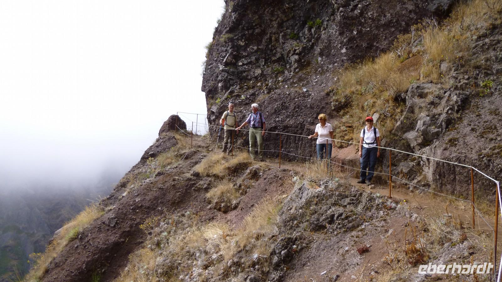 Heute lag die anspruchsvollste Wanderung vor uns, die Wanderung zwischen den Gipfeln Pico de Arivo und Pico Ruivo. Unsere Verpflegung, für diesen Tag, holten wir uns wieder in Santa Cruz. Wir starten unsere Wanderung am Pico Arivo. Vom Gipfel aus hatten wir einen schönen und weiten Blick. Sergio zeigte uns den Nonnenstall und erklärte uns wie der Name des Tals zustande kam. Die Wanderung führte entlang an Steilwänden in eine abgelegene Bergregion. Auf unsere Strecke teilte sich die Gruppe. Ein Teil ging mit Sergio den Tunnelweg, der andere Teil folgte mir über den Berg. Der Aufstieg war steil und durchaus anspruchsvoll, dafür hatte man einen wunderschonen Blick auf die beiden Gipfel. Die Gruppe, die Sergio führte verlief durch sieben Tunnel und über einen befestigten Weg. Beide Gruppen trafen sich am Forsthaus, von hier bewältigten wir die letzten 500m bis zum Gipfel. Von hier aus hatte man einen wunderbaren Blick über Madeira. Die letzte kurze Strecke legten wir dann gemeinsam zurück. Unser Busfahrer brachte uns anschließend nach Santana, wo wir die Möglichkeit hatten uns die Dreieckshäuschen mit ihren Strohdächern anzusehen oder uns die Zeit bei einem Kaffee oder Bier zu genießen.
