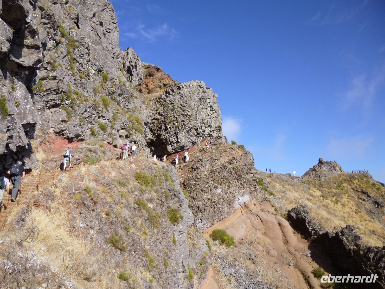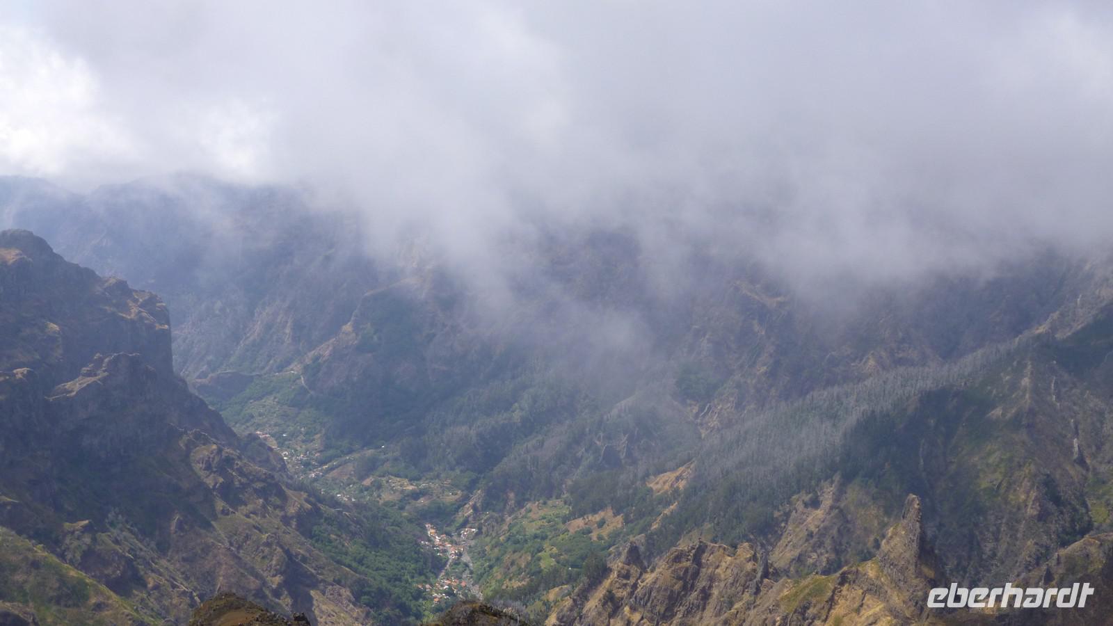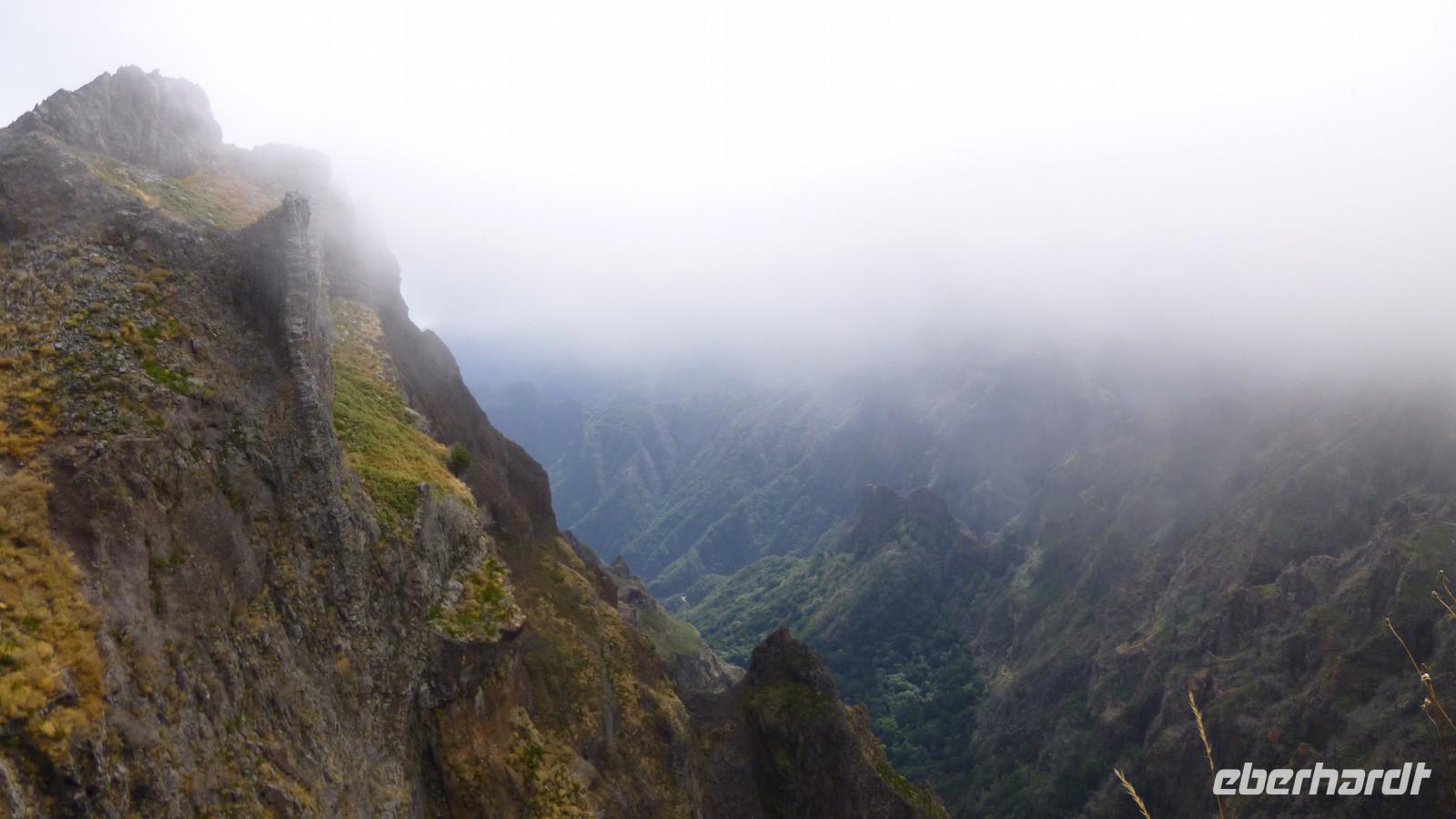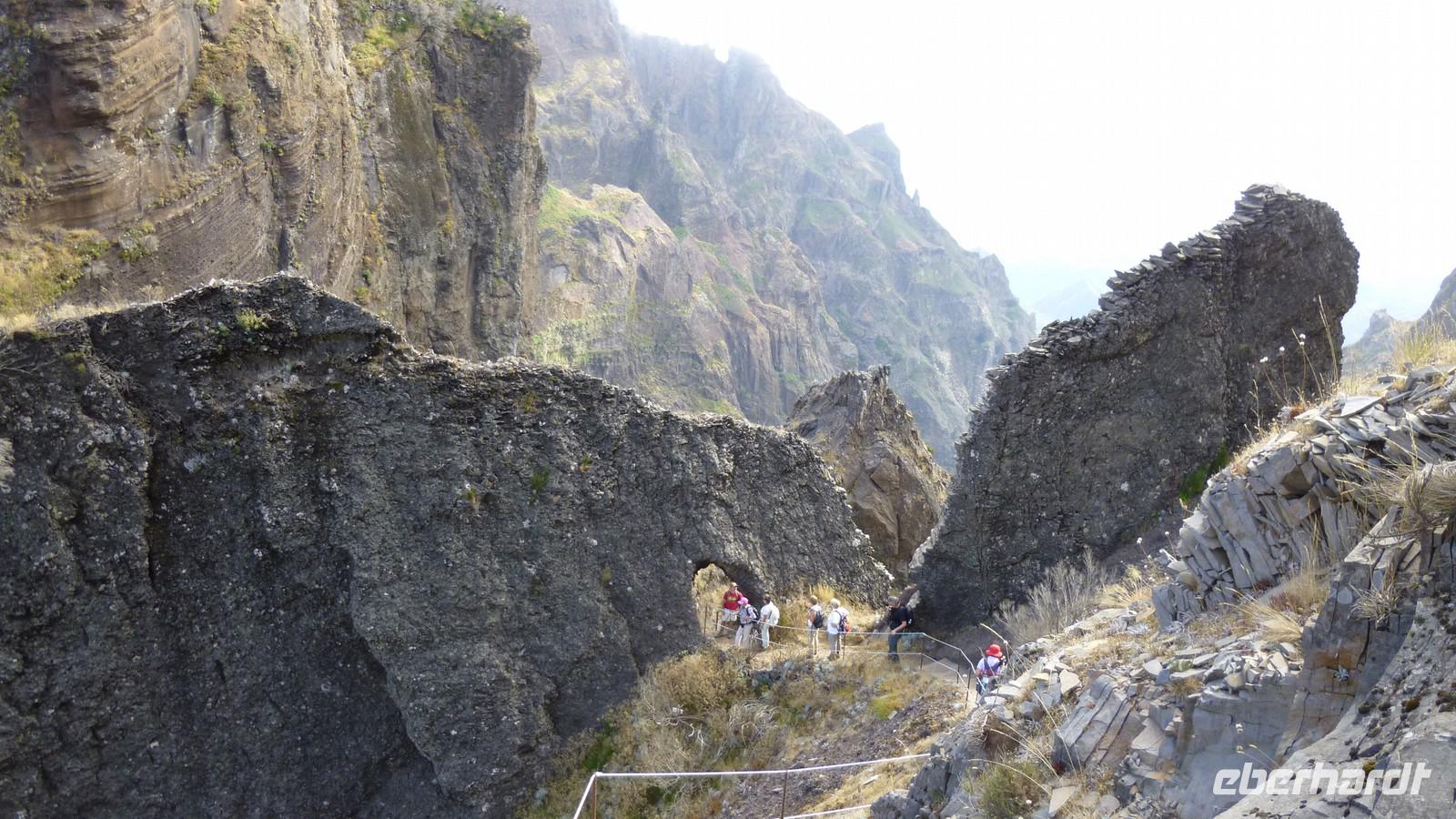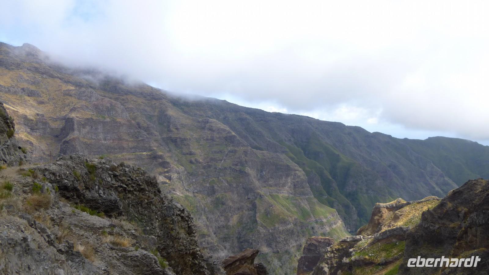 Heute lag die anspruchsvollste Wanderung vor uns, die Wanderung zwischen den Gipfeln Pico de Arivo und Pico Ruivo. Unsere Verpflegung, für diesen Tag, holten wir uns wieder in Santa Cruz. Wir starten unsere Wanderung am Pico Arivo. Vom Gipfel aus hatten wir einen schönen und weiten Blick. Sergio zeigte uns den Nonnenstall und erklärte uns wie der Name des Tals zustande kam. Die Wanderung führte entlang an Steilwänden in eine abgelegene Bergregion. Auf unsere Strecke teilte sich die Gruppe. Ein Teil ging mit Sergio den Tunnelweg, der andere Teil folgte mir über den Berg. Der Aufstieg war steil und durchaus anspruchsvoll, dafür hatte man einen wunderschonen Blick auf die beiden Gipfel. Die Gruppe, die Sergio führte verlief durch sieben Tunnel und über einen befestigten Weg. Beide Gruppen trafen sich am Forsthaus, von hier bewältigten wir die letzten 500m bis zum Gipfel. Von hier aus hatte man einen wunderbaren Blick über Madeira. Die letzte kurze Strecke legten wir dann gemeinsam zurück. Unser Busfahrer brachte uns anschließend nach Santana, wo wir die Möglichkeit hatten uns die Dreieckshäuschen mit ihren Strohdächern anzusehen oder uns die Zeit bei einem Kaffee oder Bier zu genießen.