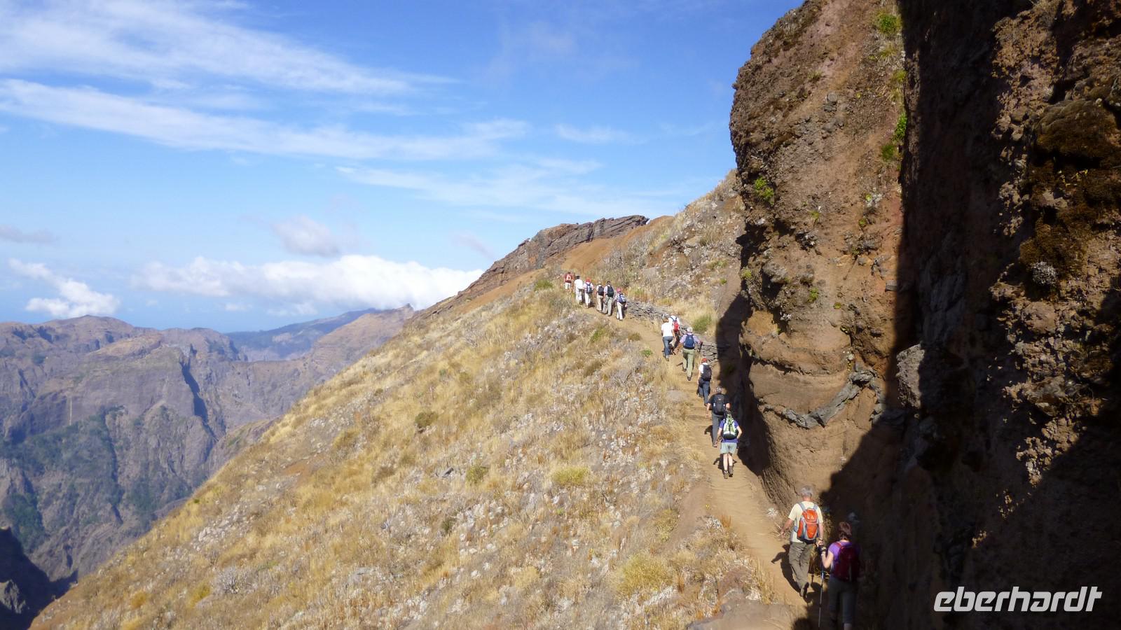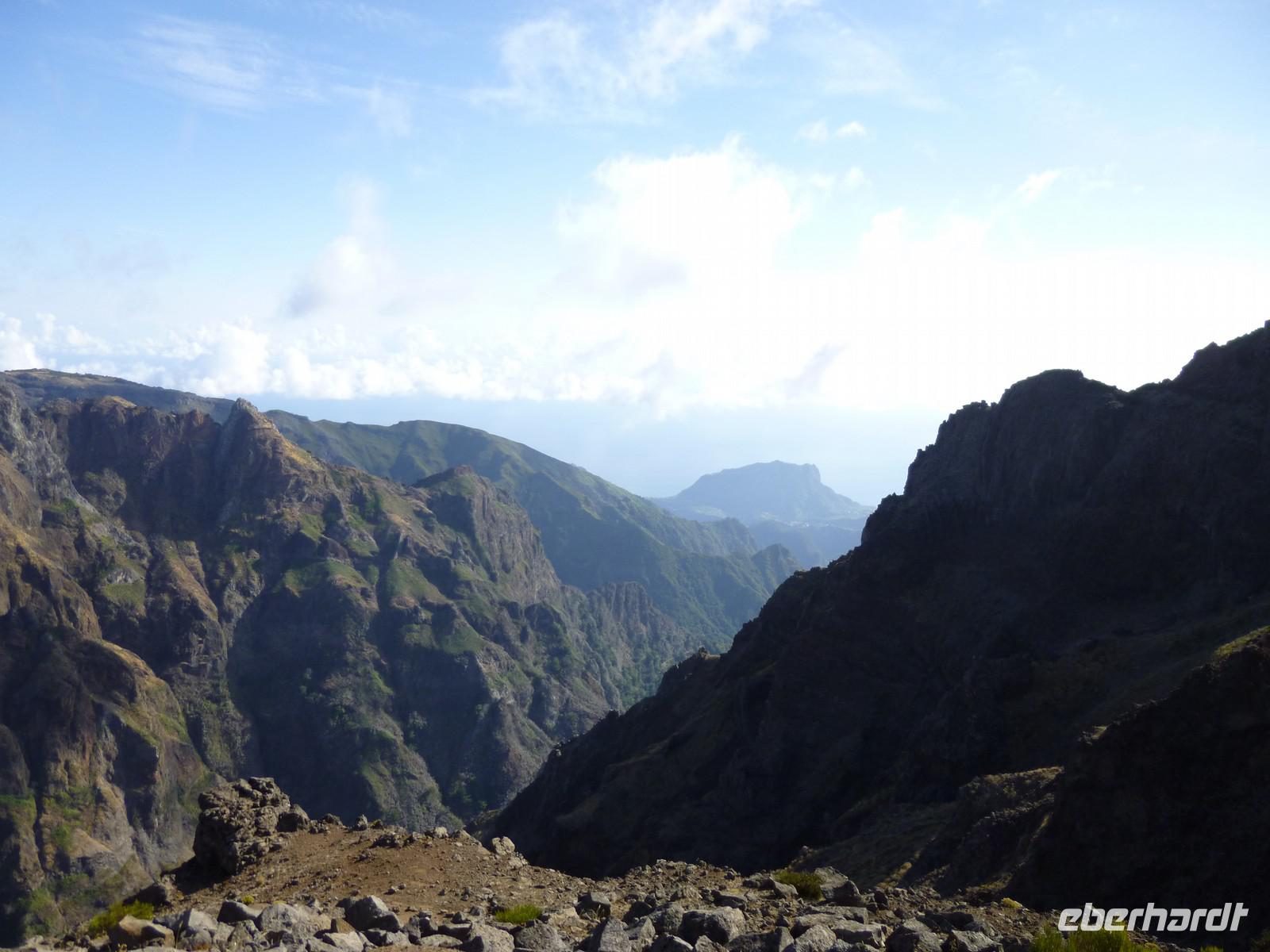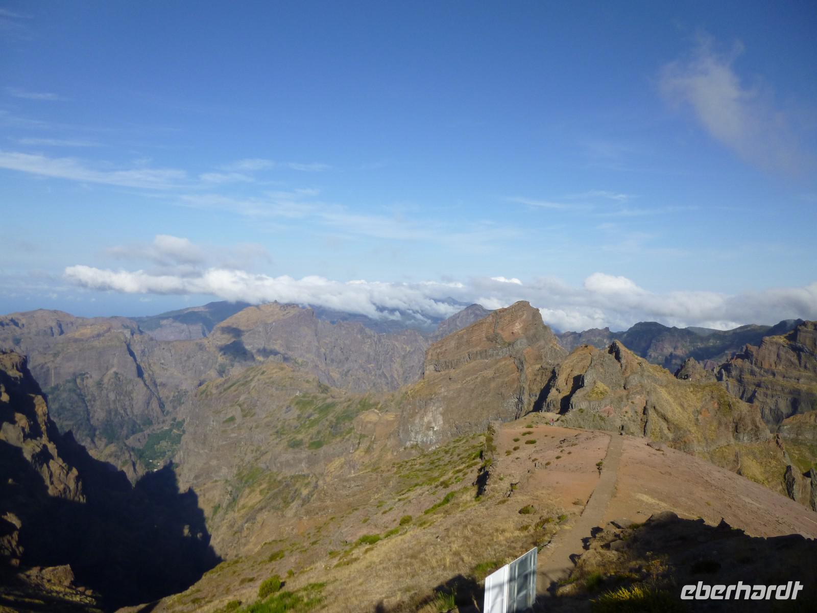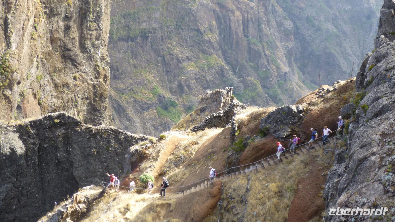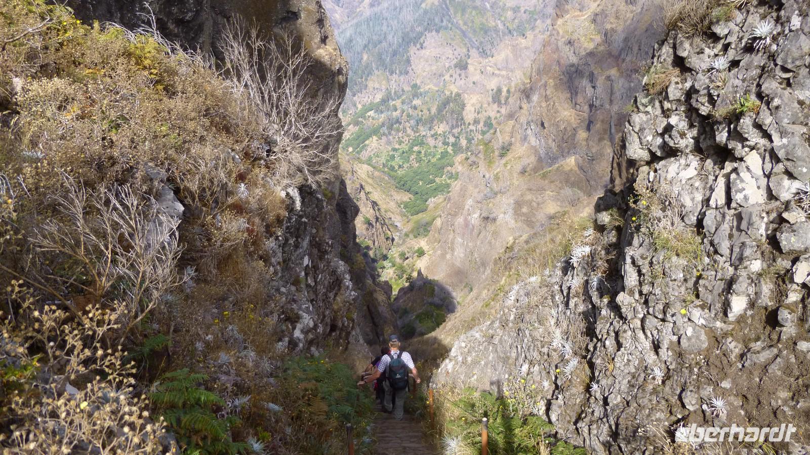 Heute lag die anspruchsvollste Wanderung vor uns, die Wanderung zwischen den Gipfeln Pico de Arivo und Pico Ruivo. Unsere Verpflegung, für diesen Tag, holten wir uns wieder in Santa Cruz. Wir starten unsere Wanderung am Pico Arivo. Vom Gipfel aus hatten wir einen schönen und weiten Blick. Sergio zeigte uns den Nonnenstall und erklärte uns wie der Name des Tals zustande kam. Die Wanderung führte entlang an Steilwänden in eine abgelegene Bergregion. Auf unsere Strecke teilte sich die Gruppe. Ein Teil ging mit Sergio den Tunnelweg, der andere Teil folgte mir über den Berg. Der Aufstieg war steil und durchaus anspruchsvoll, dafür hatte man einen wunderschonen Blick auf die beiden Gipfel. Die Gruppe, die Sergio führte verlief durch sieben Tunnel und über einen befestigten Weg. Beide Gruppen trafen sich am Forsthaus, von hier bewältigten wir die letzten 500m bis zum Gipfel. Von hier aus hatte man einen wunderbaren Blick über Madeira. Die letzte kurze Strecke legten wir dann gemeinsam zurück. Unser Busfahrer brachte uns anschließend nach Santana, wo wir die Möglichkeit hatten uns die Dreieckshäuschen mit ihren Strohdächern anzusehen oder uns die Zeit bei einem Kaffee oder Bier zu genießen.