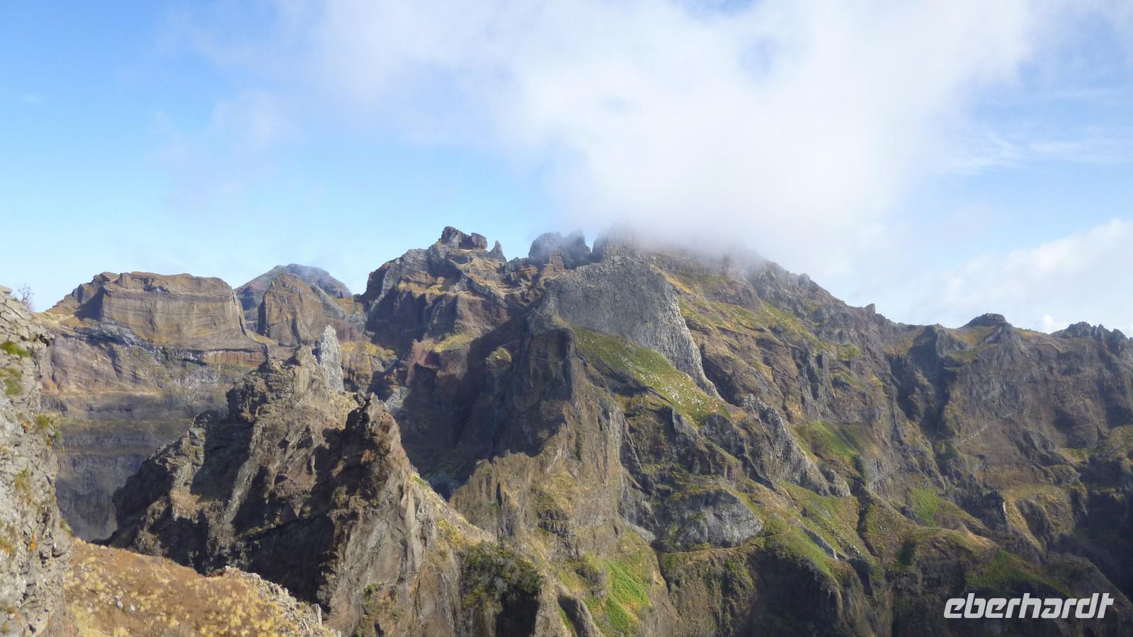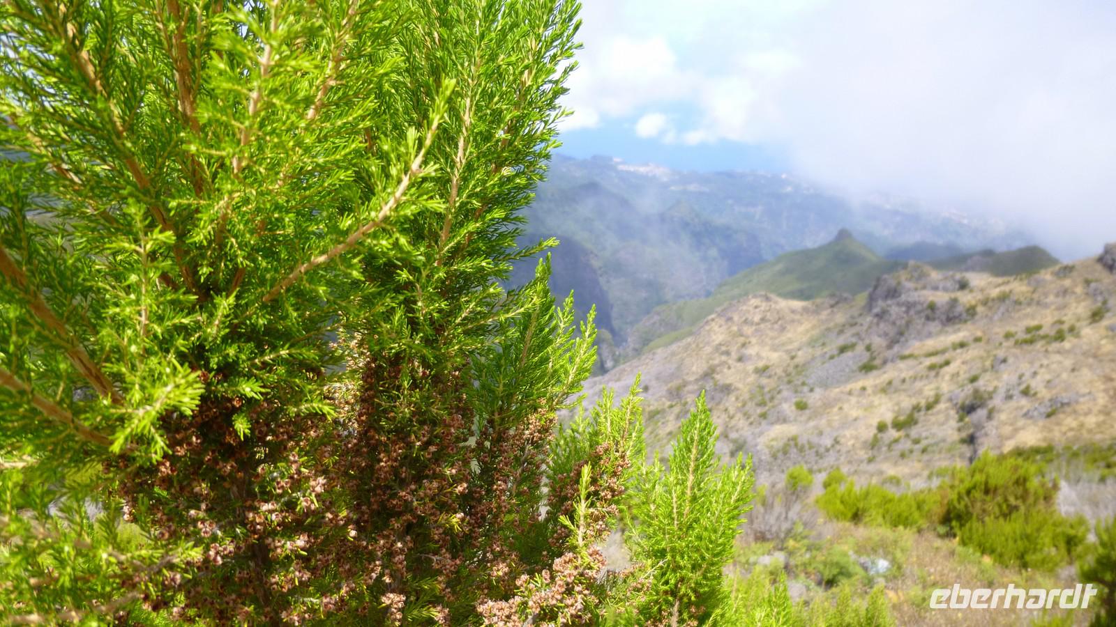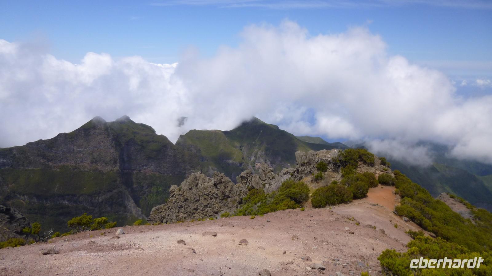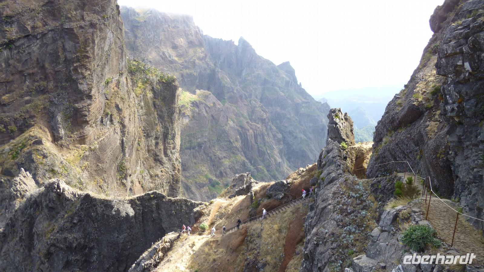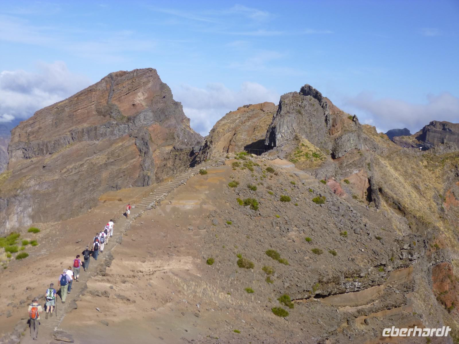 Heute lag die anspruchsvollste Wanderung vor uns, die Wanderung zwischen den Gipfeln Pico de Arivo und Pico Ruivo. Unsere Verpflegung, für diesen Tag, holten wir uns wieder in Santa Cruz. Wir starten unsere Wanderung am Pico Arivo. Vom Gipfel aus hatten wir einen schönen und weiten Blick. Sergio zeigte uns den Nonnenstall und erklärte uns wie der Name des Tals zustande kam. Die Wanderung führte entlang an Steilwänden in eine abgelegene Bergregion. Auf unsere Strecke teilte sich die Gruppe. Ein Teil ging mit Sergio den Tunnelweg, der andere Teil folgte mir über den Berg. Der Aufstieg war steil und durchaus anspruchsvoll, dafür hatte man einen wunderschonen Blick auf die beiden Gipfel. Die Gruppe, die Sergio führte verlief durch sieben Tunnel und über einen befestigten Weg. Beide Gruppen trafen sich am Forsthaus, von hier bewältigten wir die letzten 500m bis zum Gipfel. Von hier aus hatte man einen wunderbaren Blick über Madeira. Die letzte kurze Strecke legten wir dann gemeinsam zurück. Unser Busfahrer brachte uns anschließend nach Santana, wo wir die Möglichkeit hatten uns die Dreieckshäuschen mit ihren Strohdächern anzusehen oder uns die Zeit bei einem Kaffee oder Bier zu genießen.